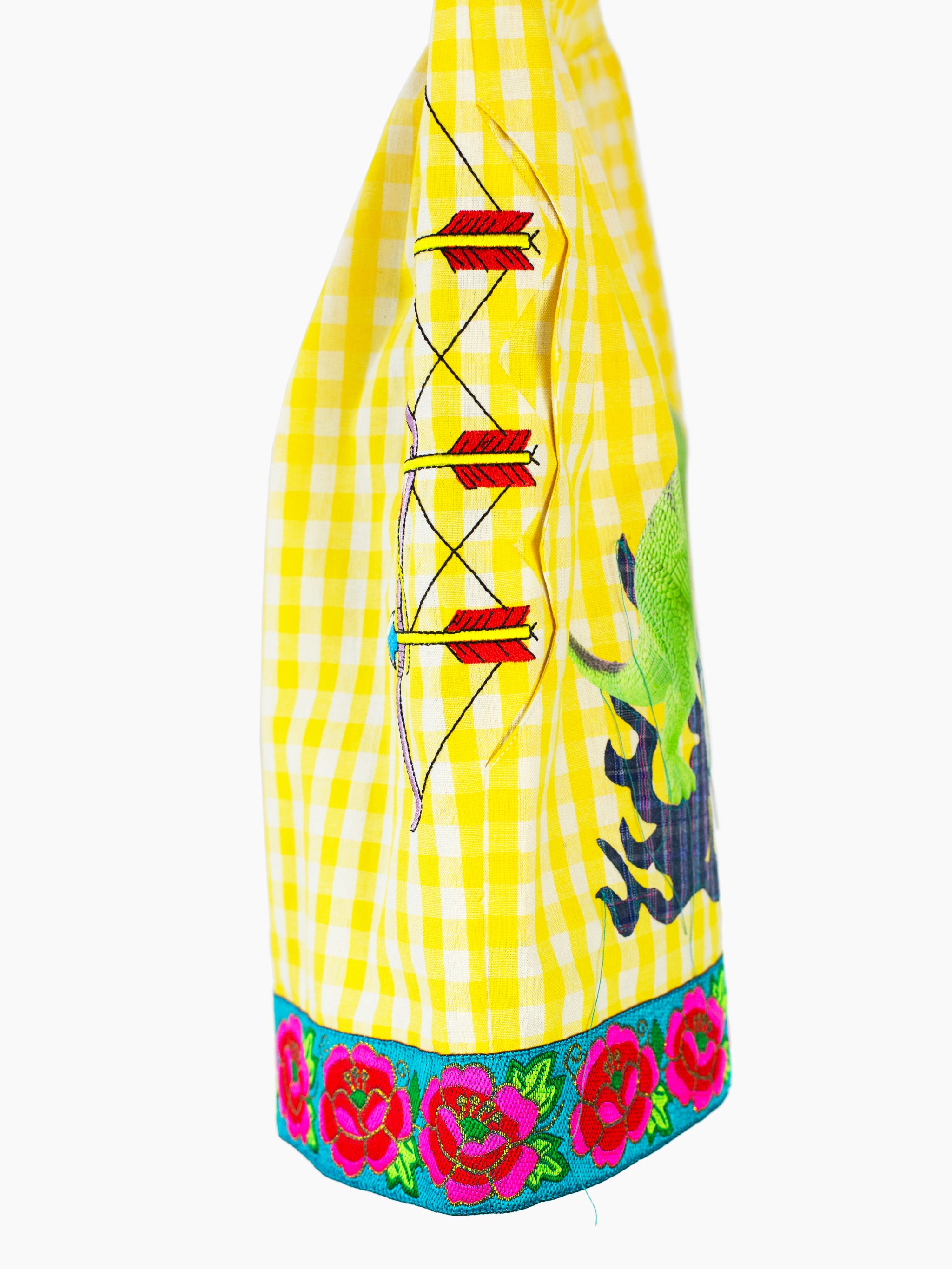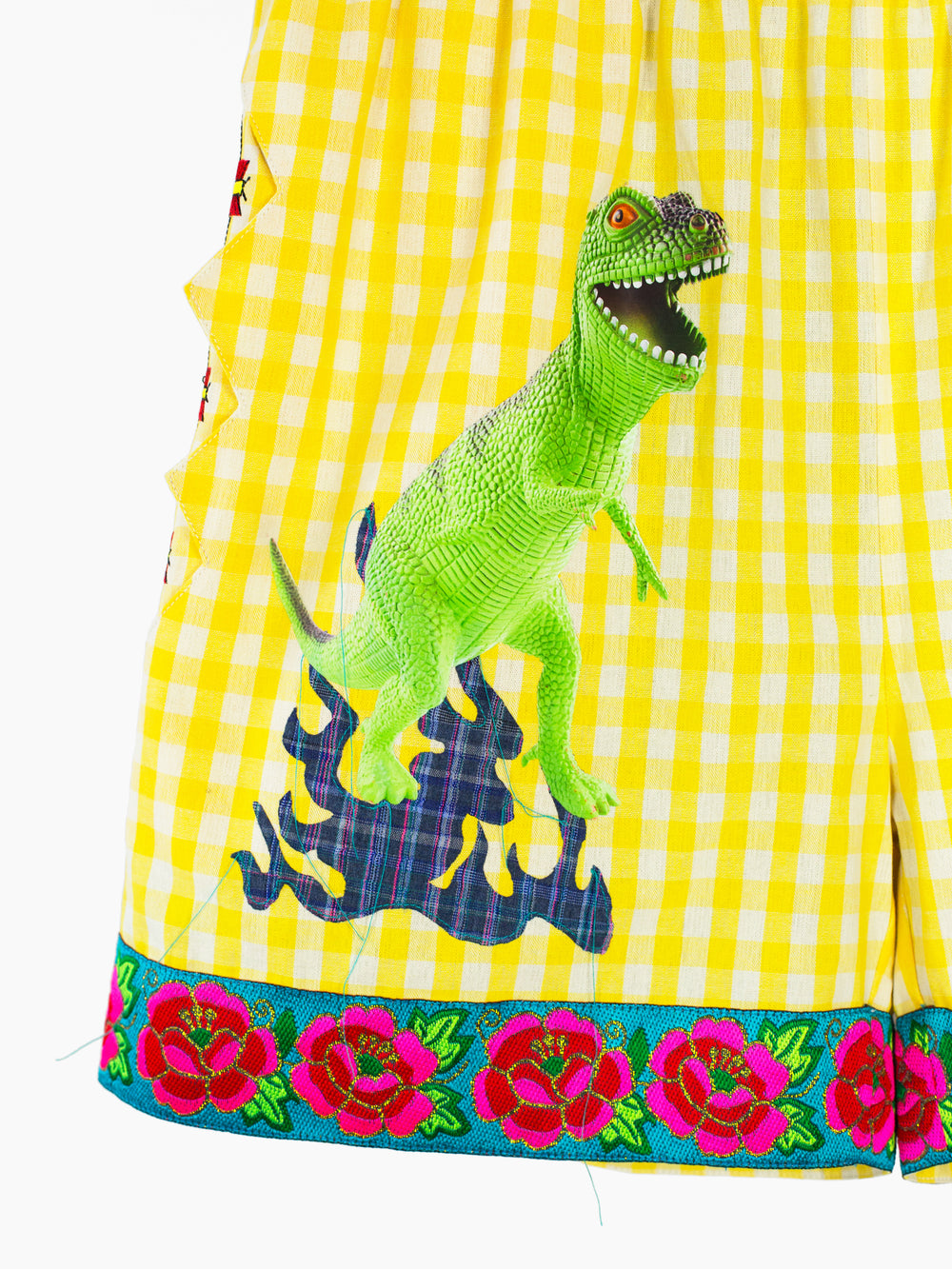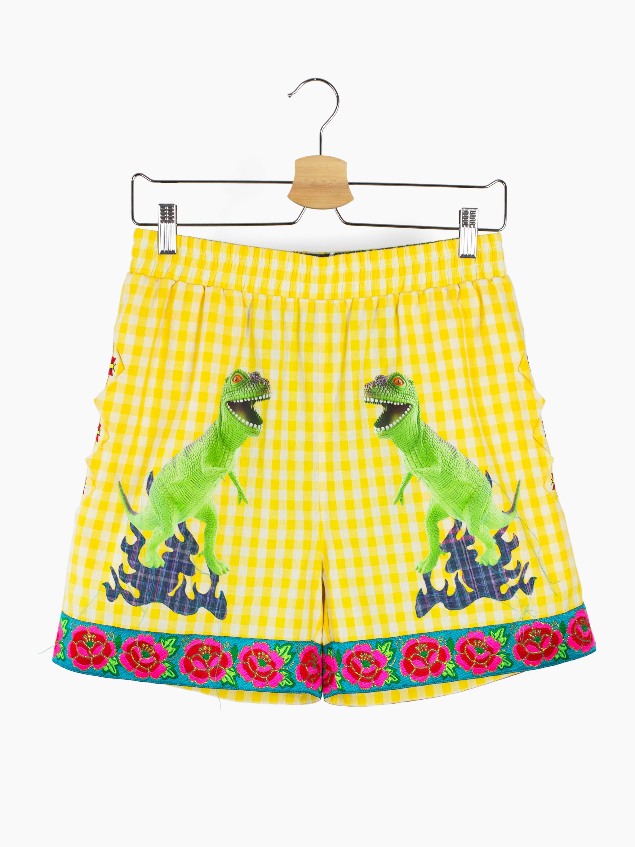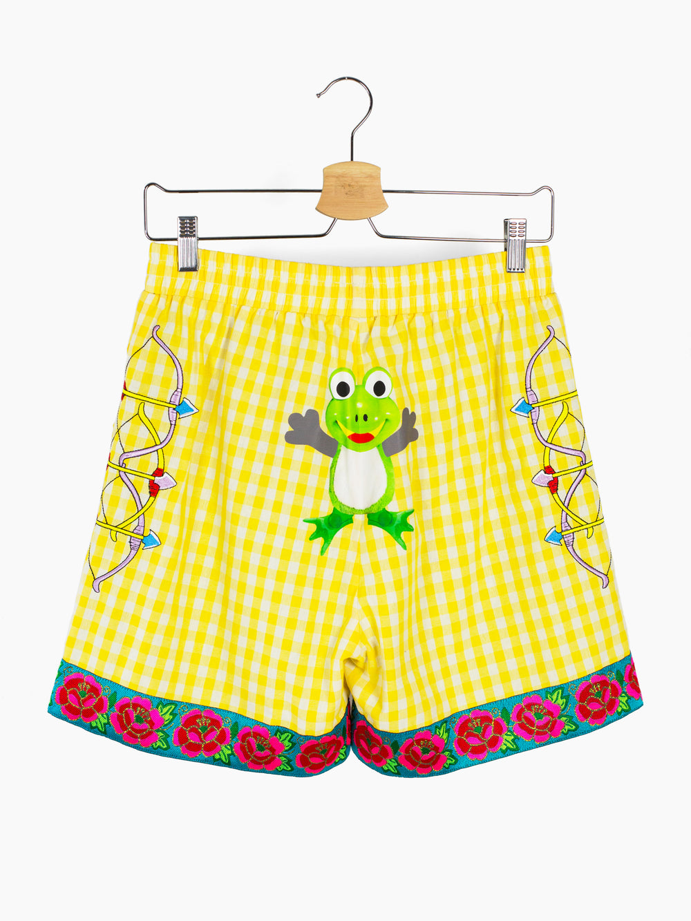 Graphic Applique elasticated shorts with a mixture of stitched on patches, hand-cut vinyl graphics, embroidery, and woven trim. Cut in a lightweight cotton gingham with full mesh lining for body and comfort. Stacked triangle pocket openings are articulated to match bow and arrow embroidery that sits adjacent.