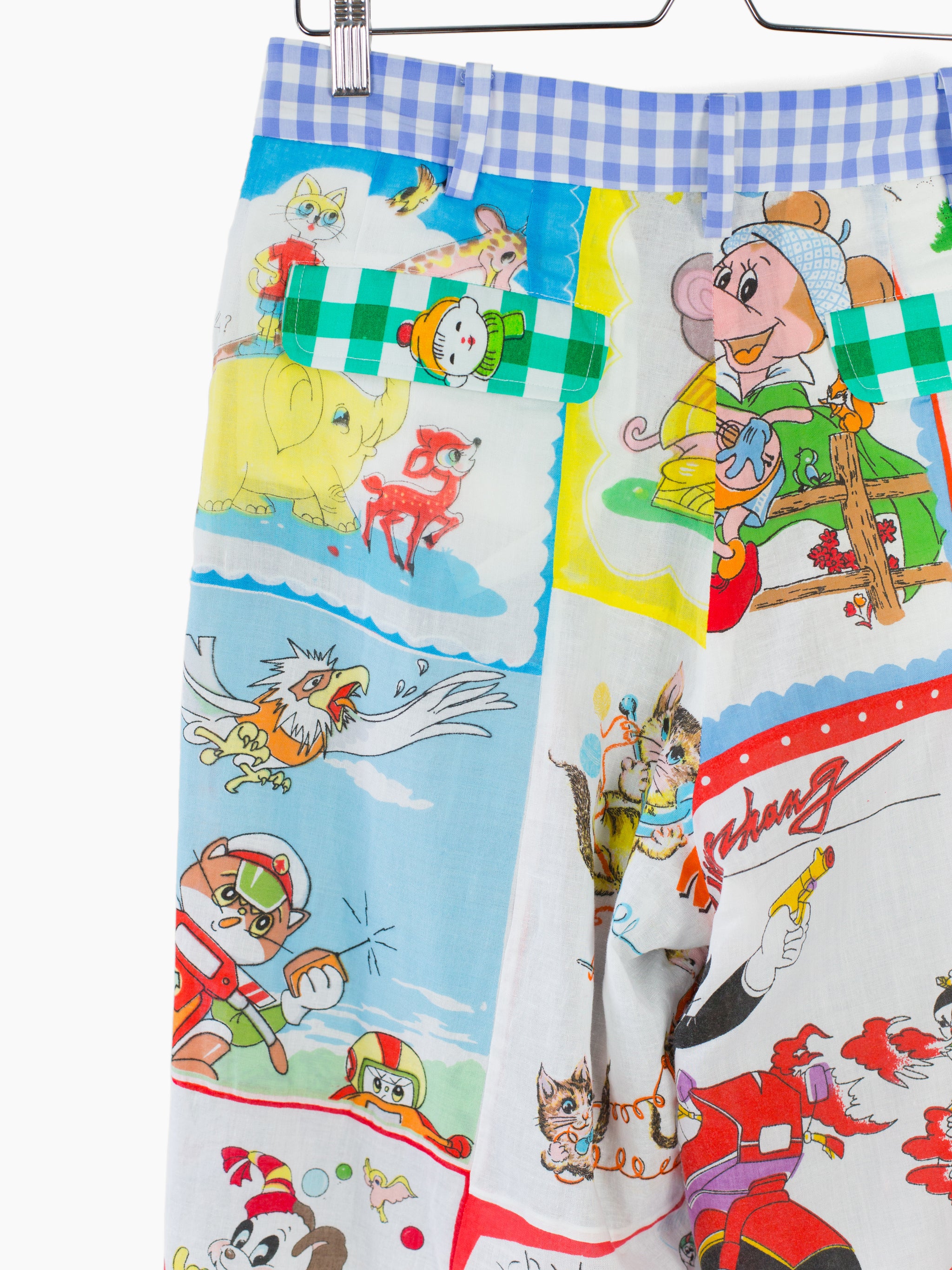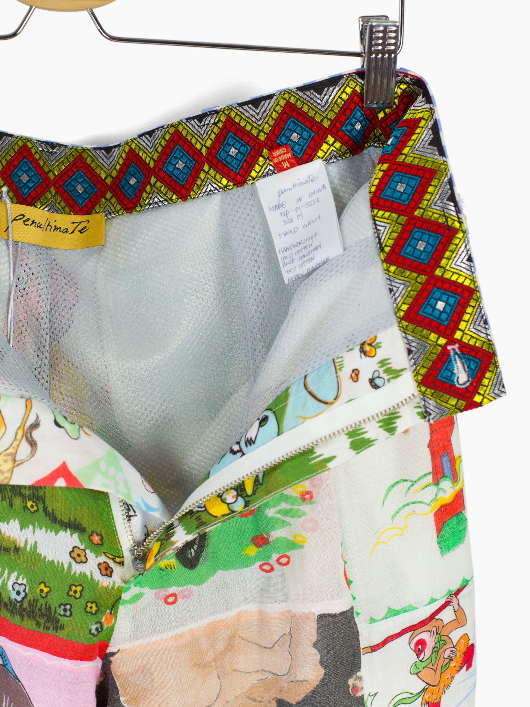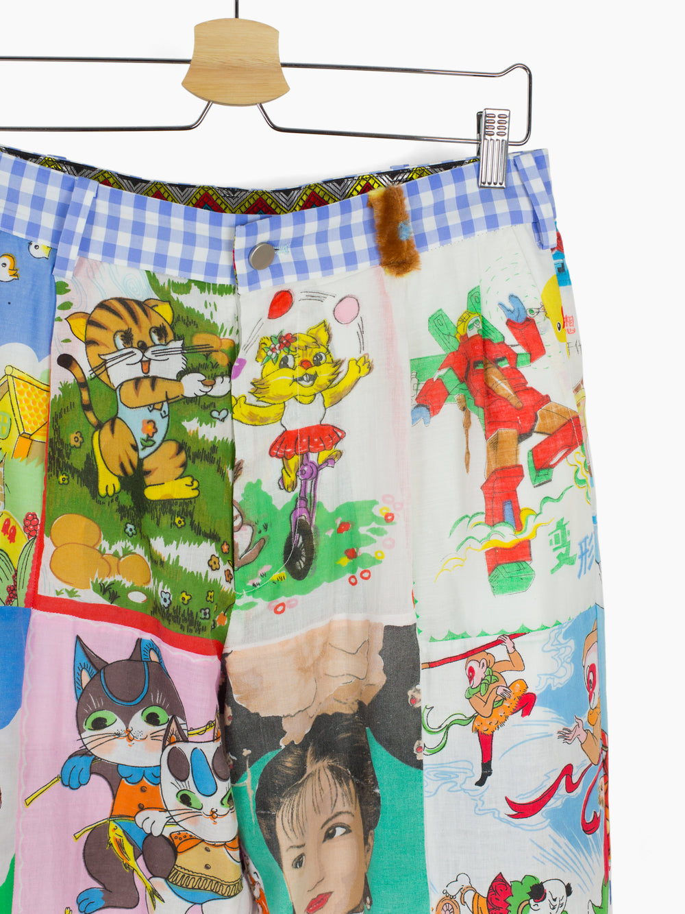 Deadstock printed cartoon scene patchwork with contrast metallic basketweave plant and flame appliques on lower legs, fully mesh lined for body and comfort.