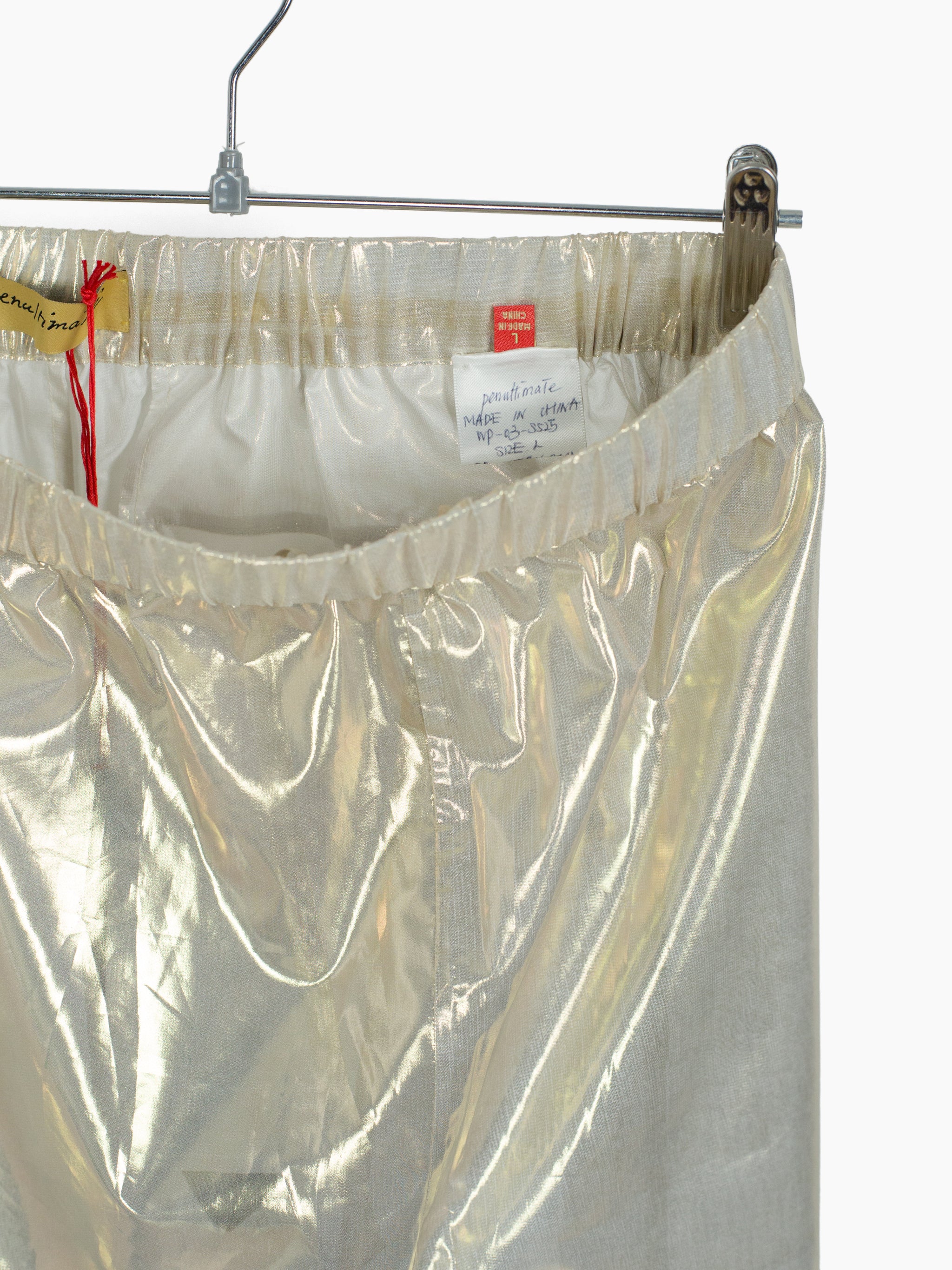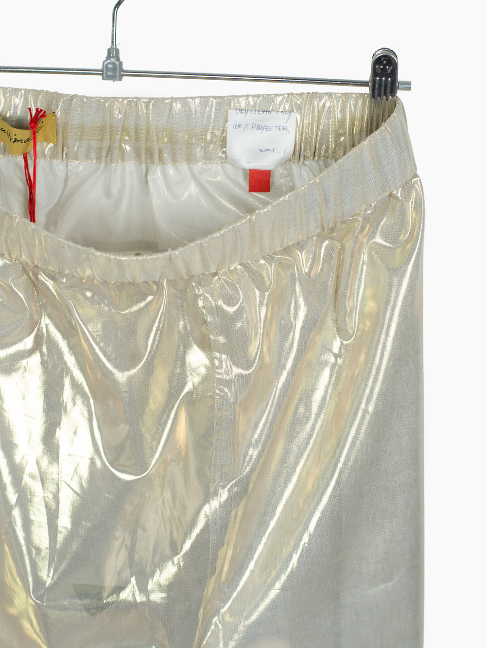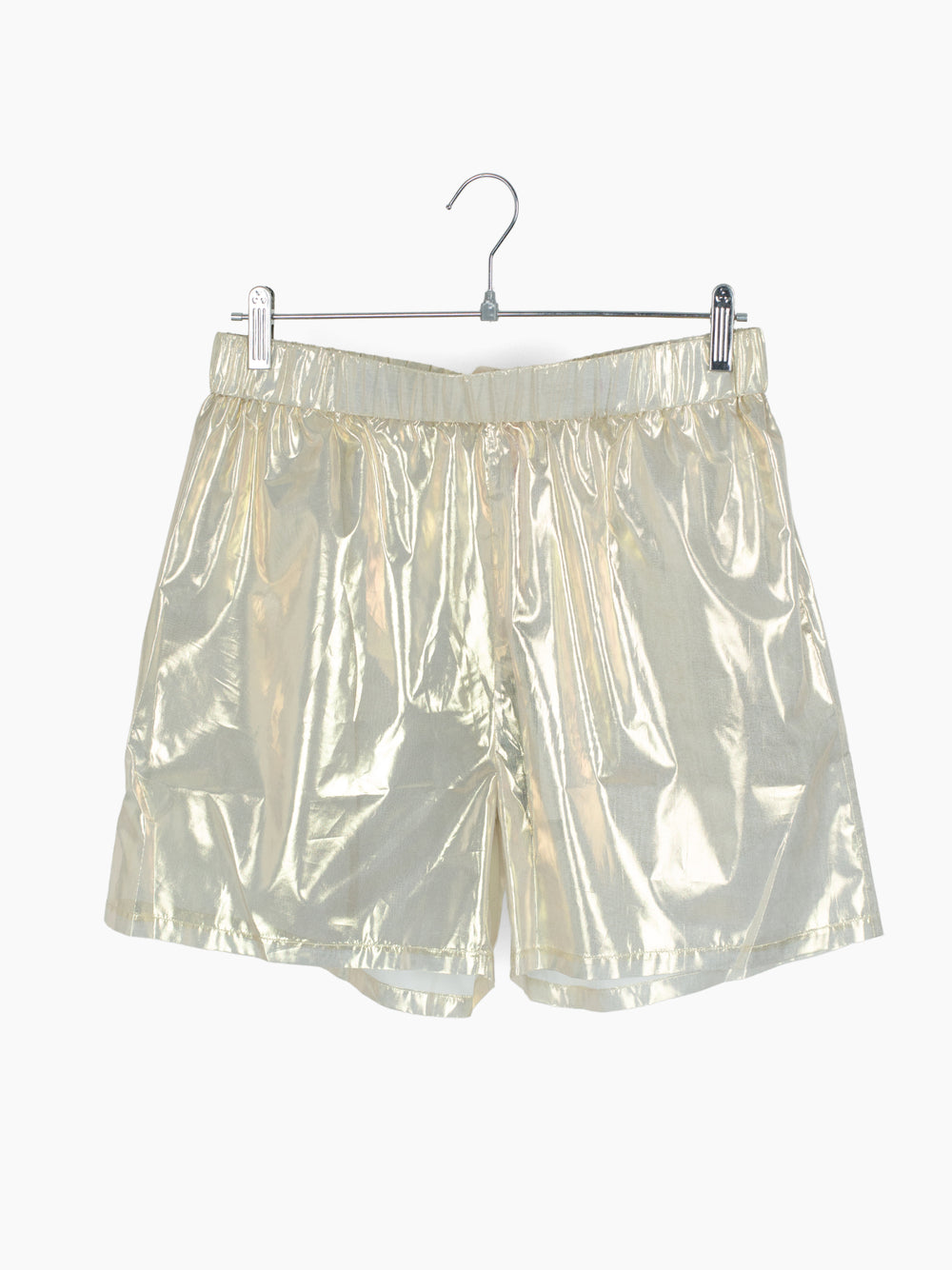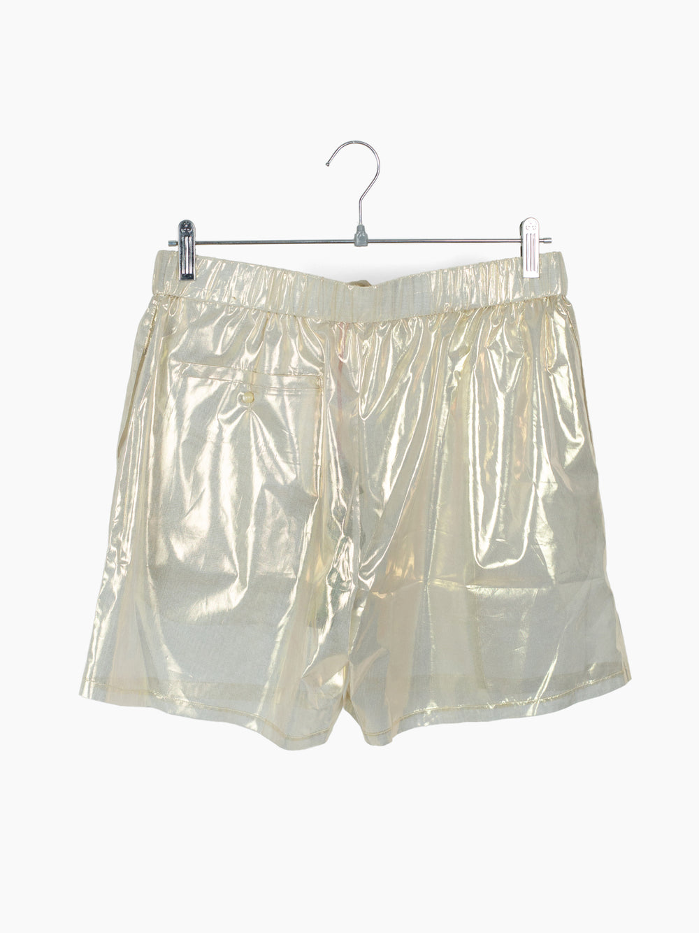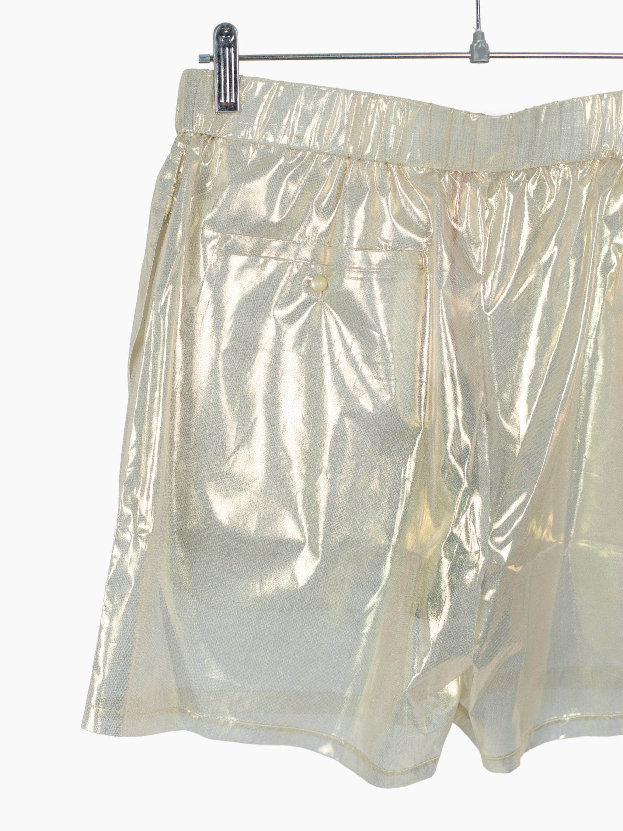 Sheer reflective gold foil shorts with short, activewear/underwear style inseam, two side hand pockets, single back bead-closed welt pocket, and elastic + drawstring waist.