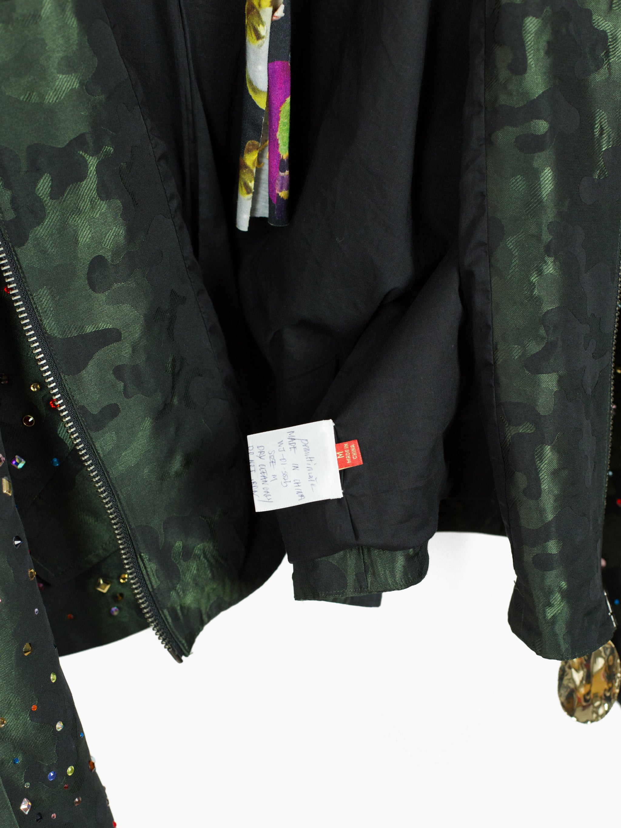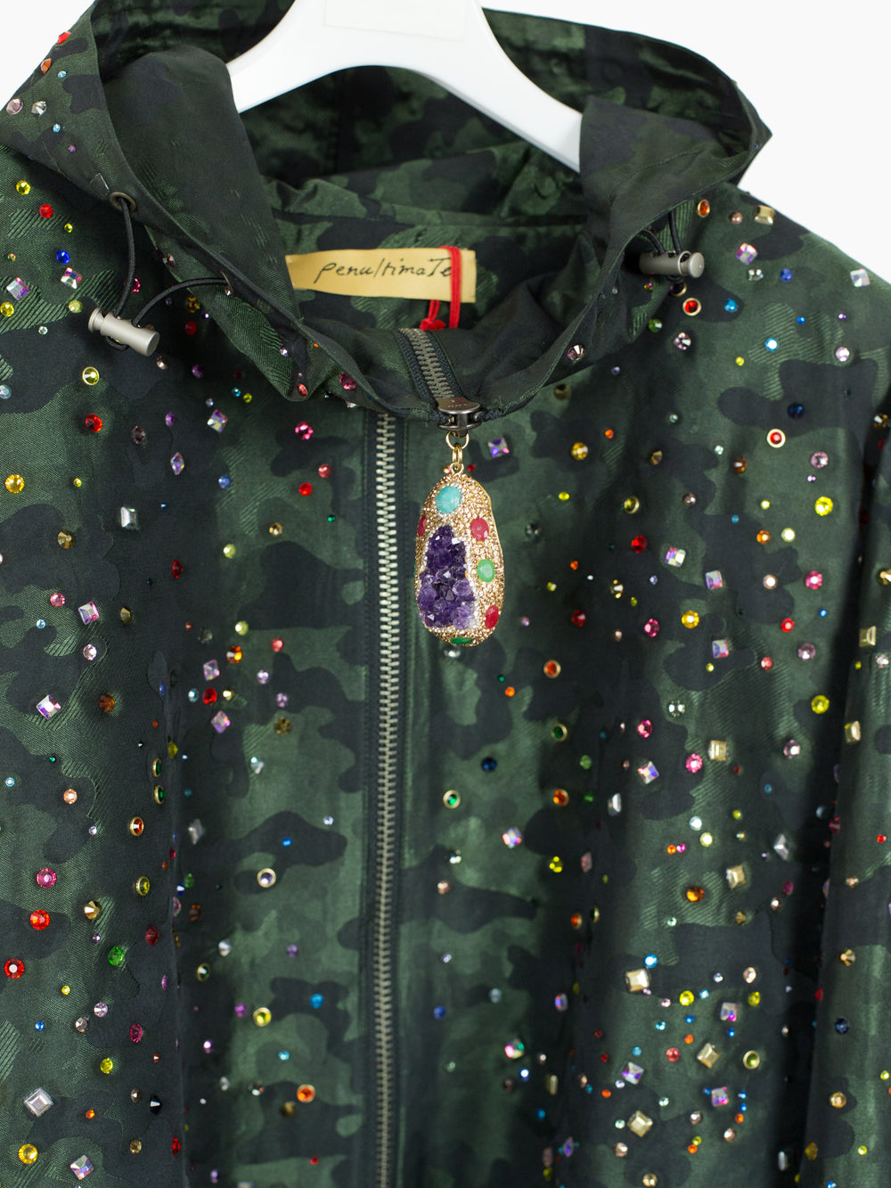 Military fishtail parka if it had been slashed at high waist, with a boxy and voluminous silhouette in body and sleeves. All details bridge kitsch and luxury--deep forest green jacquard-woven camo, randomly spaced multicolor heatpressed rhinestones, and oversized in-matrix amethyst pull on chunky gunmetal-tone zipper. Has both a worldly and celestial feeling.