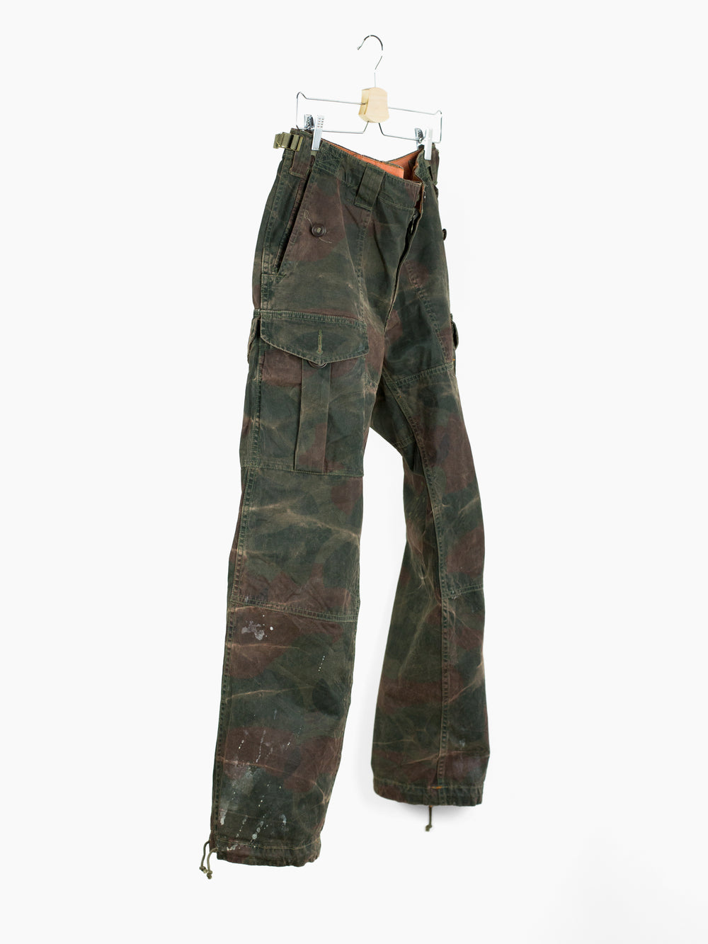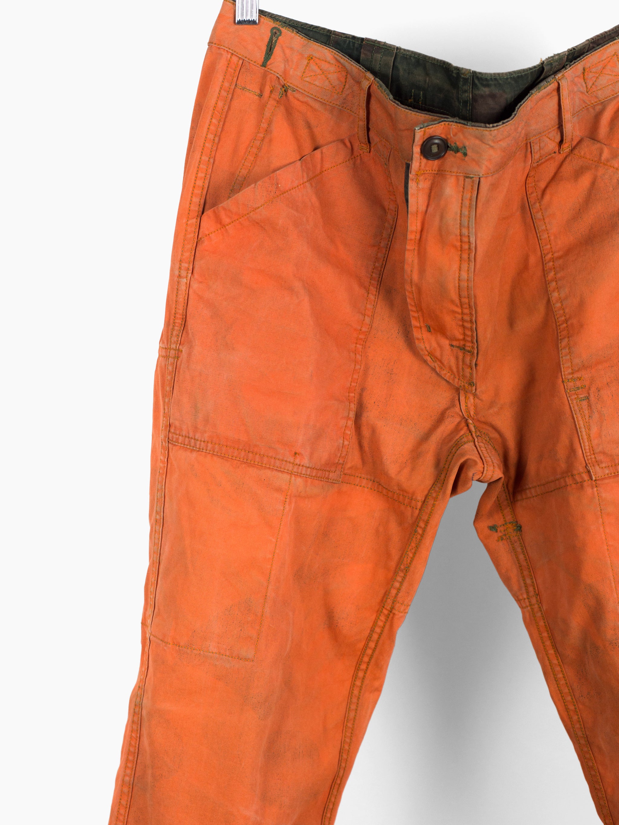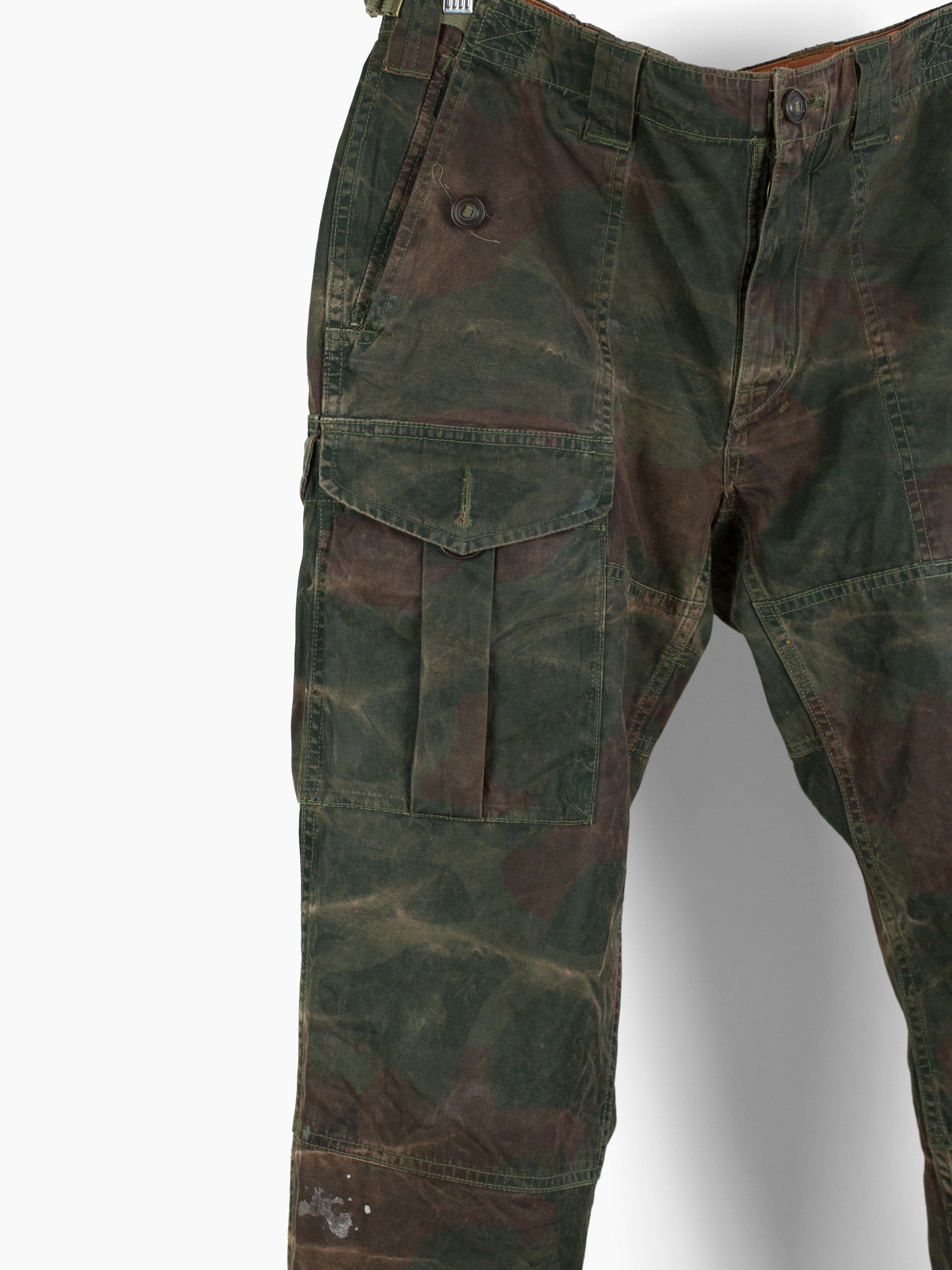 Reversible oiled cotton cargo trousers from vintage 2000s Polo Ralph Lauren. This pair features an asymmetrical cargo pocket layout and an earth-toned camouflage that's reminiscent of 60s Belgian Brushstroke. They've been aged beautifully, with the oiled finish on the camo side developing 'pull-up' style fade patterns at high wear/crease areas. This garment is committed to its reversibility with no expense spared--seams are felled and chainstitched and both sides feature functional waist and back pockets (layered over reinforced seat panels nonetheless). The fly features a reversible zipper and dual button waist. Perhaps the most beautiful part of these pants is the way that the inside orange face subtlely images the other side of the trouser, simulating the appearance of 'another' pair of pants--you see the lines of stitching that secure the cargo pockets on the other side; there are dots of olive from threads that have been pulled through due to an ever-so-slightly imperfect tension setting; olive bartacks punctuate the other side's pocket openings and belt loops; the print has bled through, creating an effect of ghostly tonal camouflage.