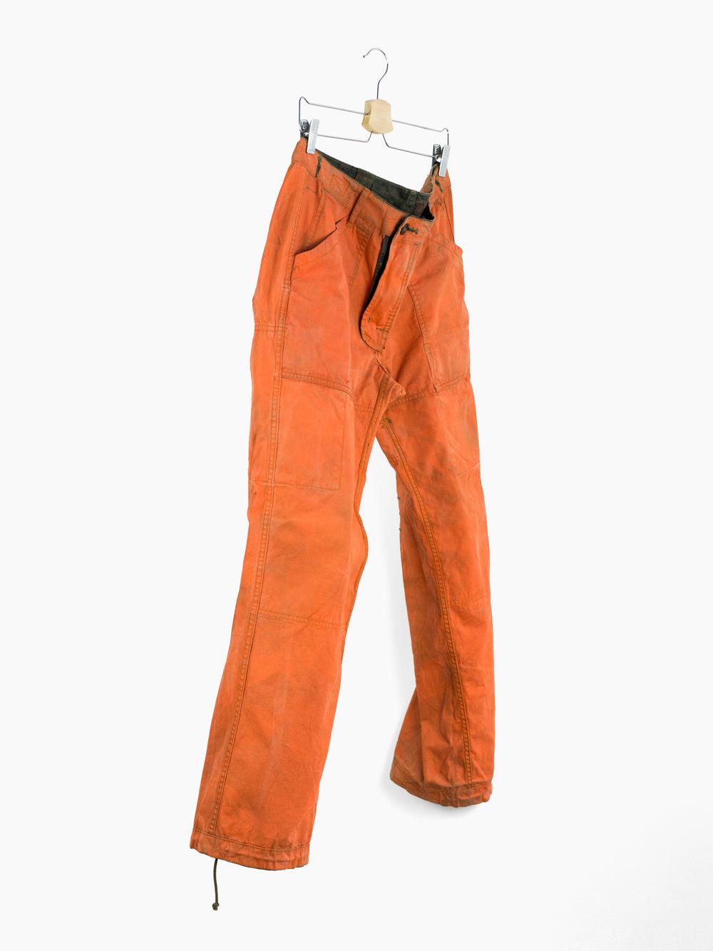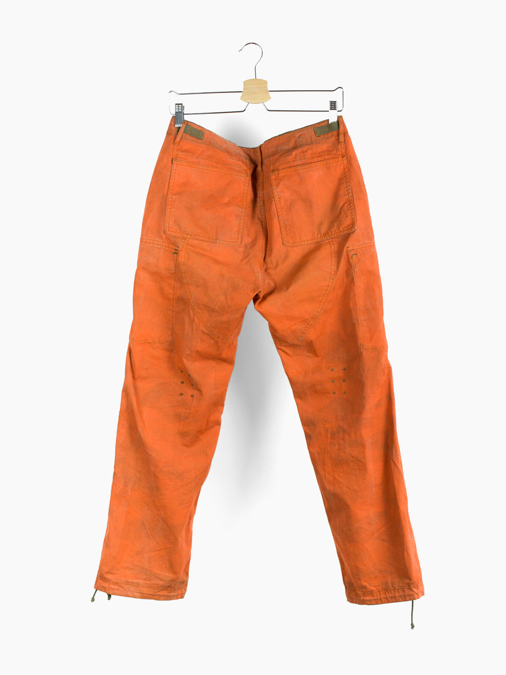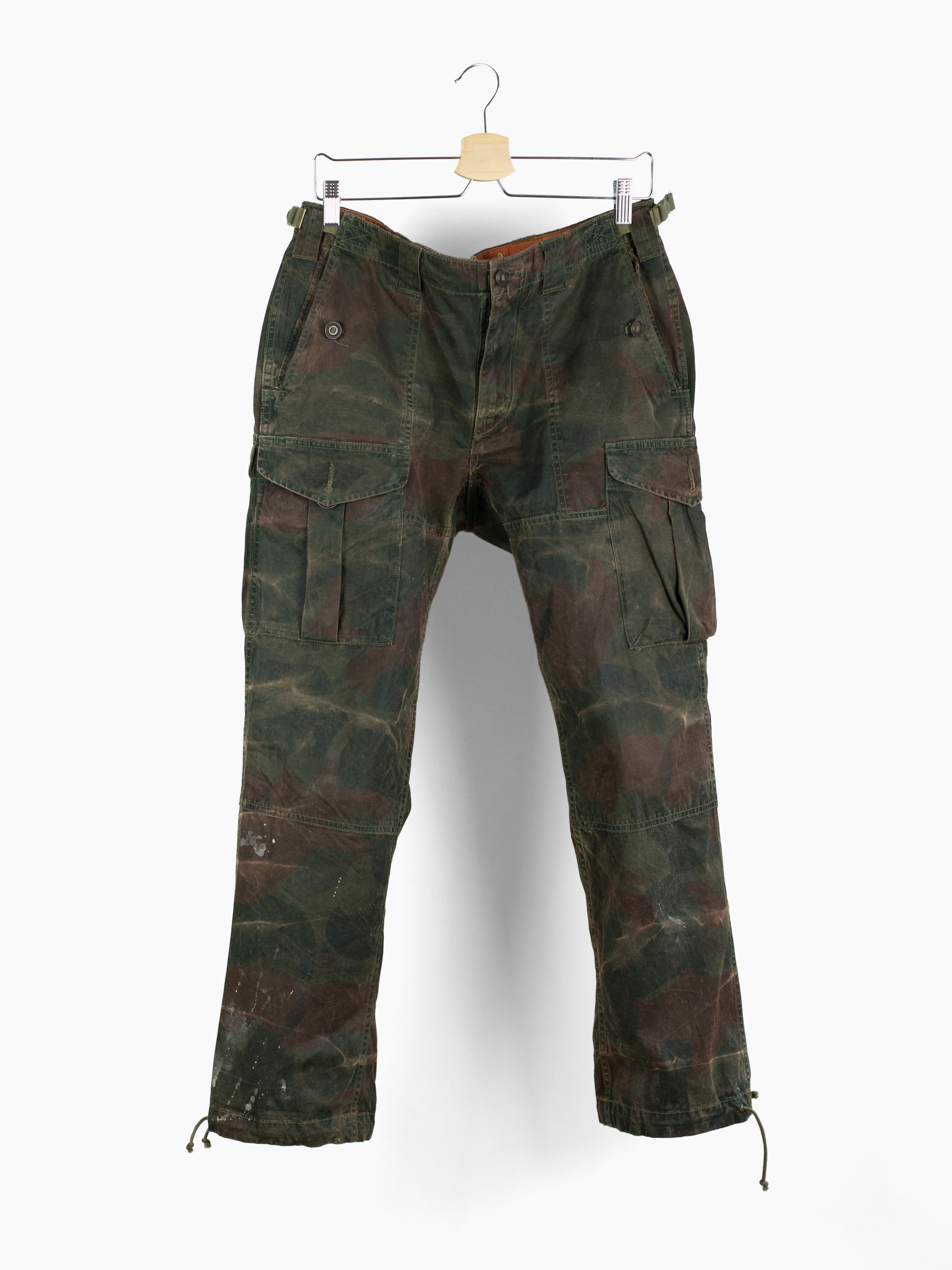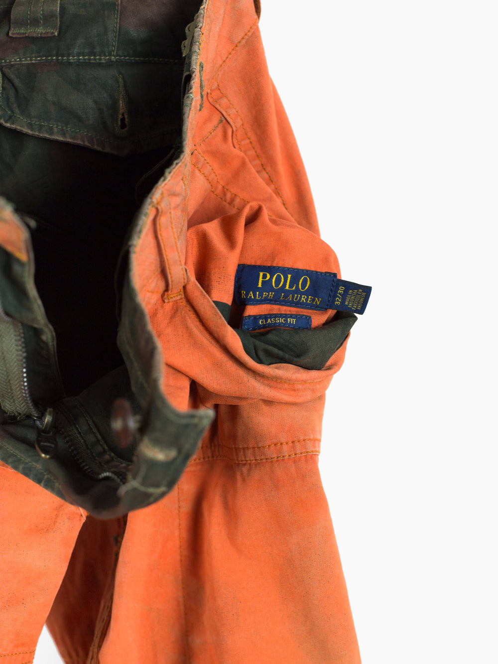 Reversible oiled cotton cargo trousers from vintage 2000s Polo Ralph Lauren. This pair features an asymmetrical cargo pocket layout and an earth-toned camouflage that's reminiscent of 60s Belgian Brushstroke. They've been aged beautifully, with the oiled finish on the camo side developing 'pull-up' style fade patterns at high wear/crease areas. This garment is committed to its reversibility with no expense spared--seams are felled and chainstitched and both sides feature functional waist and back pockets (layered over reinforced seat panels nonetheless). The fly features a reversible zipper and dual button waist. Perhaps the most beautiful part of these pants is the way that the inside orange face subtlely images the other side of the trouser, simulating the appearance of 'another' pair of pants--you see the lines of stitching that secure the cargo pockets on the other side; there are dots of olive from threads that have been pulled through due to an ever-so-slightly imperfect tension setting; olive bartacks punctuate the other side's pocket openings and belt loops; the print has bled through, creating an effect of ghostly tonal camouflage.