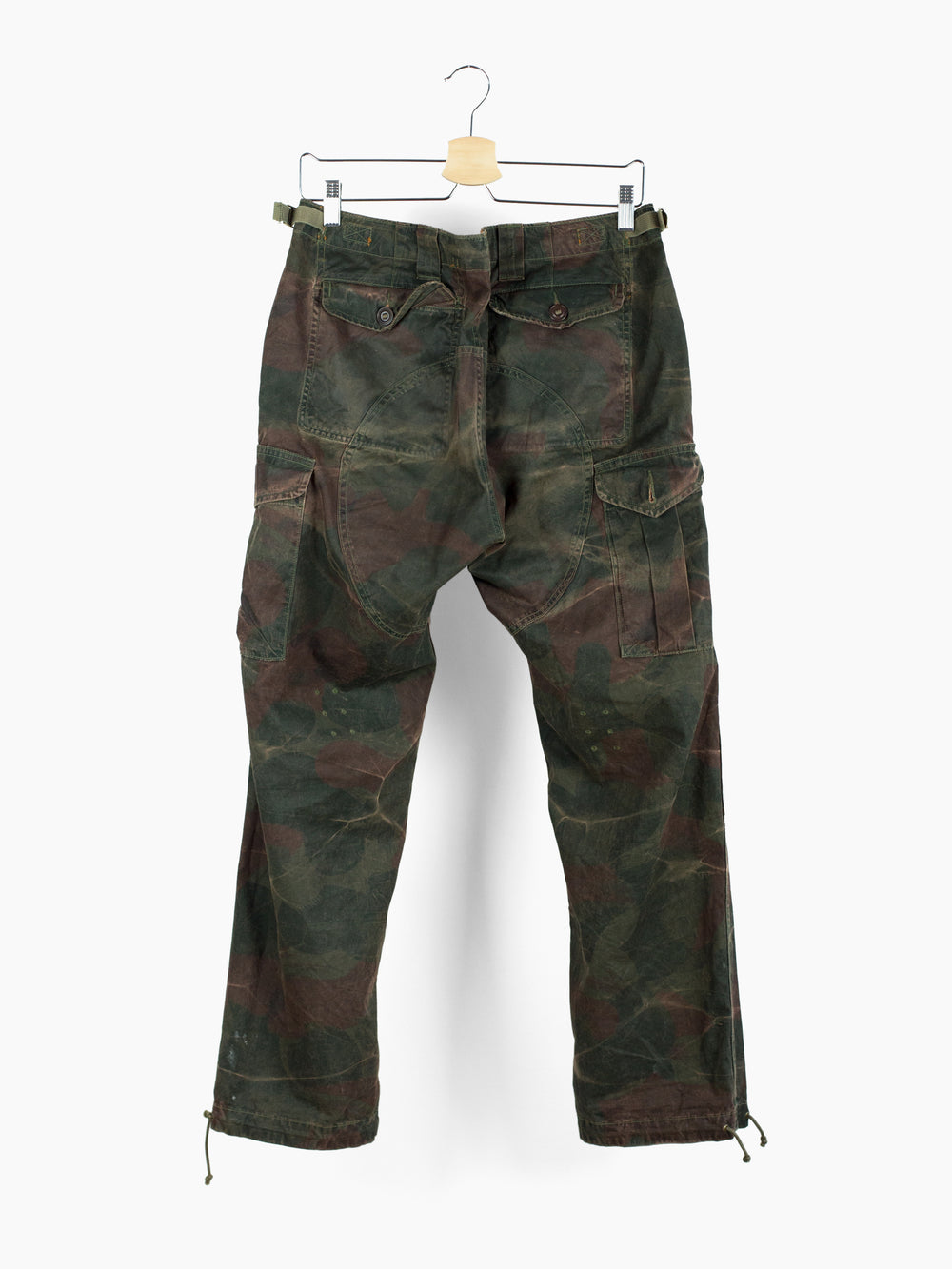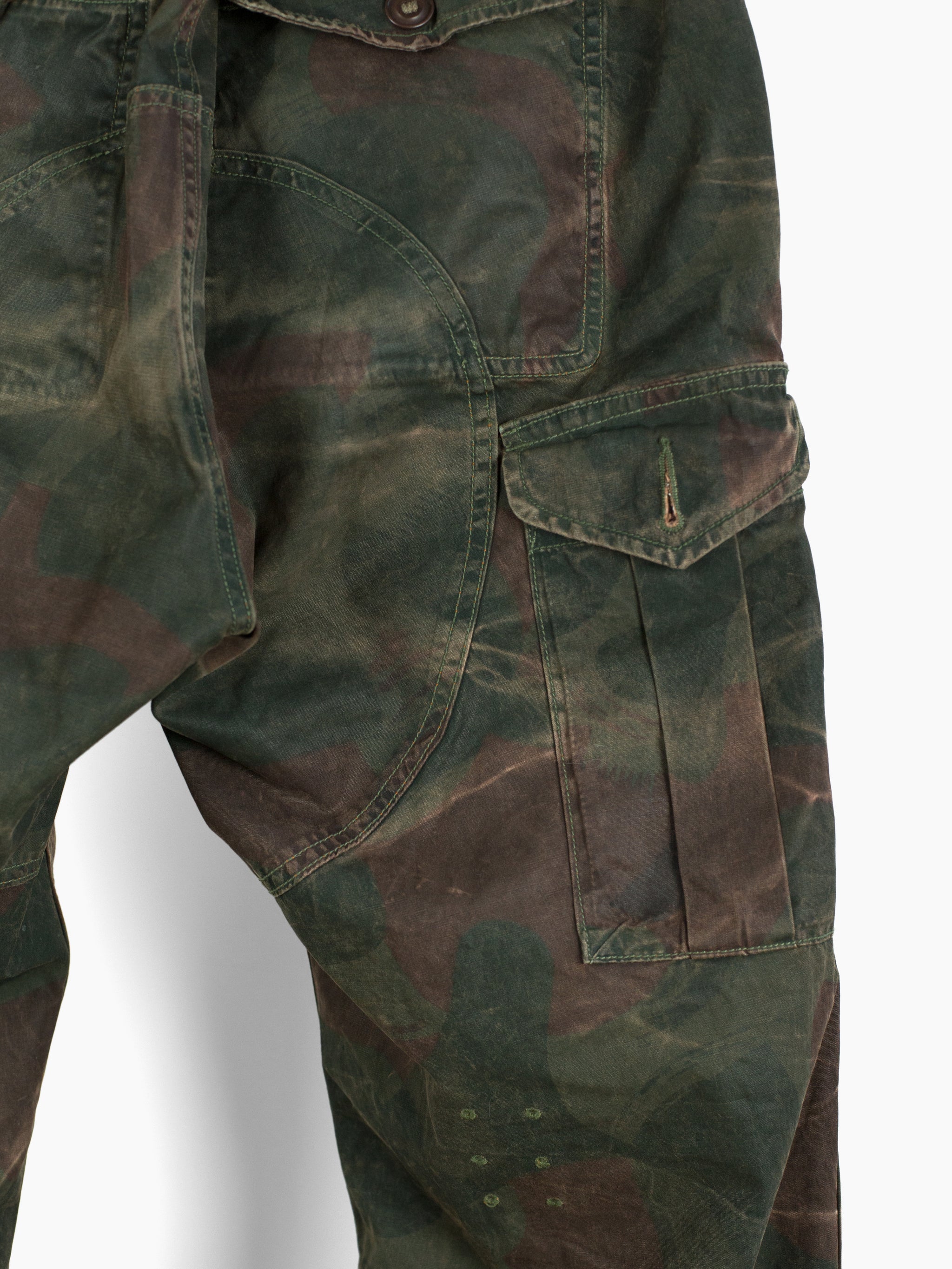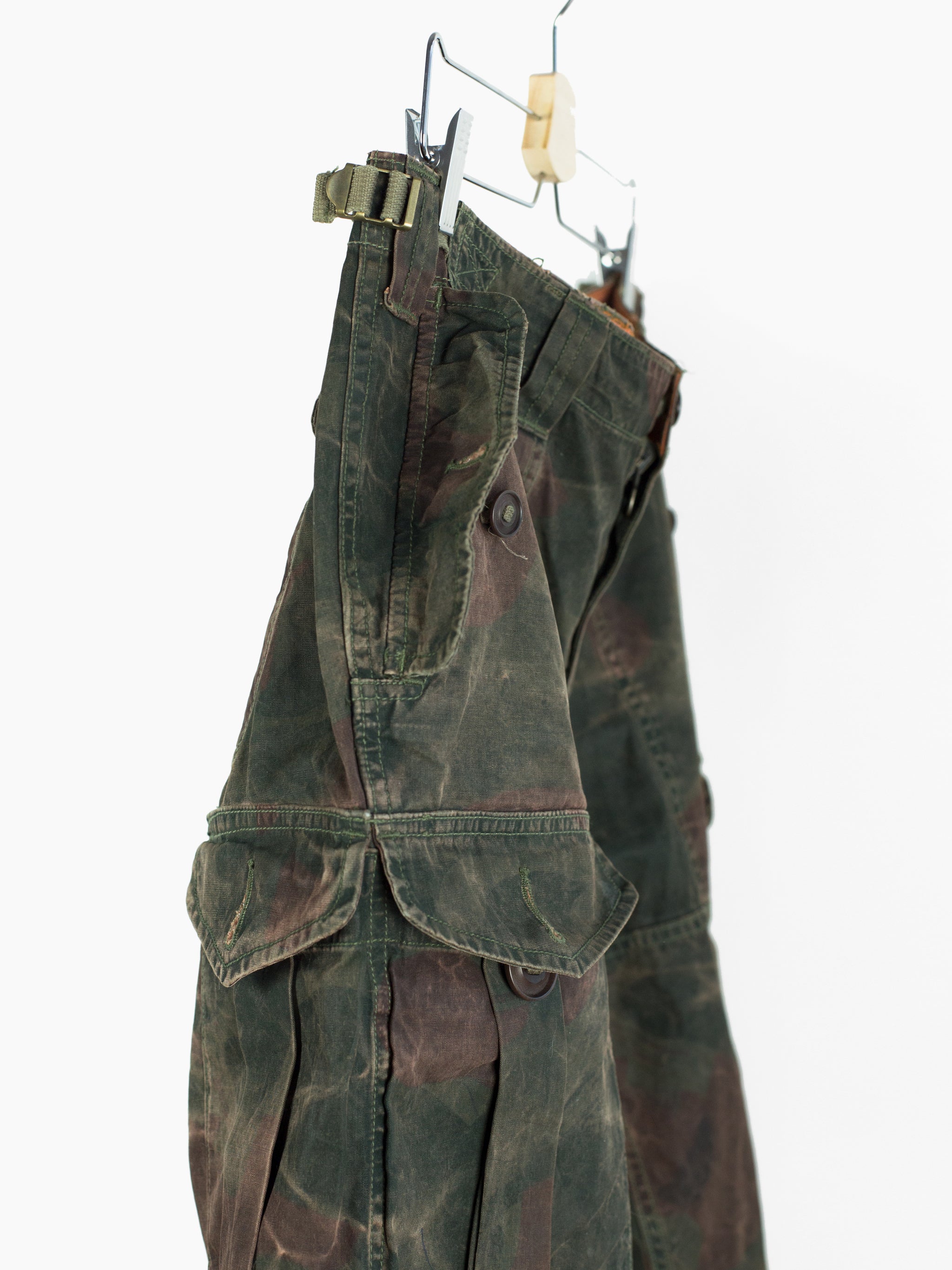 Made in Indonesia 7.5/10 Condition, with no rips or tears. Finish shows a fair amount of patina which contributes to a worn, vintage look. Oiled camo side shows 'pull-up' fading at high crease/wear areas. Some paint splatters on the lower leg of the camo side.
