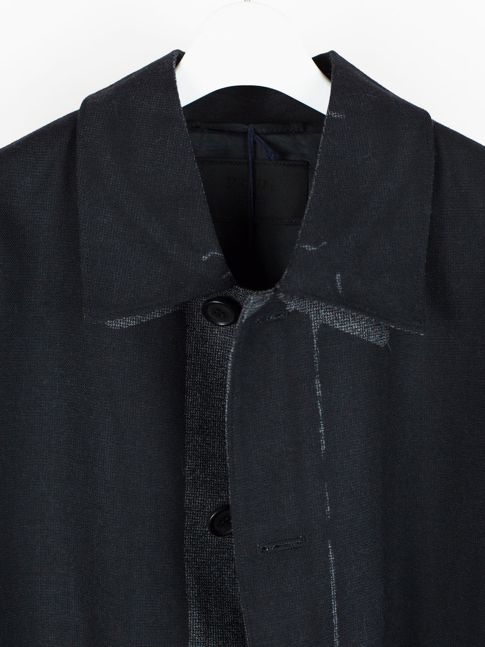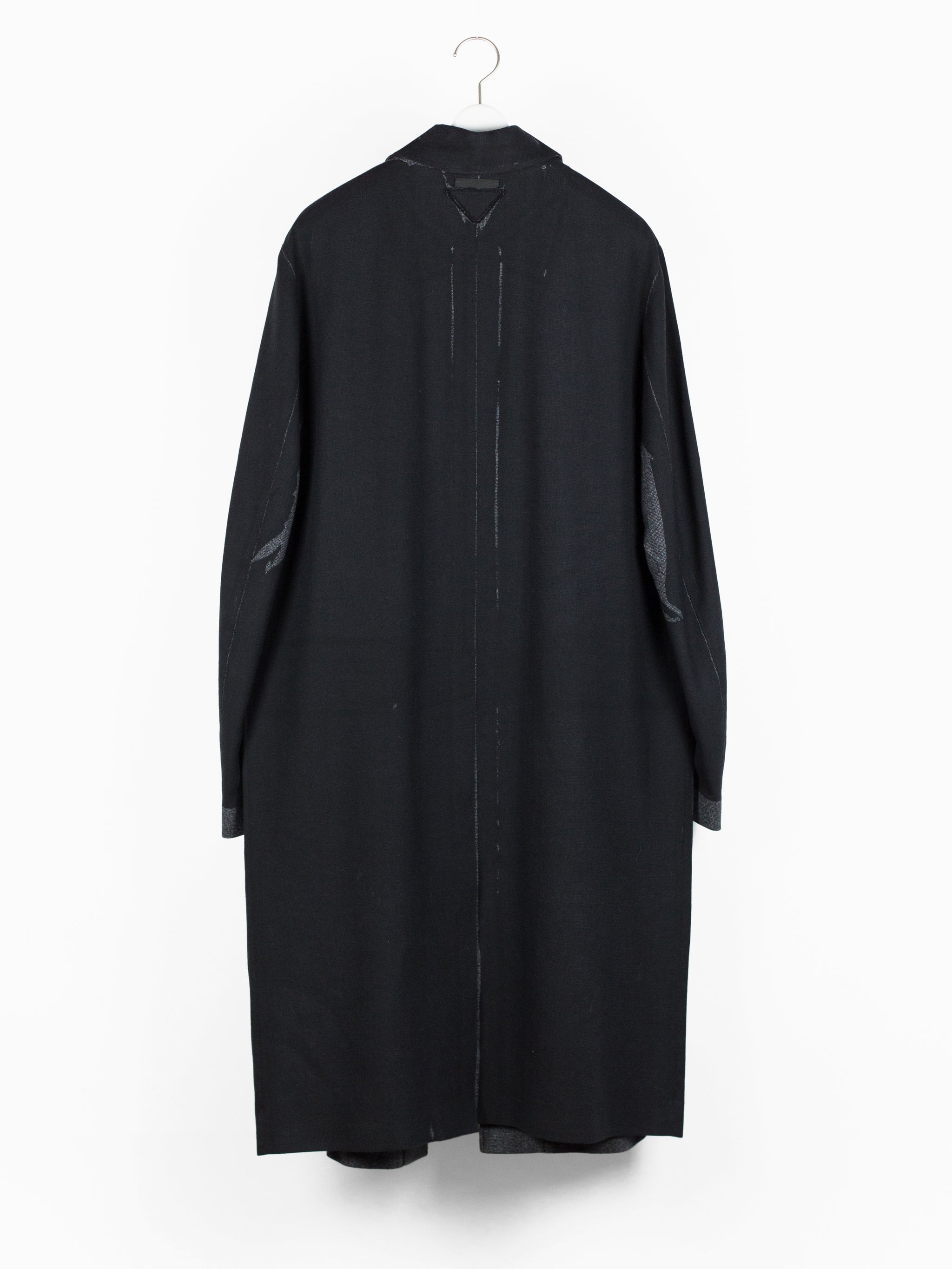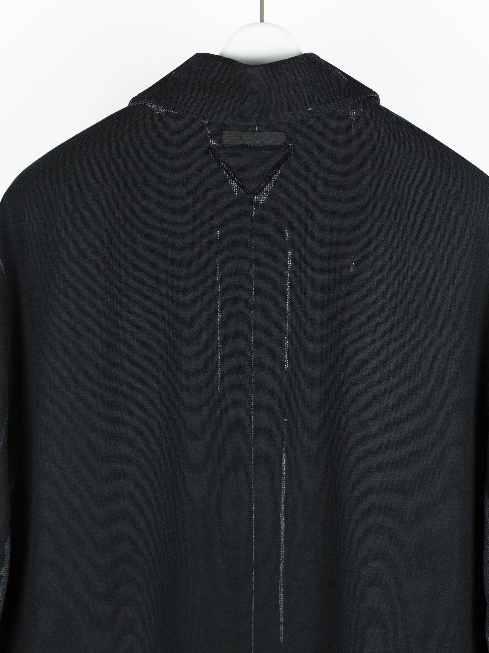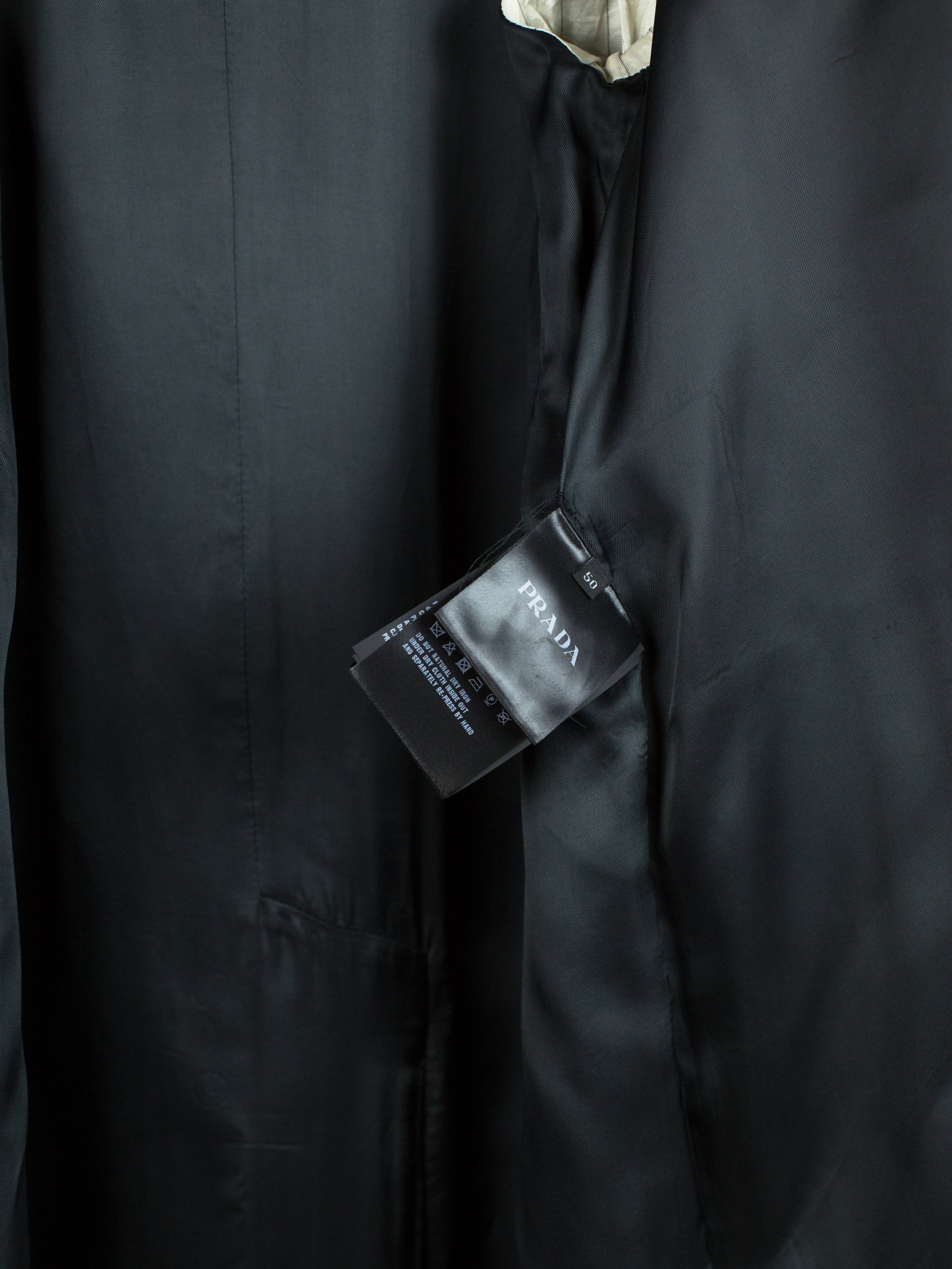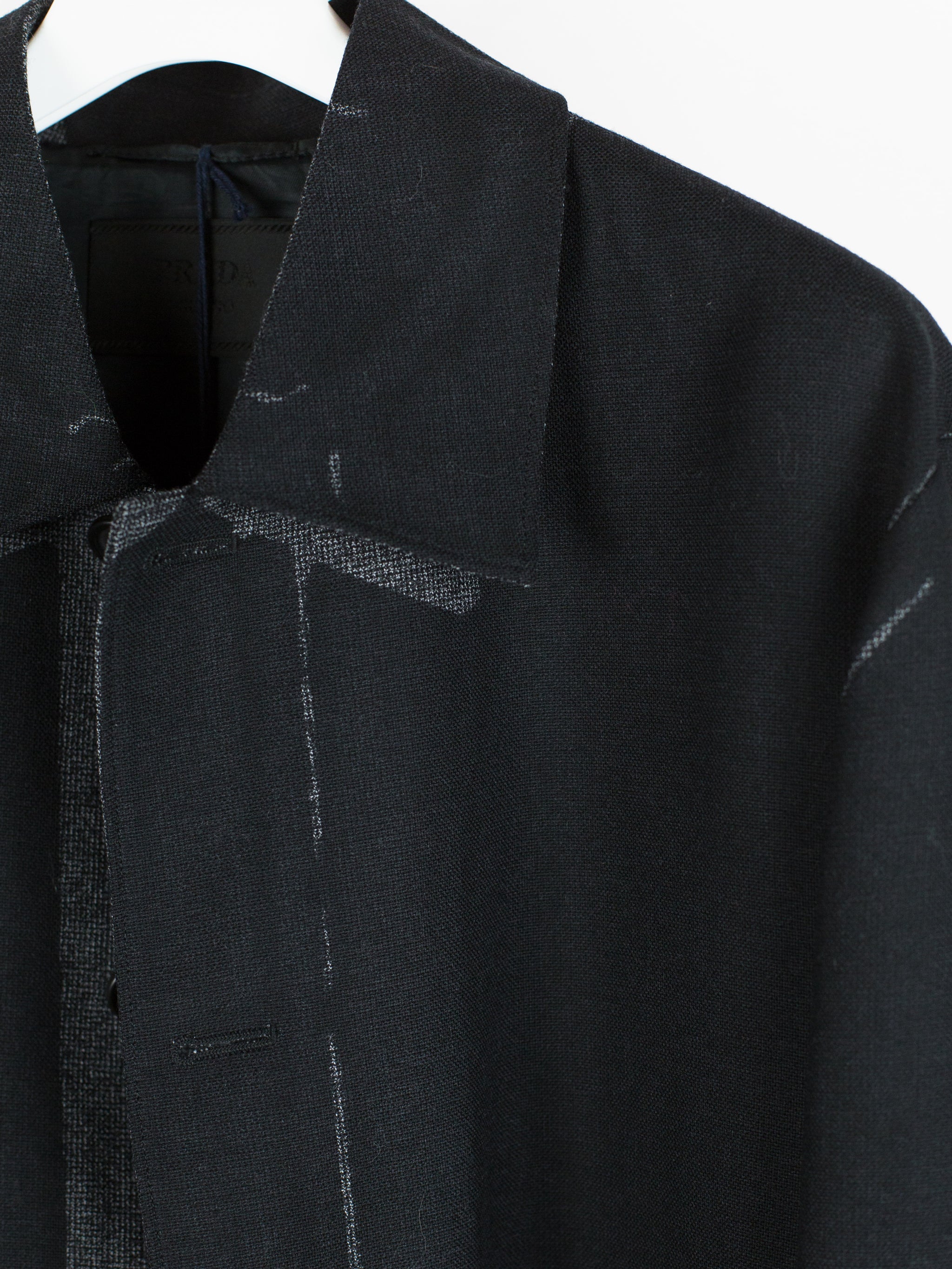 Beautiful mac coat from Prada AW18 features the season's signature overprint treatment in which the completed garment is placed on a flat bed then printed with a flat black layer of ink, in effect 'scanning' the layers and details of the garment in relief. The flattening of a 3D garment leaves traces of wrinkles, raised seamlines, etc. an ephemeral state that the print freezes in time.