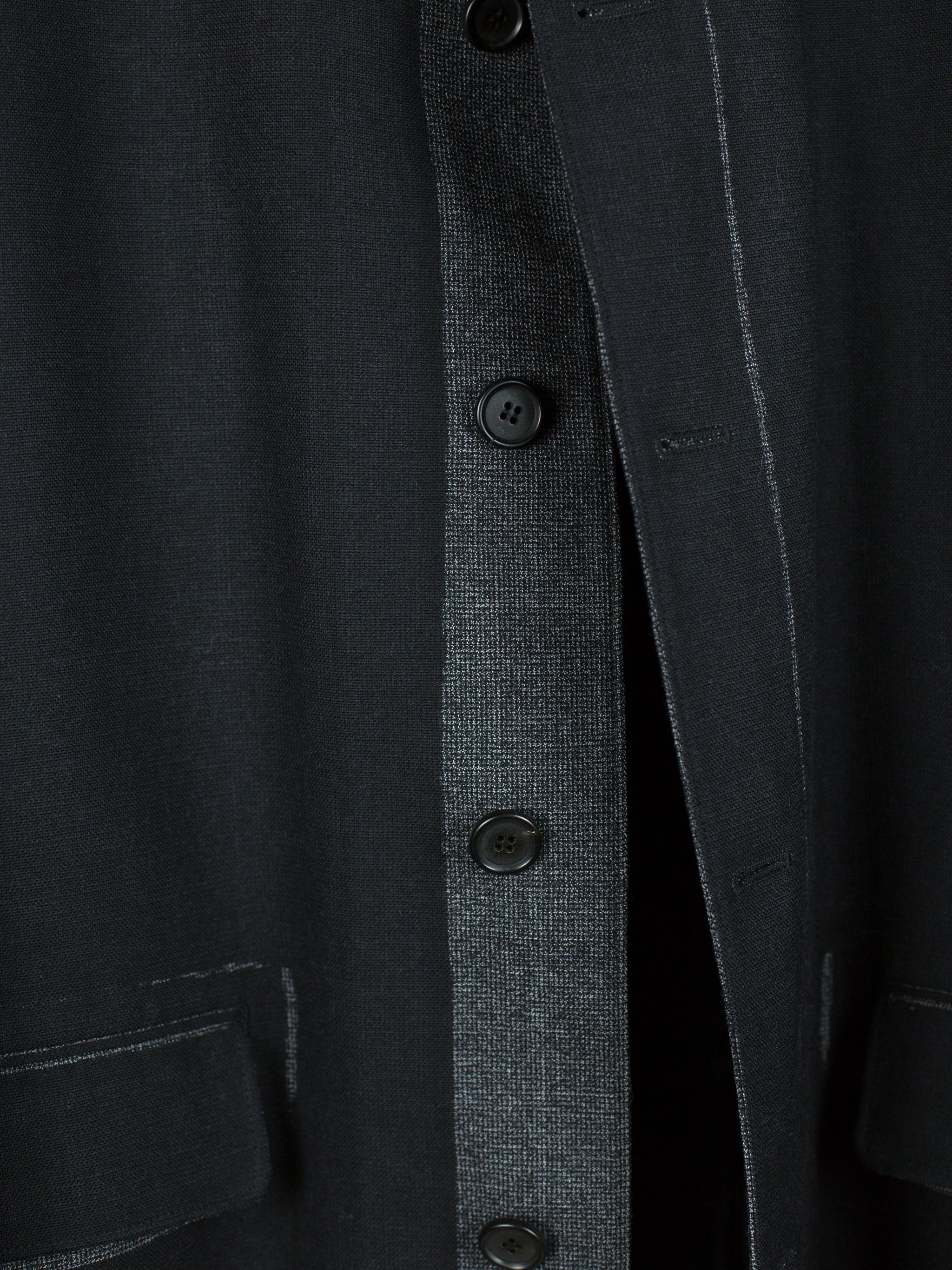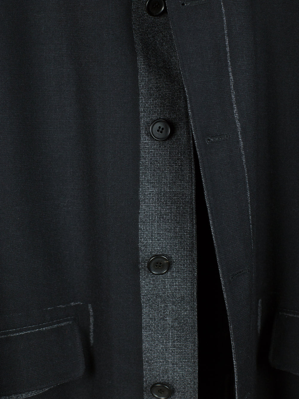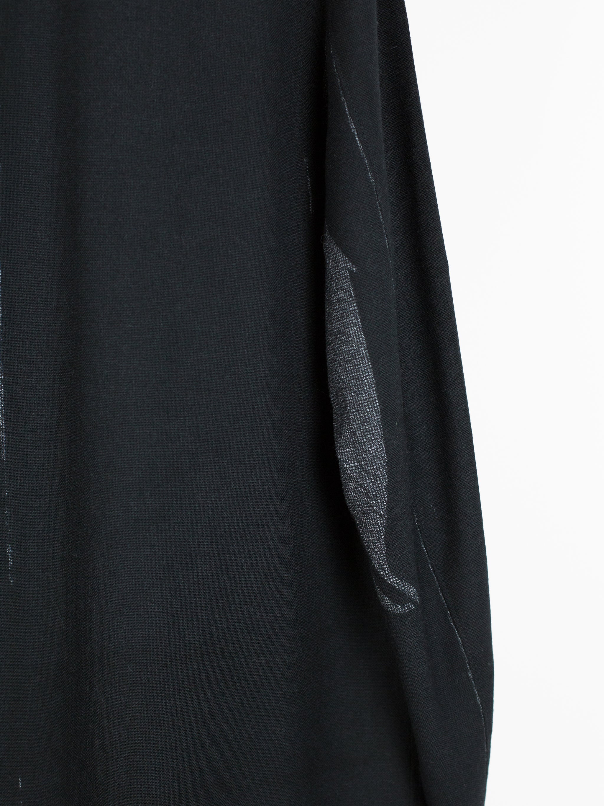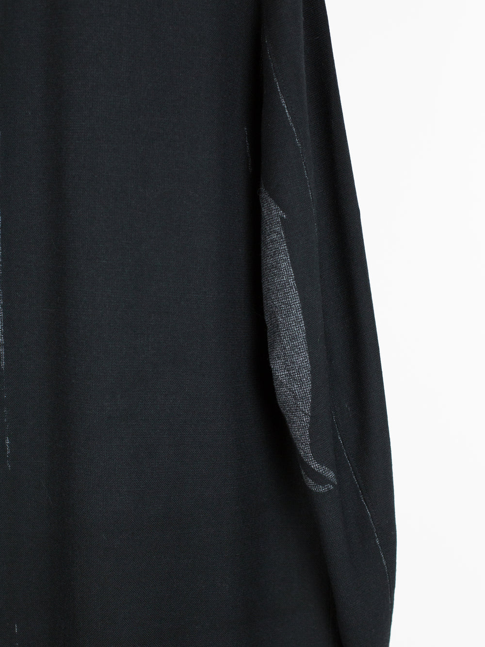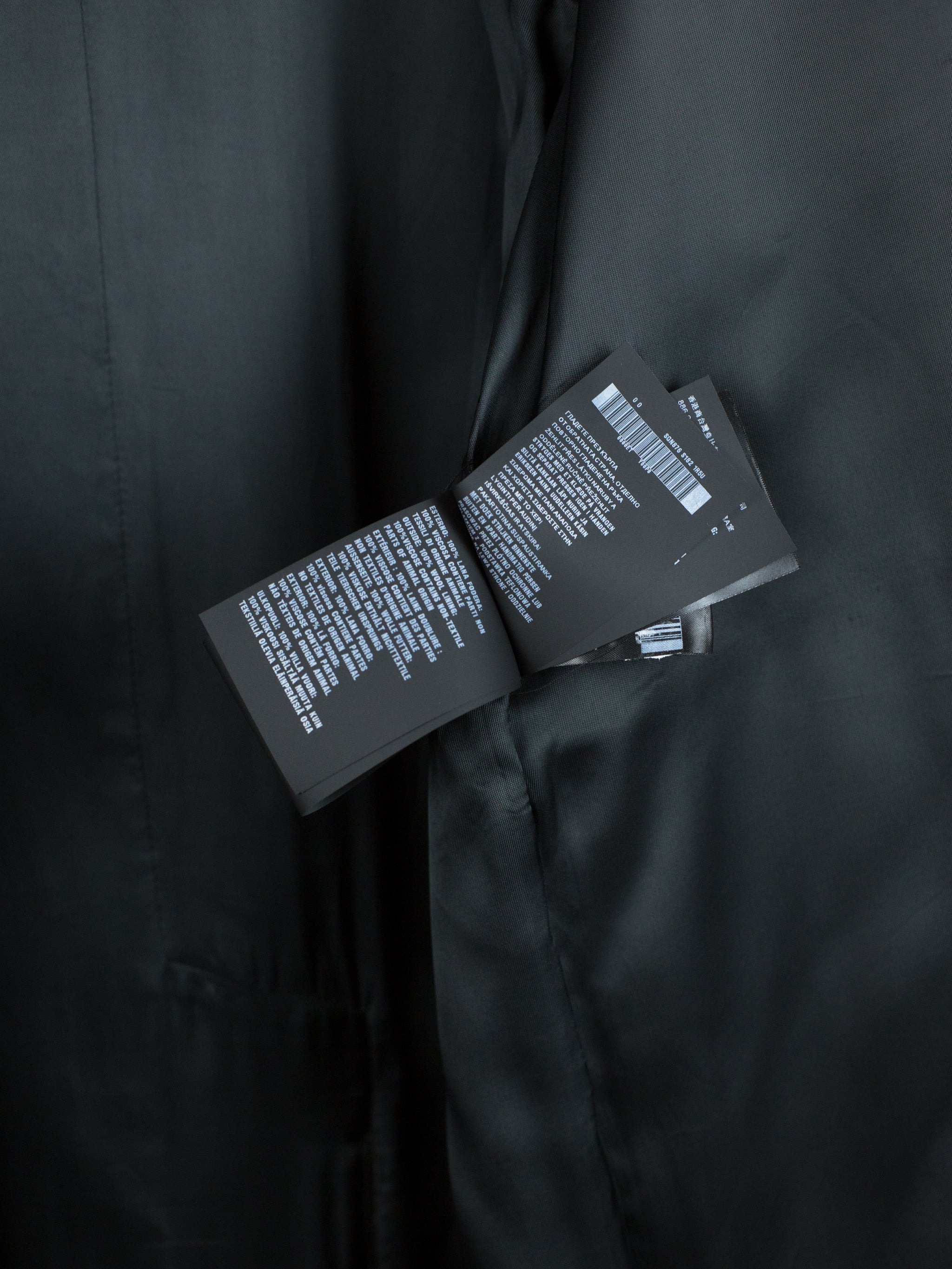 Beautiful mac coat from Prada AW18 features the season's signature overprint treatment in which the completed garment is placed on a flat bed then printed with a flat black layer of ink, in effect 'scanning' the layers and details of the garment in relief. The flattening of a 3D garment leaves traces of wrinkles, raised seamlines, etc. an ephemeral state that the print freezes in time.