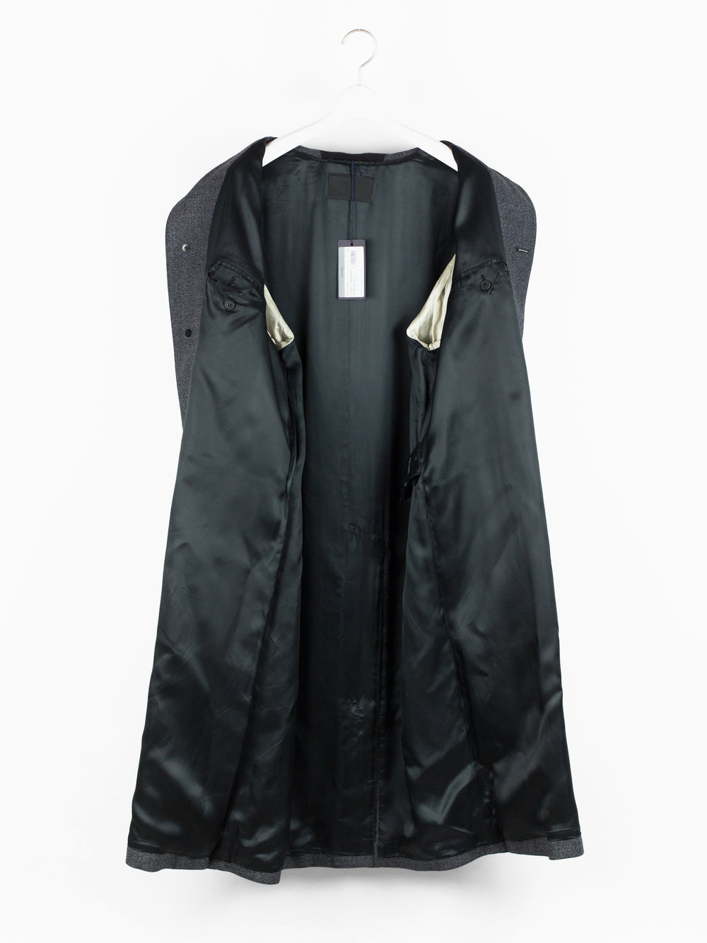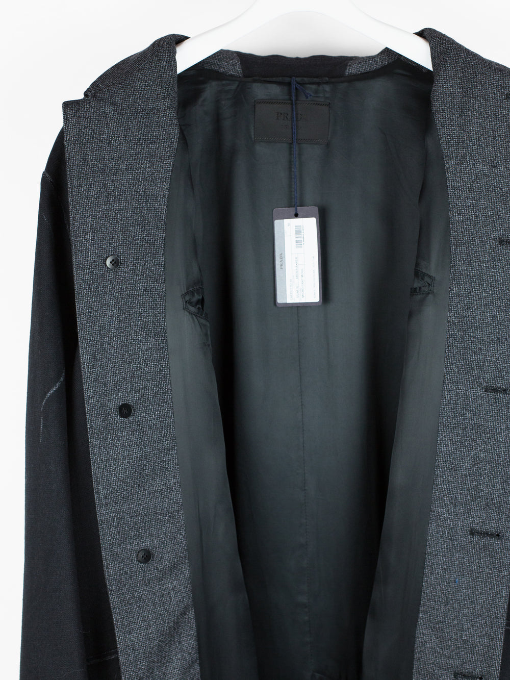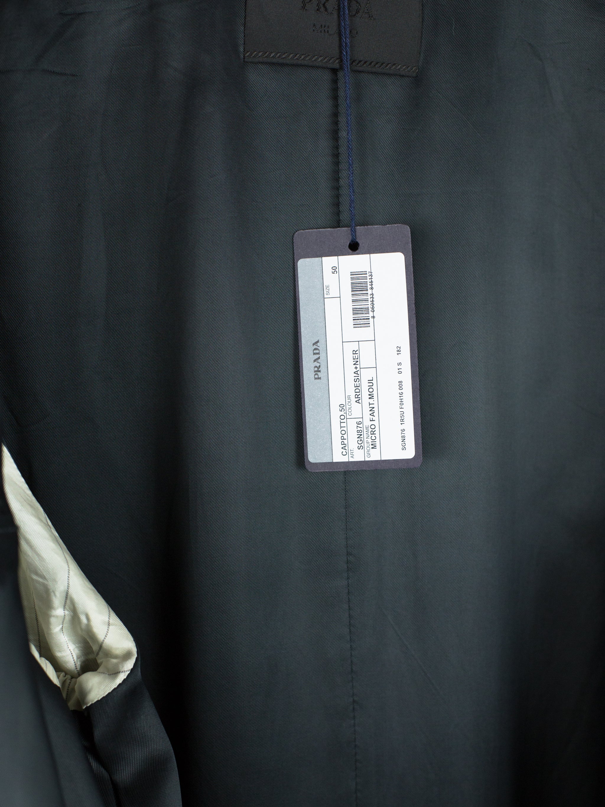 This mac is cut in micro houndstooth wool, creating a beautifully textured/patterned finish that is muted with the black overprint. It's fully lined with two flap pockets at the waist and an adjustable back vent. Features Prada triangle insignia at the back neck.