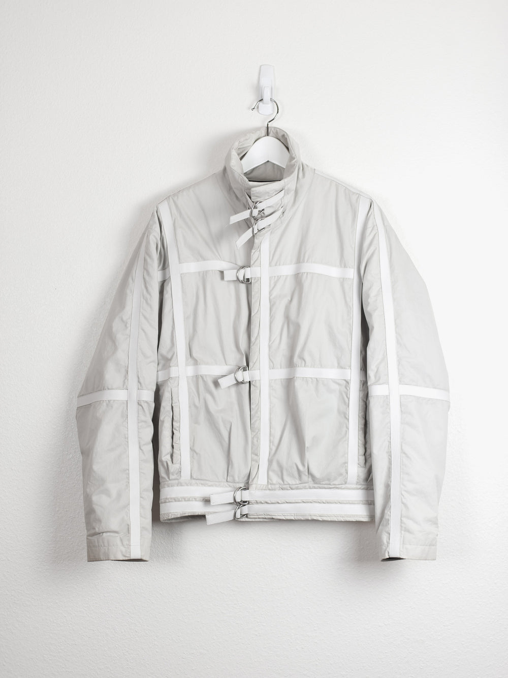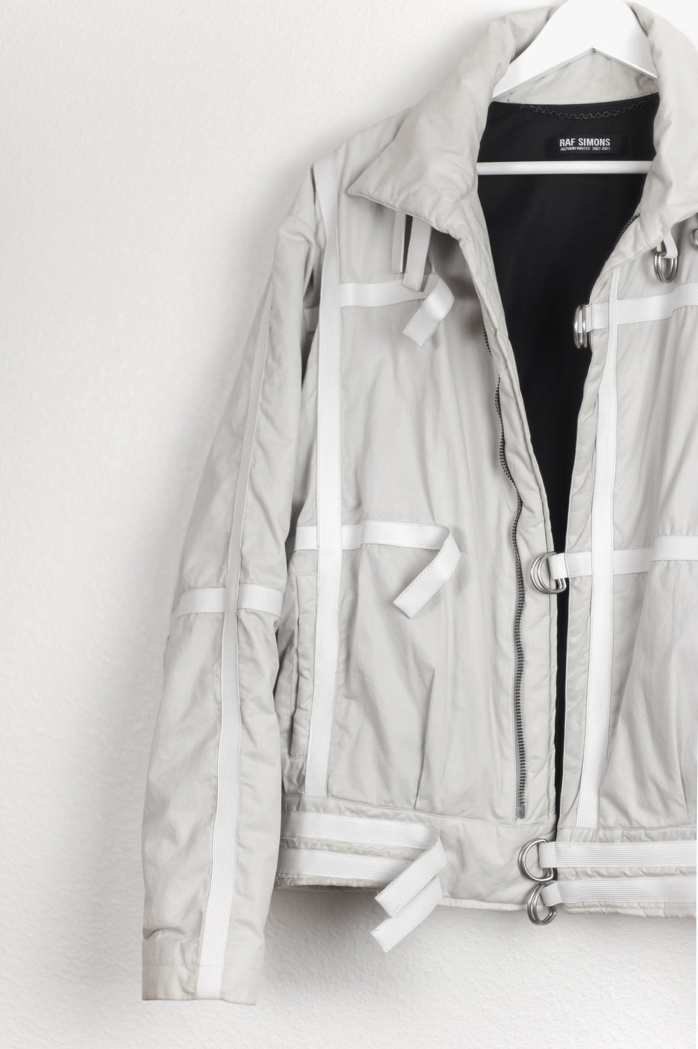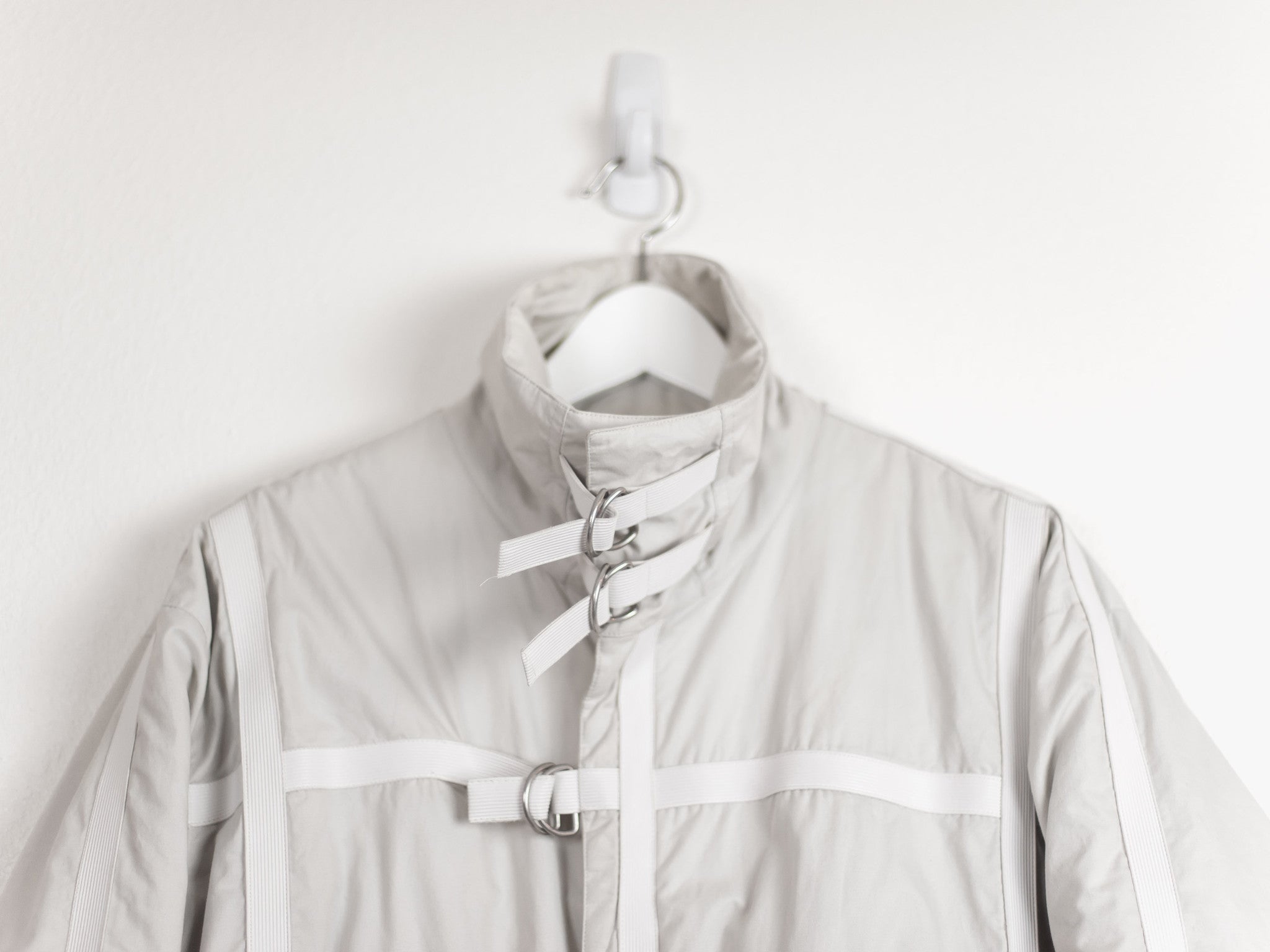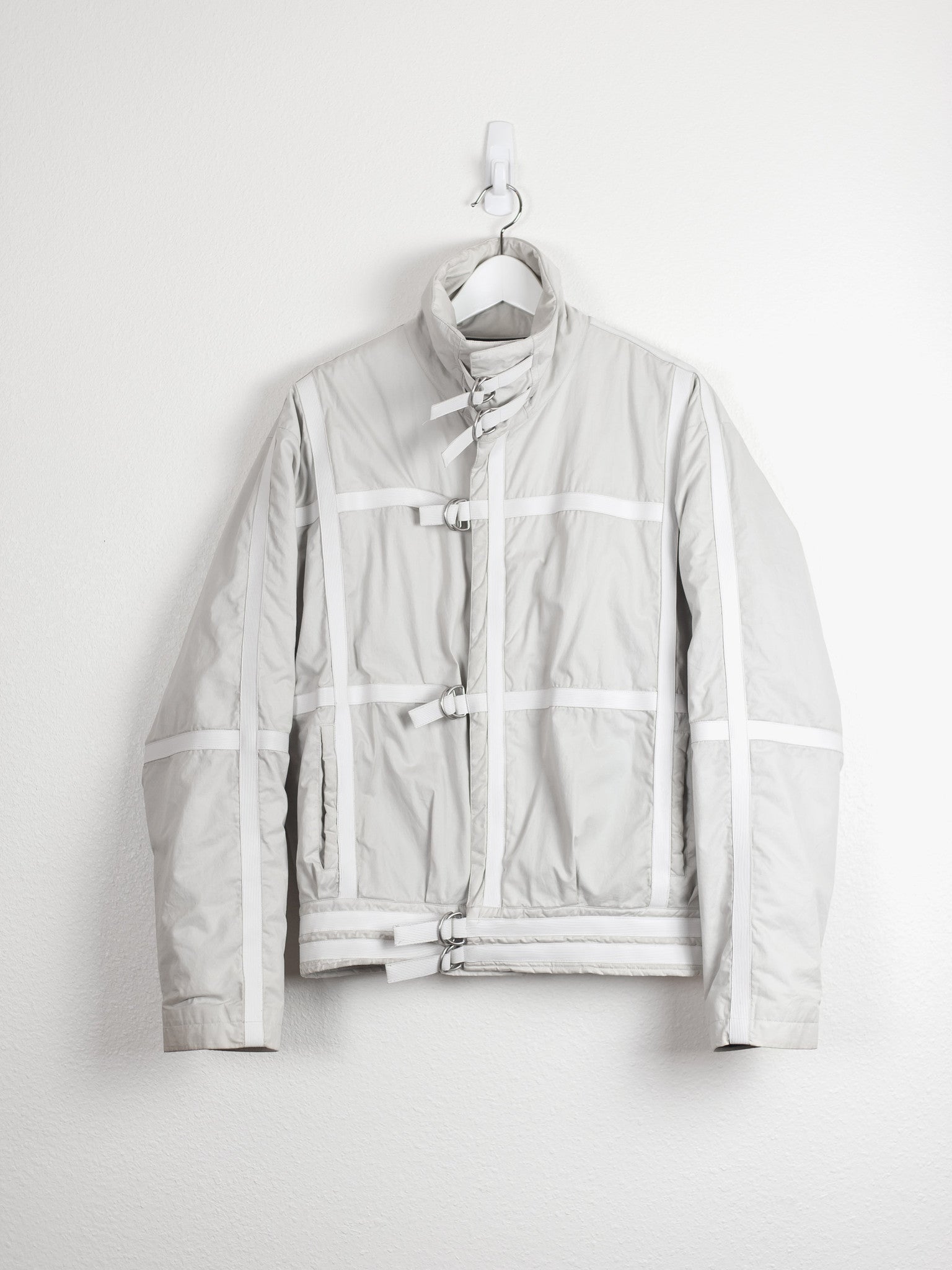 Extremely rare jacket from AW02 Virginia Creeper with amazing details. The surface and liner are cut from a smooth and substantial cotton, and the jacket is lightly padded. Detailed with rubberized bondage straps throughout. Really nice condition for its age, the only flaws being wear on the sleeve ends. 8.5/10 condition. Made in Belgium.