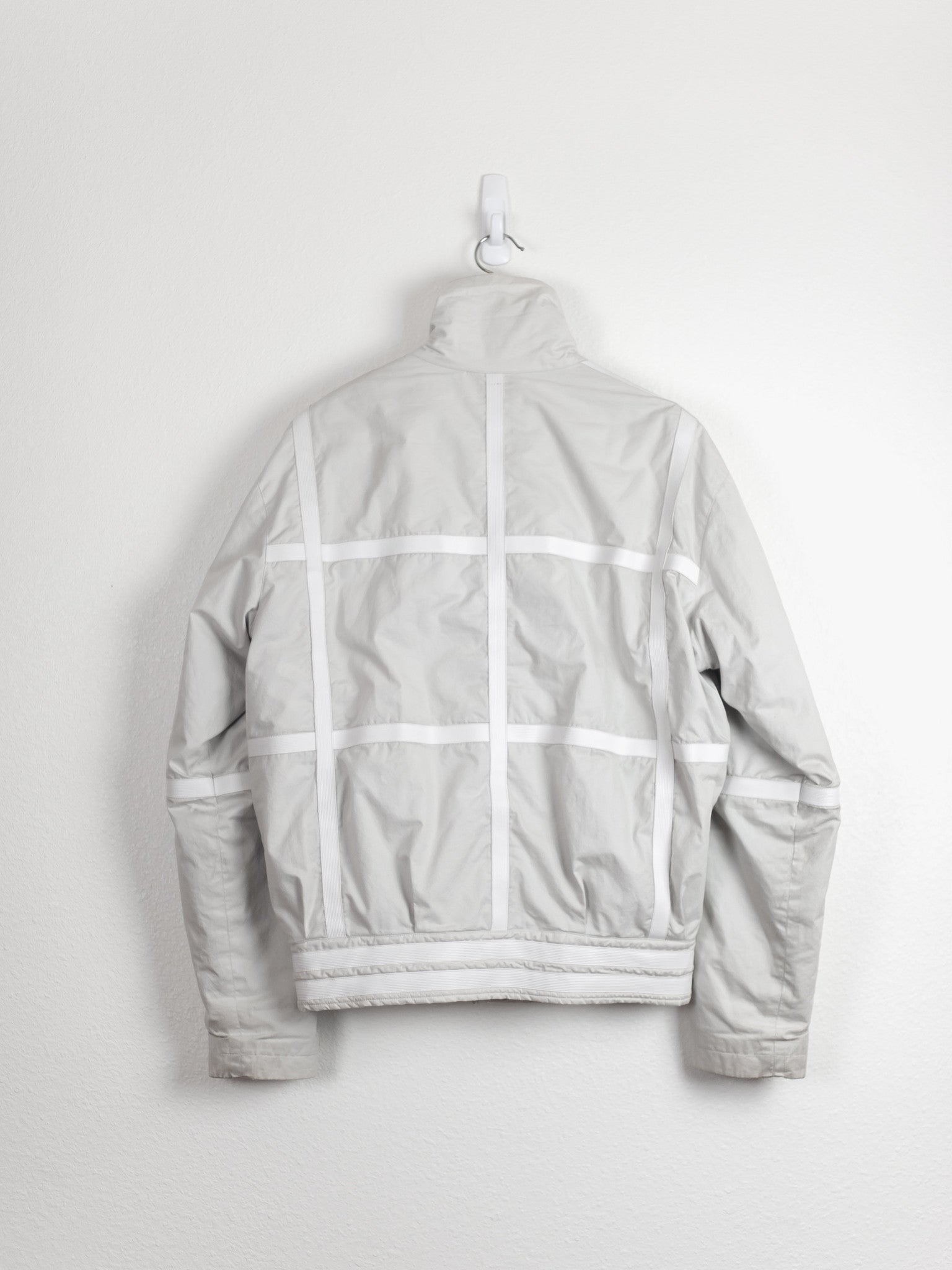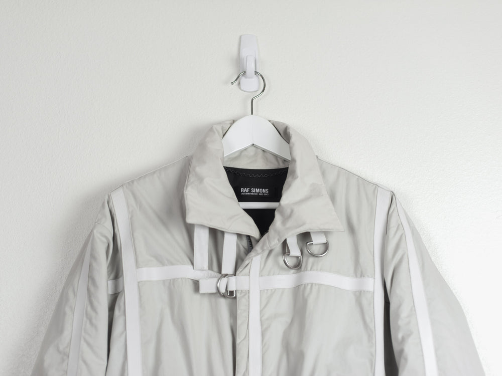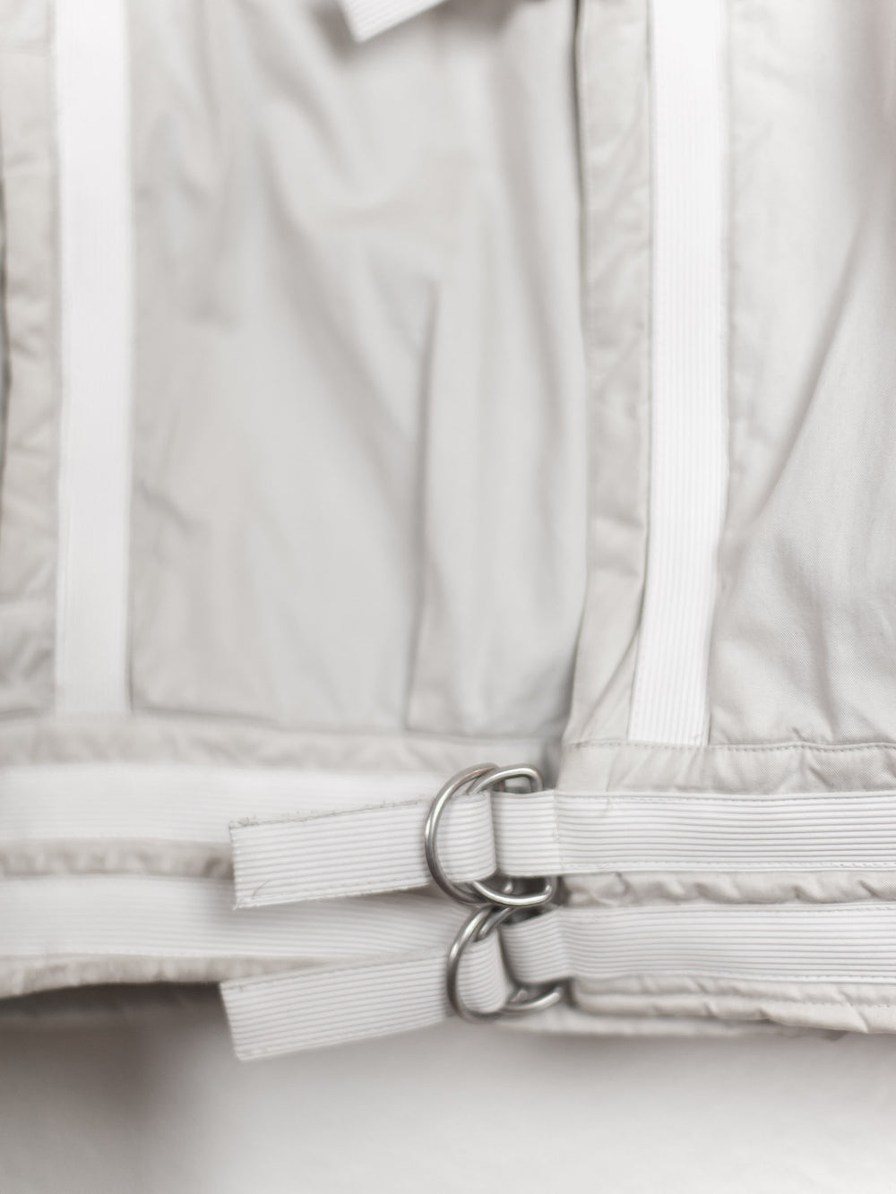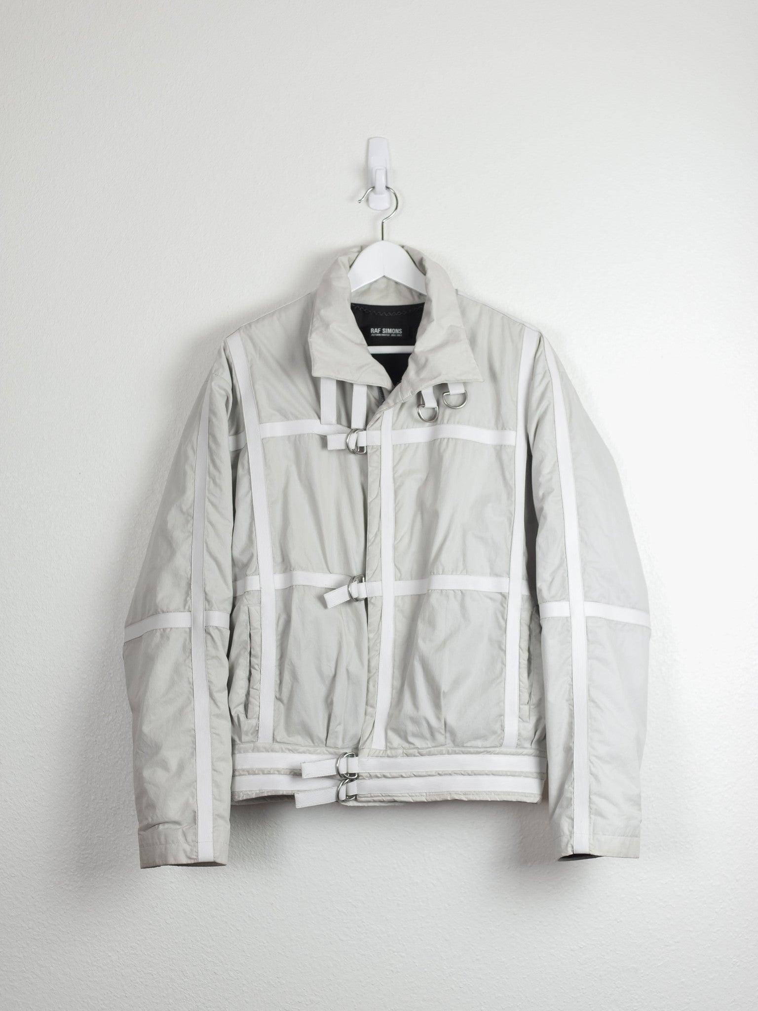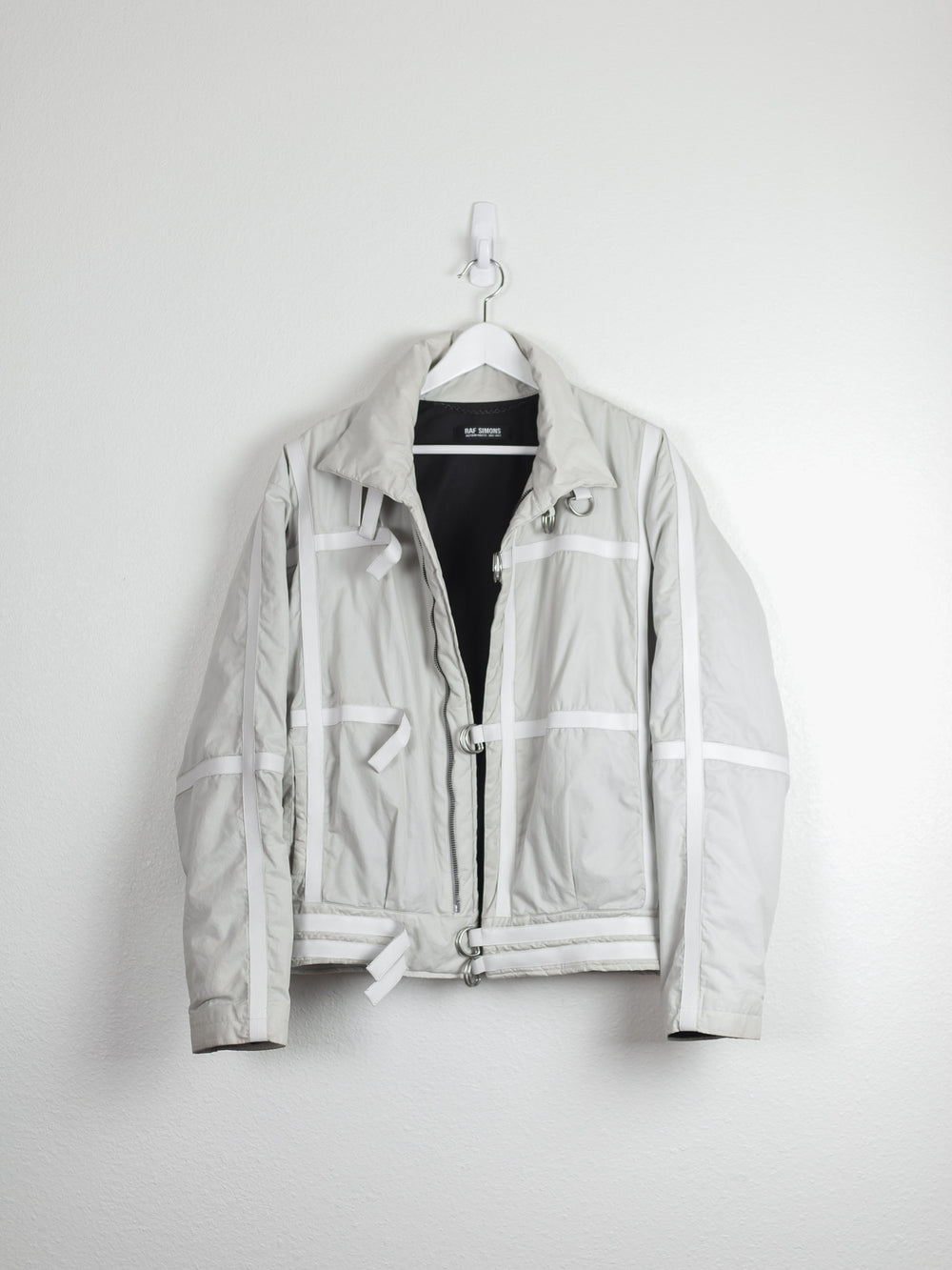 Extremely rare jacket from AW02 Virginia Creeper with amazing details. The surface and liner are cut from a smooth and substantial cotton, and the jacket is lightly padded. Detailed with rubberized bondage straps throughout. Really nice condition for its age, the only flaws being wear on the sleeve ends. 8.5/10 condition. Made in Belgium.