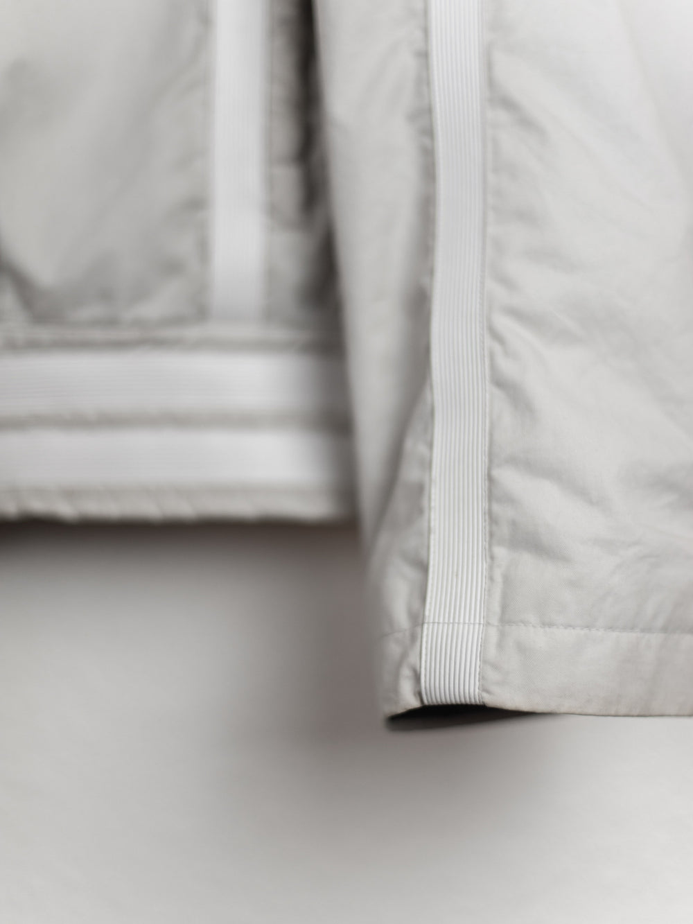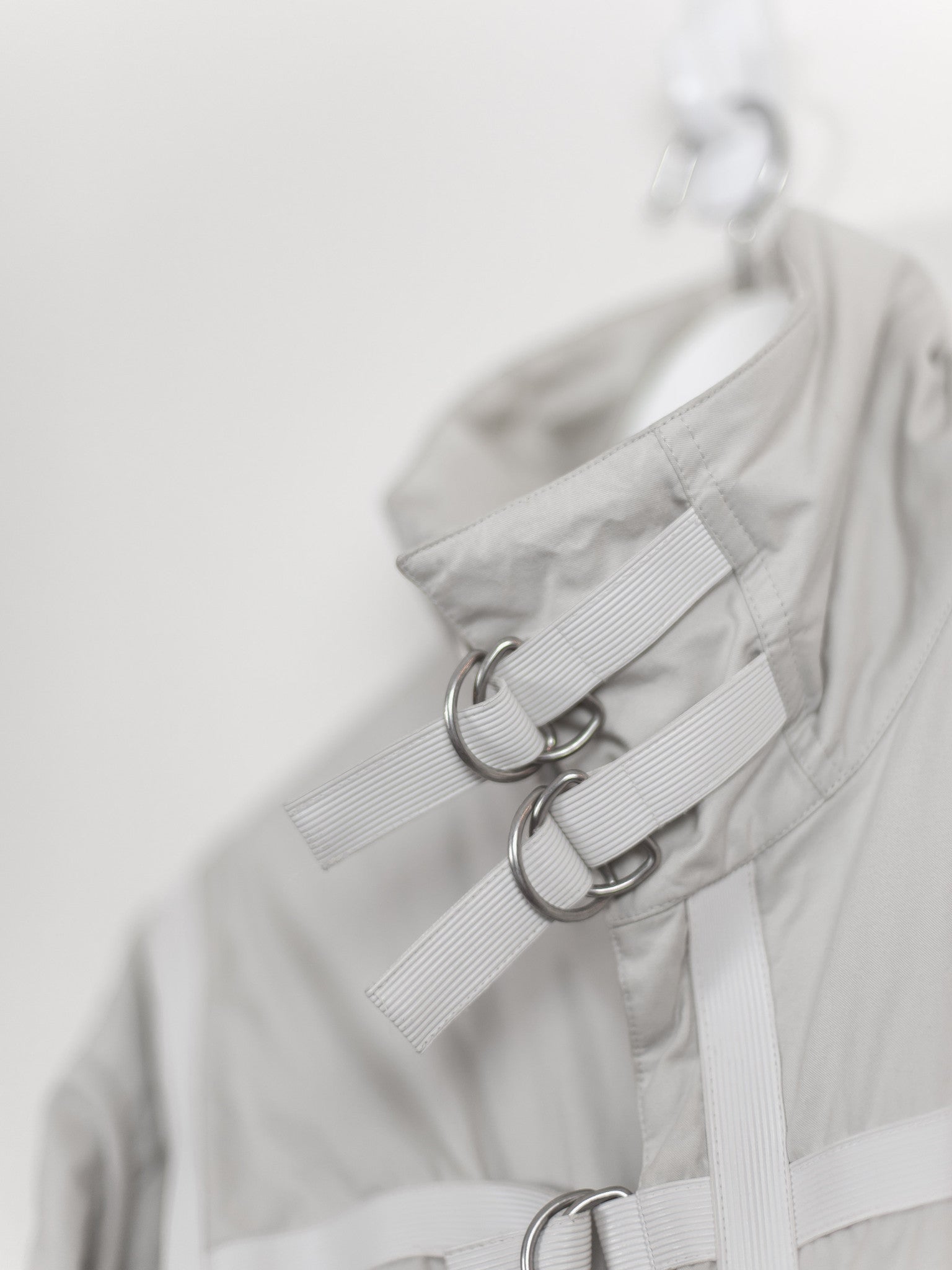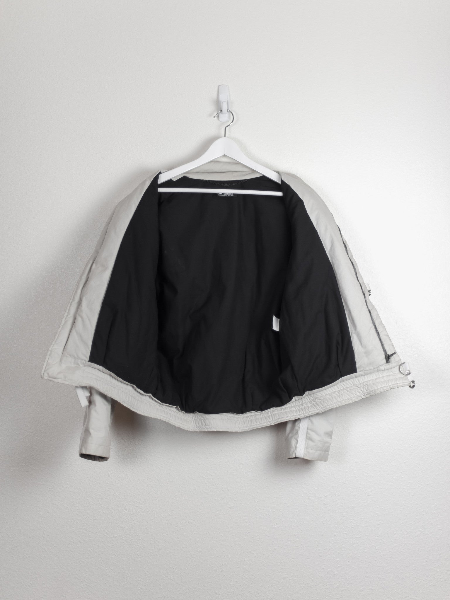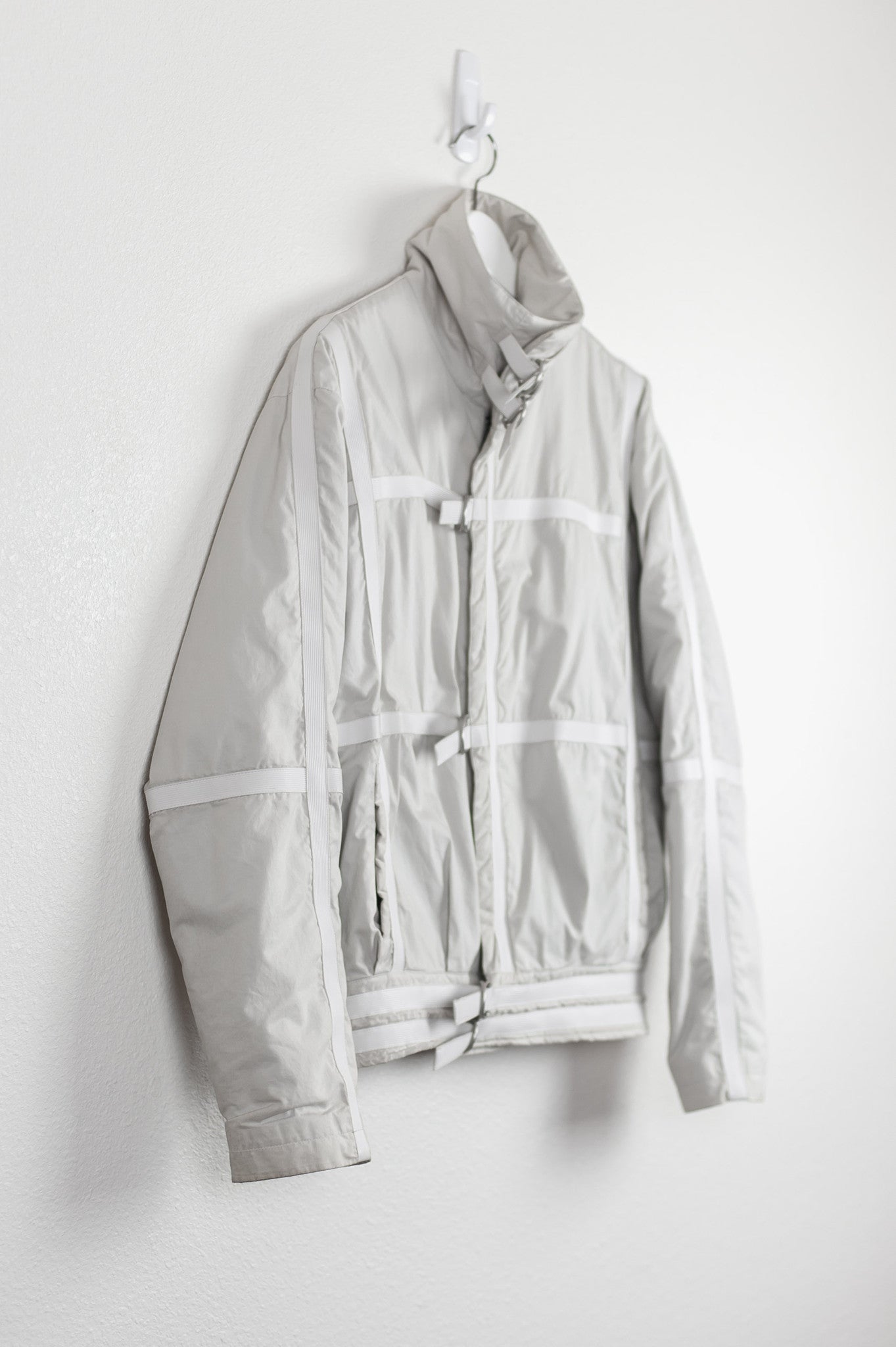 Extremely rare jacket from AW02 Virginia Creeper with amazing details. The surface and liner are cut from a smooth and substantial cotton, and the jacket is lightly padded. Detailed with rubberized bondage straps throughout. Really nice condition for its age, the only flaws being wear on the sleeve ends. 8.5/10 condition. Made in Belgium.