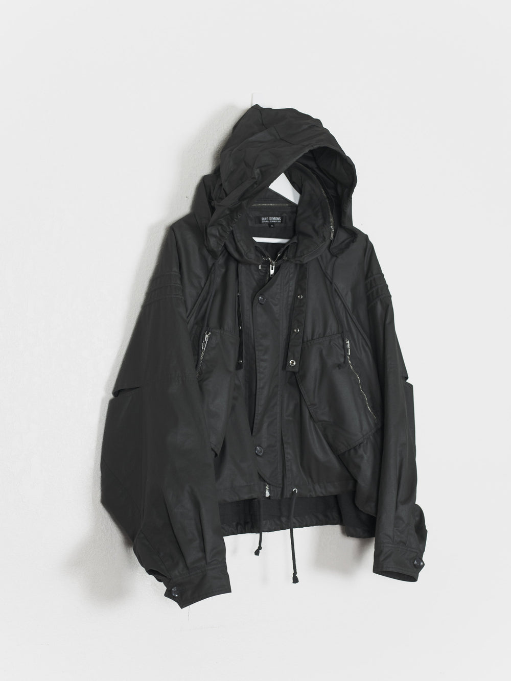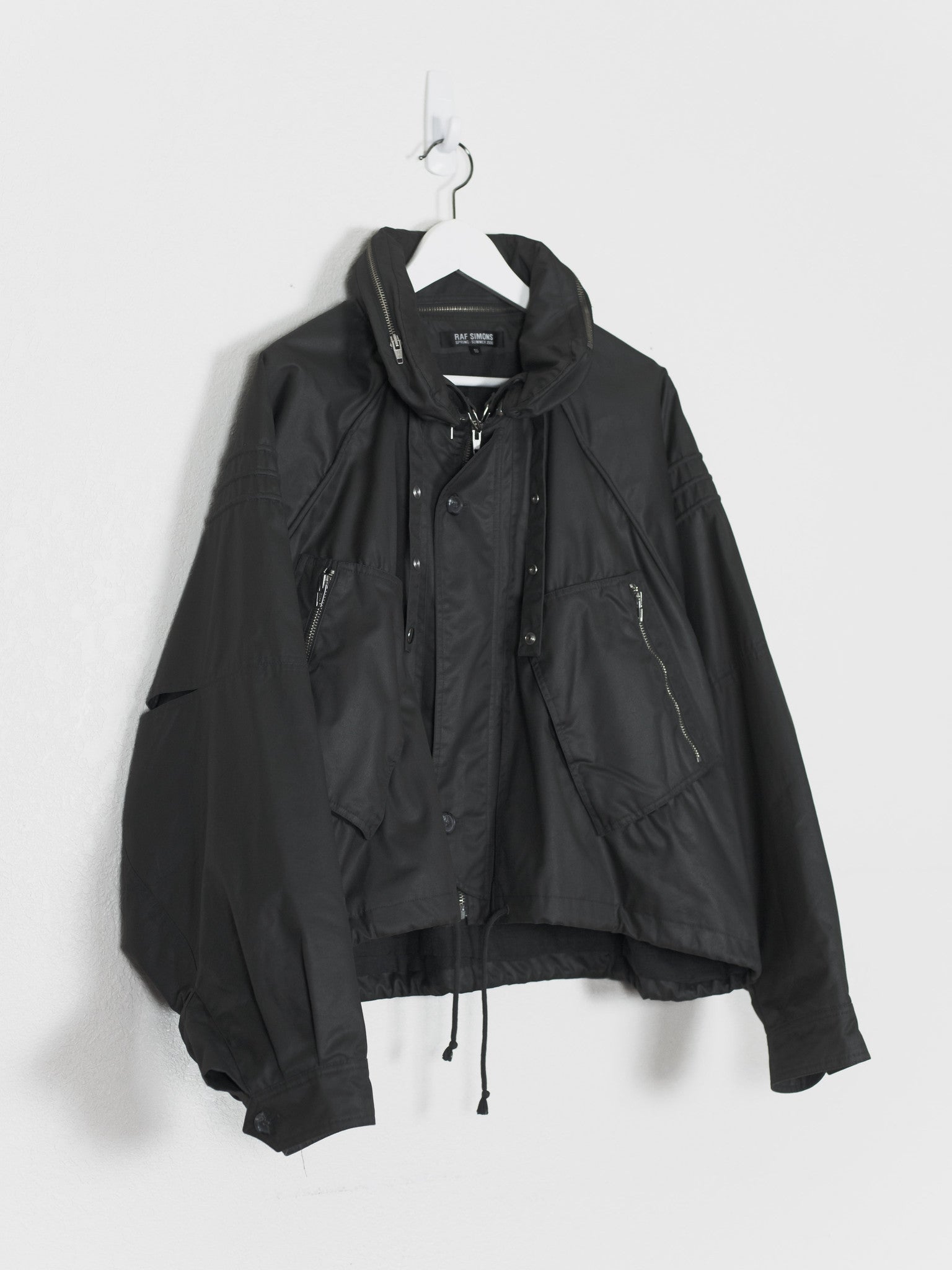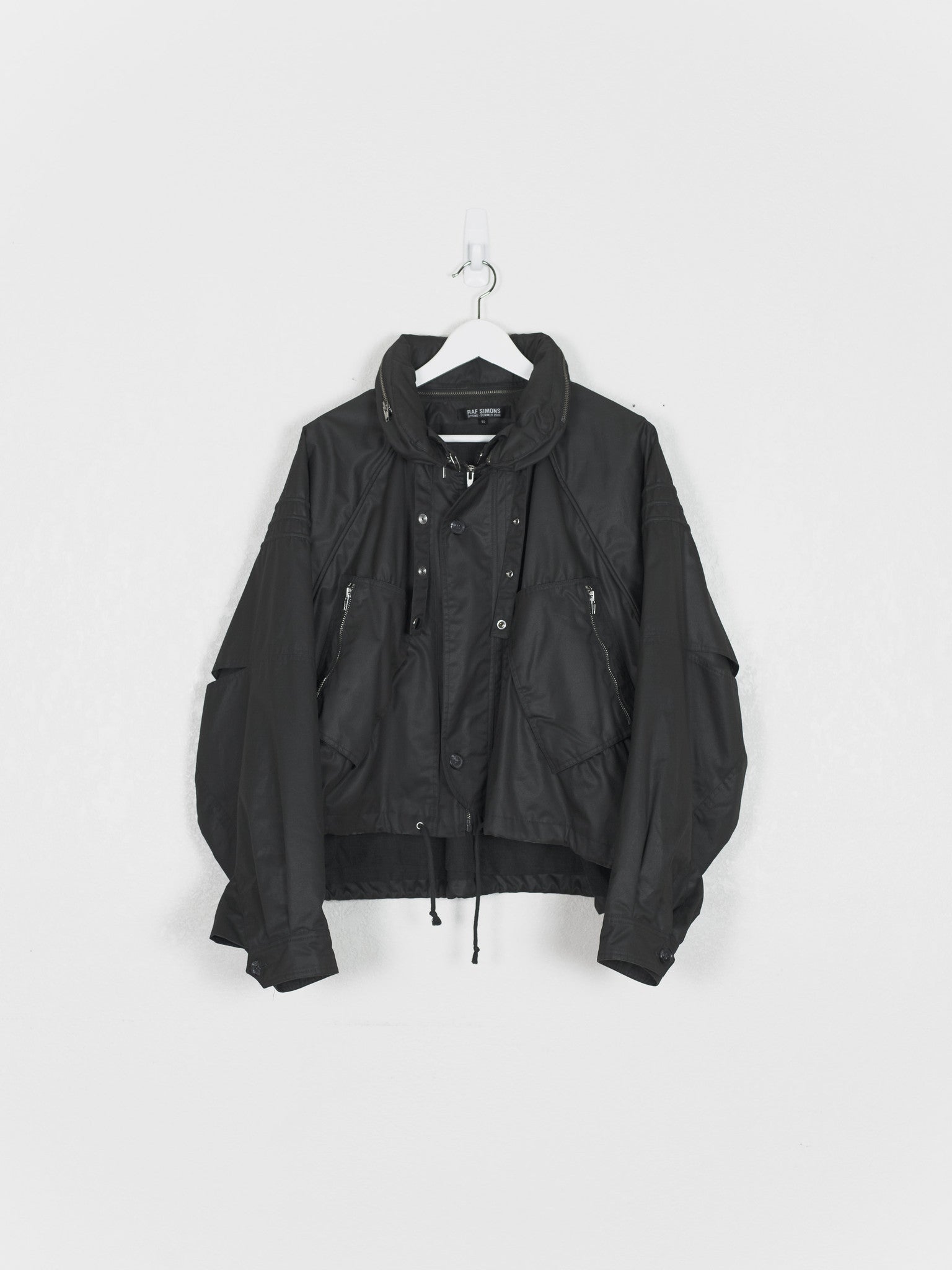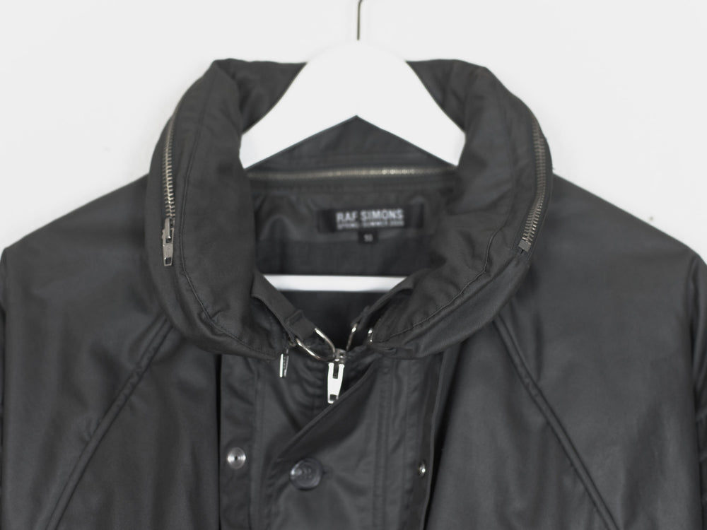 One of Raf's most iconic jackets, in a rare size 50 and charcoal colorway. Amazing cut and construction, with raglan shoulders and dolman sleeves with articulated cutouts and overlaps. Other details include concealable drawstring hood with removable collar, drawstring waist, double wind flap, two front zip pockets, two hidden front seam pockets, resin cotton outer with cotton inner liner and cupro lined sleeves, and internal chest pocket.