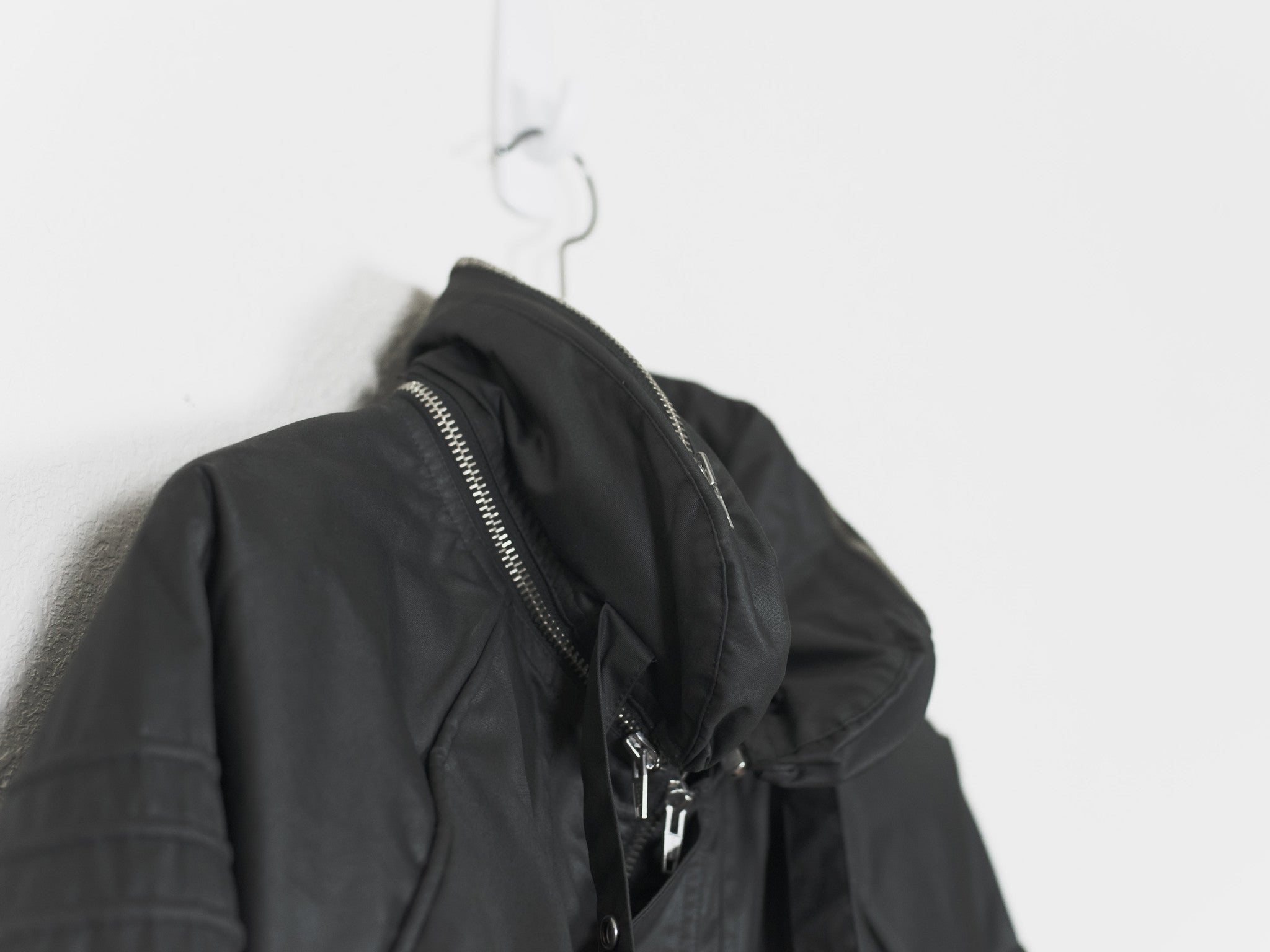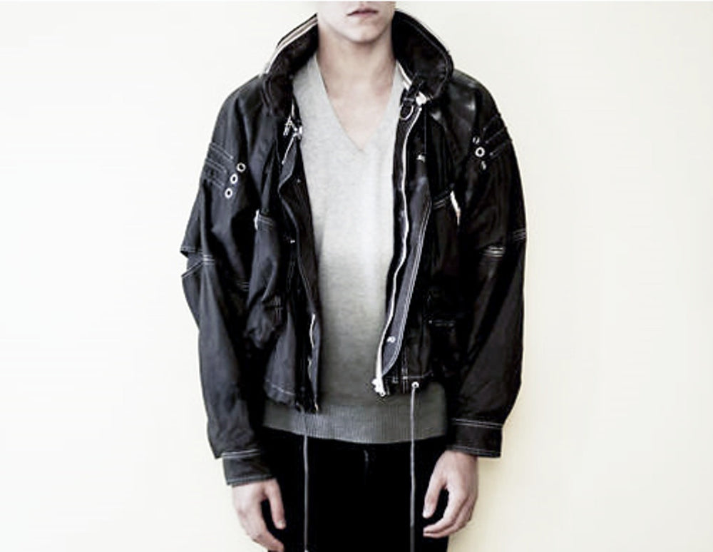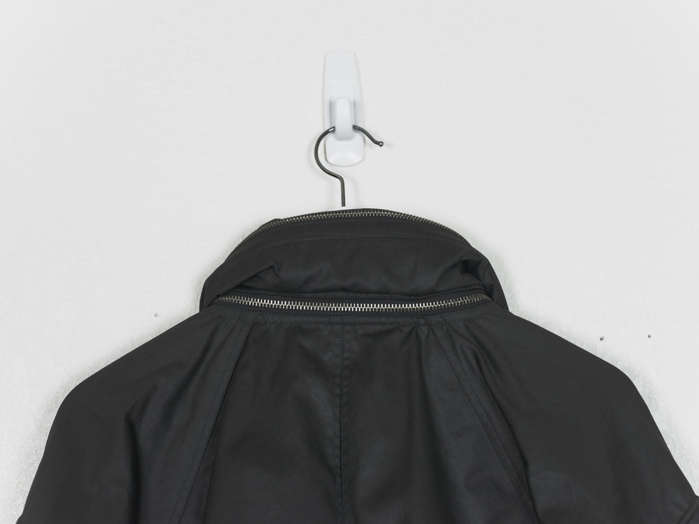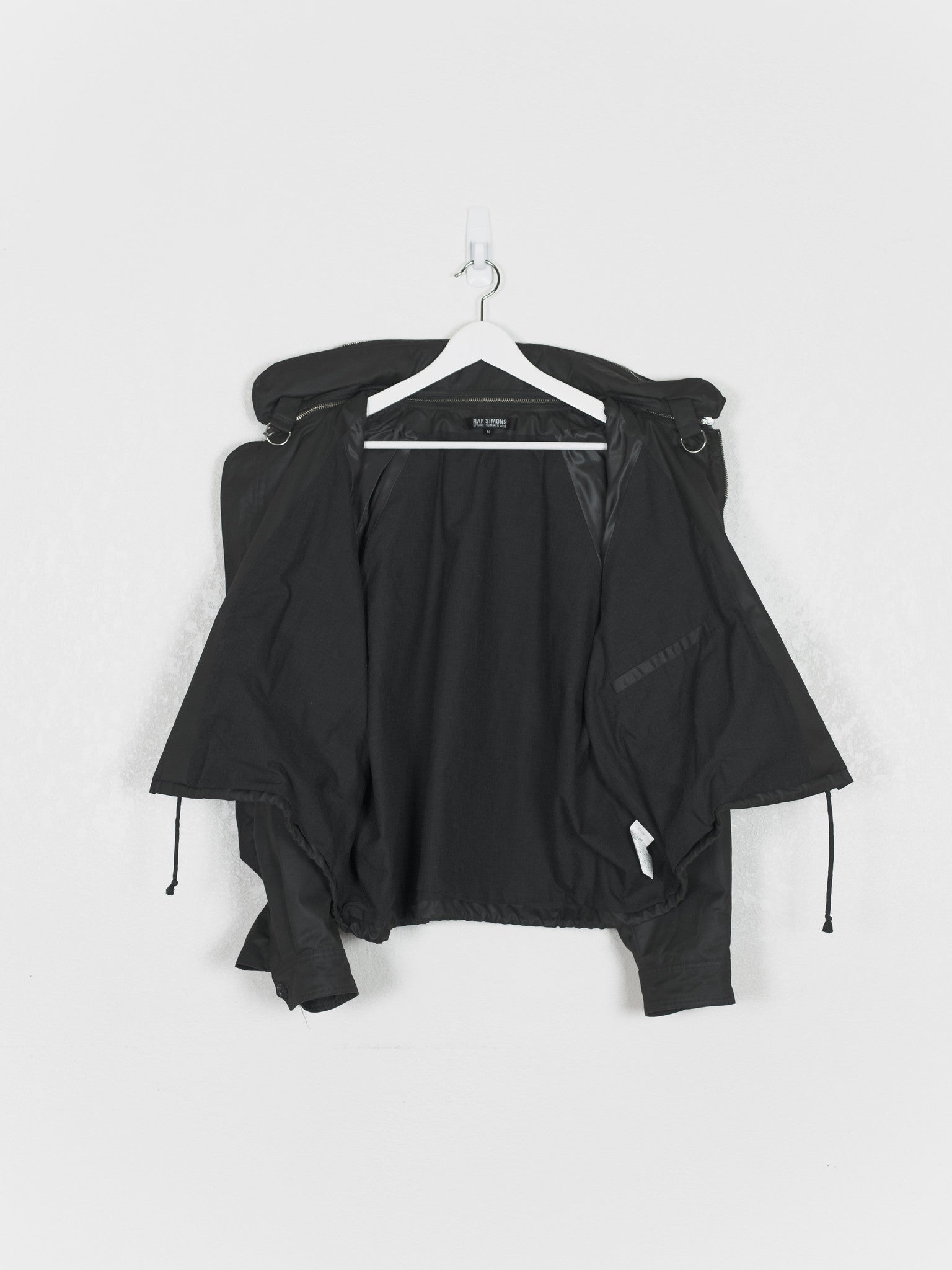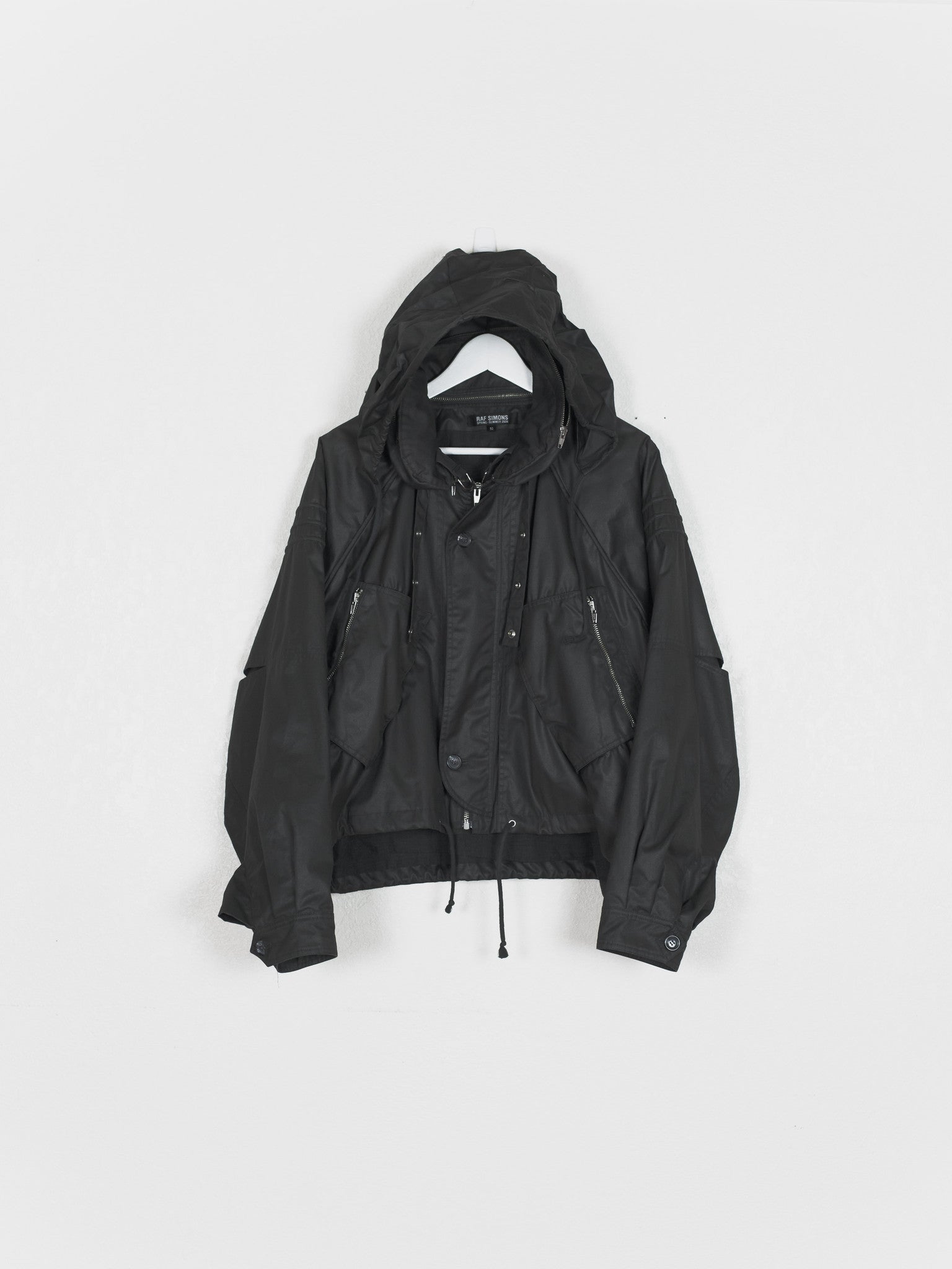 One of Raf's most iconic jackets, in a rare size 50 and charcoal colorway. Amazing cut and construction, with raglan shoulders and dolman sleeves with articulated cutouts and overlaps. Other details include concealable drawstring hood with removable collar, drawstring waist, double wind flap, two front zip pockets, two hidden front seam pockets, resin cotton outer with cotton inner liner and cupro lined sleeves, and internal chest pocket.
