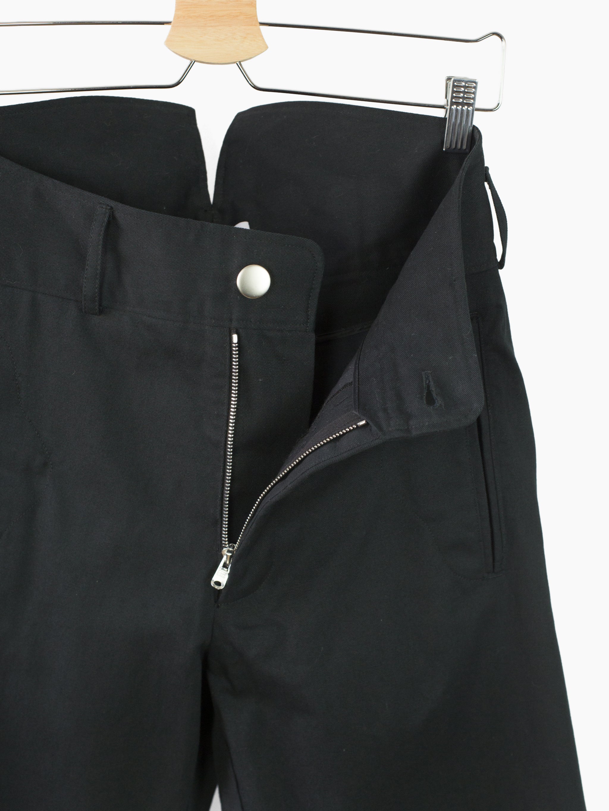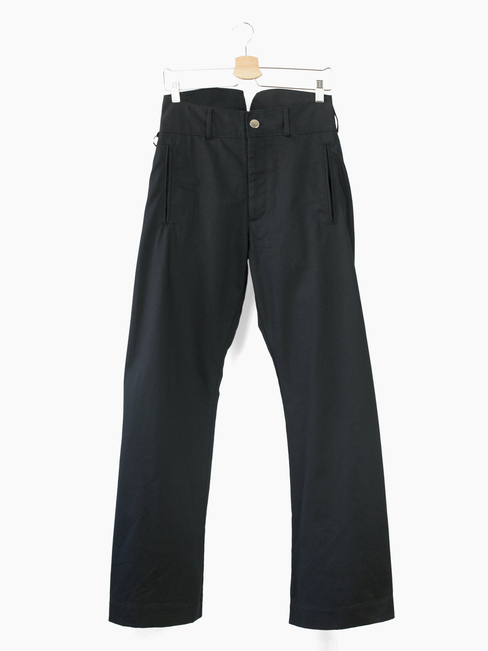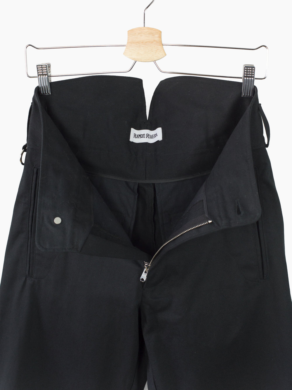 High waisted split back tailored trousers from young designer Ramon Rivera, cut and sewn in New York's garment district. These trousers feature an elegant flared leg cut. Rivera's patternmaking expertise shows in the elimination of an outseam, meaning each leg is cut from a single pattern piece for reduced bulk and cleanliness. Ornamental arced stitching surrounds the front welt pockets while the back features a more serious industrial riri snapped waist cinch and angular double darted seat.