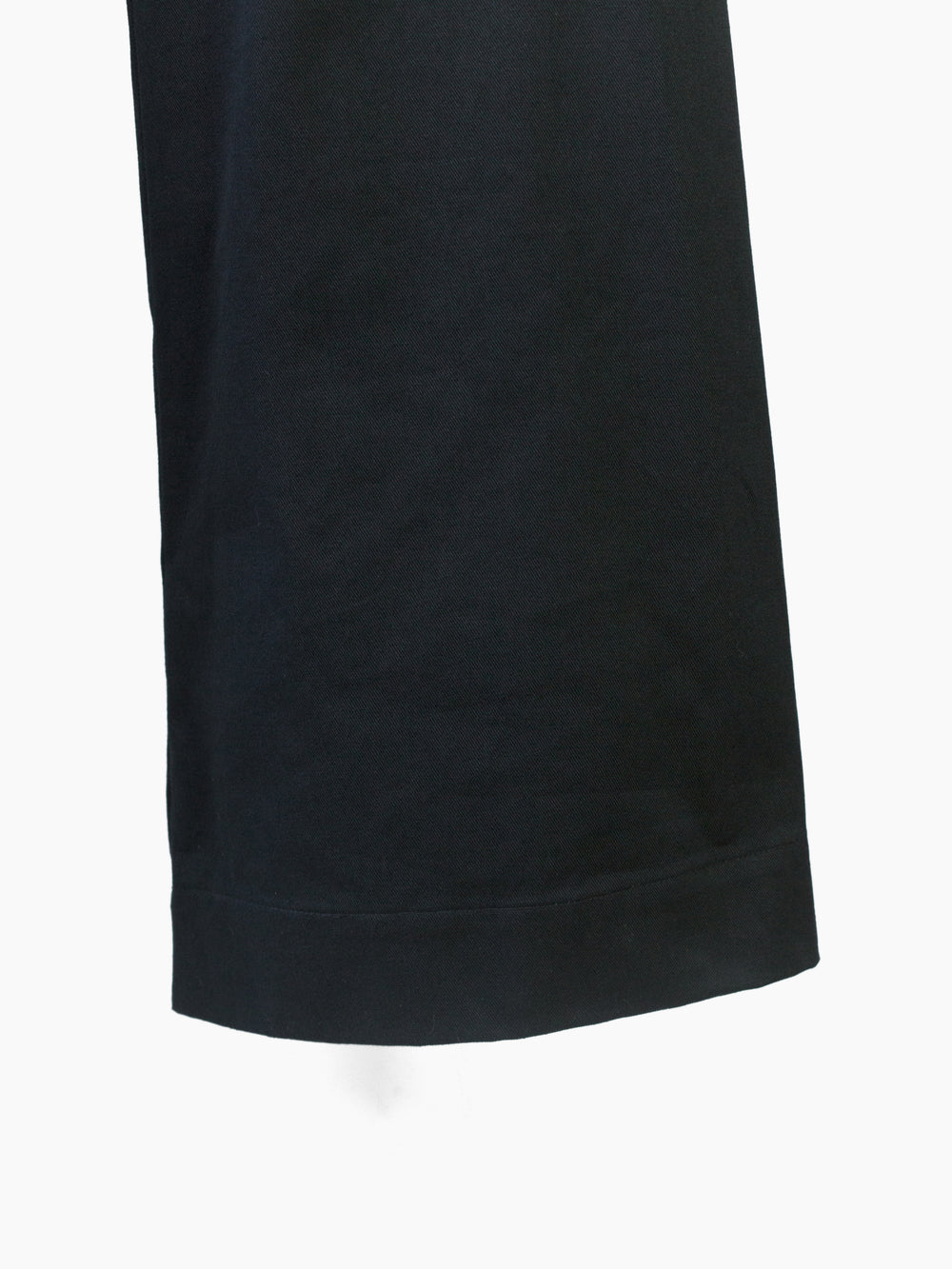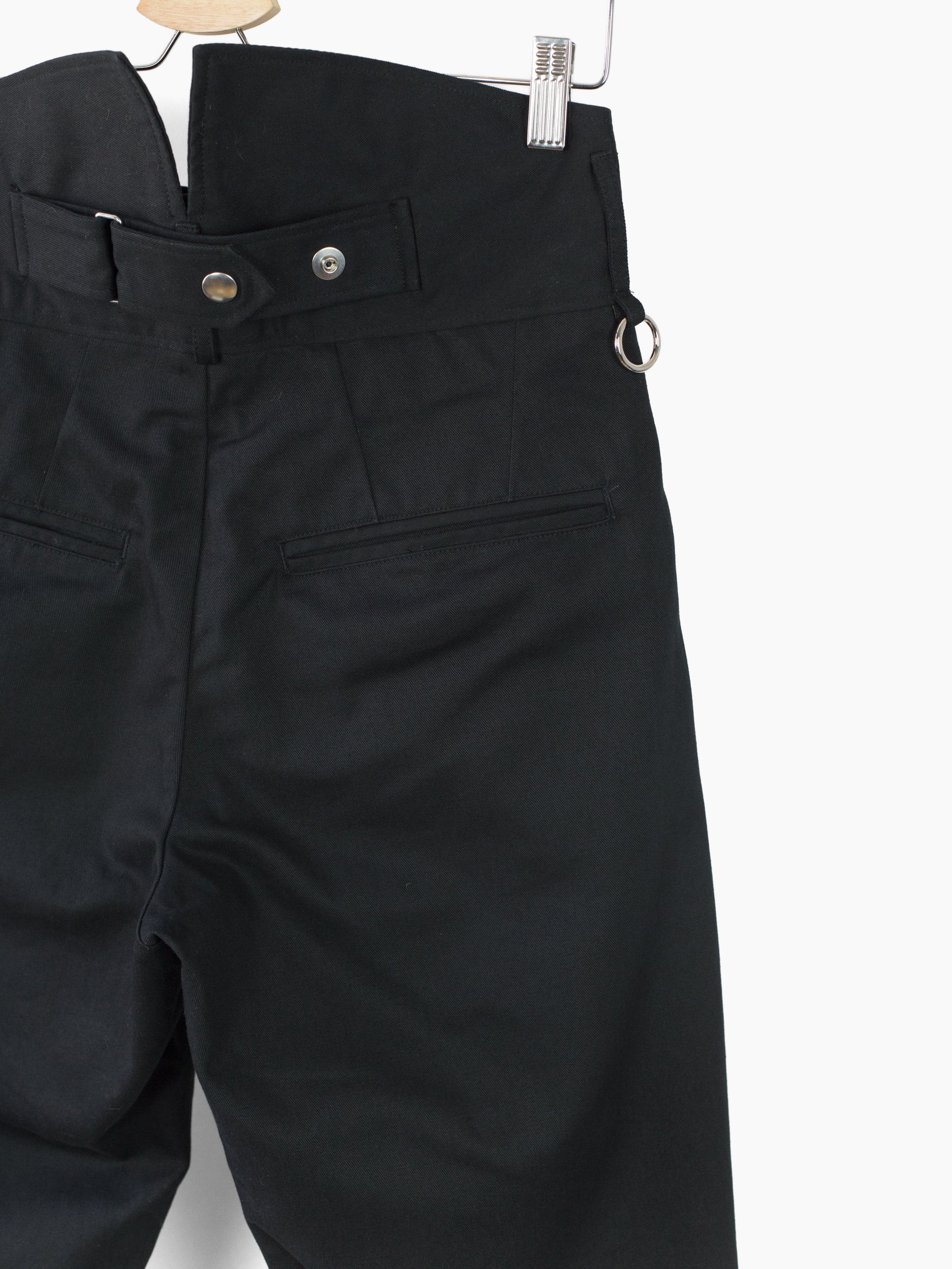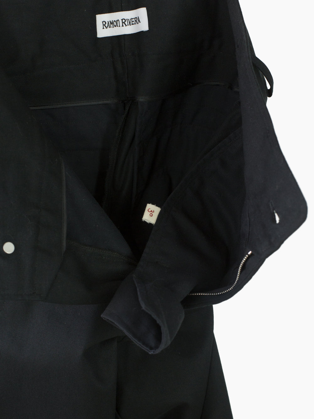 High waisted split back tailored trousers from young designer Ramon Rivera, cut and sewn in New York's garment district. These trousers feature an elegant flared leg cut. Rivera's patternmaking expertise shows in the elimination of an outseam, meaning each leg is cut from a single pattern piece for reduced bulk and cleanliness. Ornamental arced stitching surrounds the front welt pockets while the back features a more serious industrial riri snapped waist cinch and angular double darted seat.