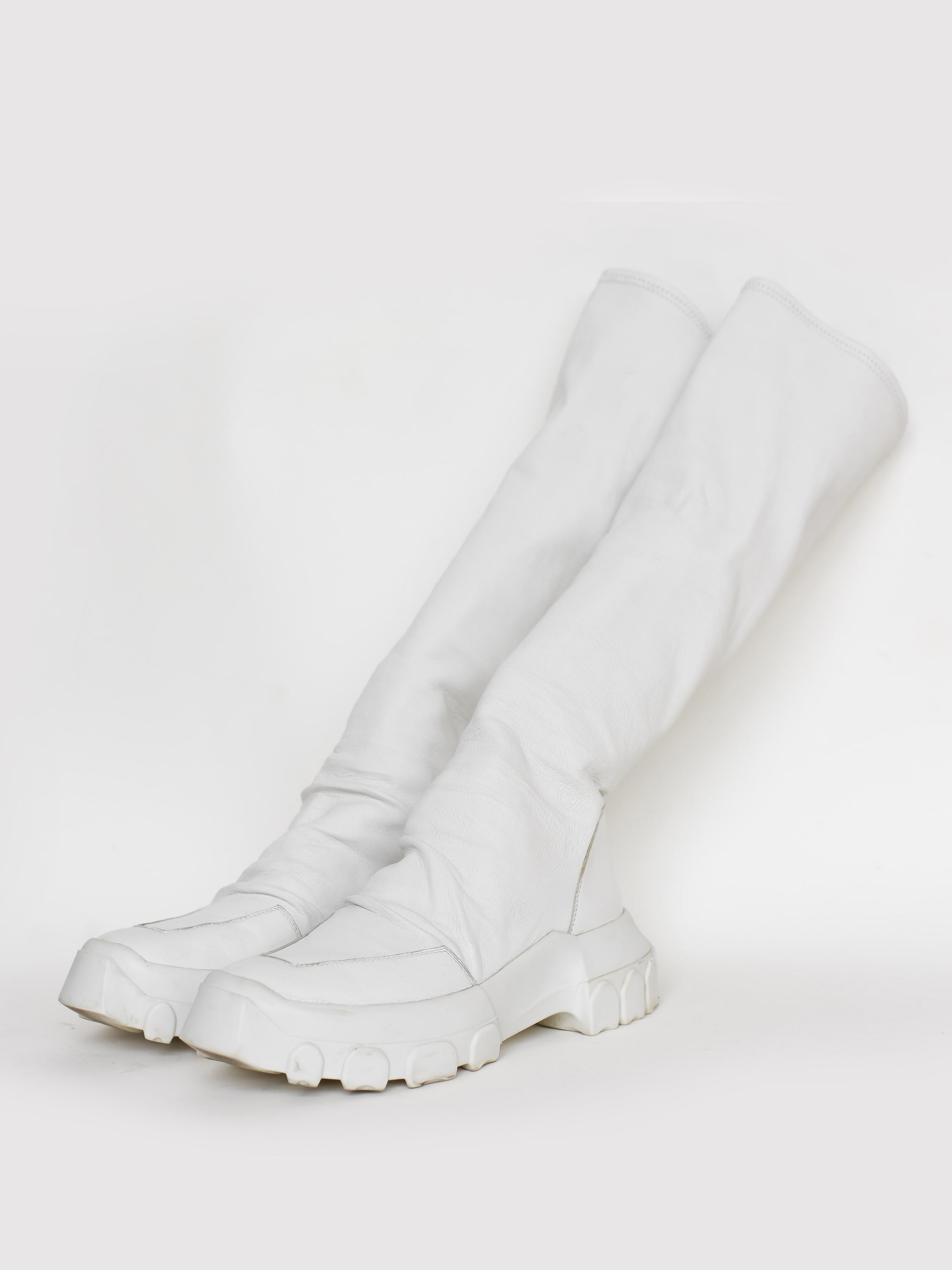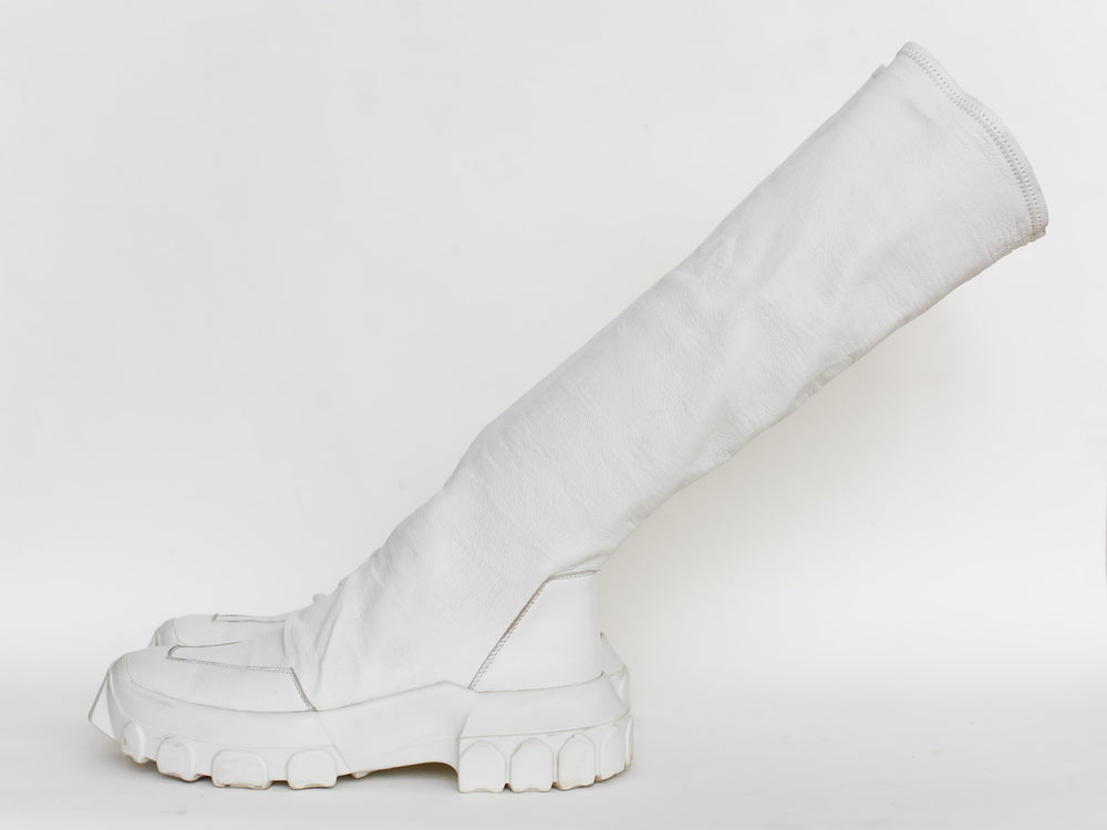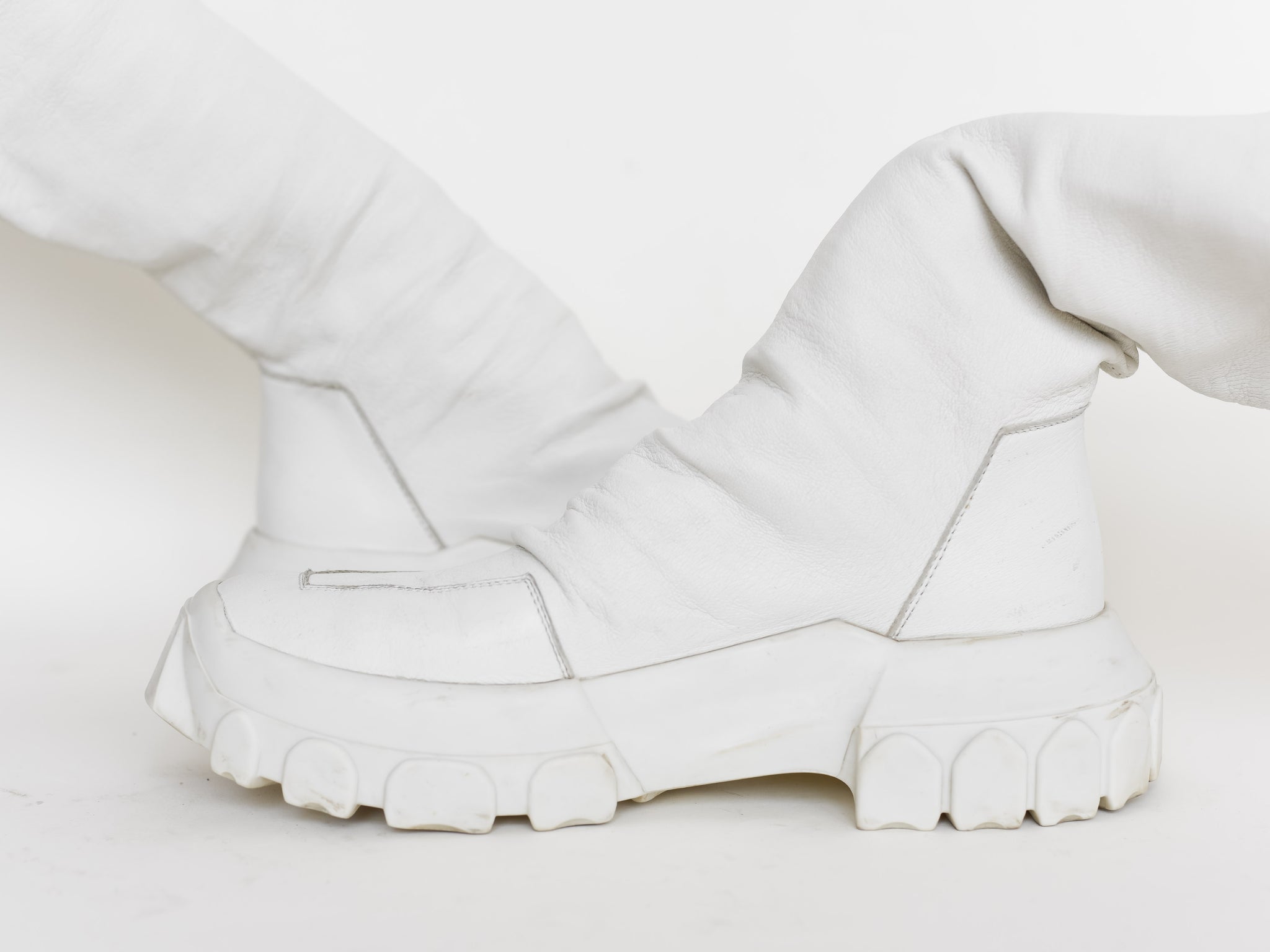 Incredible boots with an exaggerated silhouette Rick Owens is famous for, featuring the tractor style sole with stretch leather uppers. The uppers can be adjusted to sit higher or lower, making these very versatile.