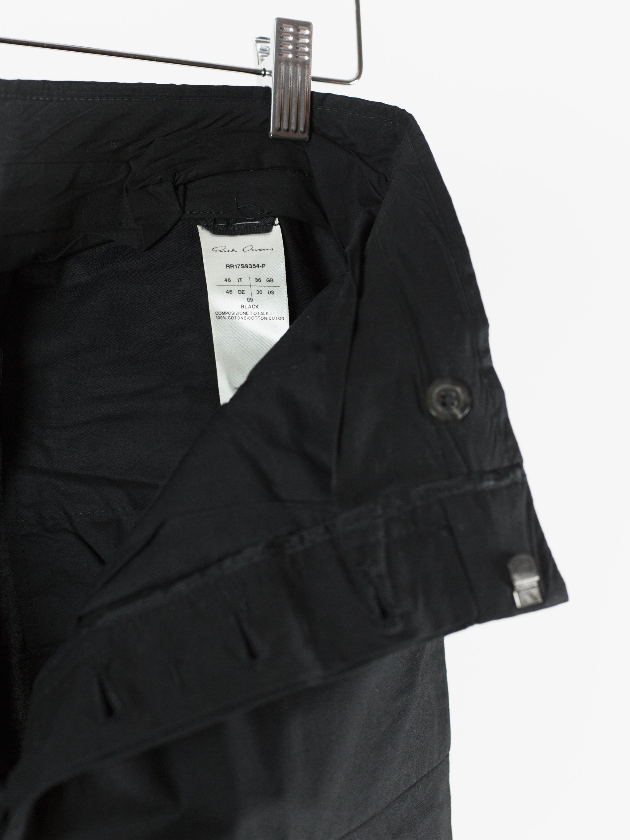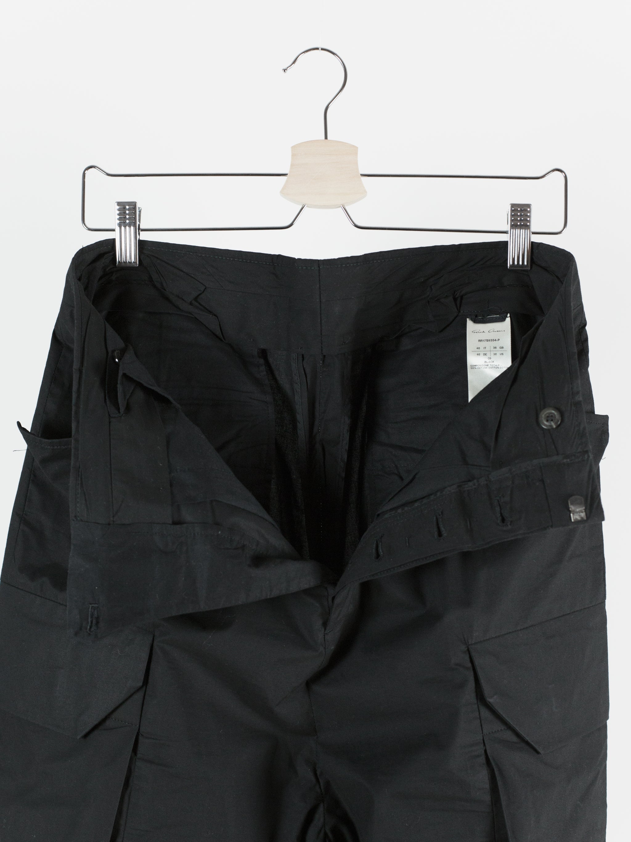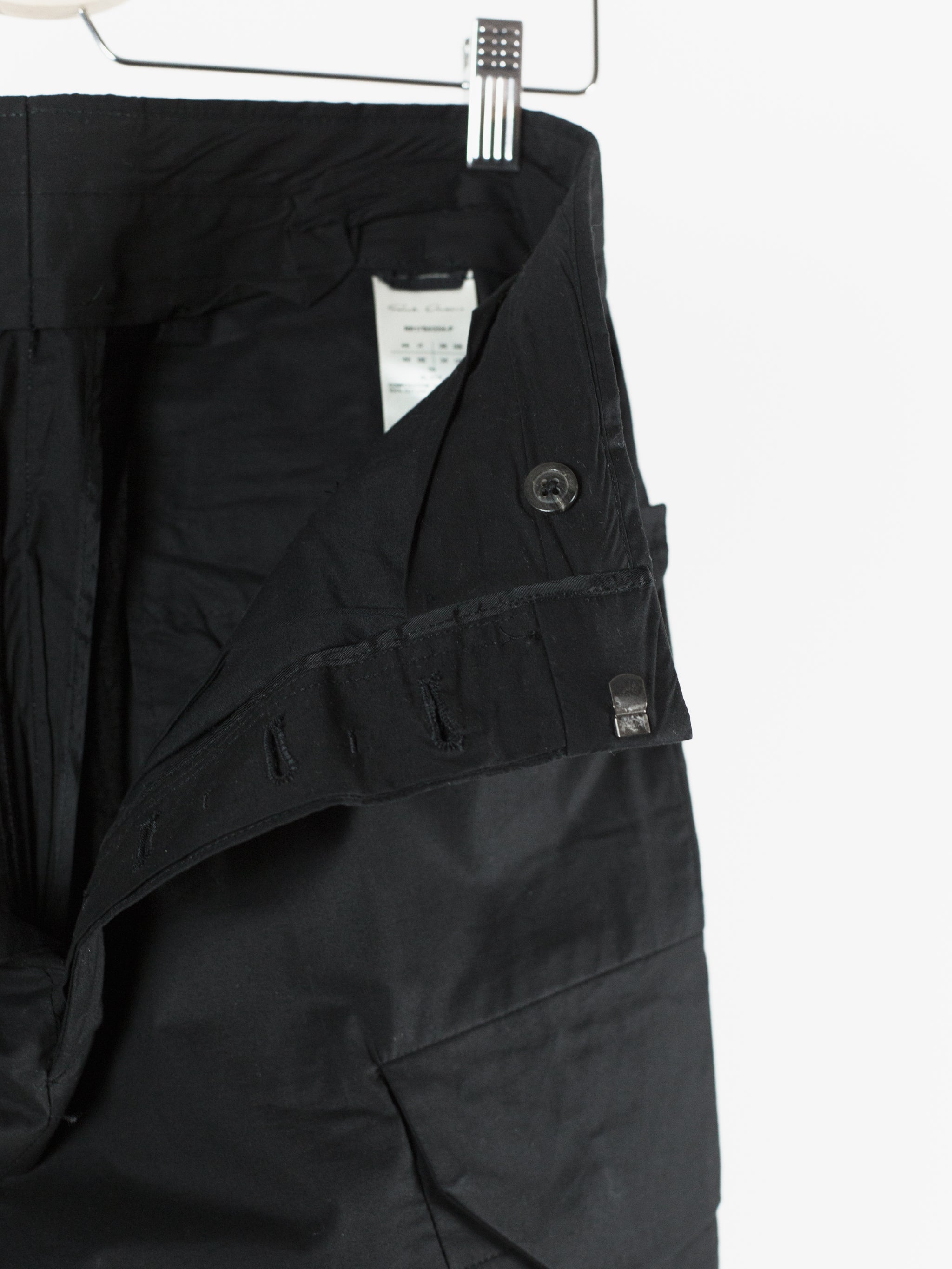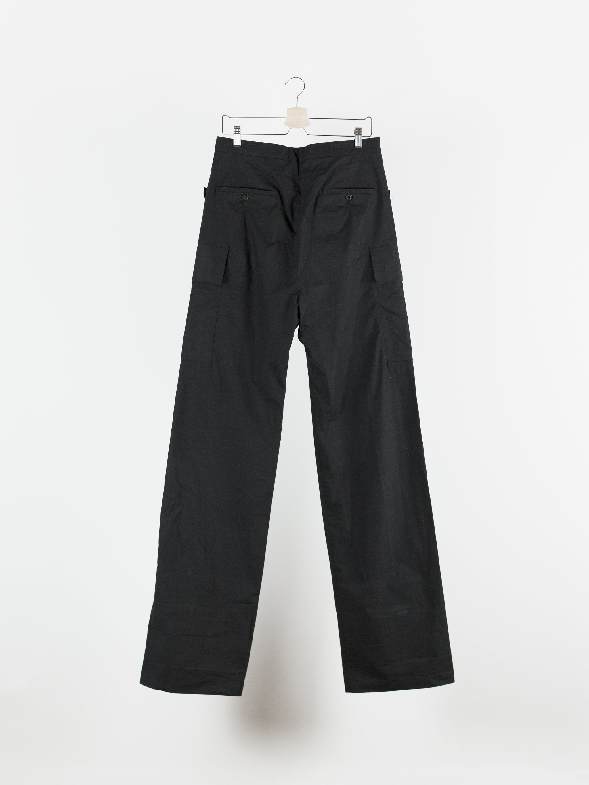 The Iconic mid-late 2010s Rick Owens trouser, instrumental in the creation of a brancusi-esque silhouette by employing a wide, solid, plinth-like visual impression at the bottom block. These are cut with an extra long leg meant to drag on the ground and almost completely cover the shoes they're worn with, furthering the look of pants-as-sculptural-base. Cut with an extra high waist and super flattering fitted seat. Lightweight cotton poplin fabrication lends itself to perfectly messy stacking on chunky boots or sneakers. Or, hem them to a half or no break for a sleeker silhouette. Features flared floating jean pocket and geometrically shaped cargo pockets, both nested on the same seam line. Finished with button fly and metal hook and eye waist, two welt back pockets, and an interior coin pocket.