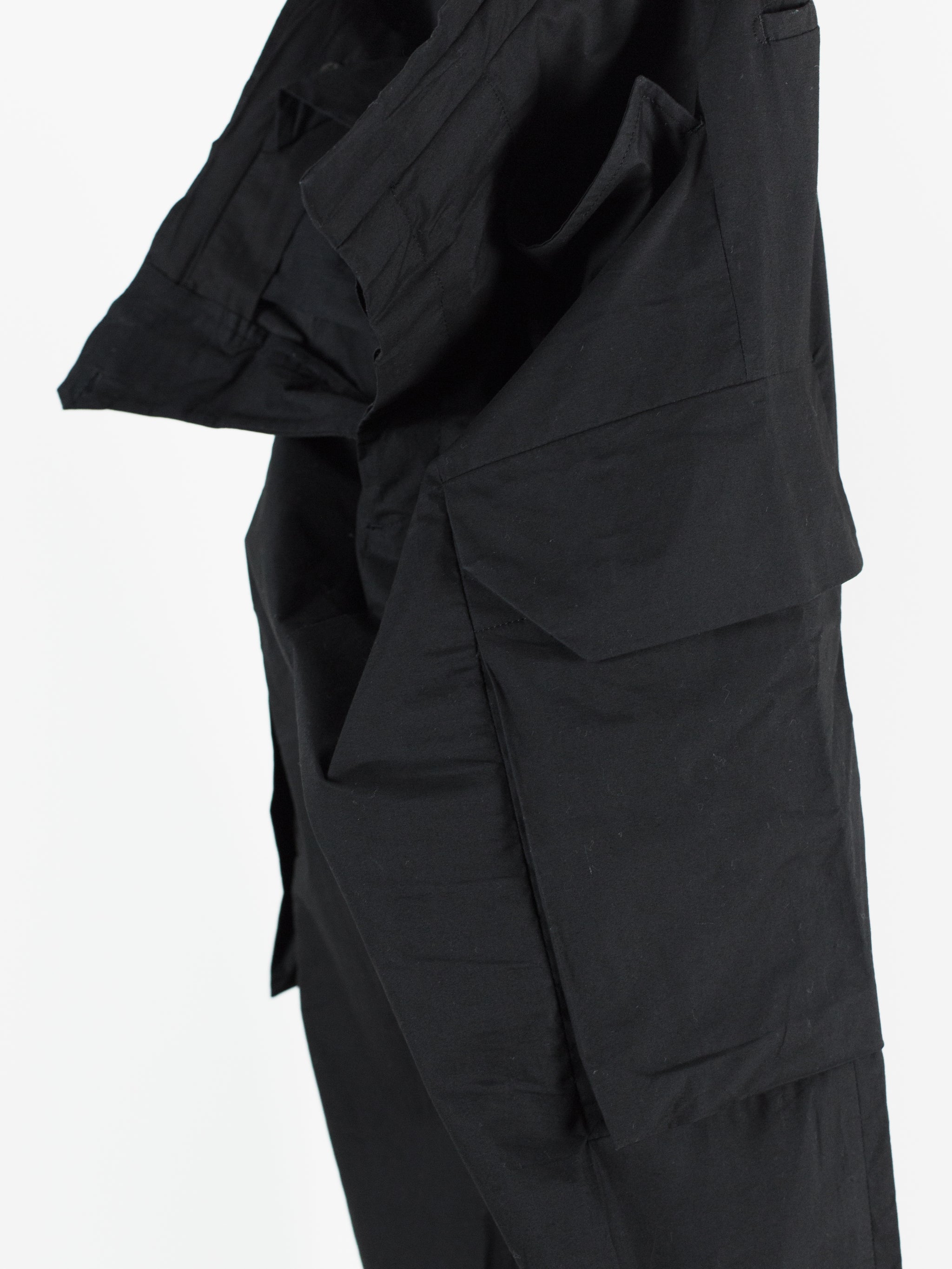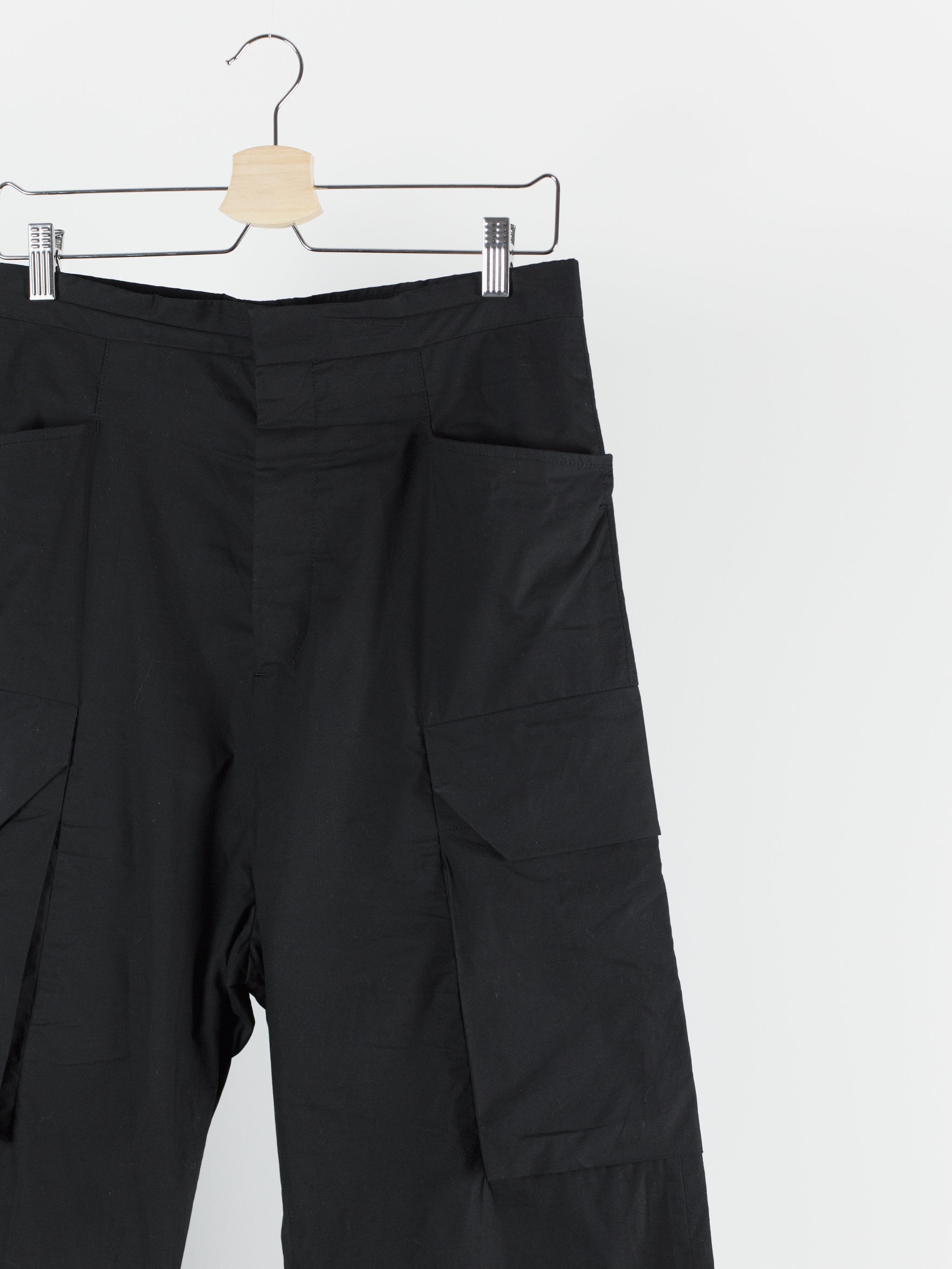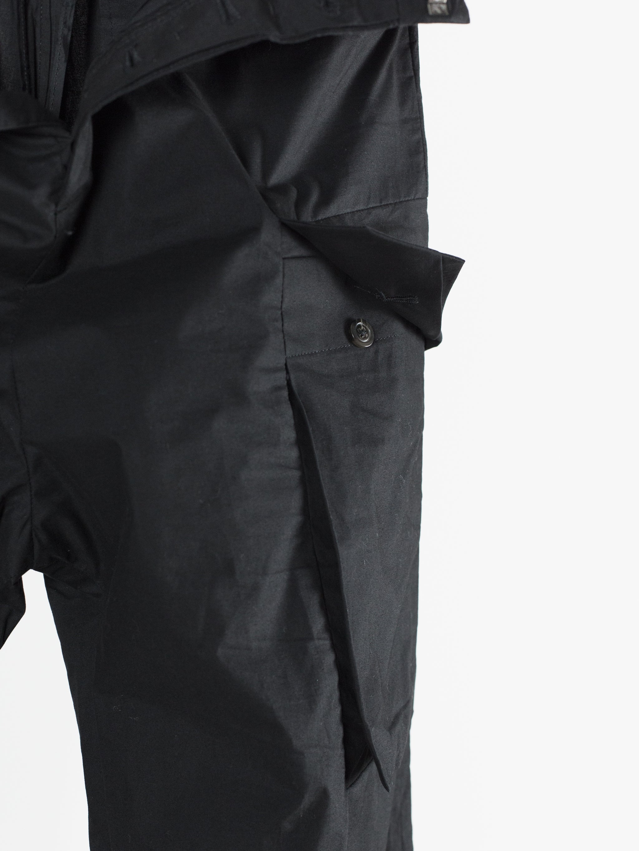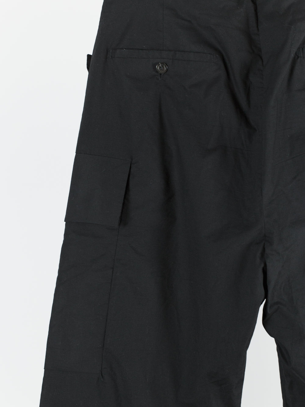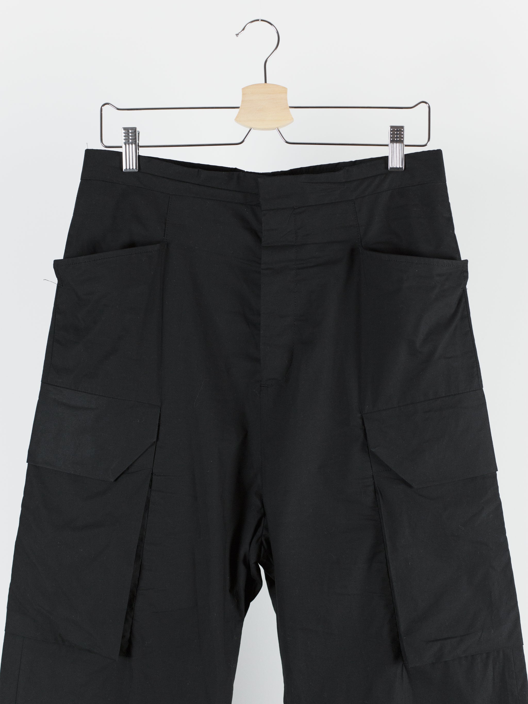 The Iconic mid-late 2010s Rick Owens trouser, instrumental in the creation of a brancusi-esque silhouette by employing a wide, solid, plinth-like visual impression at the bottom block. These are cut with an extra long leg meant to drag on the ground and almost completely cover the shoes they're worn with, furthering the look of pants-as-sculptural-base. Cut with an extra high waist and super flattering fitted seat. Lightweight cotton poplin fabrication lends itself to perfectly messy stacking on chunky boots or sneakers. Or, hem them to a half or no break for a sleeker silhouette. Features flared floating jean pocket and geometrically shaped cargo pockets, both nested on the same seam line. Finished with button fly and metal hook and eye waist, two welt back pockets, and an interior coin pocket.