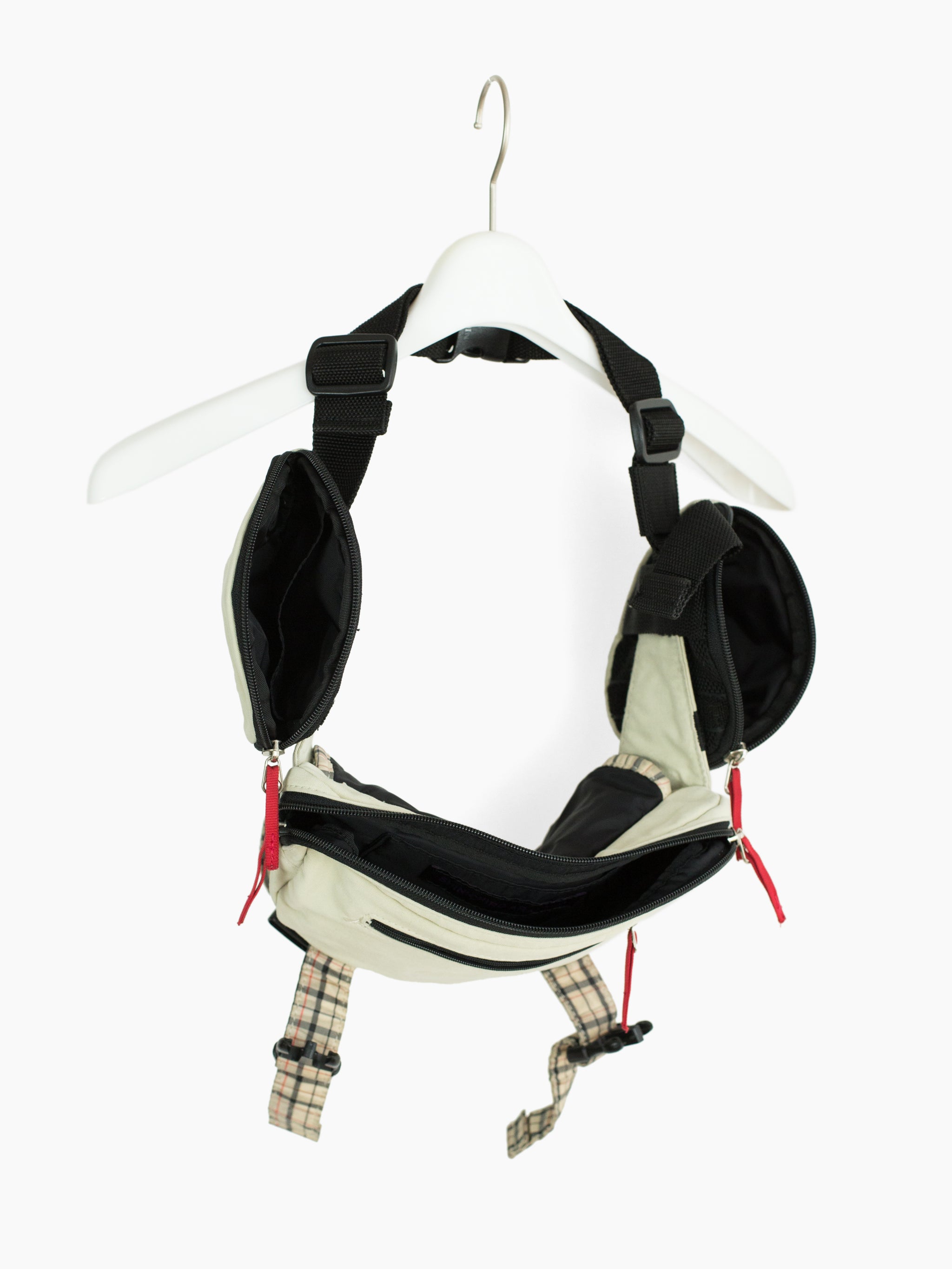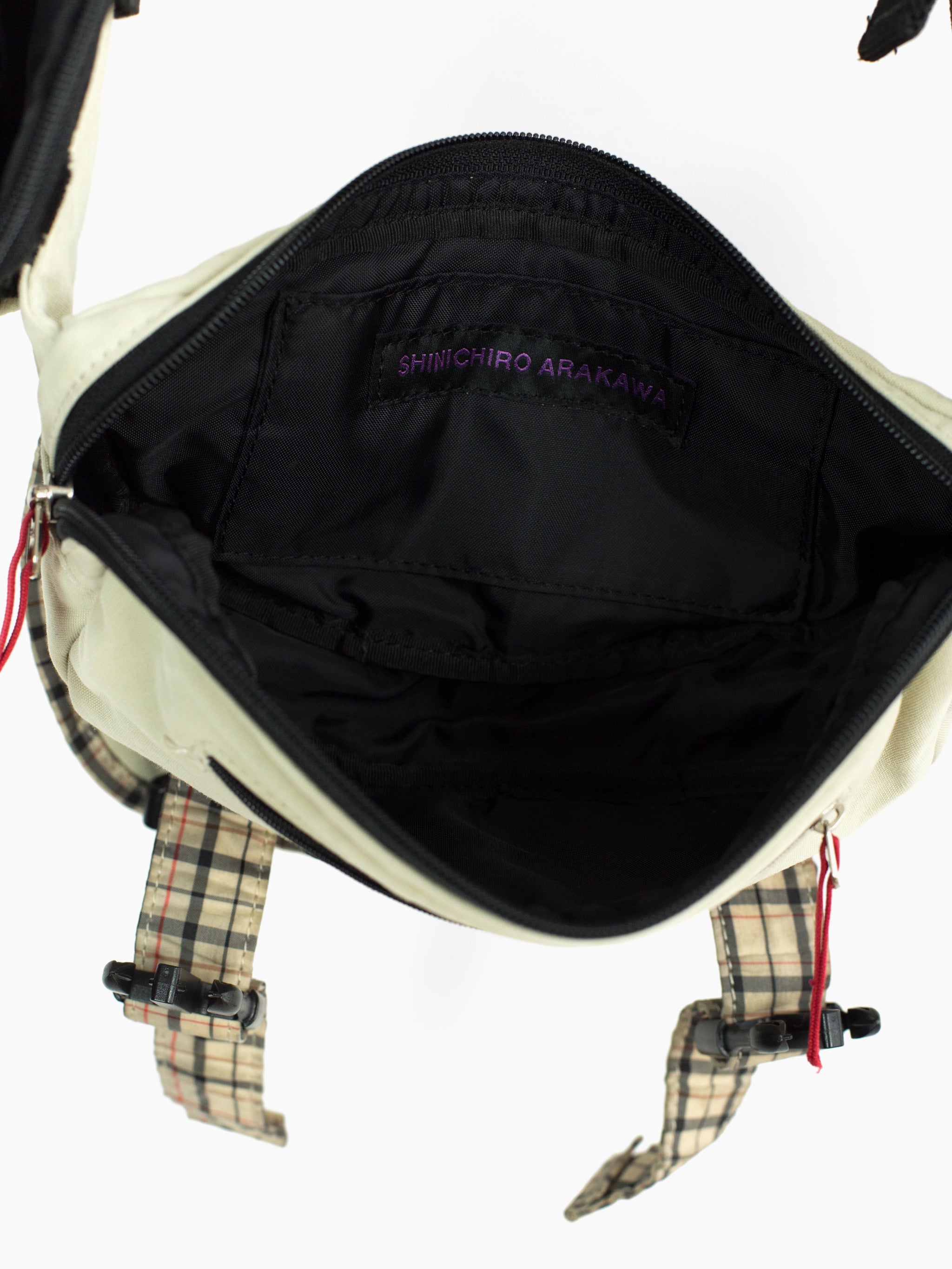 Riding waist bag from motorcycle specialist Shinichiro Arakawa. This one features a main back compartment that's buckle + zipper closed and two oval accessory side pouches that are removable. Cut in a durable beige cotton canvas with Burberry-style plaid trim and red accents.