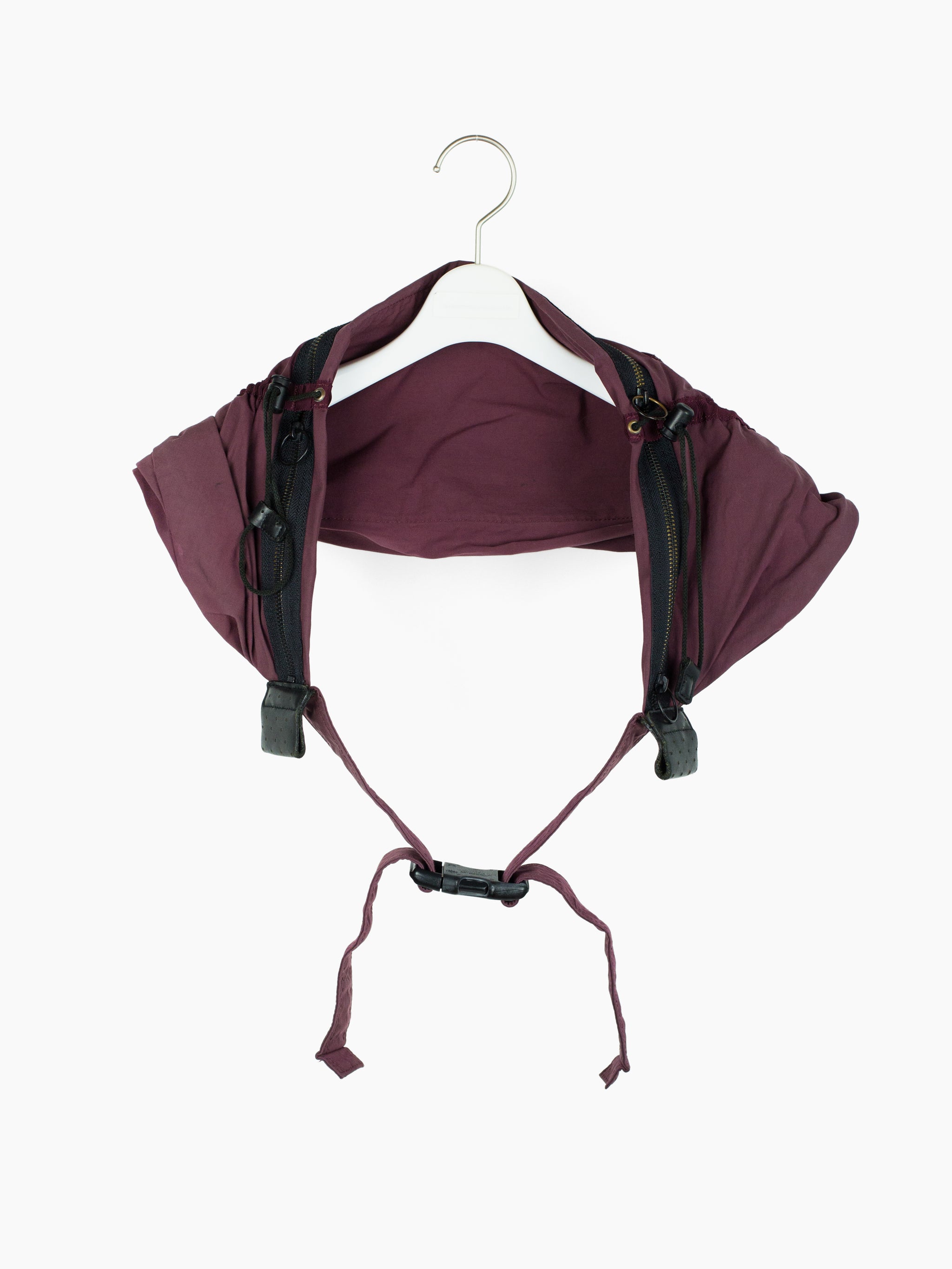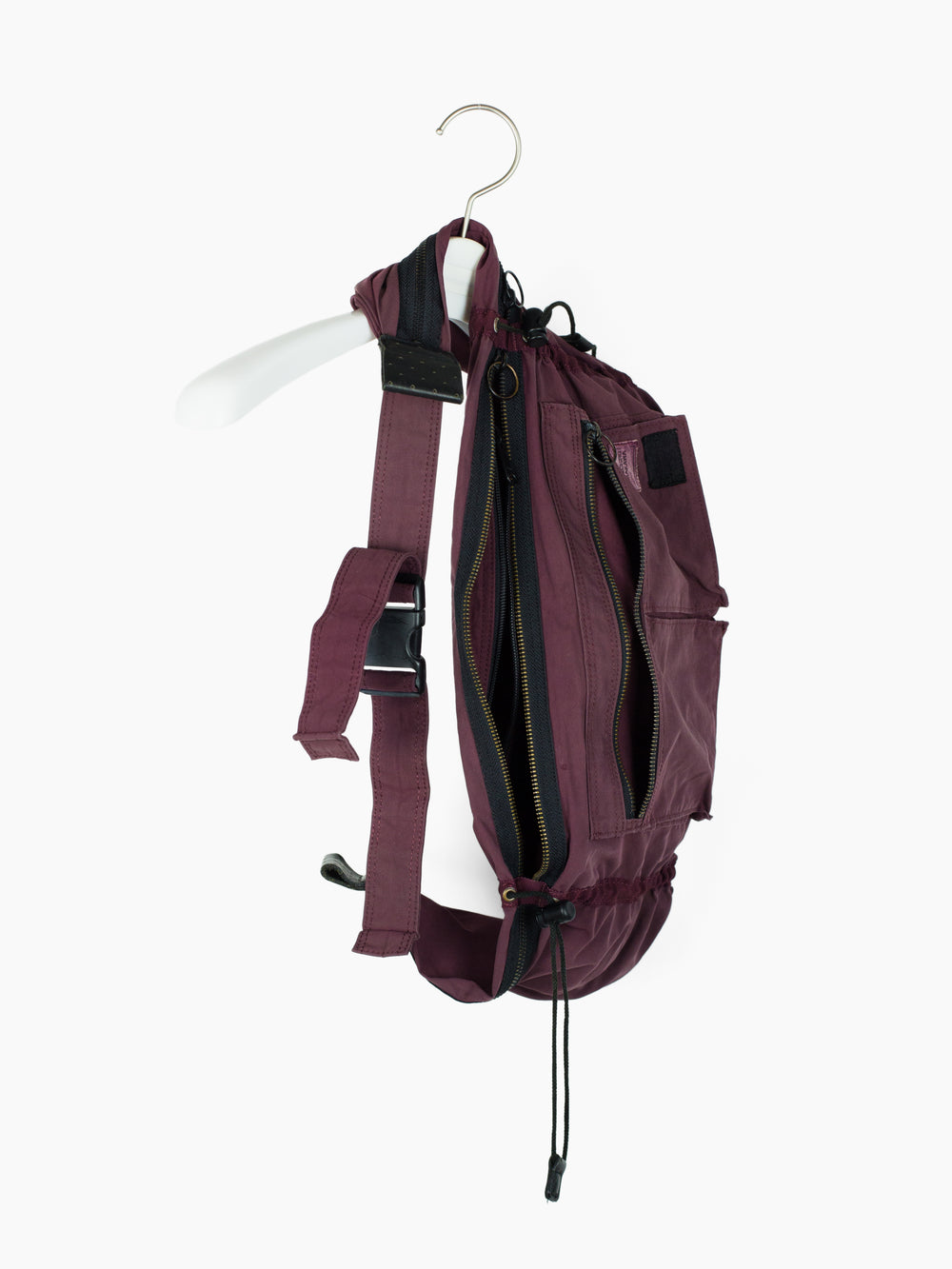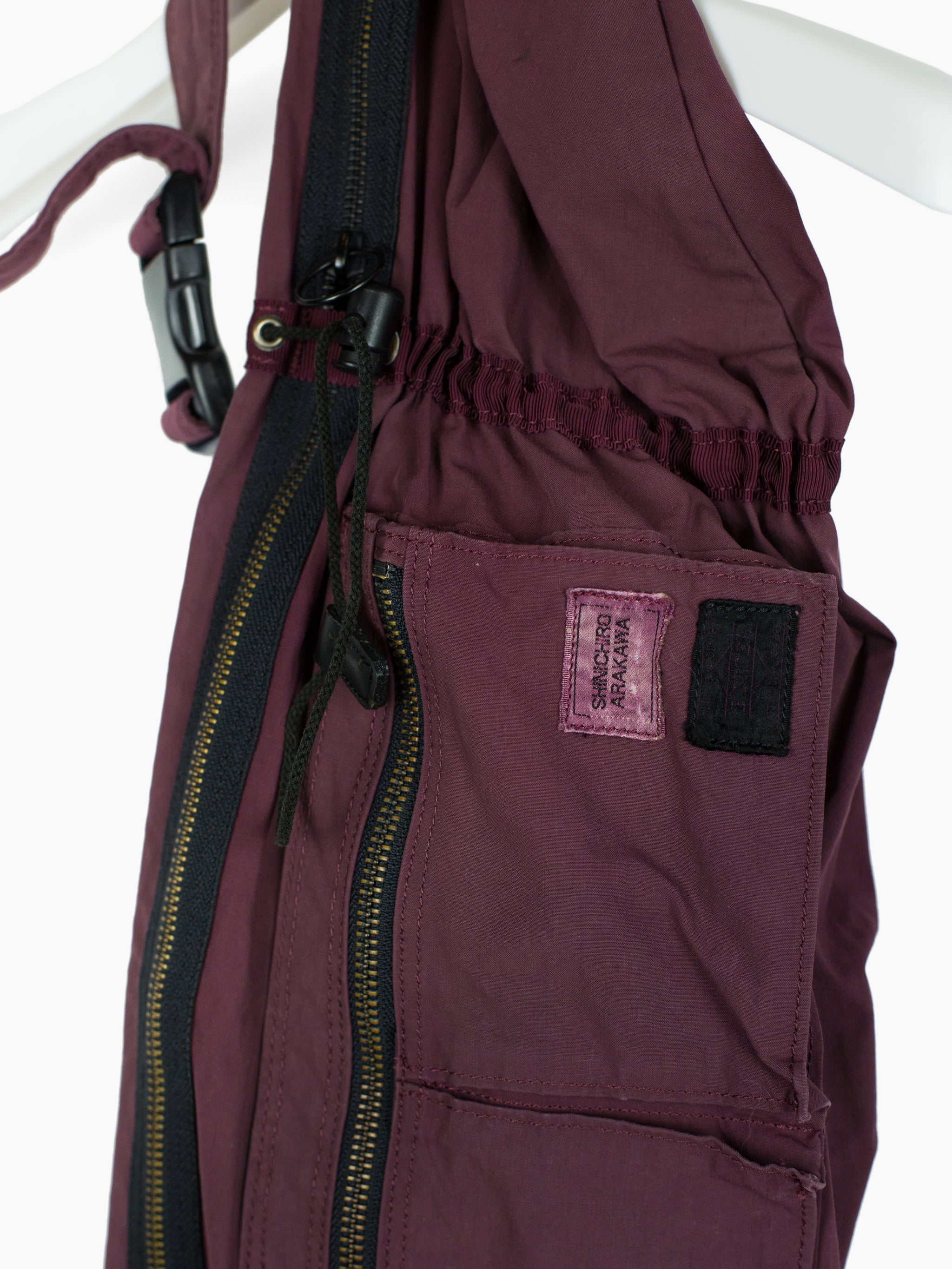 Functional and artistic, this waistbag is a collaboration between bag specialists Porter and Shinichiro Arakawa. The bag is cut with a large main waist pocket that features 'soft' dividers in the form of drawstring cinches to keep large items from migrating. Additionally, there are three separate zipper entries into the main compartment, an interior zippered compartment within, and two small gusseted pockets with connected zipper entry on top. It's all overdyed a beautiful desaturated burgundy that complements the gold tone zippers.