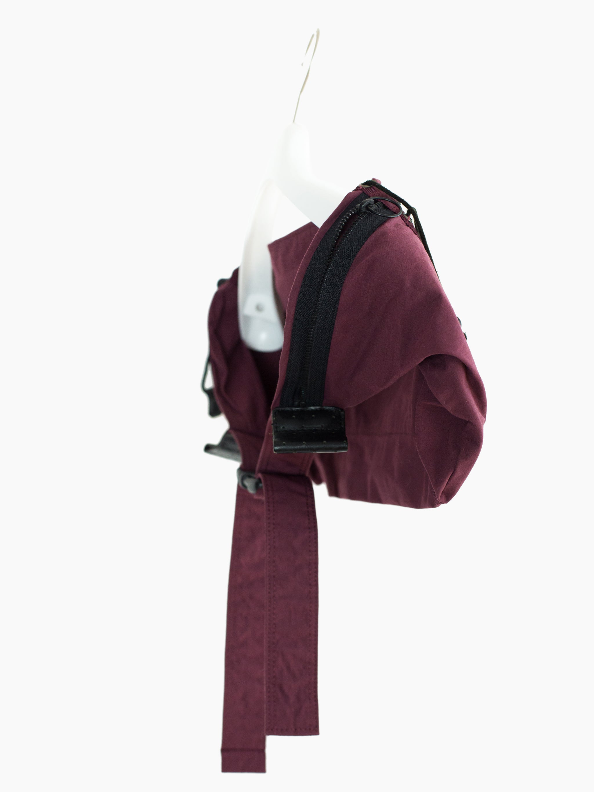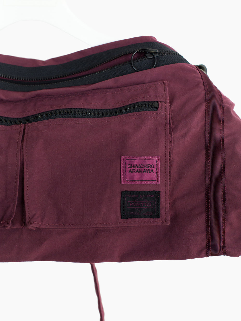 Functional and artistic, this waistbag is a collaboration between bag specialists Porter and Shinichiro Arakawa. The bag is cut with a large main waist pocket that features 'soft' dividers in the form of drawstring cinches to keep large items from migrating. Additionally, there are three separate zipper entries into the main compartment, an interior zippered compartment within, and two small gusseted pockets with connected zipper entry on top. It's all overdyed a beautiful desaturated burgundy that complements the gold tone zippers.