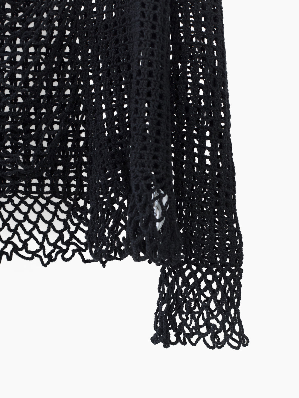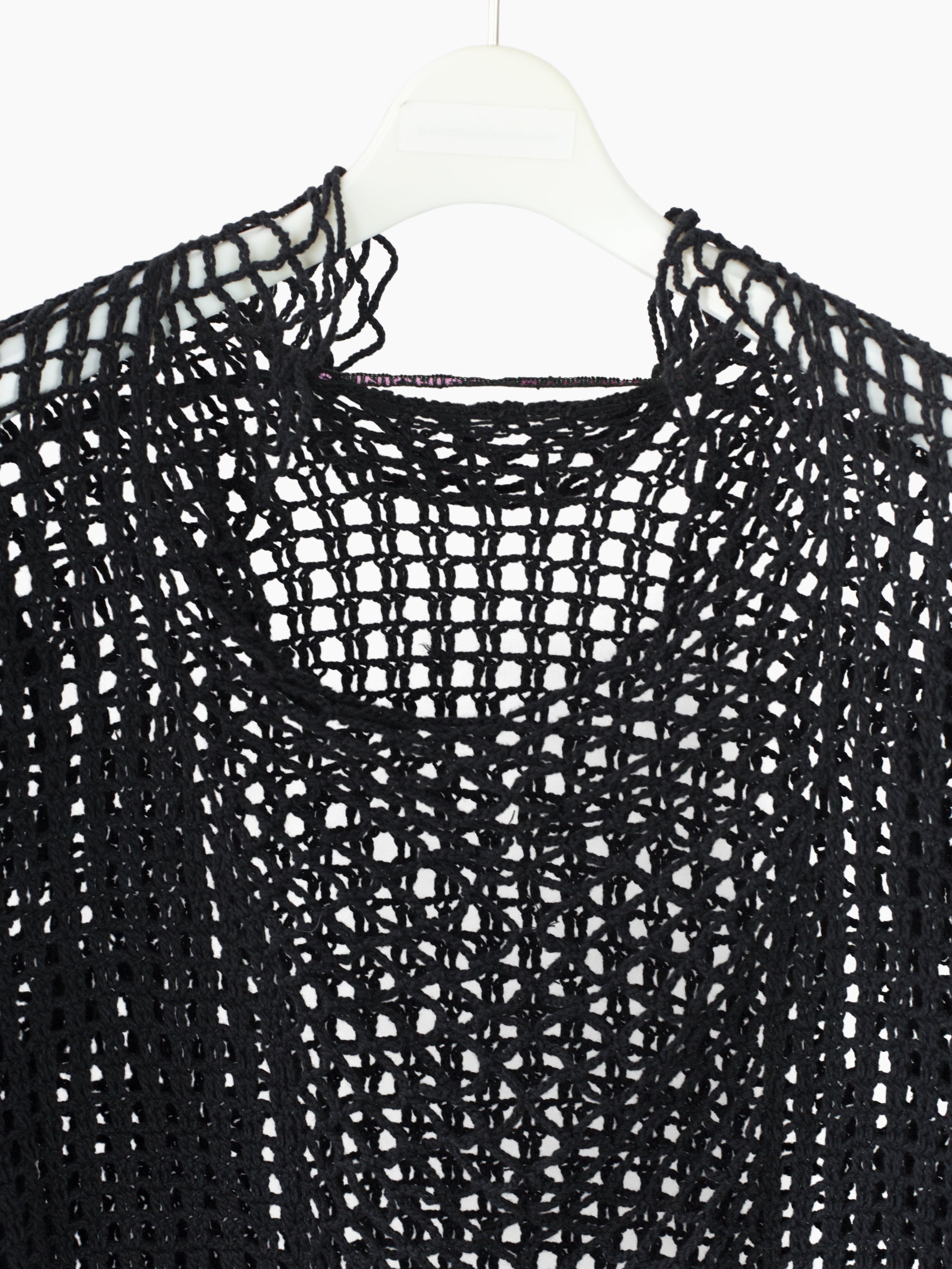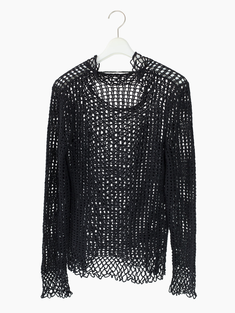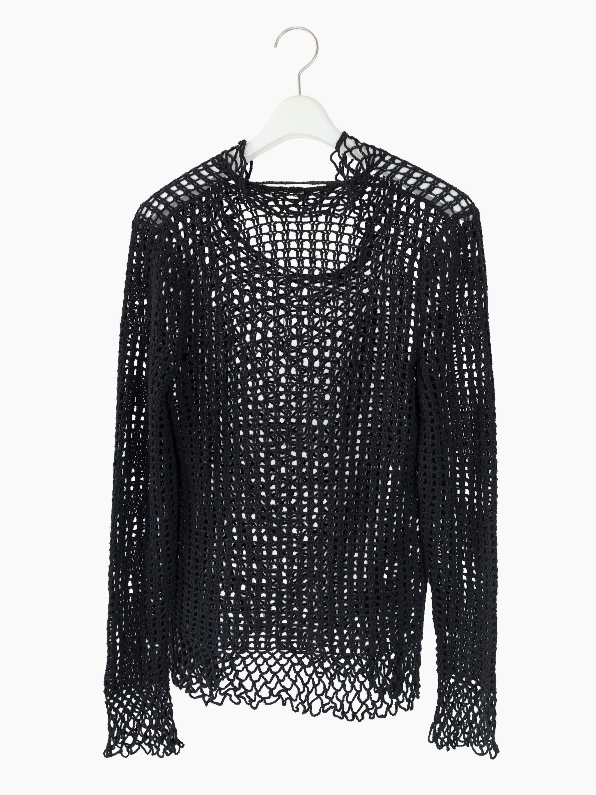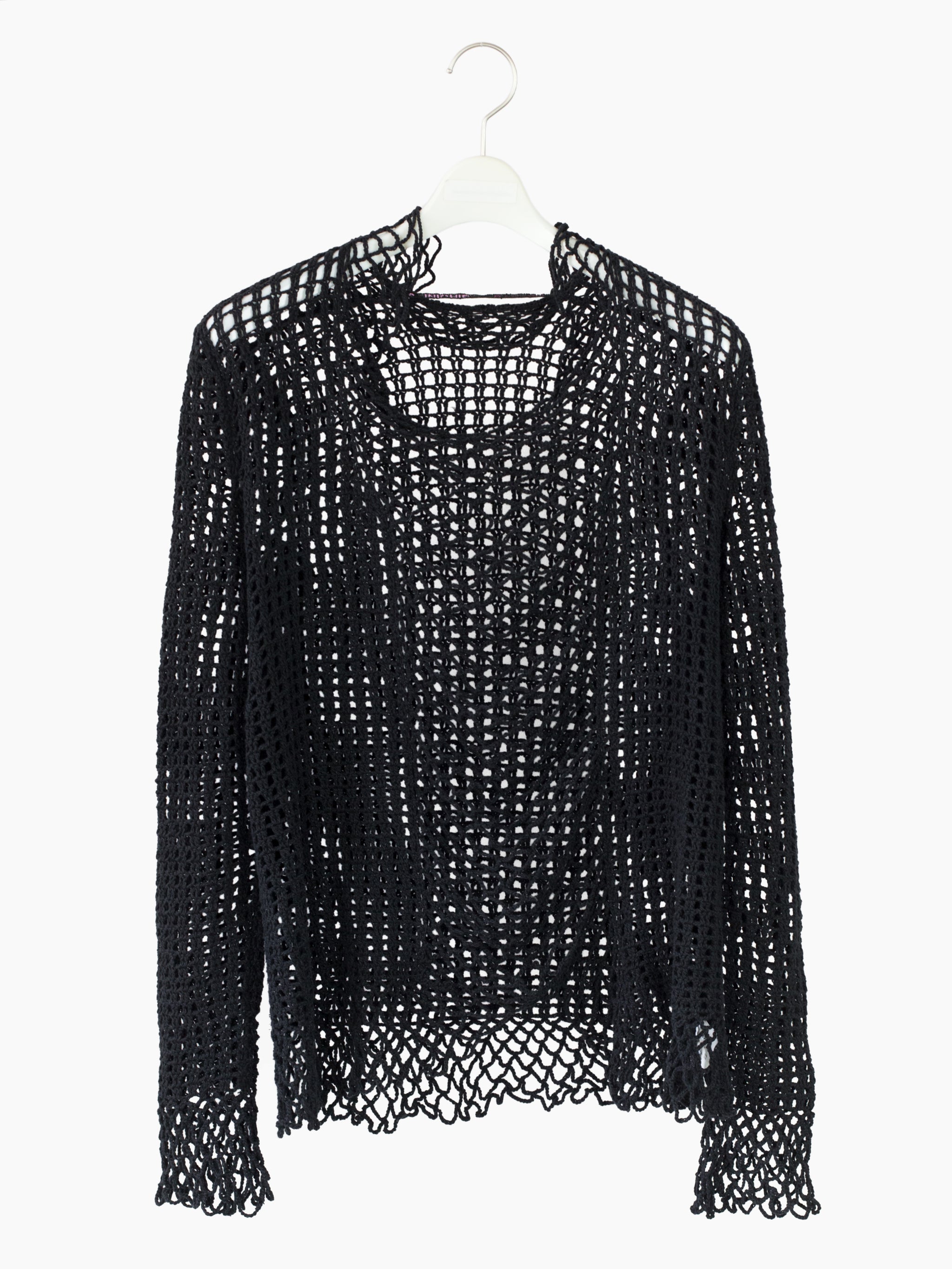 Spider netted knit top from Shinichiro Arakawa, capturing the designer's deconstructionist punk-leaning aesthetic in the 90s. This top features varying stitches, looser single yarn netting at the center body/cuffs and double stitches at the sides/sleeves for different levels of visual density. The neckline is knit with a wavy, irregular profile for an insouciant edge. Perfect as a top or layering piece for added texture and visual richness.