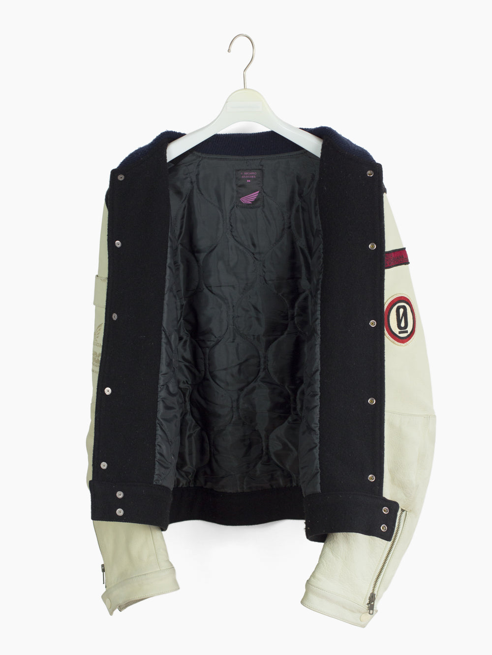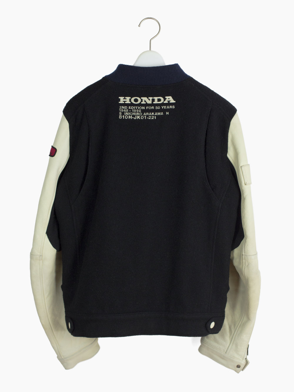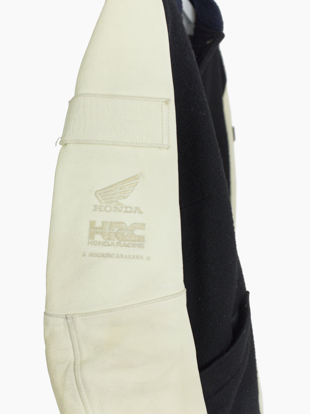 Statement hybrid moto stadium jacket from motorcycle specialist Shinichiro Arakawa in collaboration with Honda. This jacket features a fuzzy wool body and iconic contrast leather sleeves of a stadium jacket but cut with the ergonomic, articulated shape of a motorcycle jacket sleeve. Underarm inserts in stretch rib provide ventilation and comfort and work in tandem with the back action gussets to enhance mobility despite the slim fit throughout. Punchy, graphic HONDA racing insignias are applied as both embroidery and patches to accentuate the racing aesthetic of the piece.
