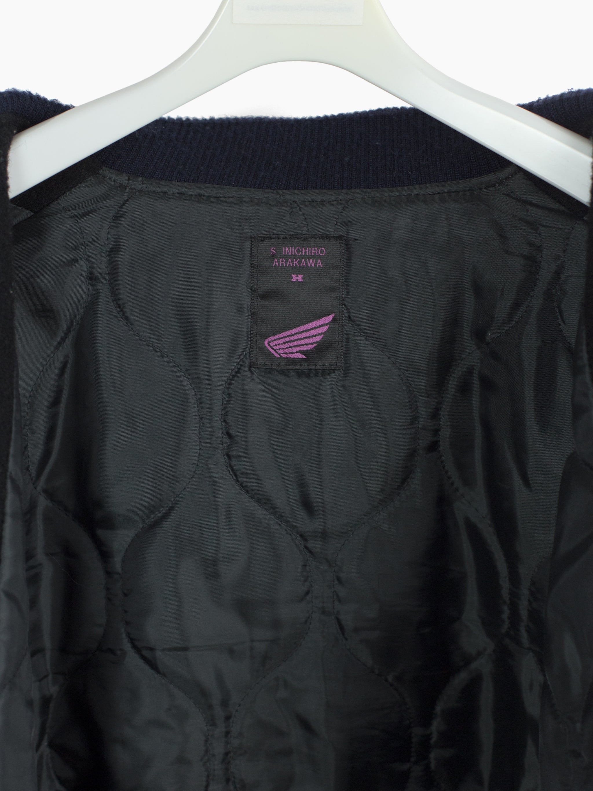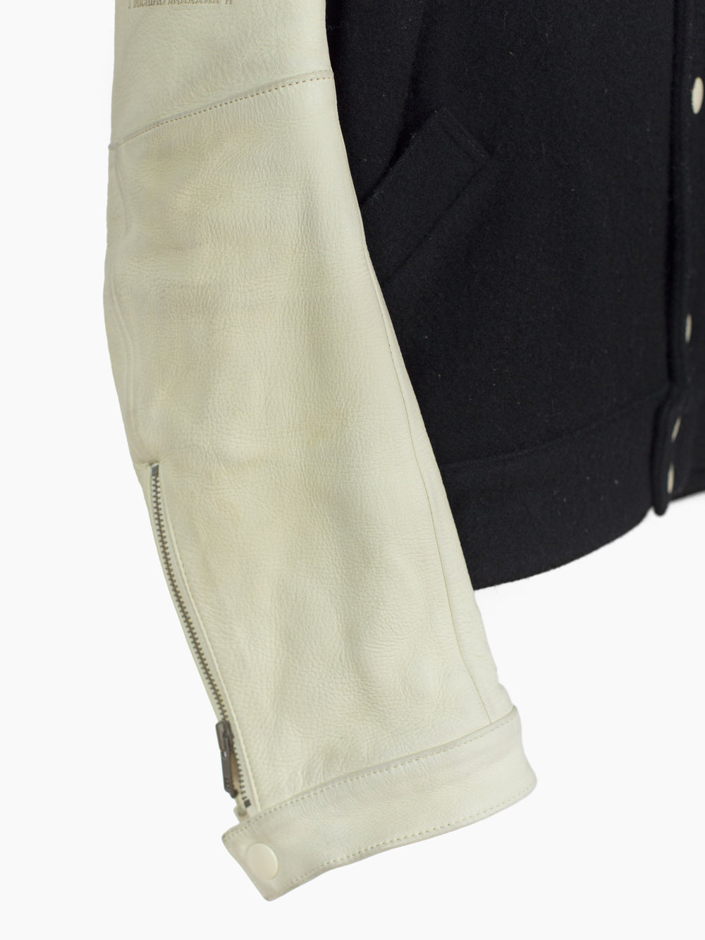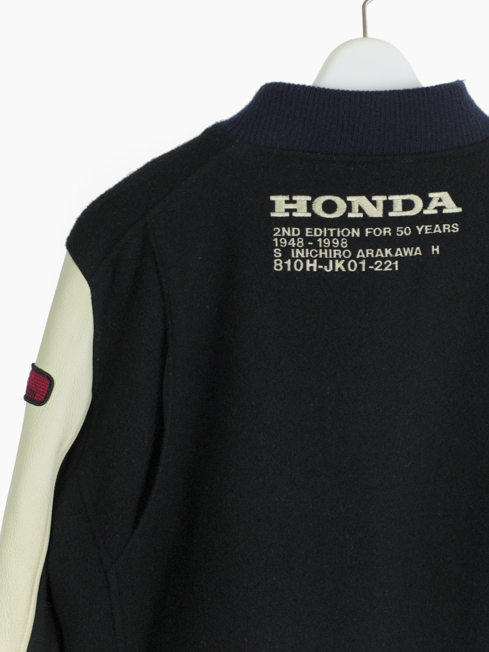 Statement hybrid moto stadium jacket from motorcycle specialist Shinichiro Arakawa in collaboration with Honda. This jacket features a fuzzy wool body and iconic contrast leather sleeves of a stadium jacket but cut with the ergonomic, articulated shape of a motorcycle jacket sleeve. Underarm inserts in stretch rib provide ventilation and comfort and work in tandem with the back action gussets to enhance mobility despite the slim fit throughout. Punchy, graphic HONDA racing insignias are applied as both embroidery and patches to accentuate the racing aesthetic of the piece.