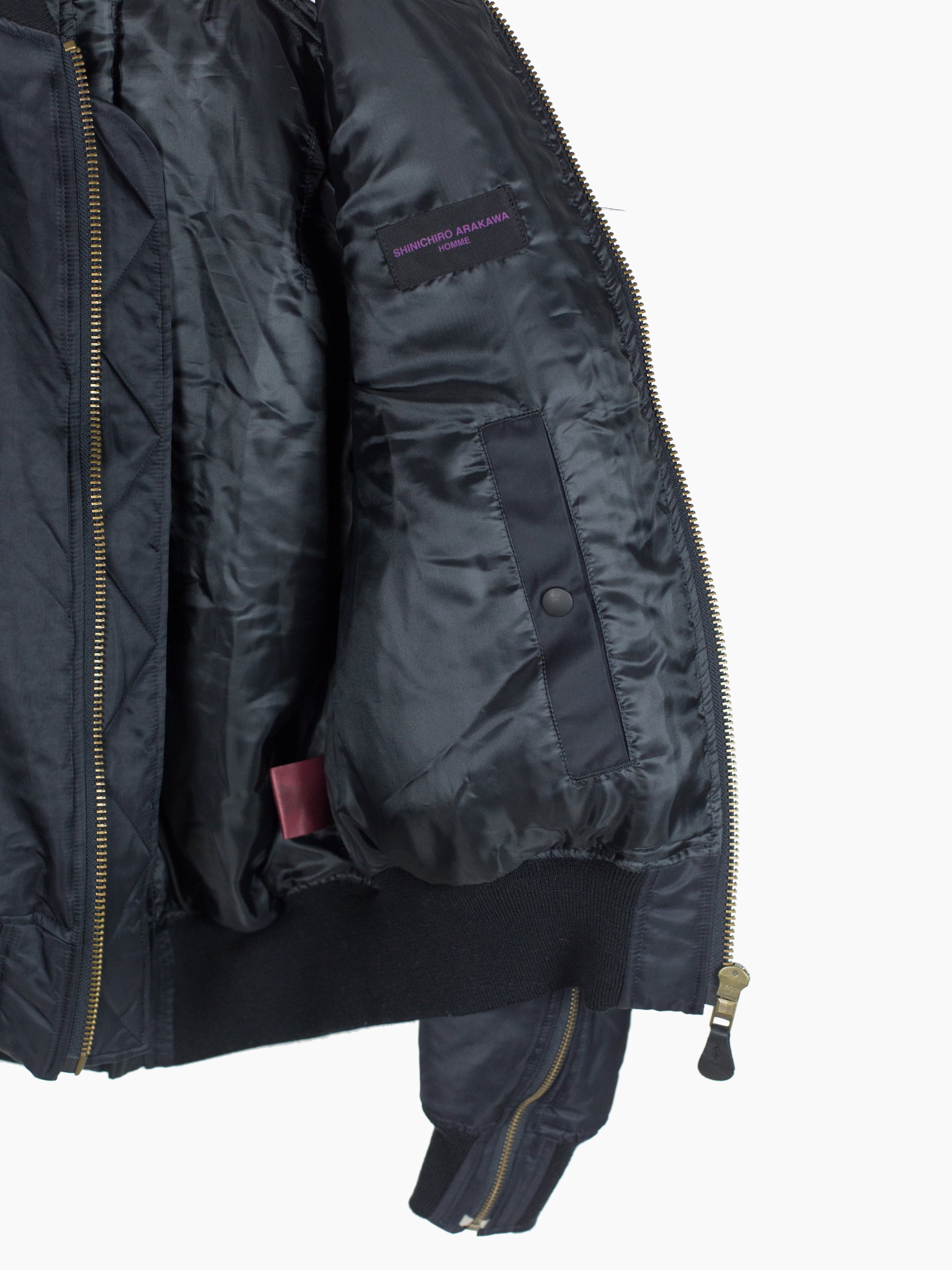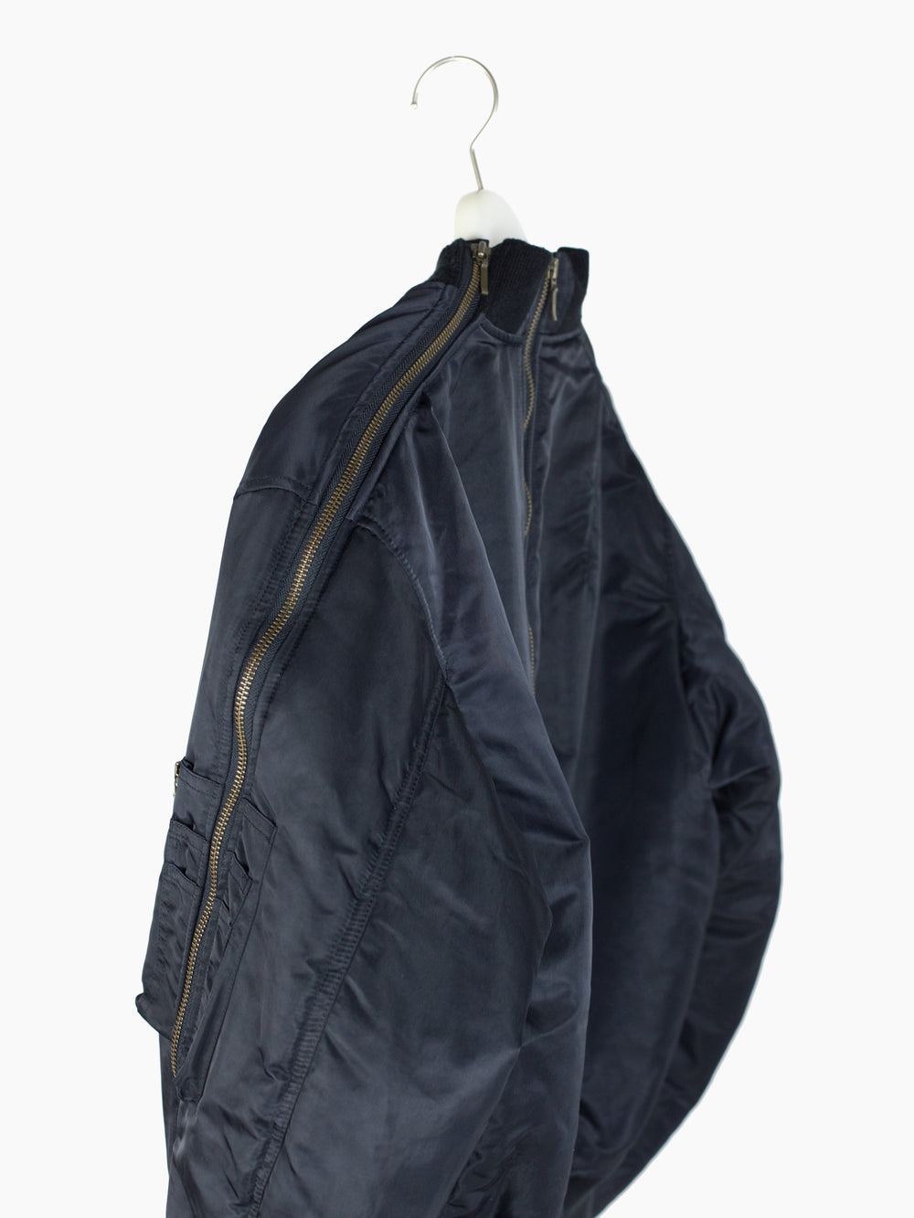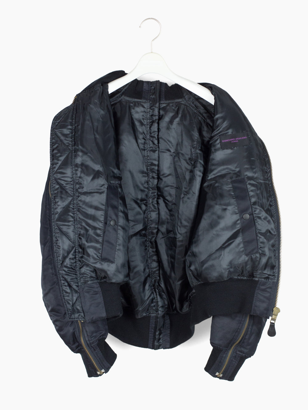 An incredibly refined archetypical MA-1 Bomber punctuated with Shinichiro Arakawa's deconstructionist, moto-inclined sensibilities. 3 zippers converge from hem and cuffs towards the neckline, tracing the sleeves and center back, intersecting arm pocket, ribbing, and shoulderline. Opened, the zippers create a striking graphic impression of the jacket being slashed open as well as expanding the silhouette and fit of the piece (either for effect or to accommodate layers underneath).