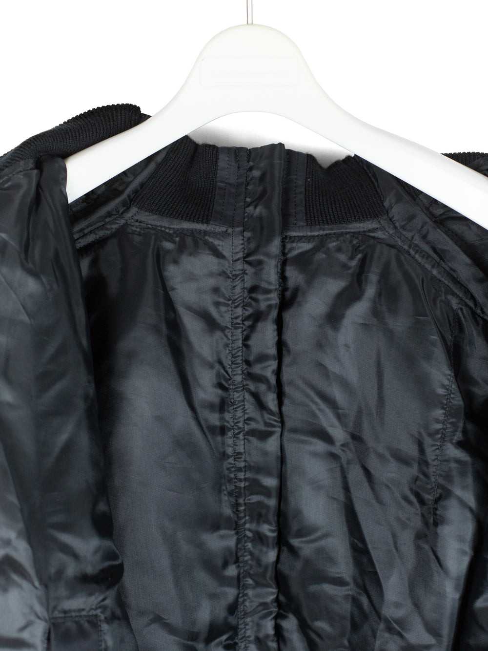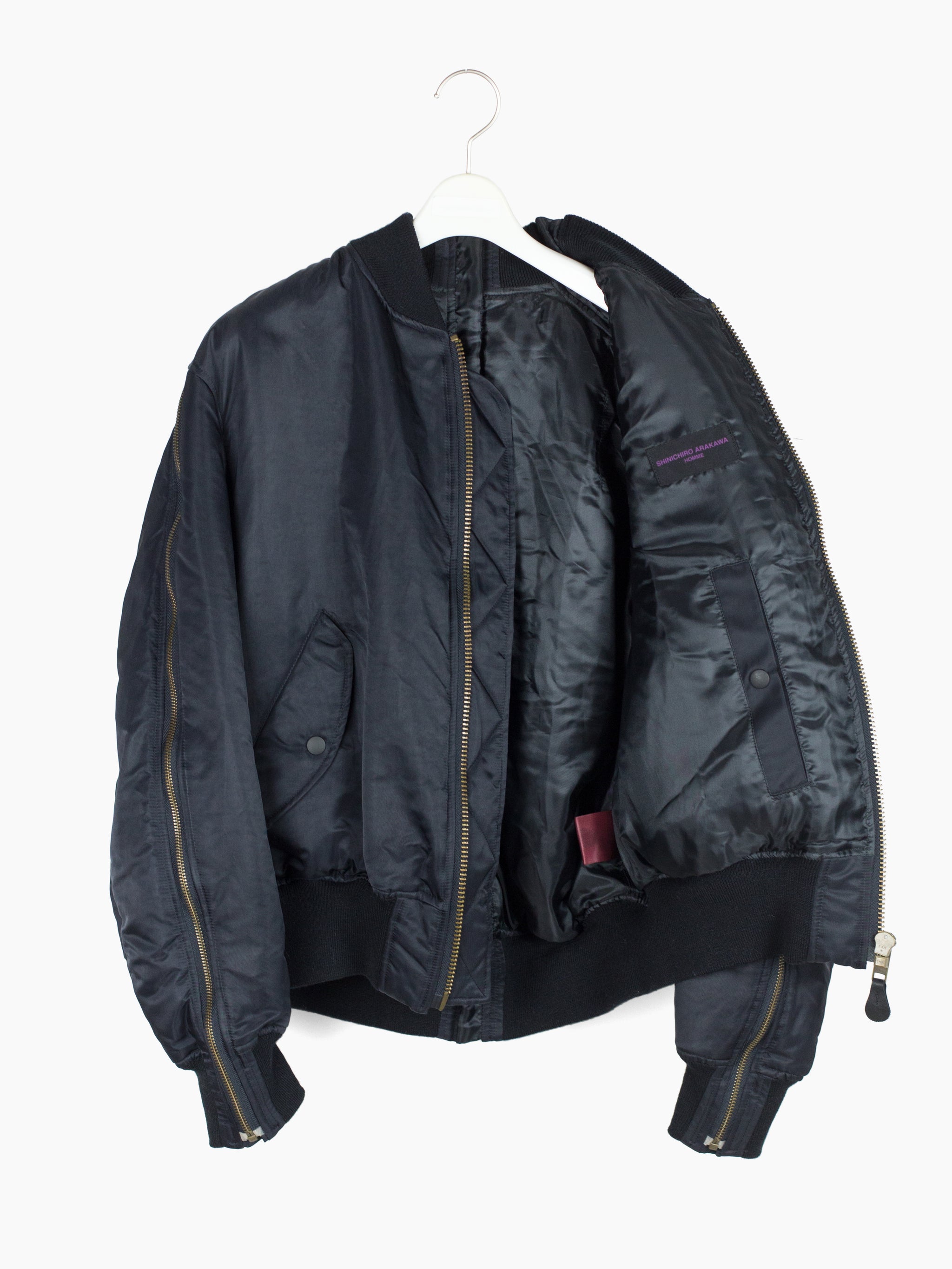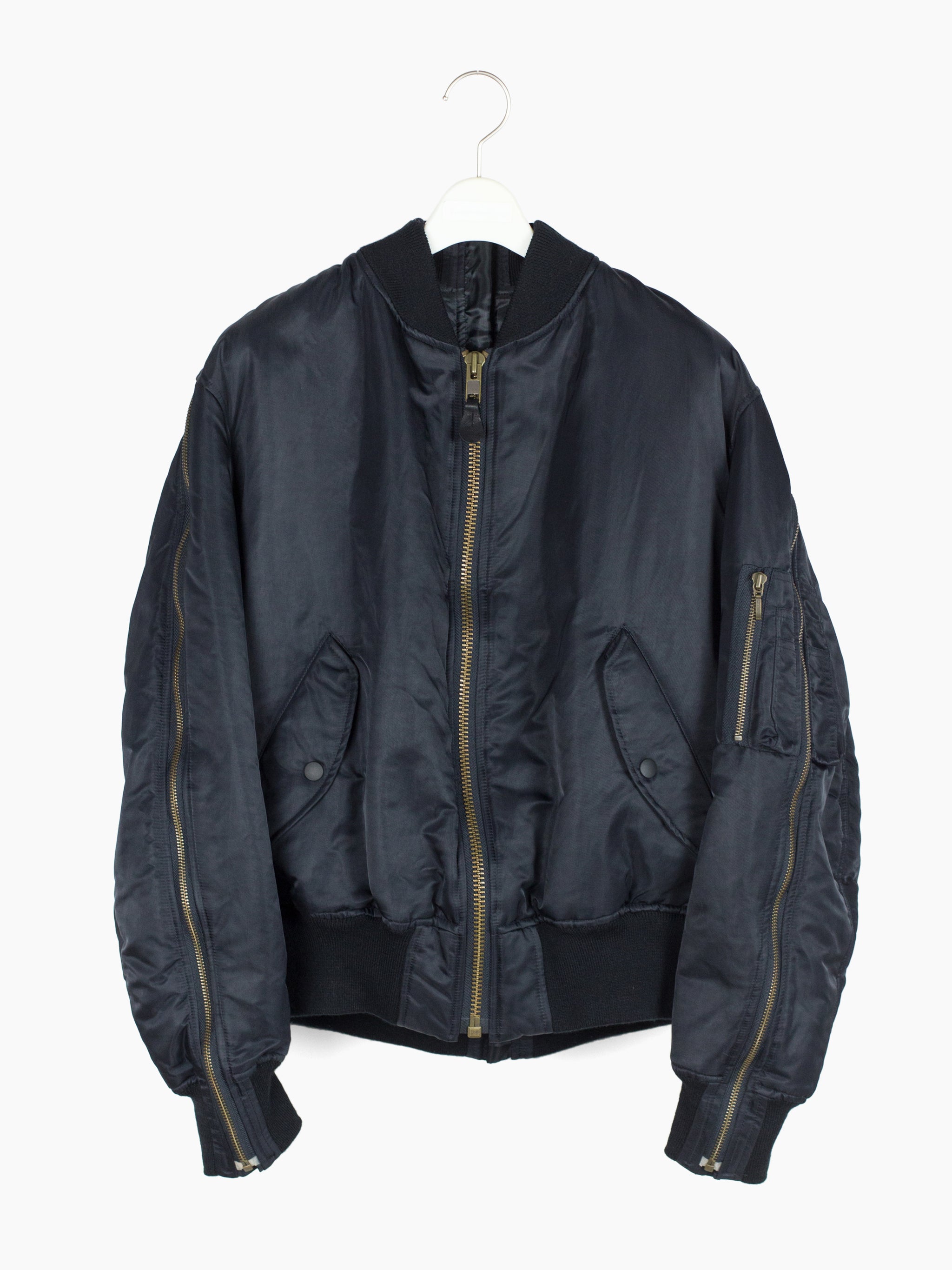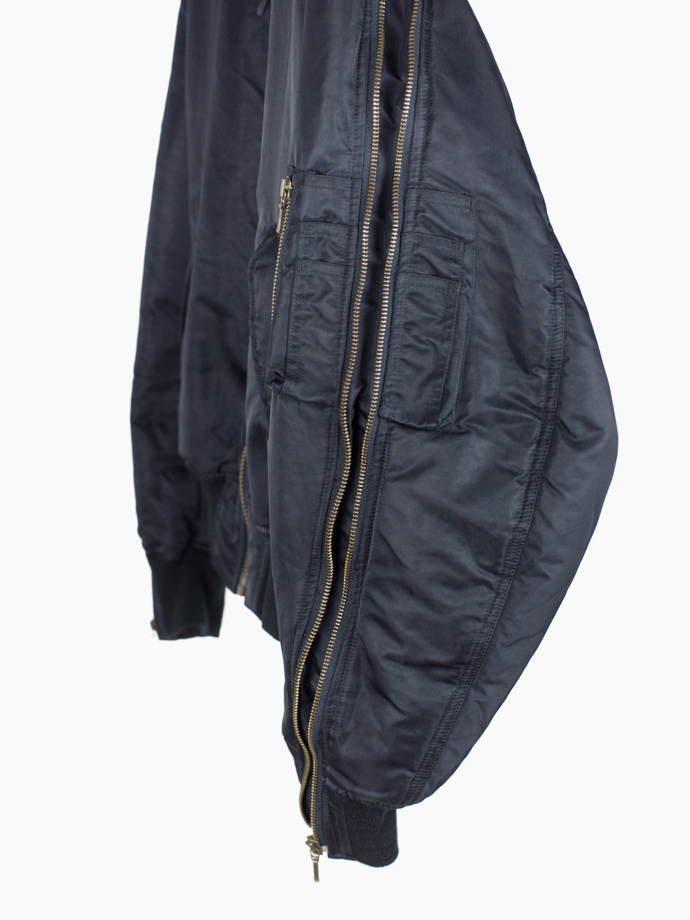 An incredibly refined archetypical MA-1 Bomber punctuated with Shinichiro Arakawa's deconstructionist, moto-inclined sensibilities. 3 zippers converge from hem and cuffs towards the neckline, tracing the sleeves and center back, intersecting arm pocket, ribbing, and shoulderline. Opened, the zippers create a striking graphic impression of the jacket being slashed open as well as expanding the silhouette and fit of the piece (either for effect or to accommodate layers underneath).