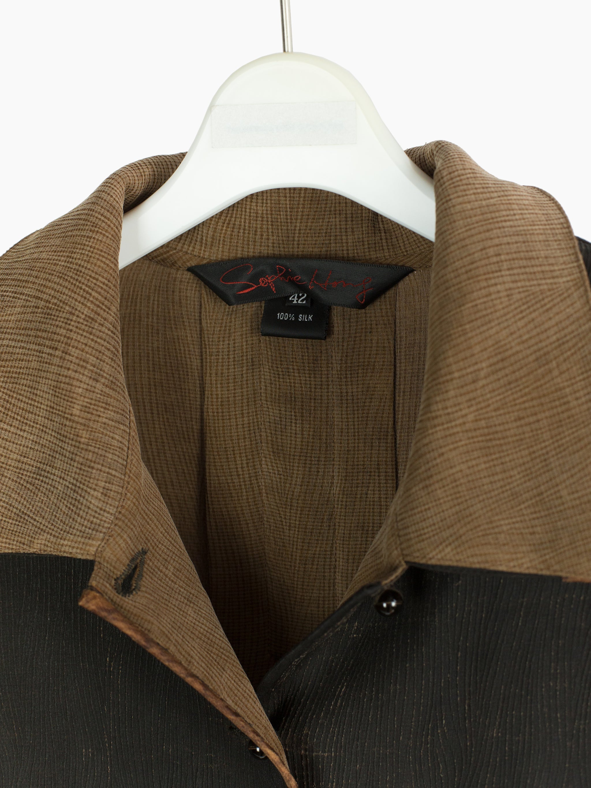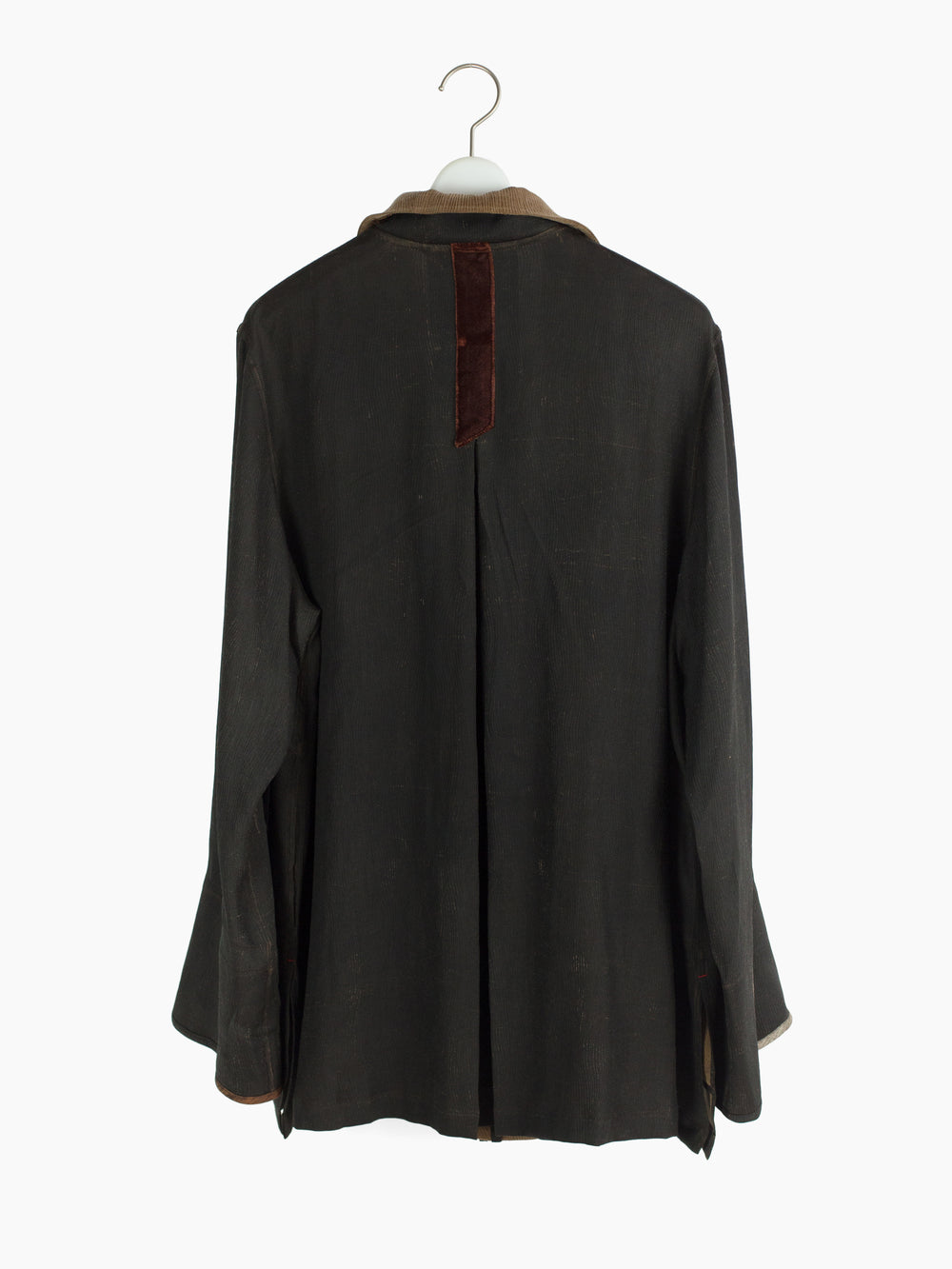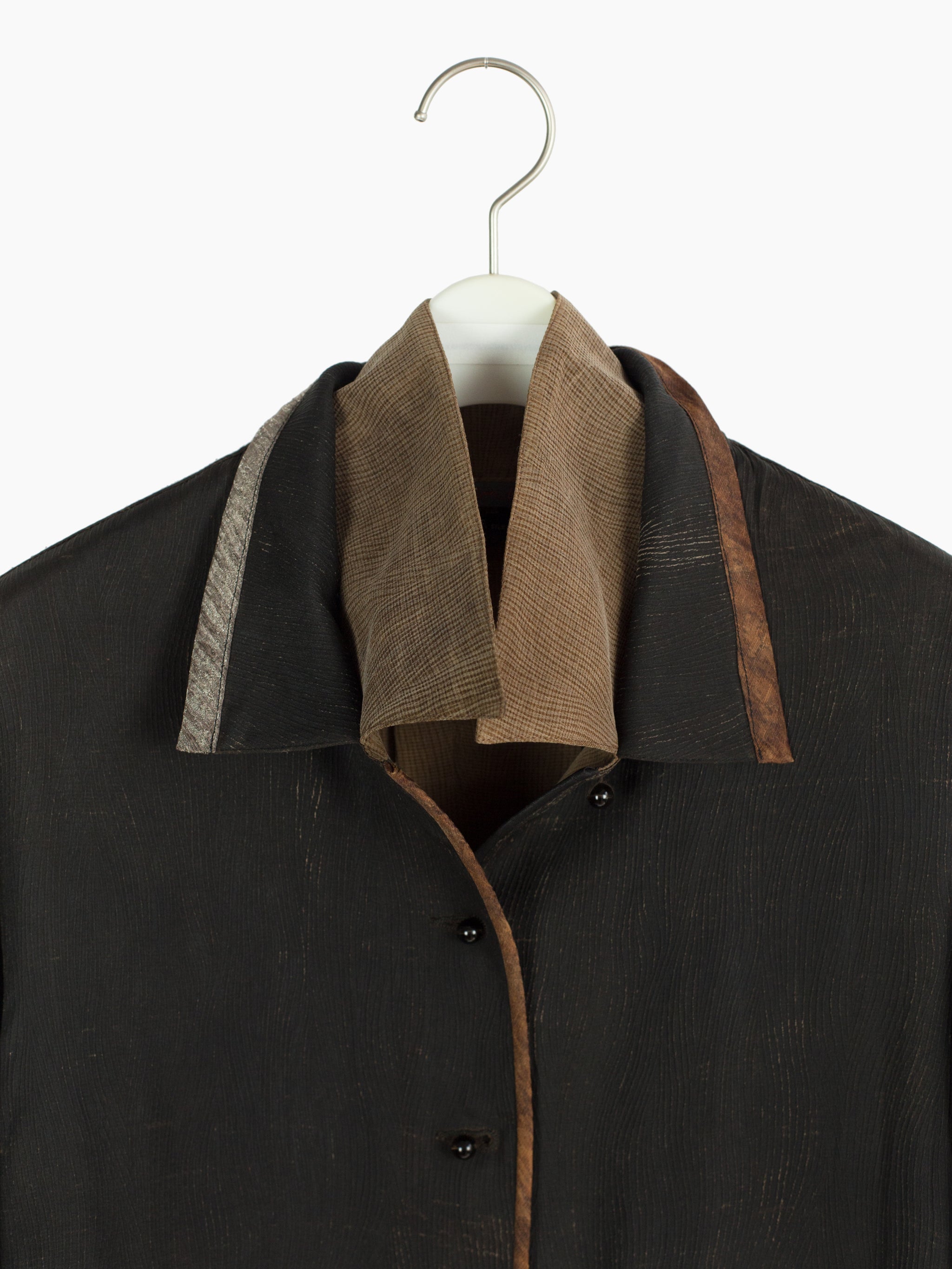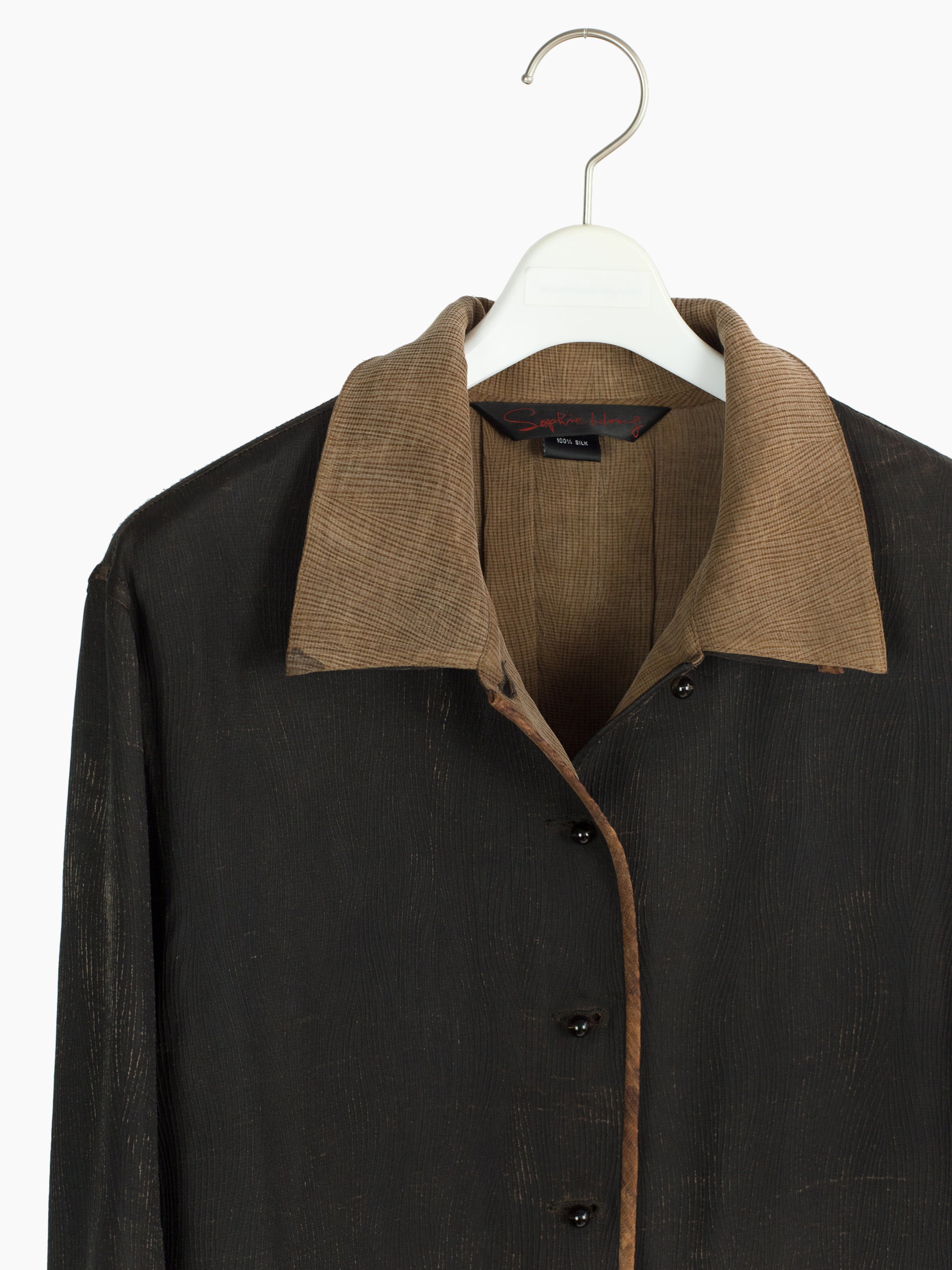 Eastern-styled shirt jacket from textile researcher and artisan Sophie Hong, featuring her iconic work studying and advancing historical mud-dyed silk techniques from China. This shirt features an intricately textured lightweight silk in a wave patterned weave with brown mud coating over top. It's cut with a high back vent for a roomy, draped, almost cape-like fit that moves fluidly.