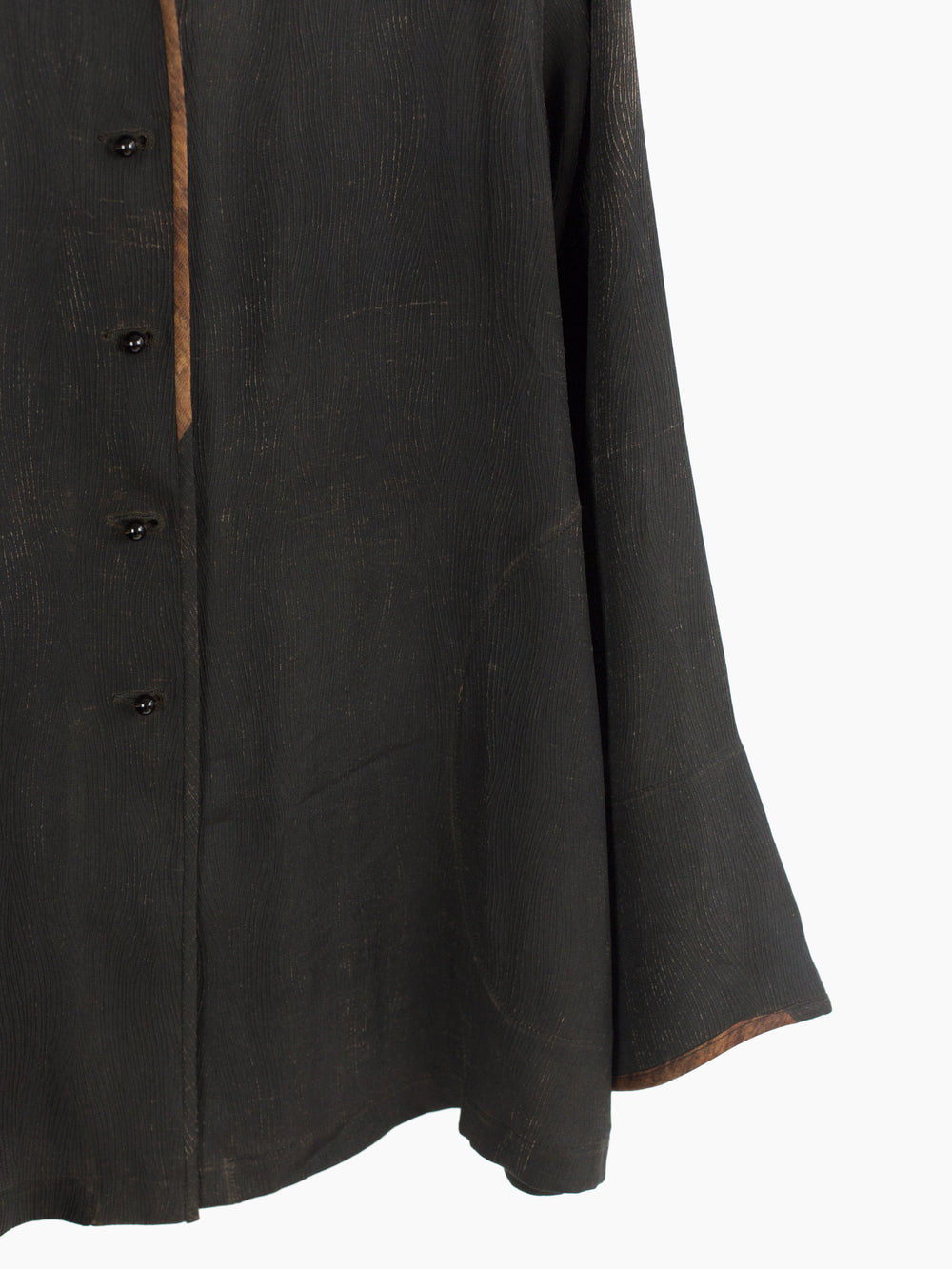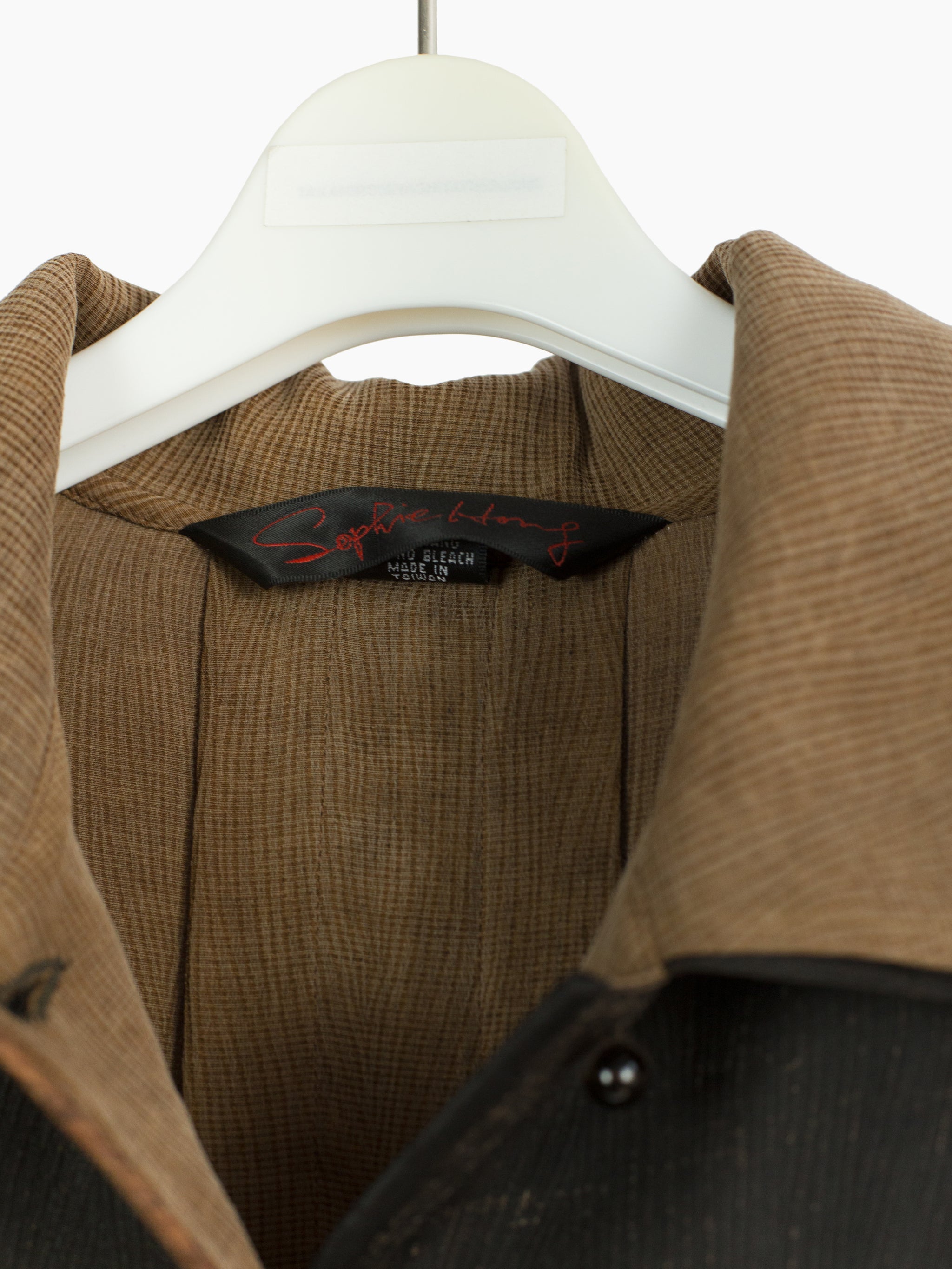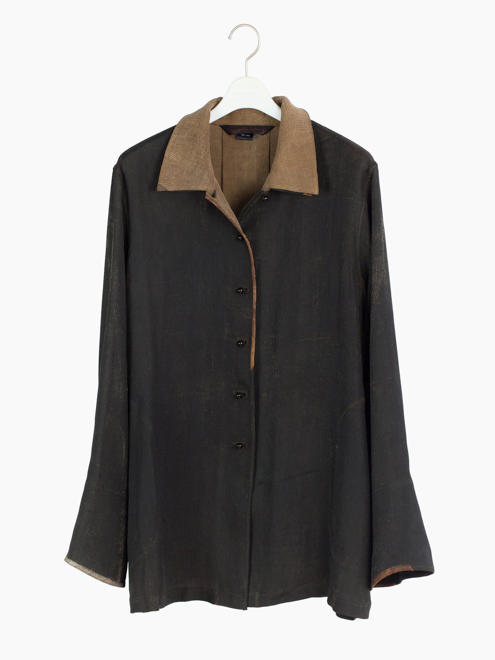 Eastern-styled shirt jacket from textile researcher and artisan Sophie Hong, featuring her iconic work studying and advancing historical mud-dyed silk techniques from China. This shirt features an intricately textured lightweight silk in a wave patterned weave with brown mud coating over top. It's cut with a high back vent for a roomy, draped, almost cape-like fit that moves fluidly.