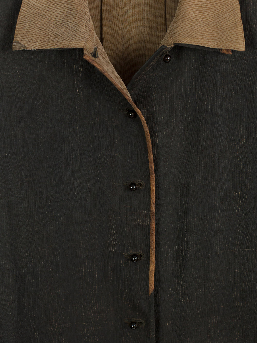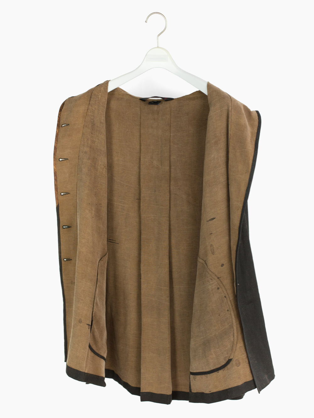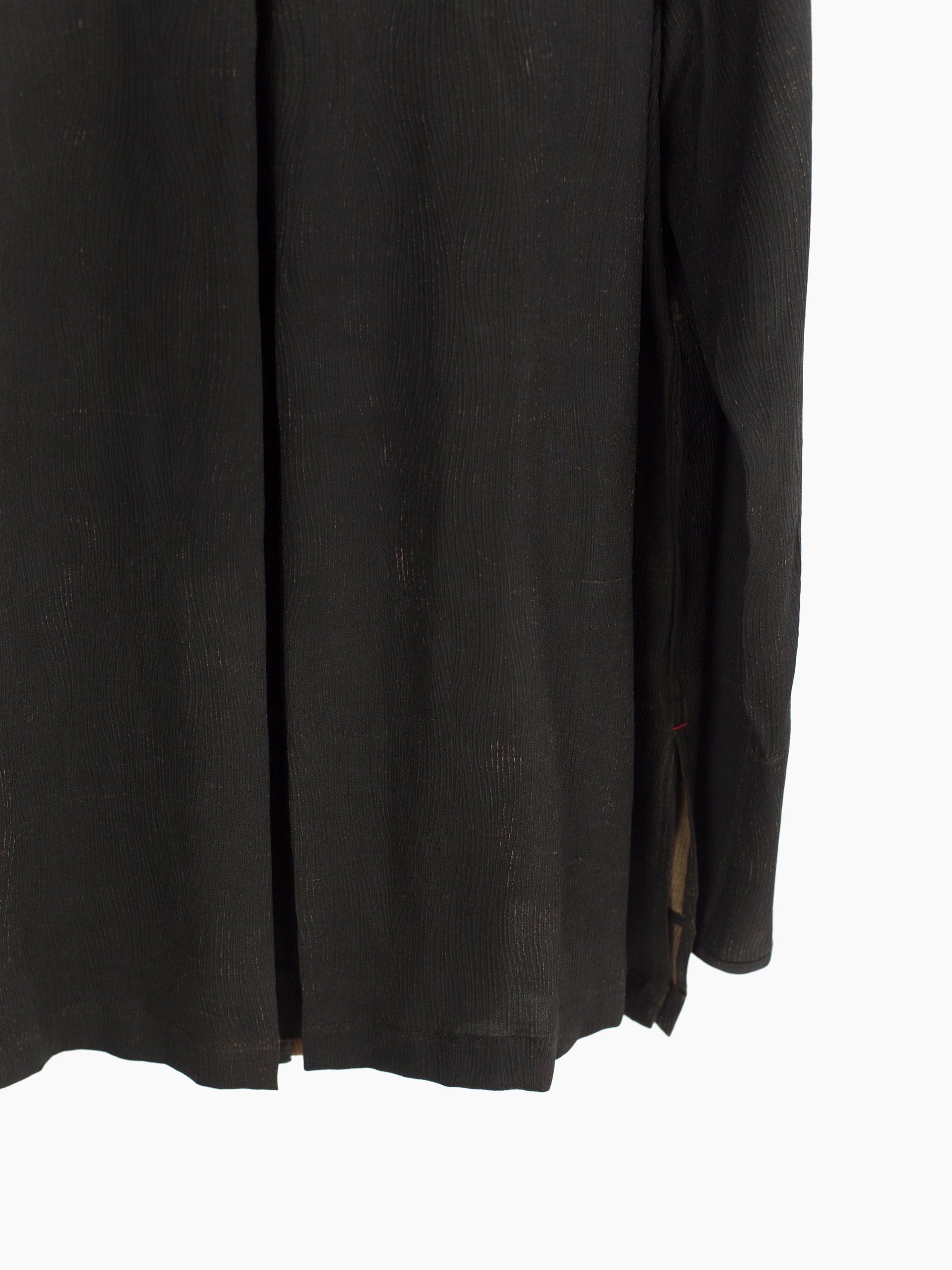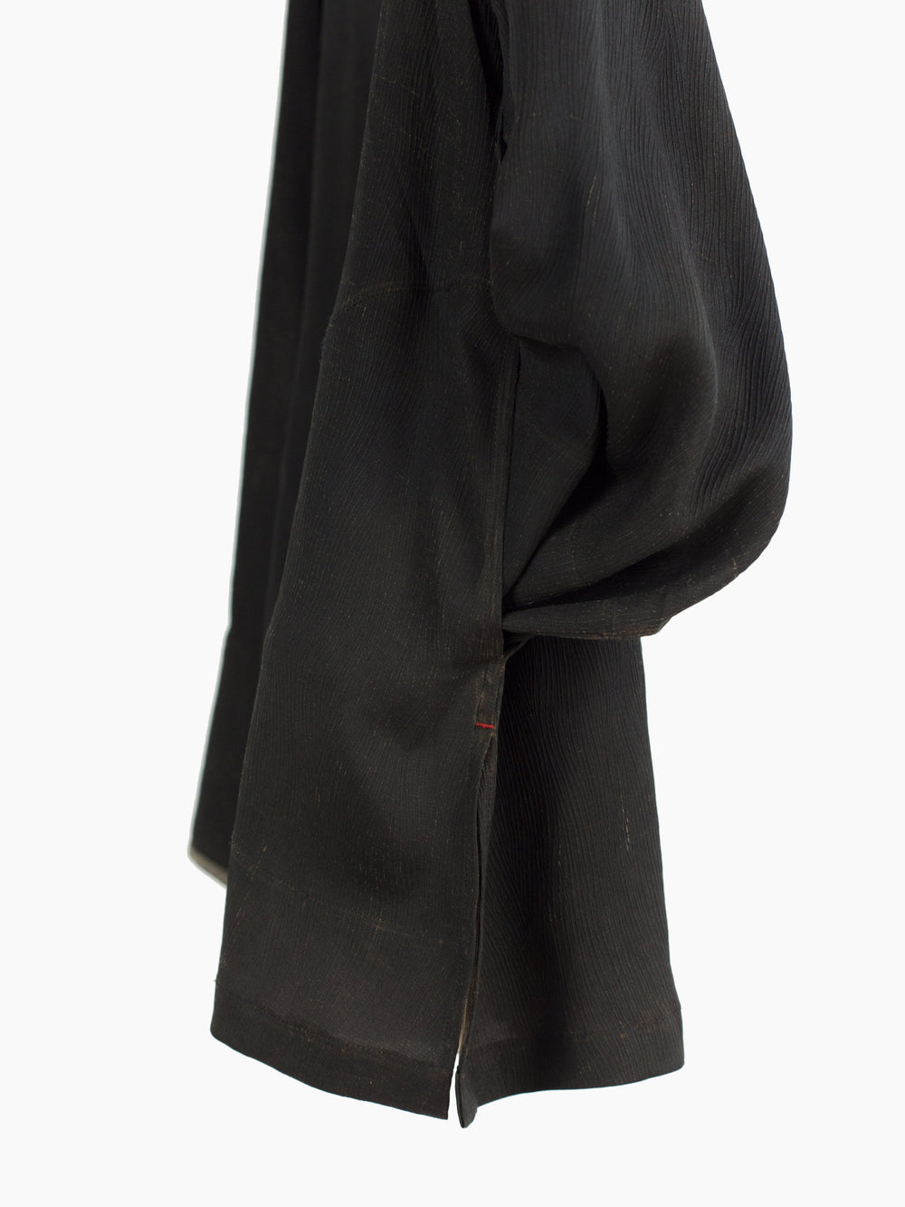 Eastern-styled shirt jacket from textile researcher and artisan Sophie Hong, featuring her iconic work studying and advancing historical mud-dyed silk techniques from China. This shirt features an intricately textured lightweight silk in a wave patterned weave with brown mud coating over top. It's cut with a high back vent for a roomy, draped, almost cape-like fit that moves fluidly.