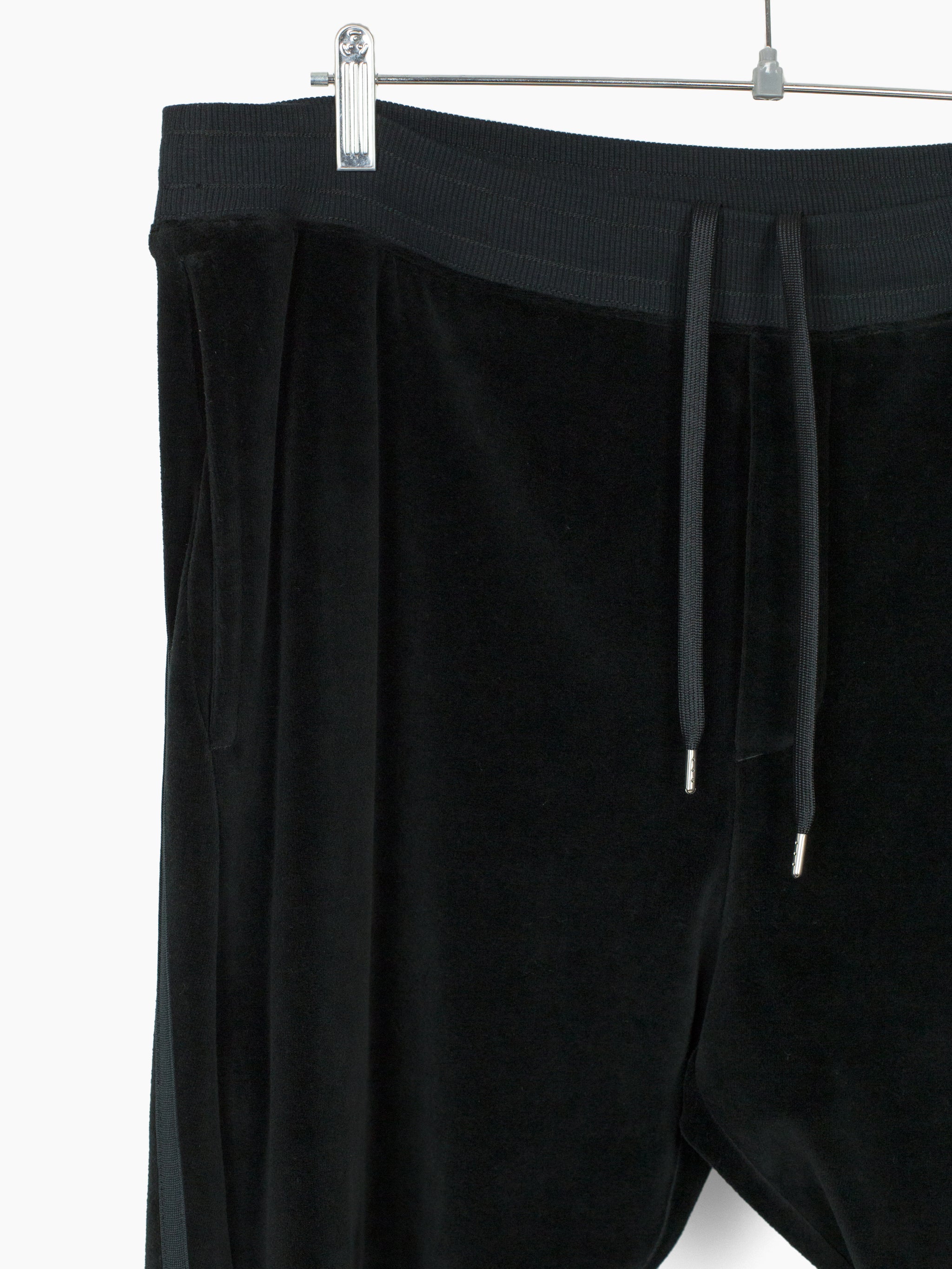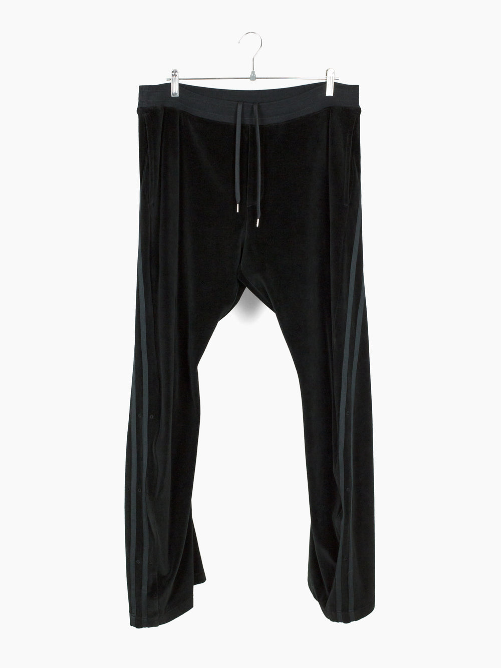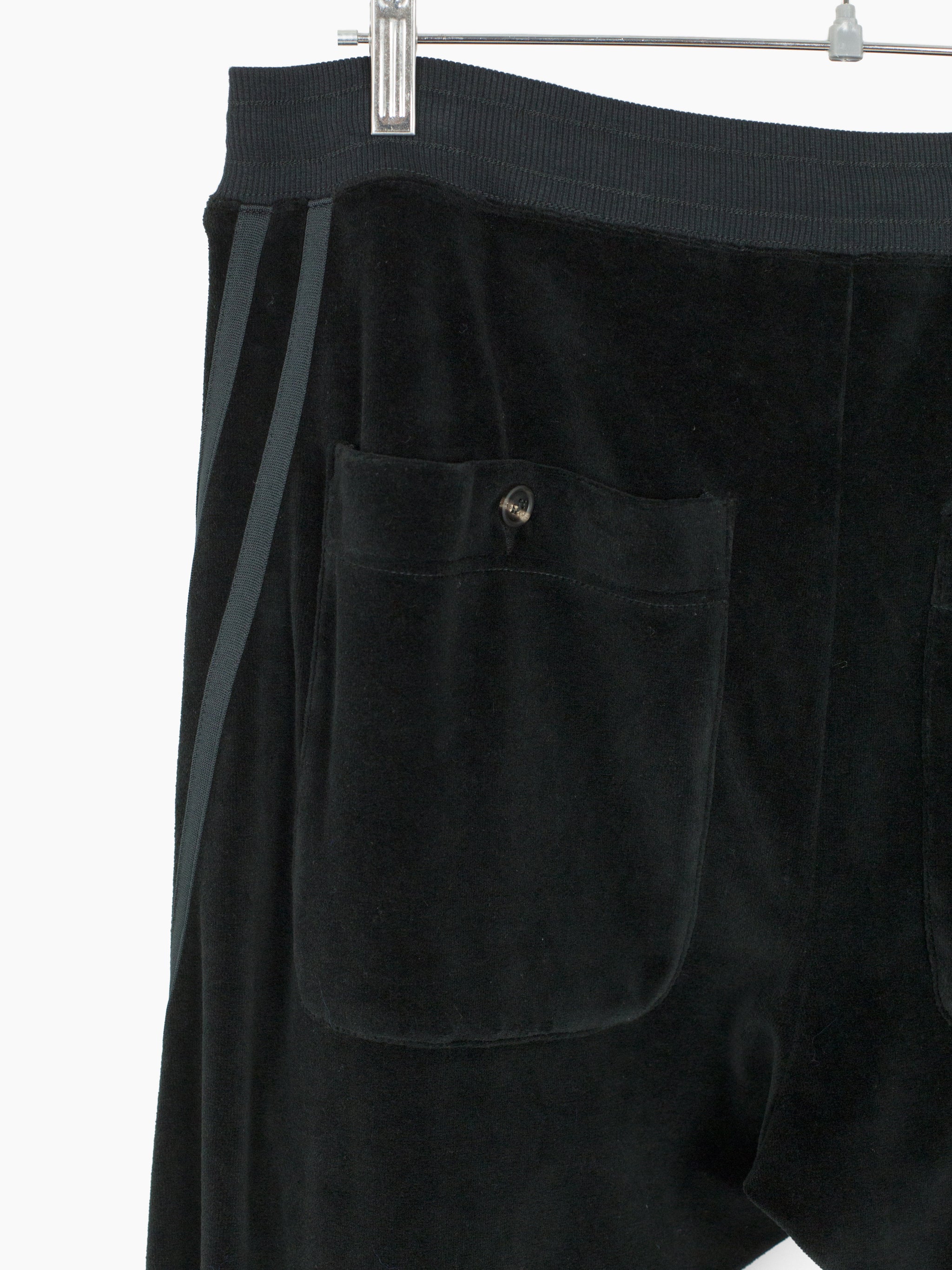 Black velour anatomical fit track pants with loose easy fit and 3d flared leg. Brand signature 'BDH' motif inspired by riveted temple doors adapted to a curved sidestripe detail that wraps towards the front of the leg. Contrast white logo embroidery at wearer's left hip. Sizeable ribbed+drawcord waistband. Two slip side pockets and single back patch pocket at wearer's right.