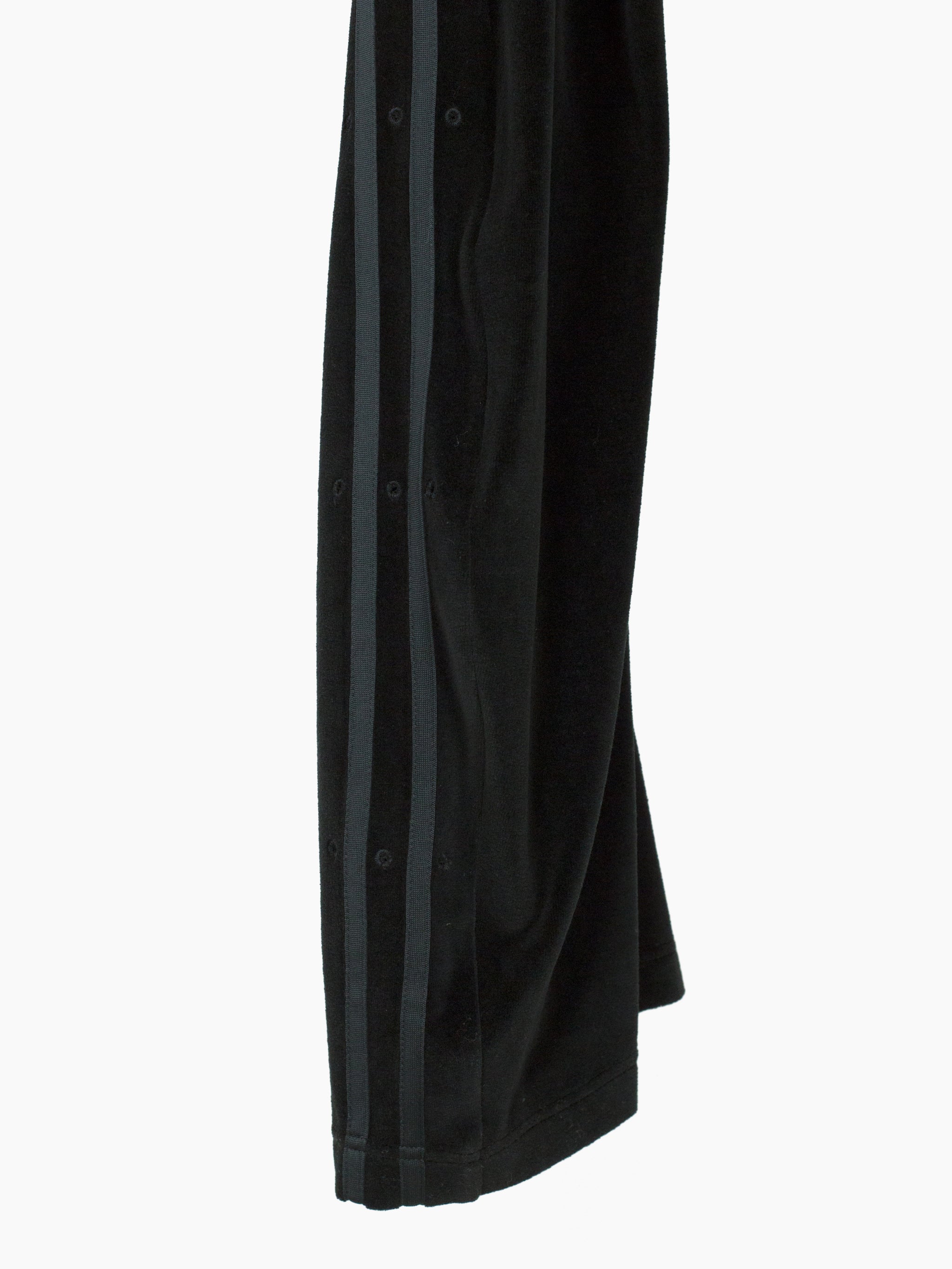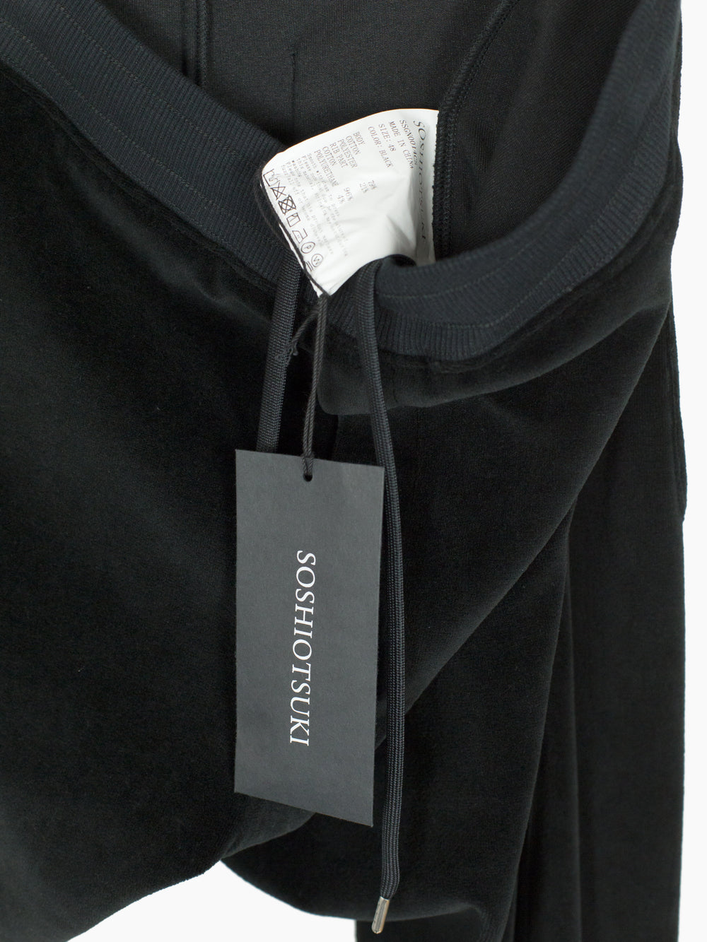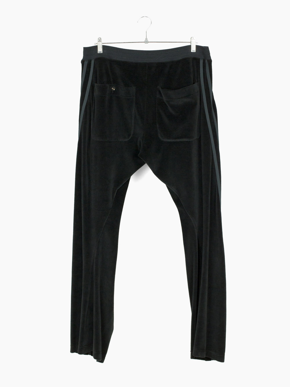 Black velour anatomical fit track pants with loose easy fit and 3d flared leg. Brand signature 'BDH' motif inspired by riveted temple doors adapted to a curved sidestripe detail that wraps towards the front of the leg. Contrast white logo embroidery at wearer's left hip. Sizeable ribbed+drawcord waistband. Two slip side pockets and single back patch pocket at wearer's right.