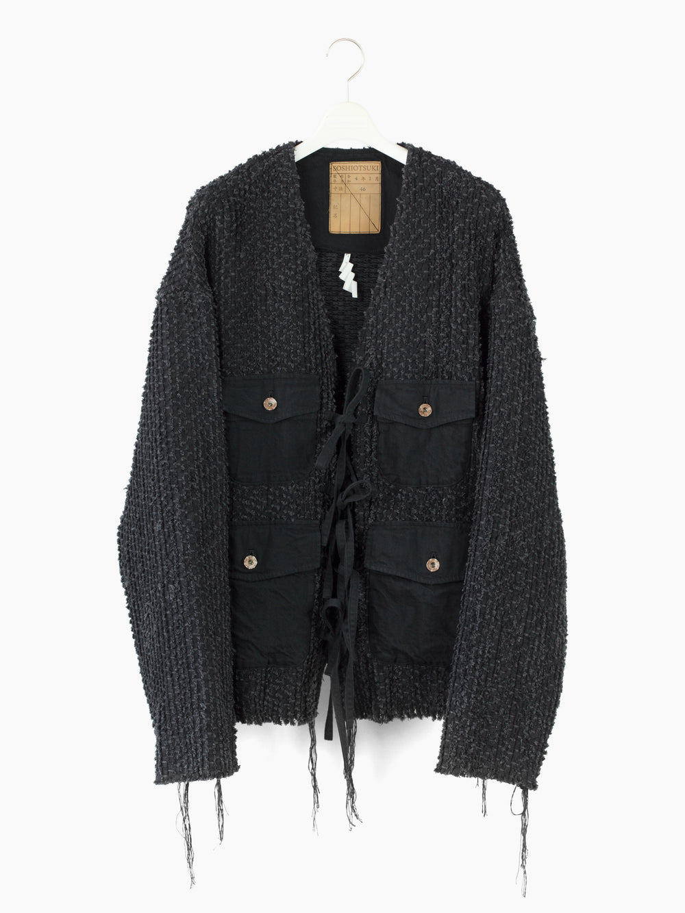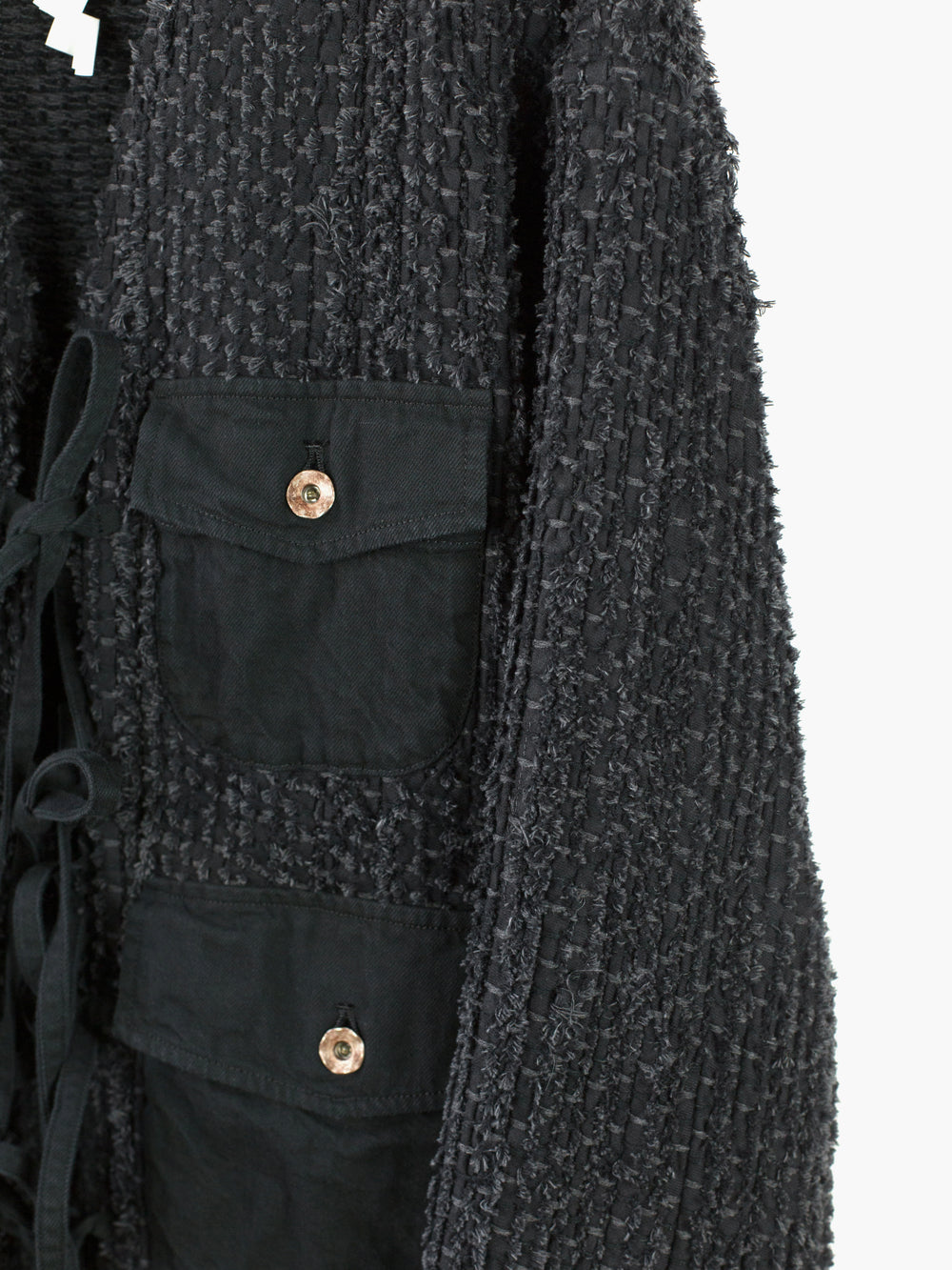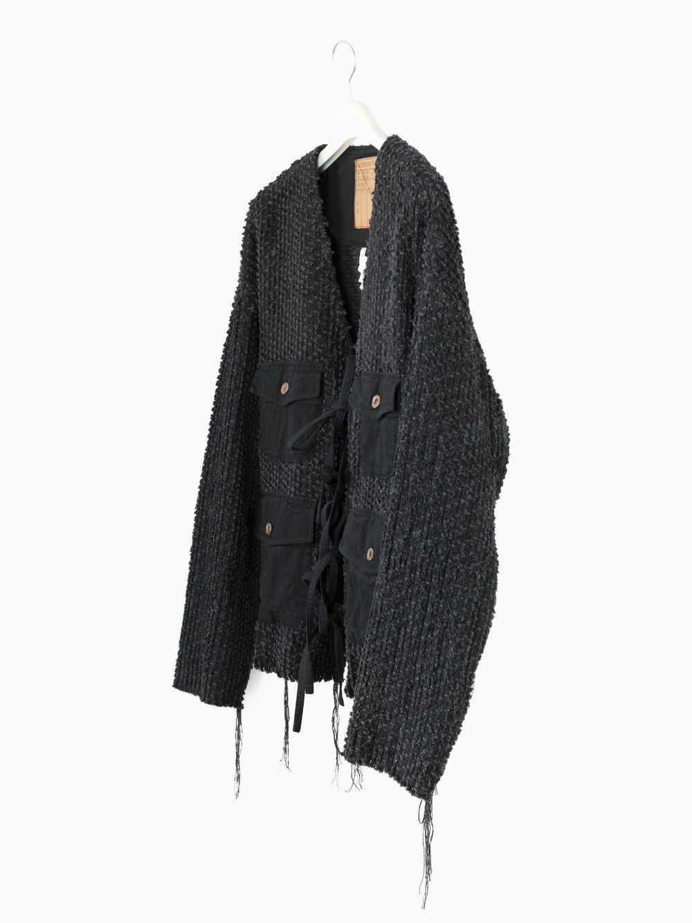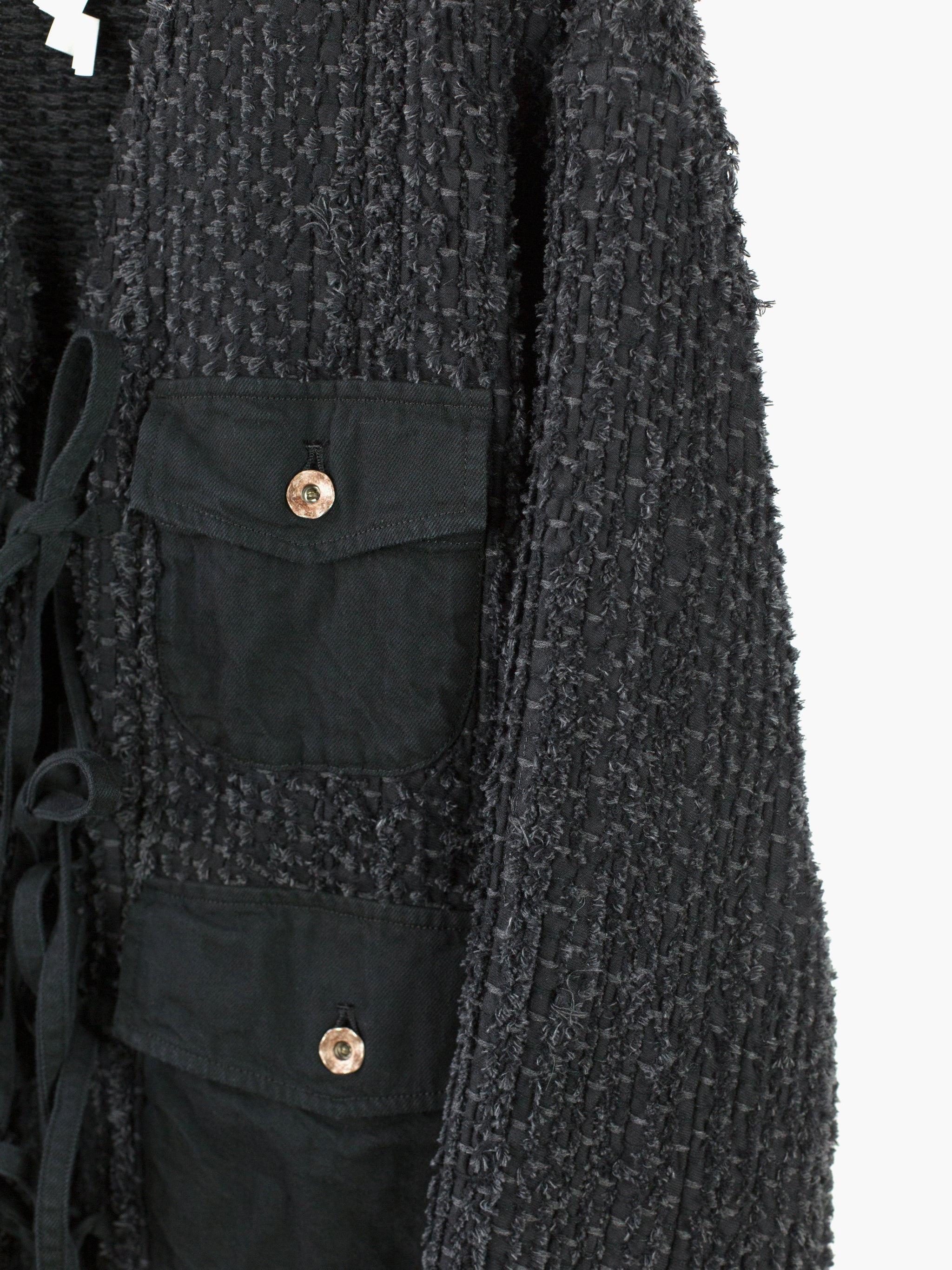 Here it's cut into an oversized cargo cardigan with four flap-closed pockets in black denim and tied front closure. Sleeves and hem are left raw to fray and show age as the garment is worn. Finished with aged hammered shank closures at the pockets and black denim facing around neck and front for structure. Has two back waist adjusters in black denim.