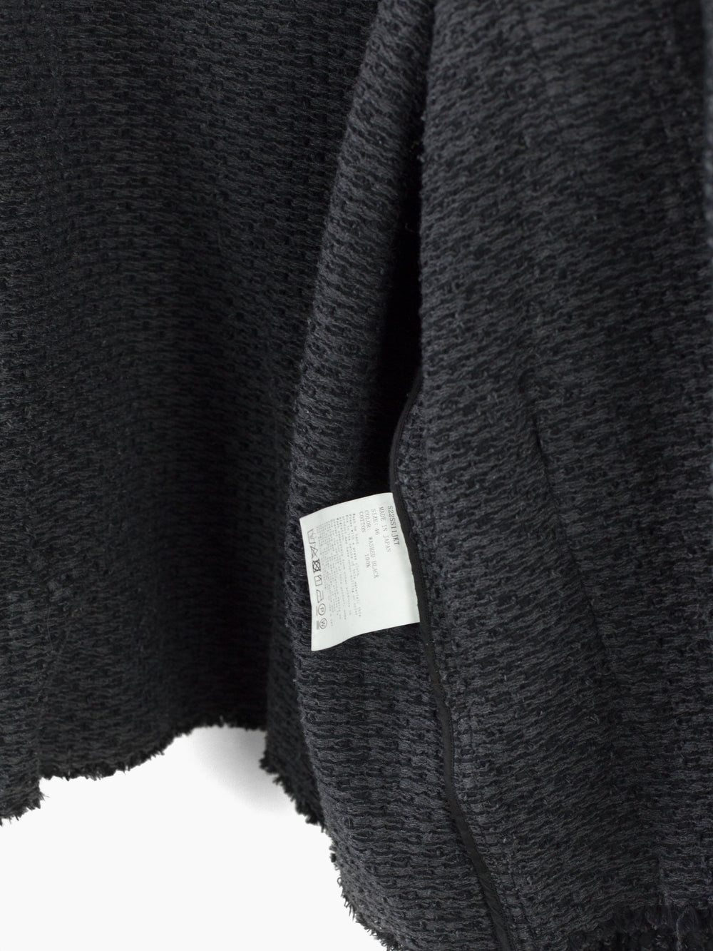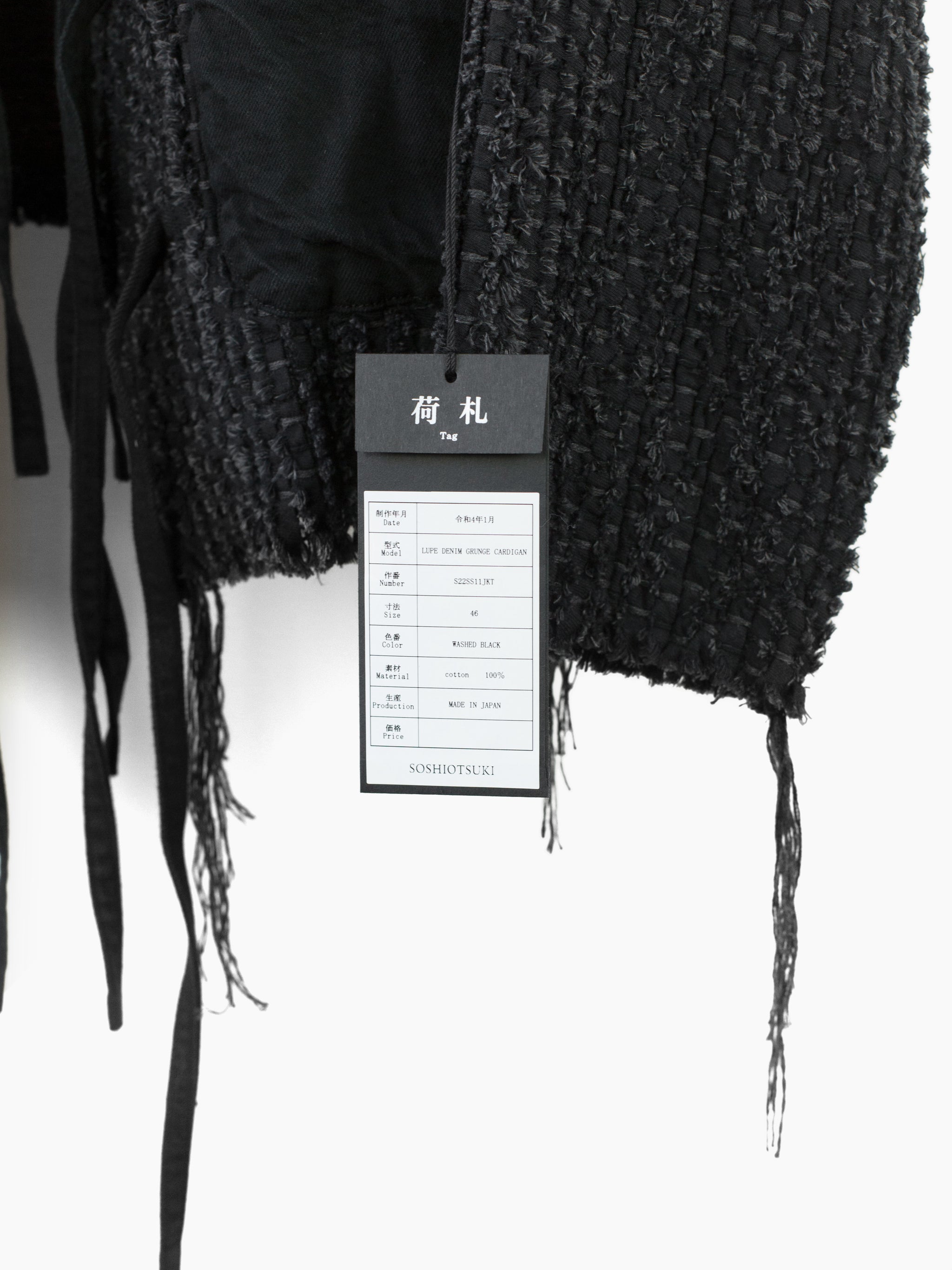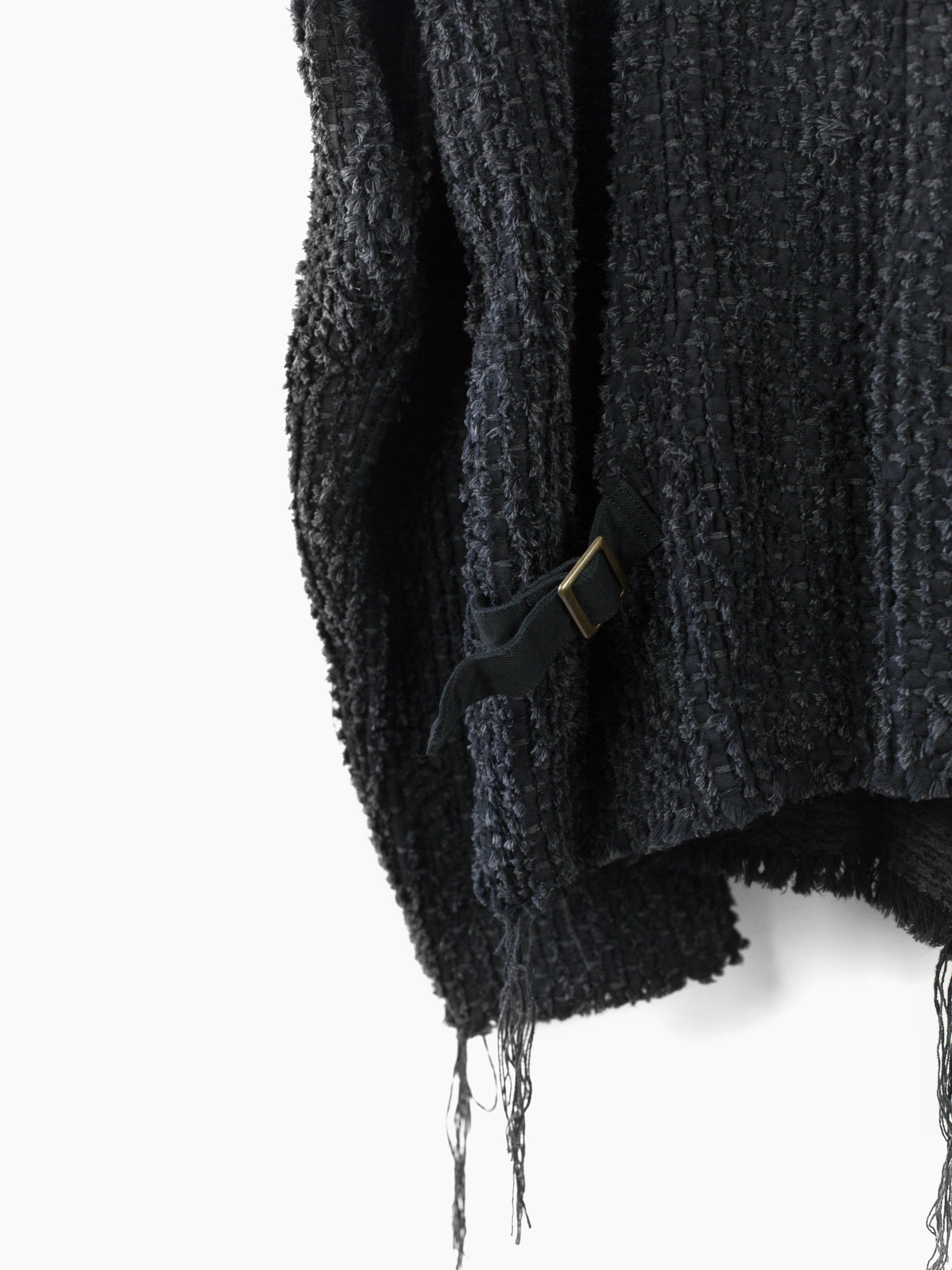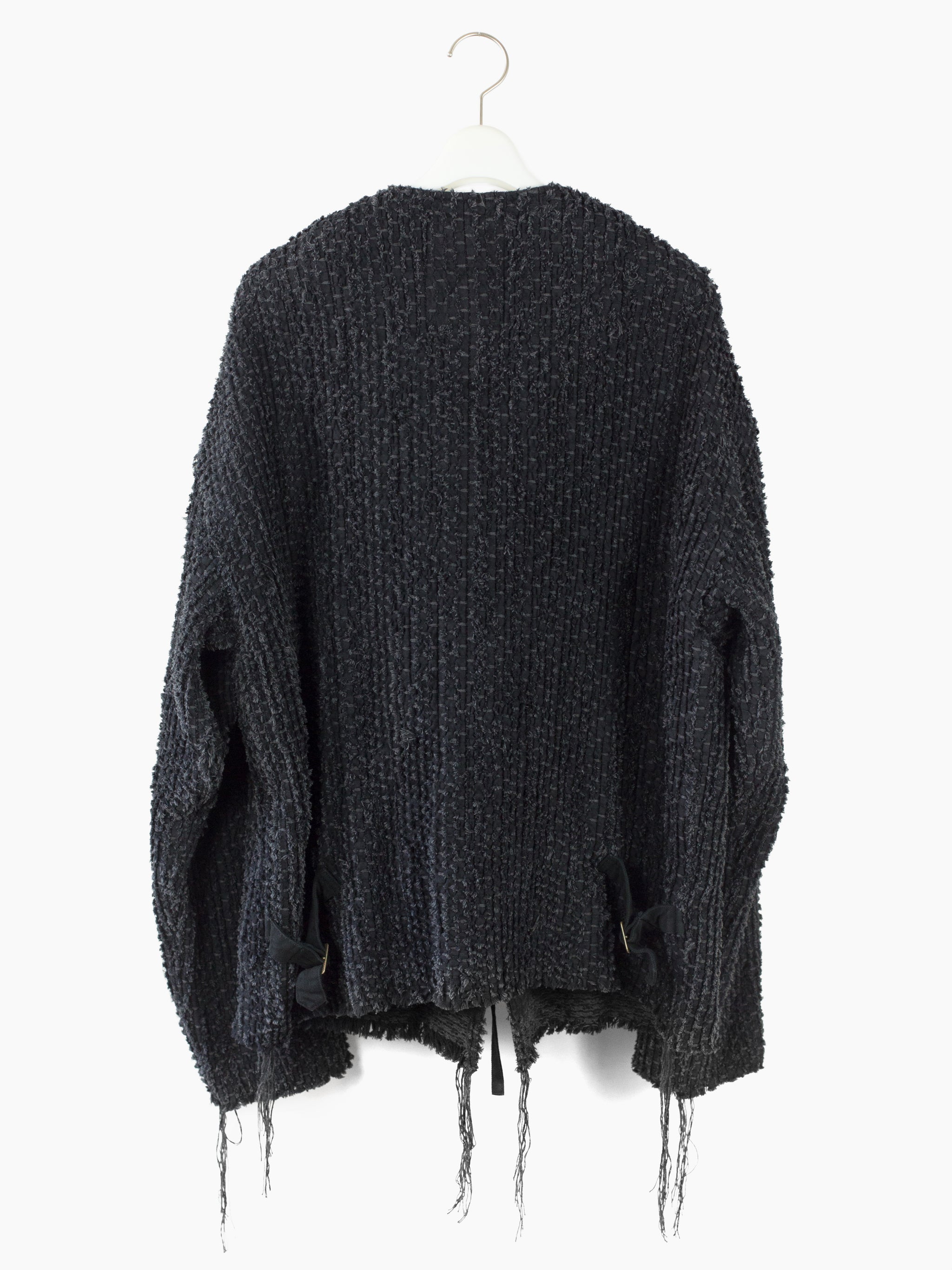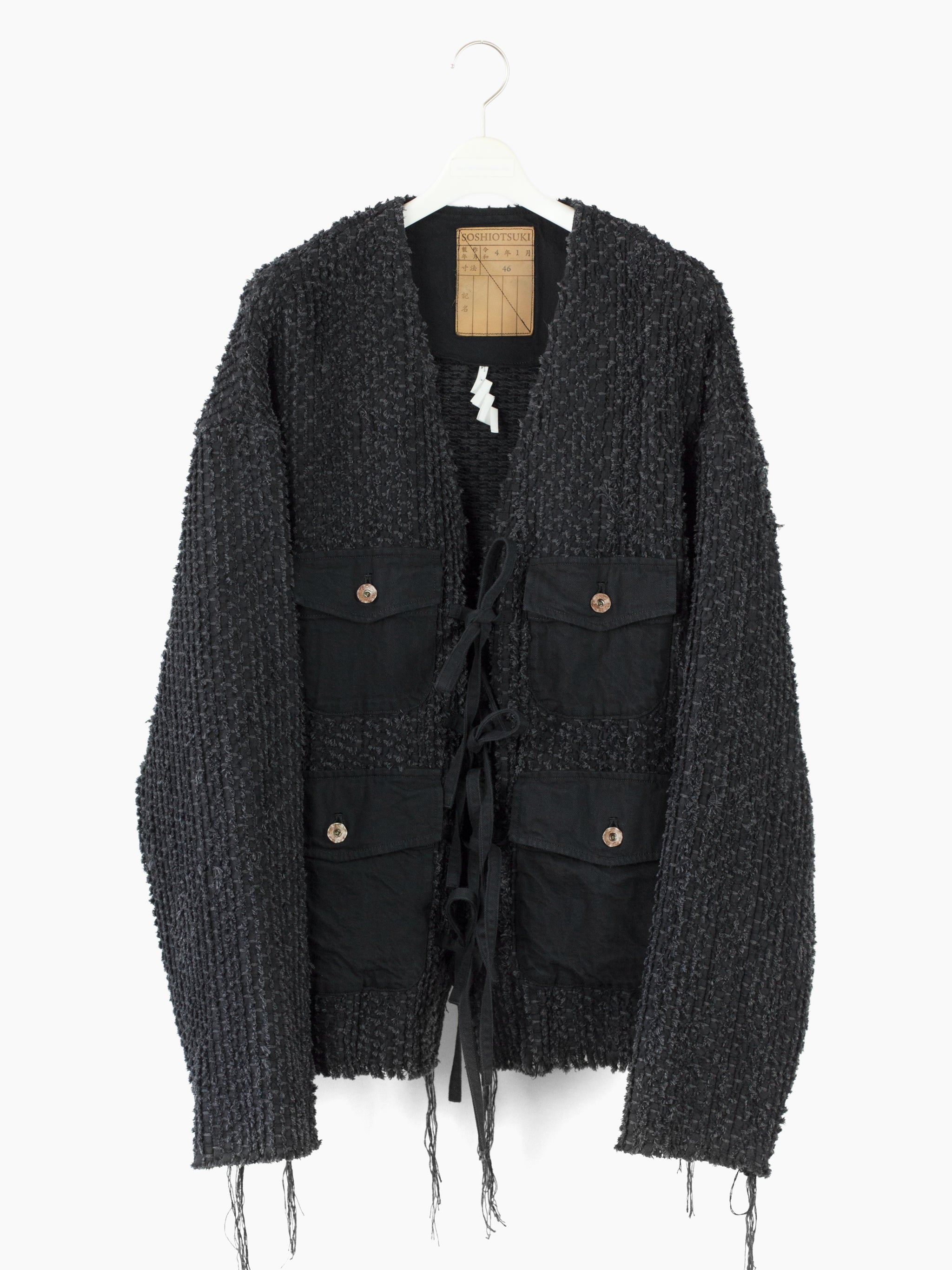 Here it's cut into an oversized cargo cardigan with four flap-closed pockets in black denim and tied front closure. Sleeves and hem are left raw to fray and show age as the garment is worn. Finished with aged hammered shank closures at the pockets and black denim facing around neck and front for structure. Has two back waist adjusters in black denim.