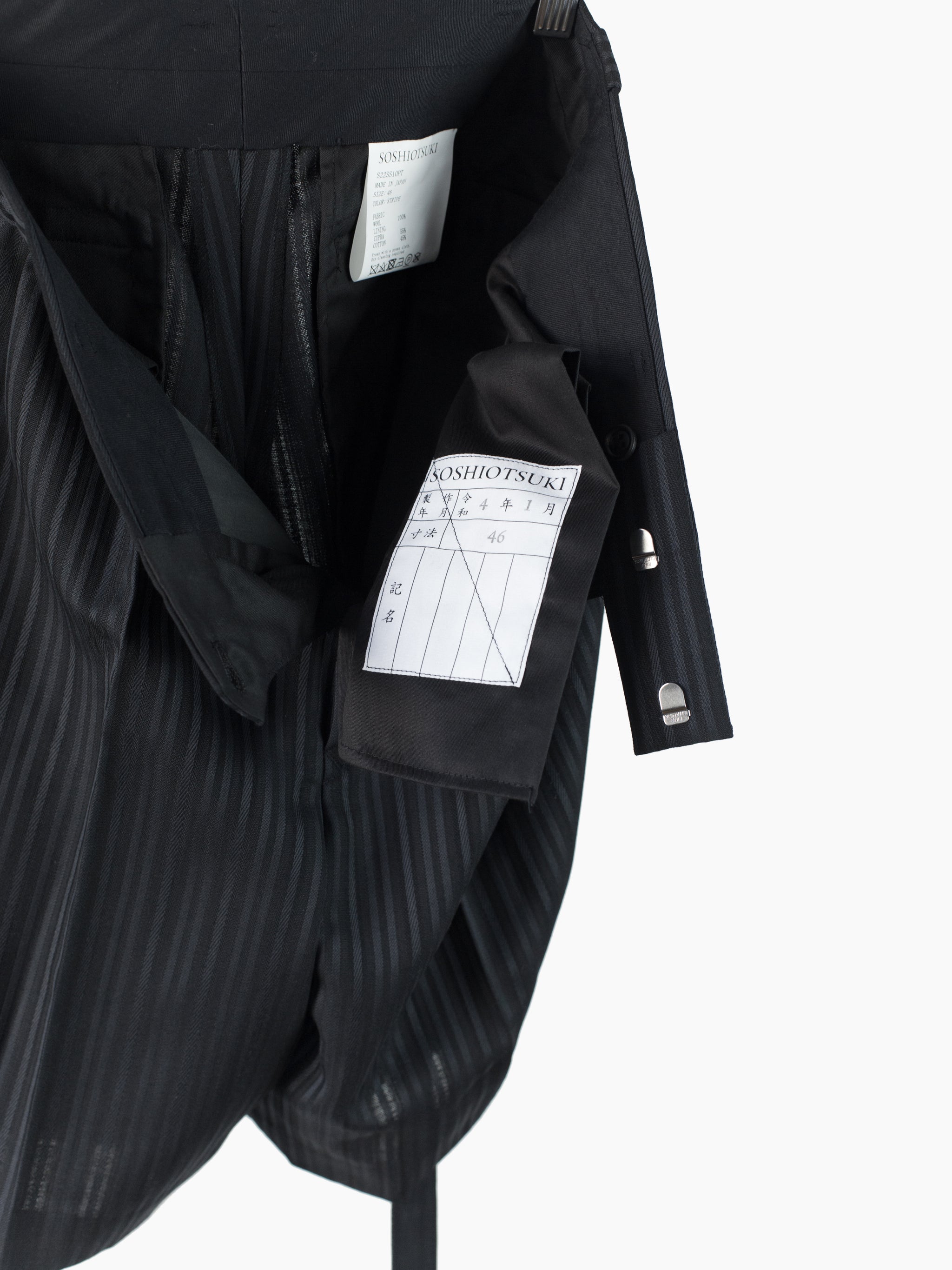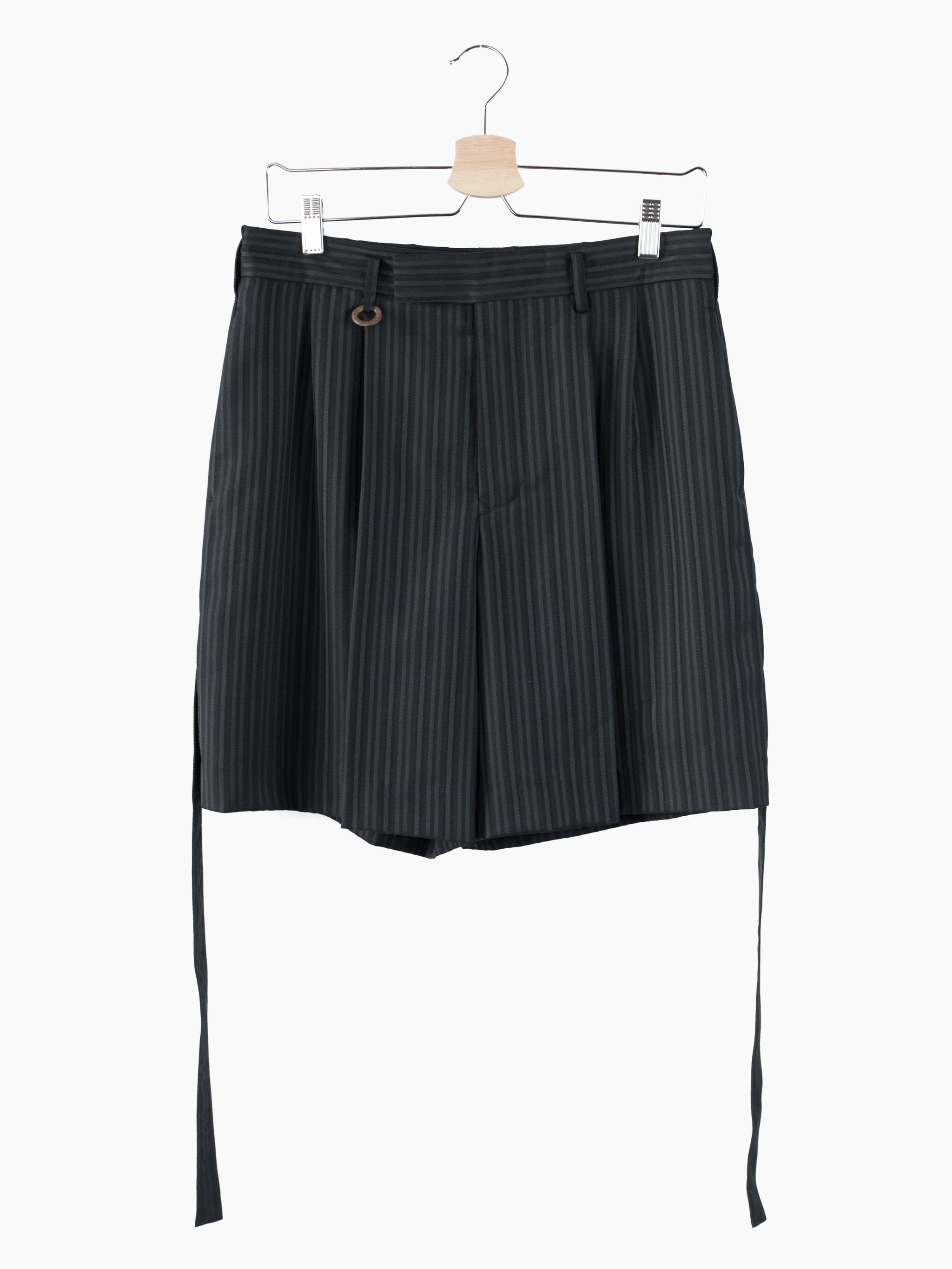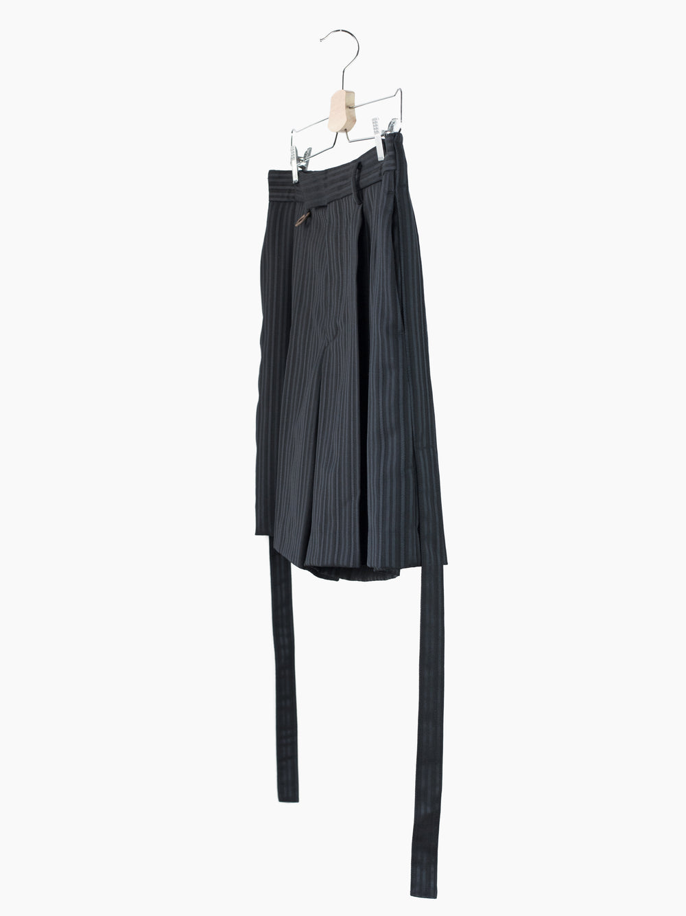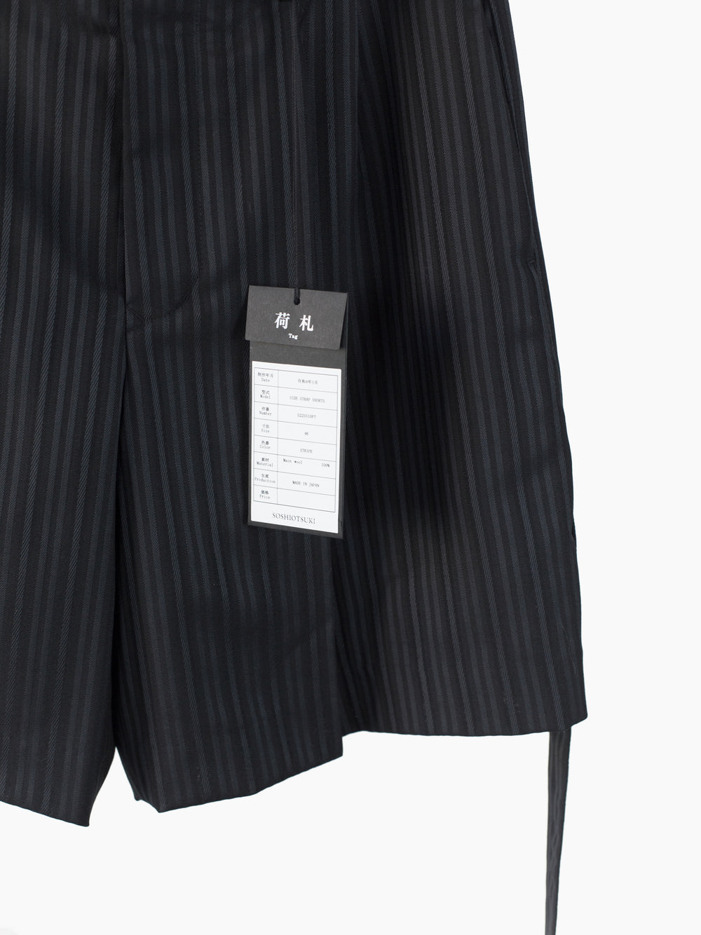 This unique striped wool's pattern is developed by removing warp yarns in specific places, creating areas that are more open. It lets the fabric retain the formal and luxurious hand of a suiting wool twill while letting it breathe in warmer weather. Here it's used in Soshiotsuki's side strap shorts, a doubled pleated short with fully tailored waistband and finishings, a piece that wears like a suit trouser in the seat and looks almost like a skirt with its voluminous pleated legs. It challenges notions of traditional formality. Extended straps at the sides combine tuxedo and bondage and sit elegantly adjacent to the slash pocket openings.