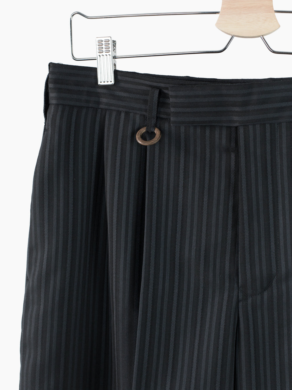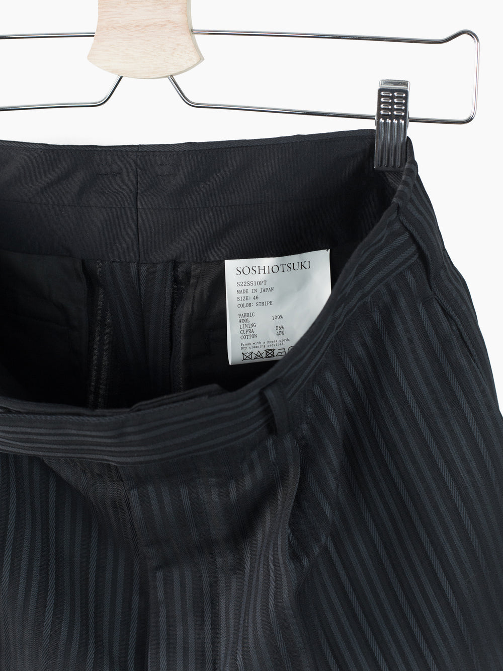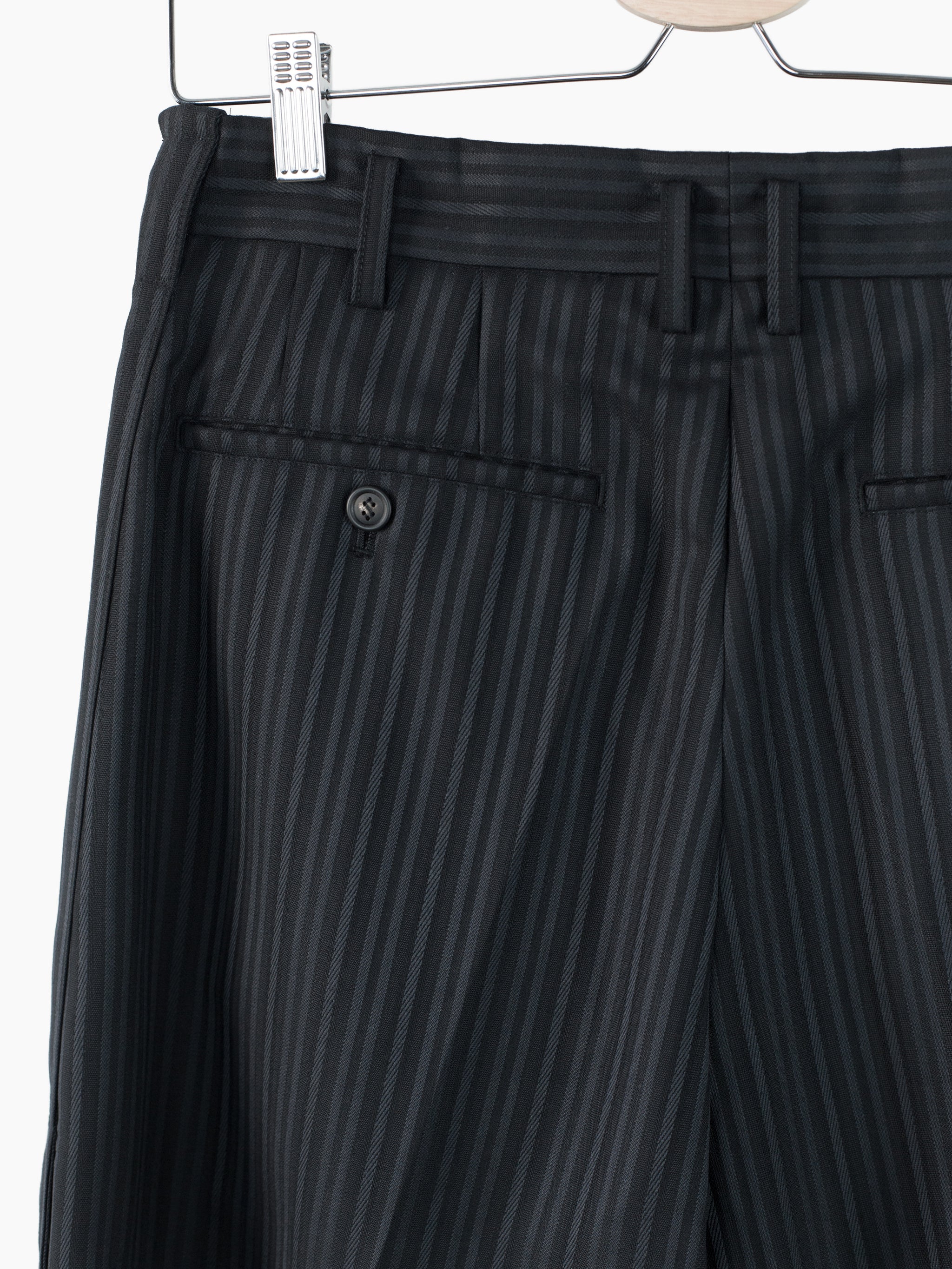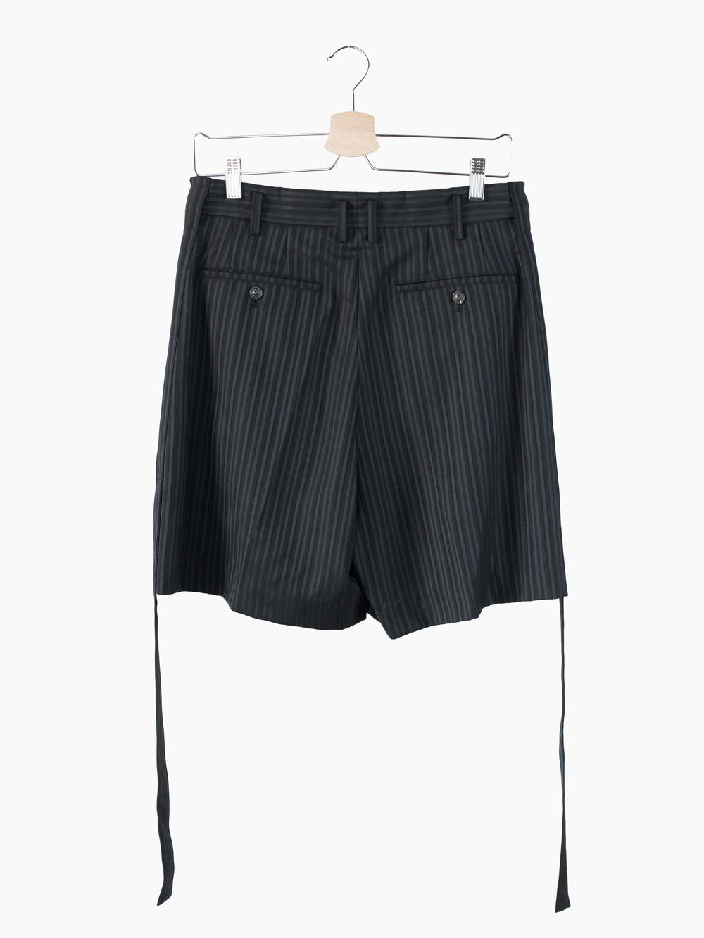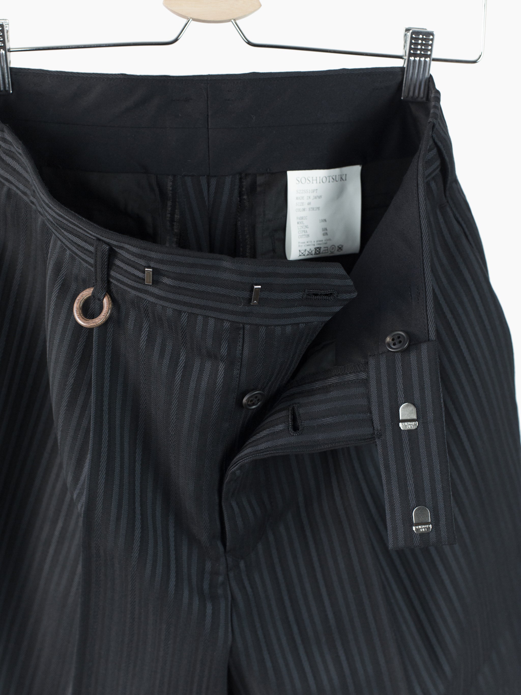 This unique striped wool's pattern is developed by removing warp yarns in specific places, creating areas that are more open. It lets the fabric retain the formal and luxurious hand of a suiting wool twill while letting it breathe in warmer weather. Here it's used in Soshiotsuki's side strap shorts, a doubled pleated short with fully tailored waistband and finishings, a piece that wears like a suit trouser in the seat and looks almost like a skirt with its voluminous pleated legs. It challenges notions of traditional formality. Extended straps at the sides combine tuxedo and bondage and sit elegantly adjacent to the slash pocket openings.