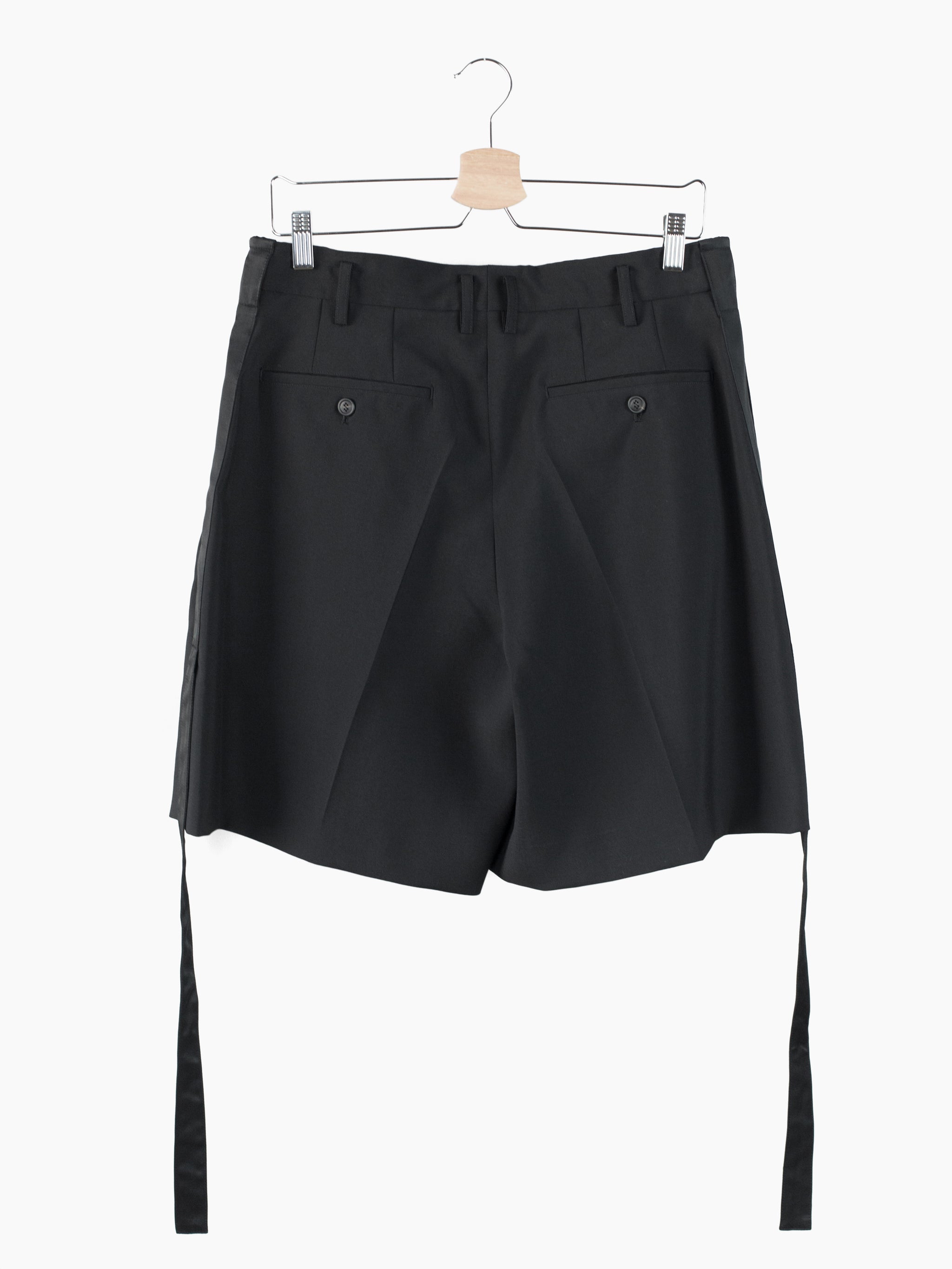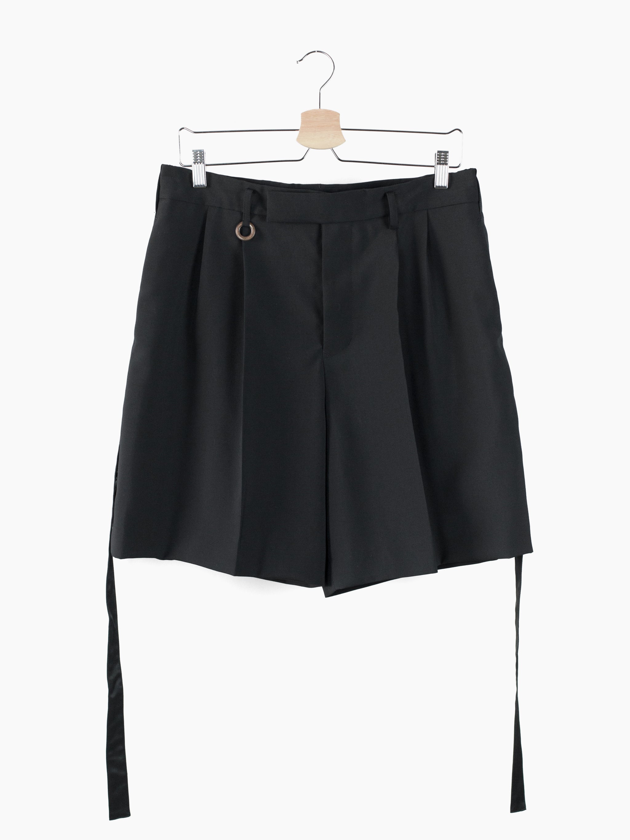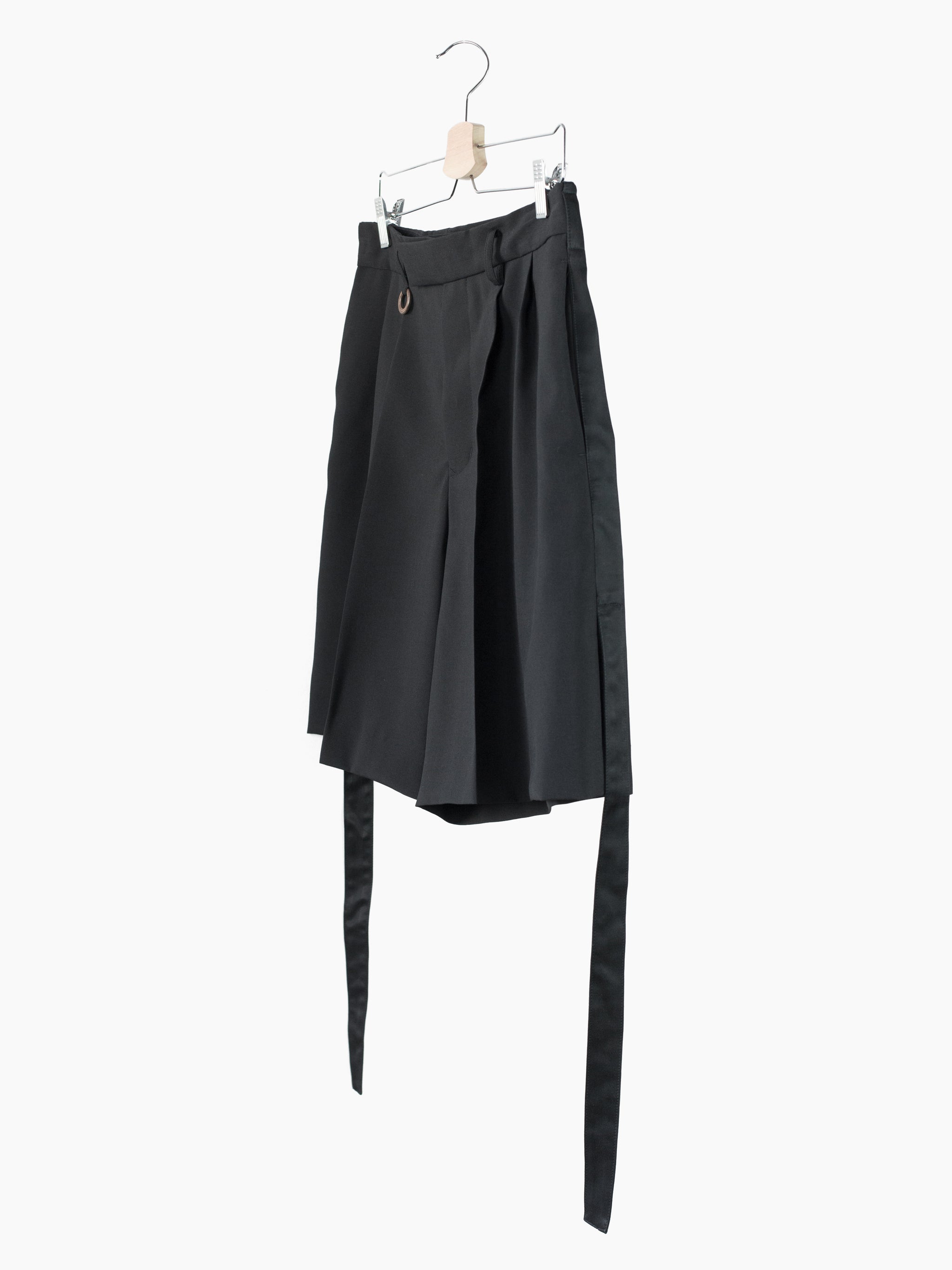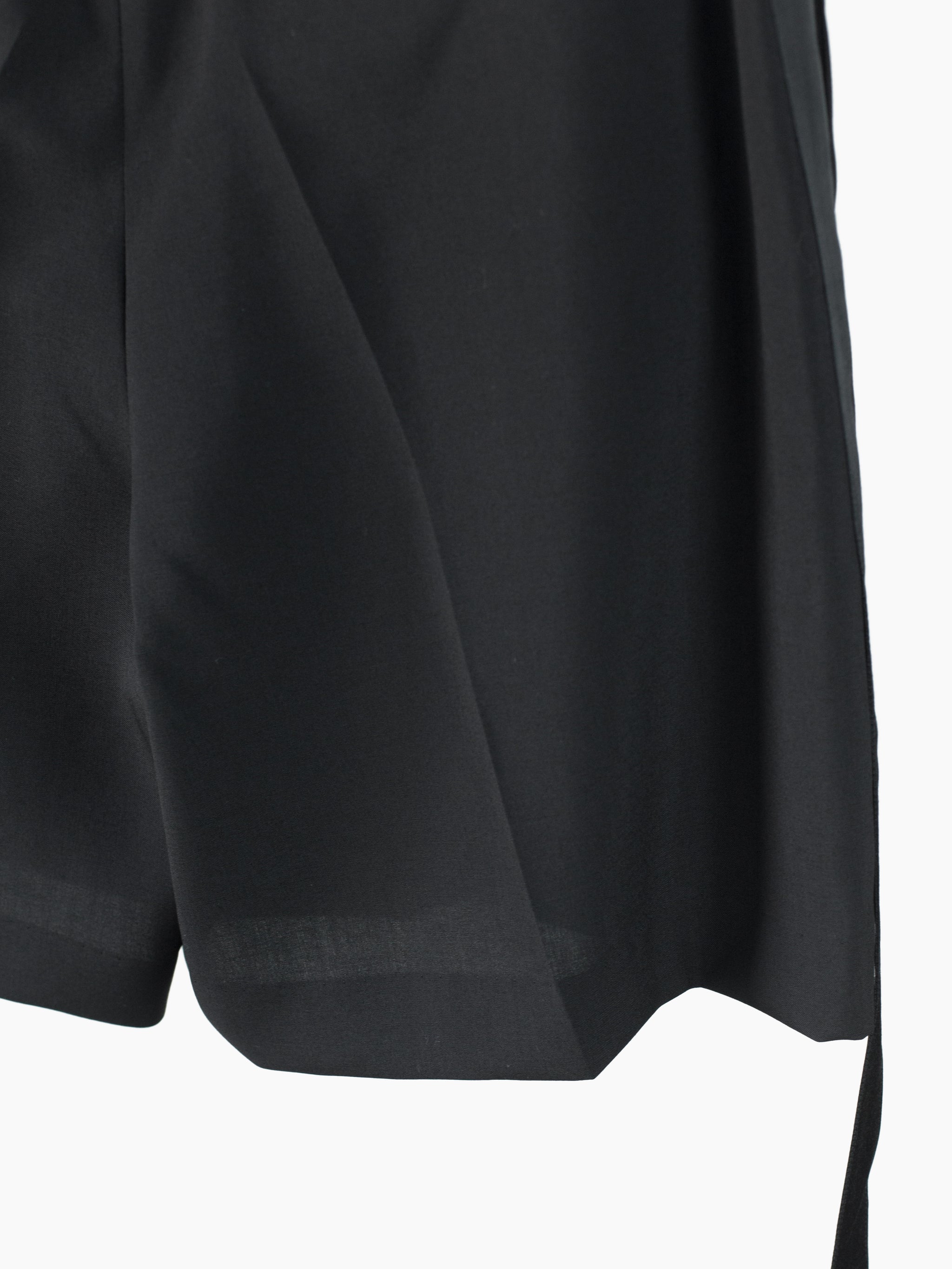 This tropical wool is a suiting wool that's been resin-treated to give it a crisp, paper-like structure and maintain a remarkably open weave for increased airflow in warmer weather. Here it's used in Soshiotsuki's side strap shorts, a doubled pleated short with fully tailored waistband and finishings, a piece that wears like a suit trouser in the seat and looks almost like a skirt with its voluminous pleated legs. It challenges notions of traditional formality. Extended straps at the sides cut in contrast satin cupro combine tuxedo and bondage and sit elegantly adjacent to the slash pocket openings.