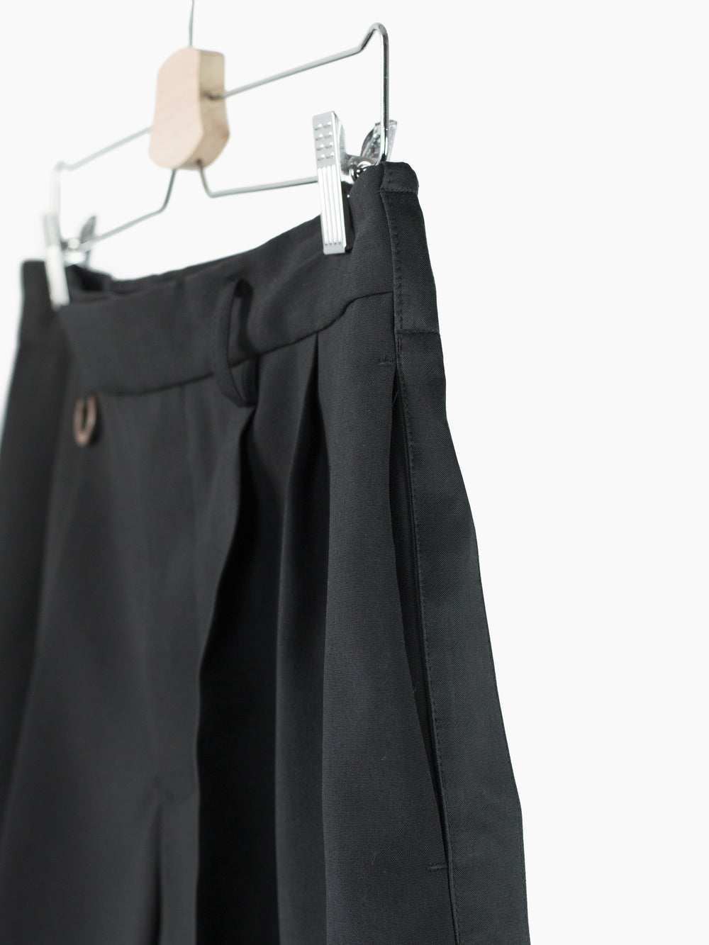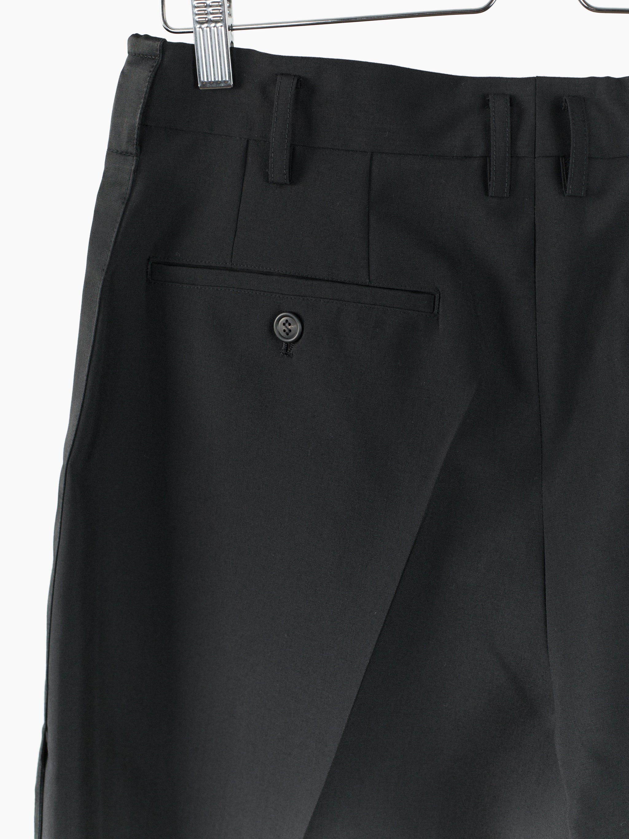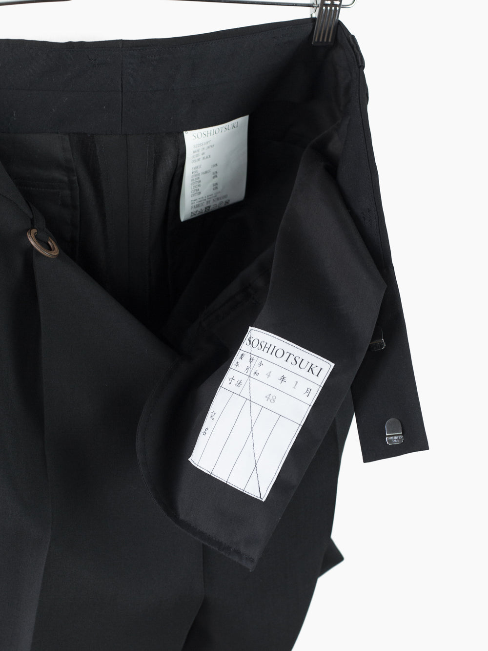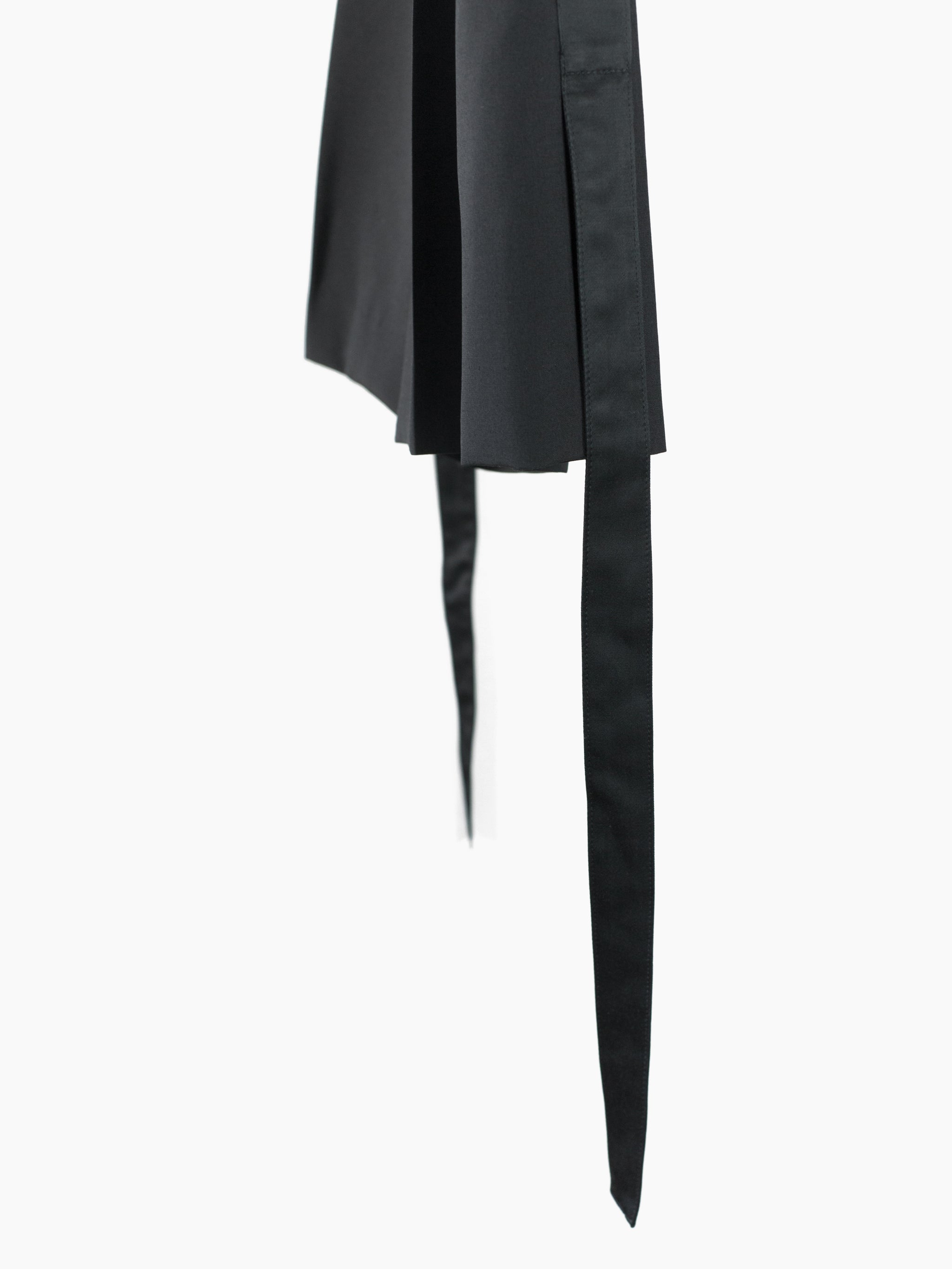 This tropical wool is a suiting wool that's been resin-treated to give it a crisp, paper-like structure and maintain a remarkably open weave for increased airflow in warmer weather. Here it's used in Soshiotsuki's side strap shorts, a doubled pleated short with fully tailored waistband and finishings, a piece that wears like a suit trouser in the seat and looks almost like a skirt with its voluminous pleated legs. It challenges notions of traditional formality. Extended straps at the sides cut in contrast satin cupro combine tuxedo and bondage and sit elegantly adjacent to the slash pocket openings.