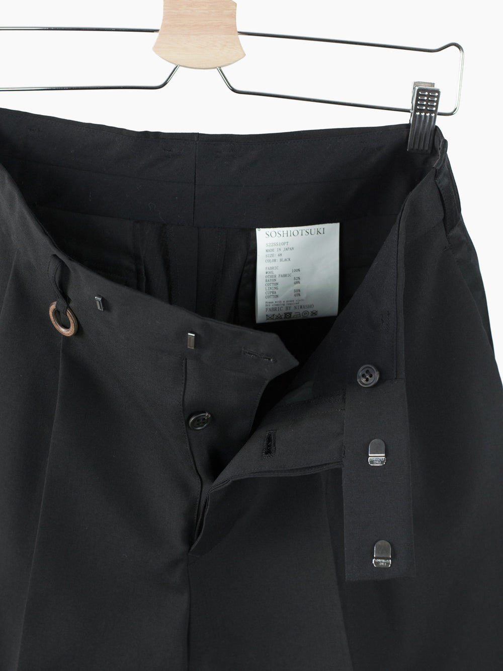 Finished with double hook and bar waist closure with additional internal waist button or an incredibly clean look that stays put. Button fly. Back welt pockets with signature "S" threading on the buttons.