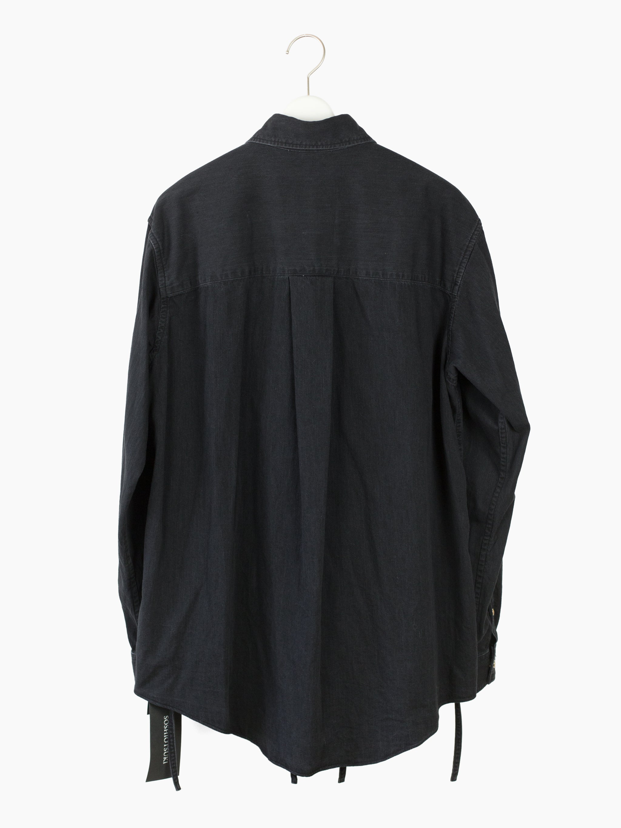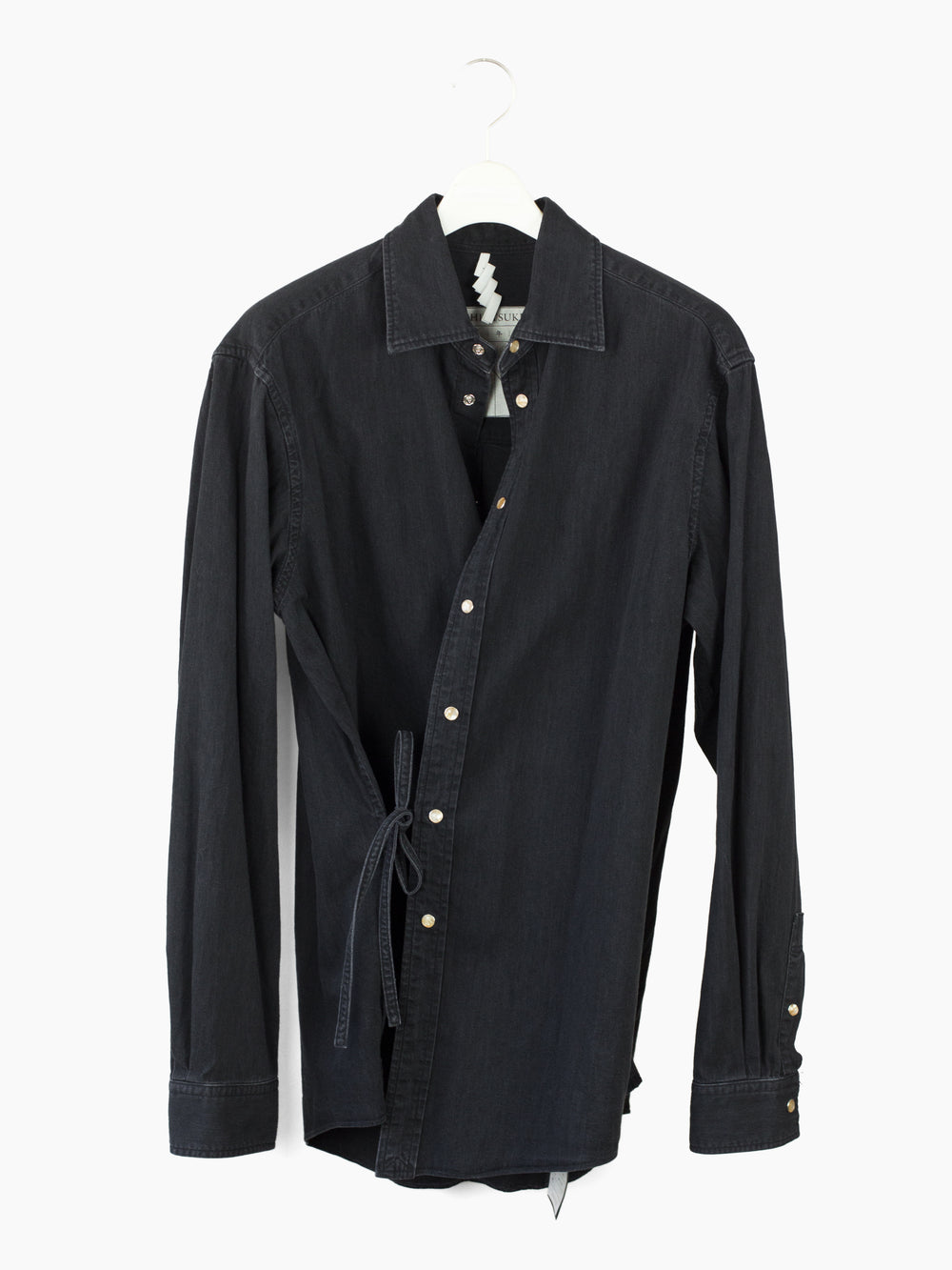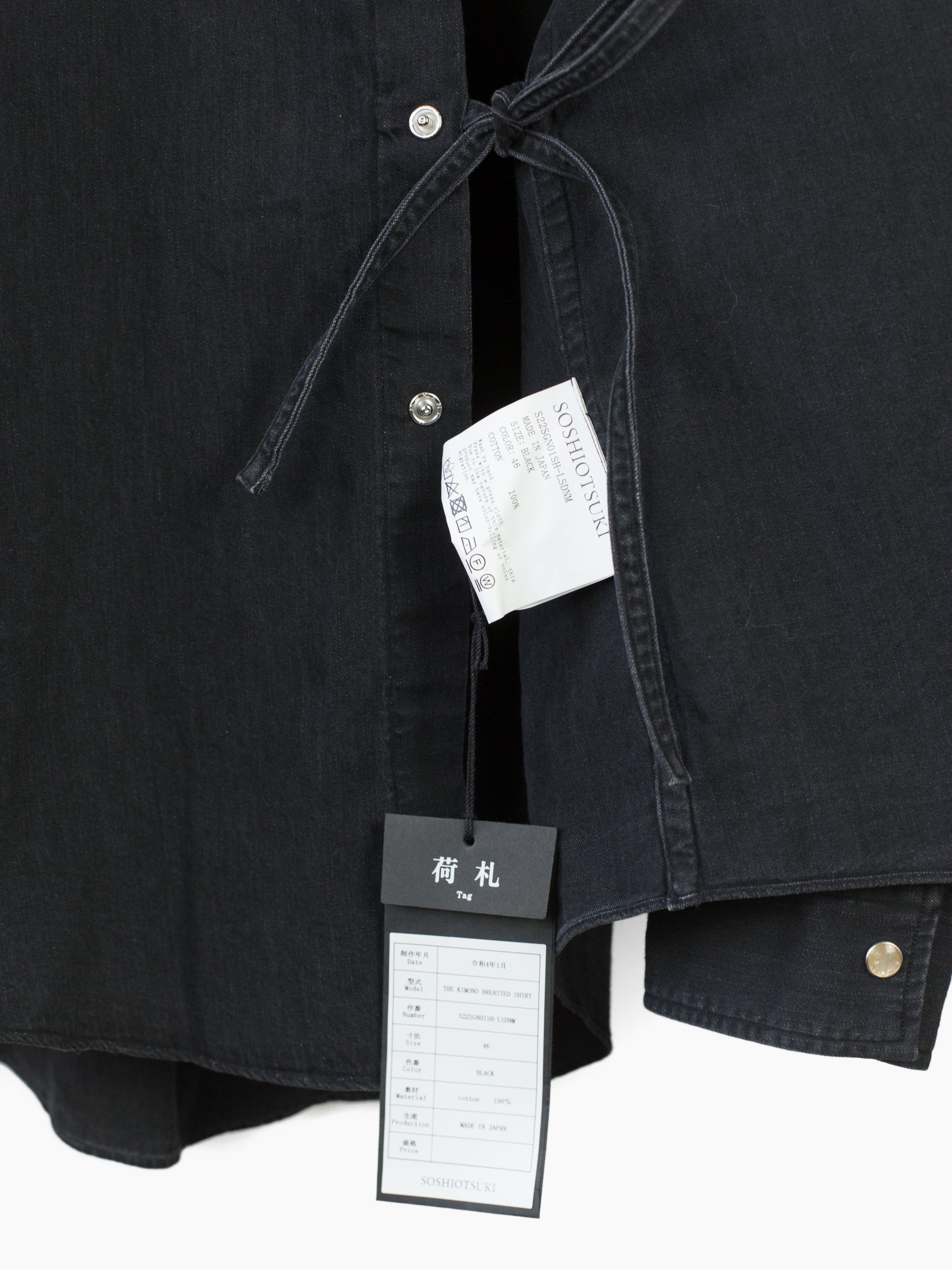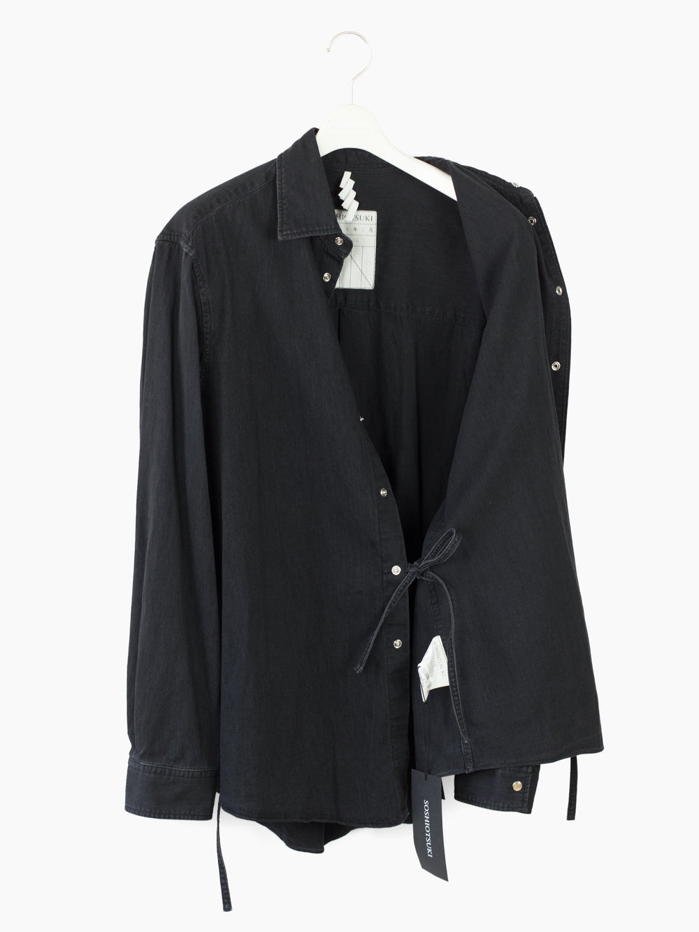 Soshiotsuki's signature Kimono-breasted shirt, this season cut in a worn-in lightweight 6oz denim, featuring two different front closures: a pearl snap center front closure and wrapover kimono closure with alternating inside-outside string ties at both sides. The ties open up multiple ways of wearing--half-open or fully wrapped up, there are a wealth of possibilities.
