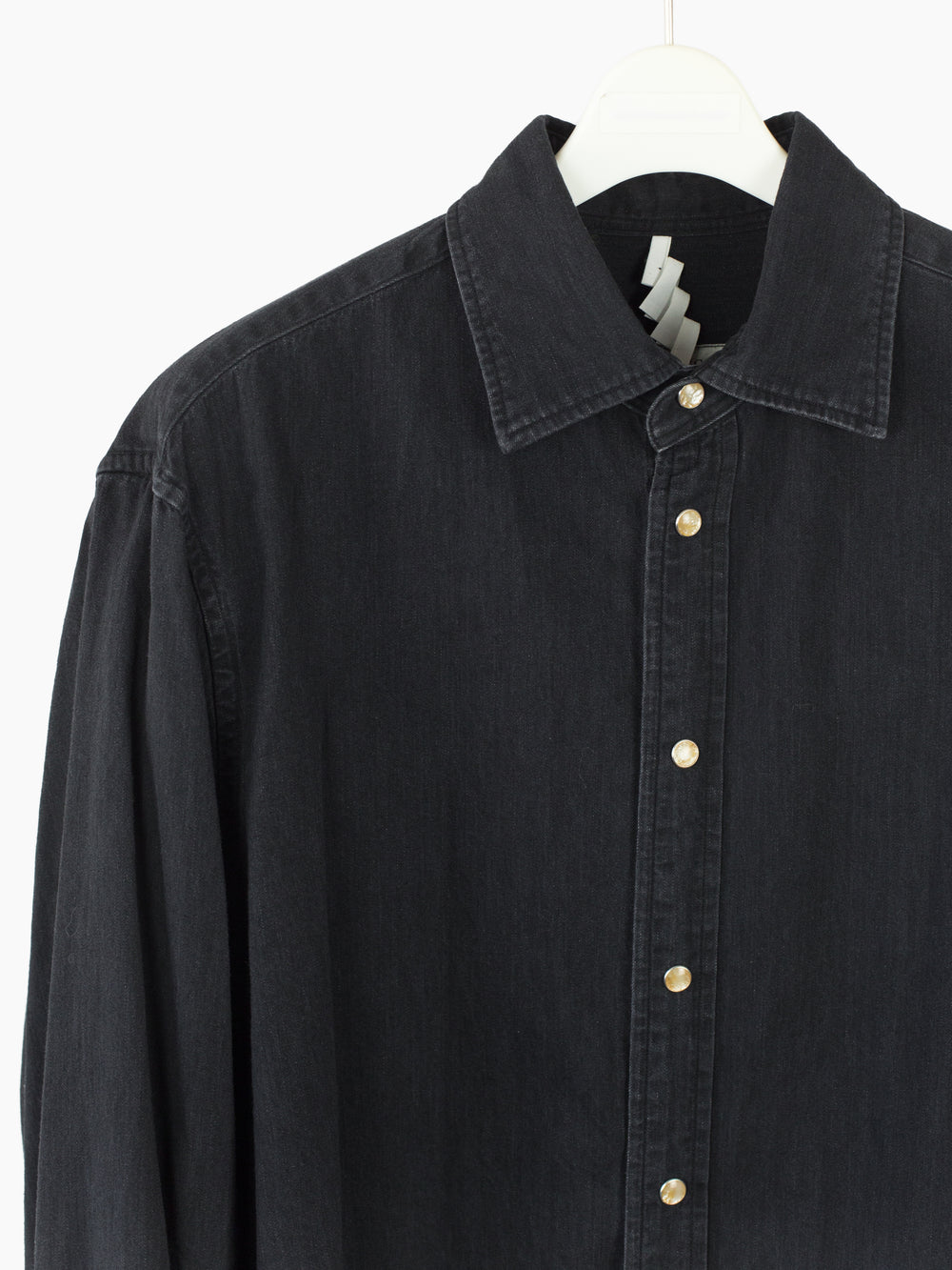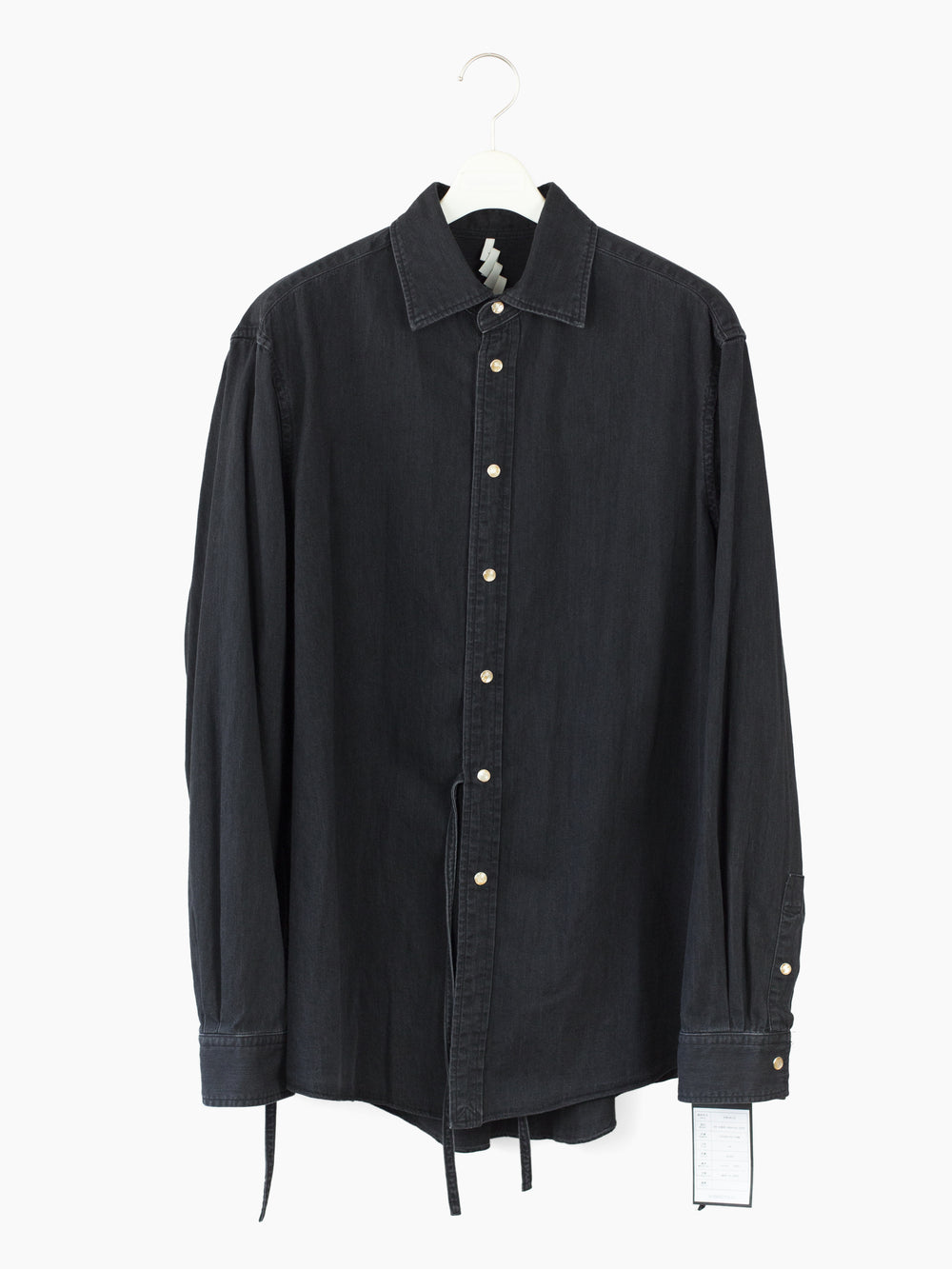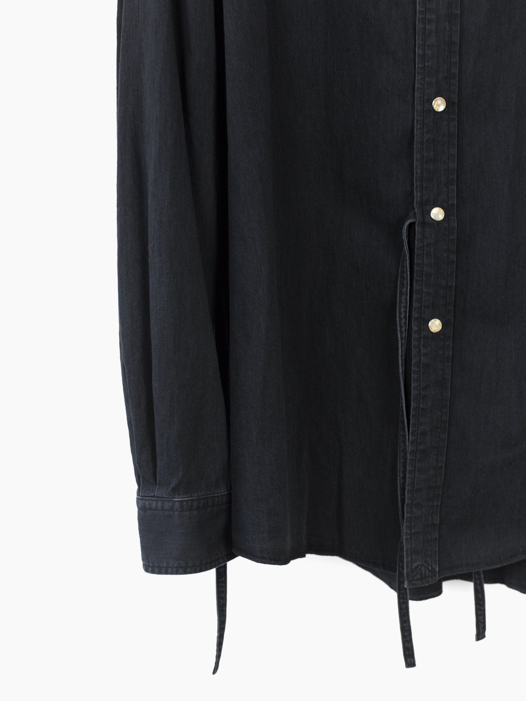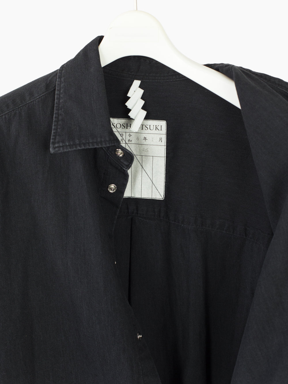 Soshiotsuki's signature Kimono-breasted shirt, this season cut in a worn-in lightweight 6oz denim, featuring two different front closures: a pearl snap center front closure and wrapover kimono closure with alternating inside-outside string ties at both sides. The ties open up multiple ways of wearing--half-open or fully wrapped up, there are a wealth of possibilities.