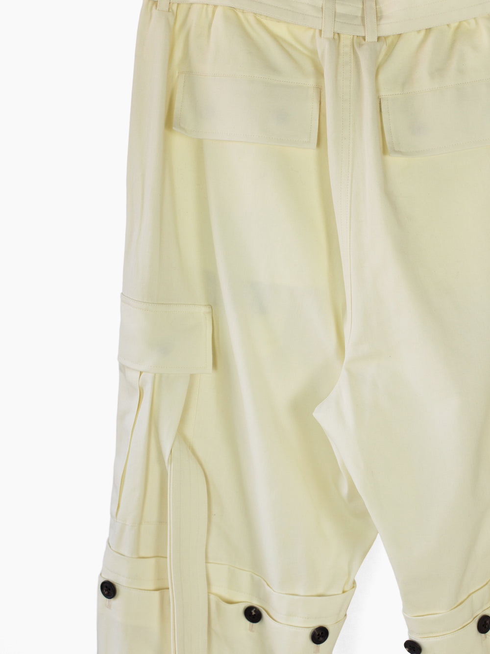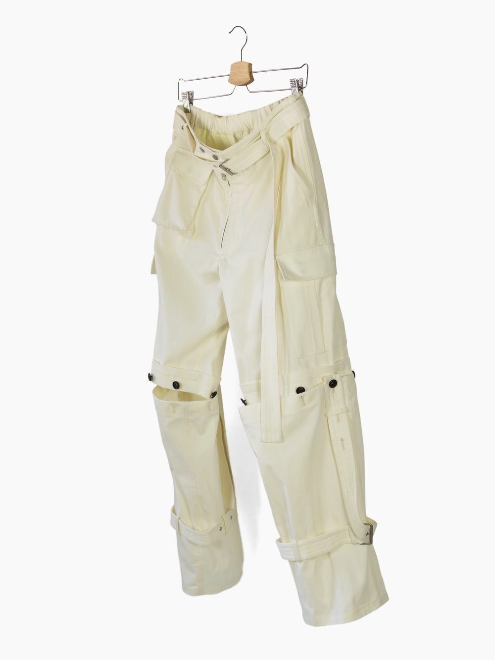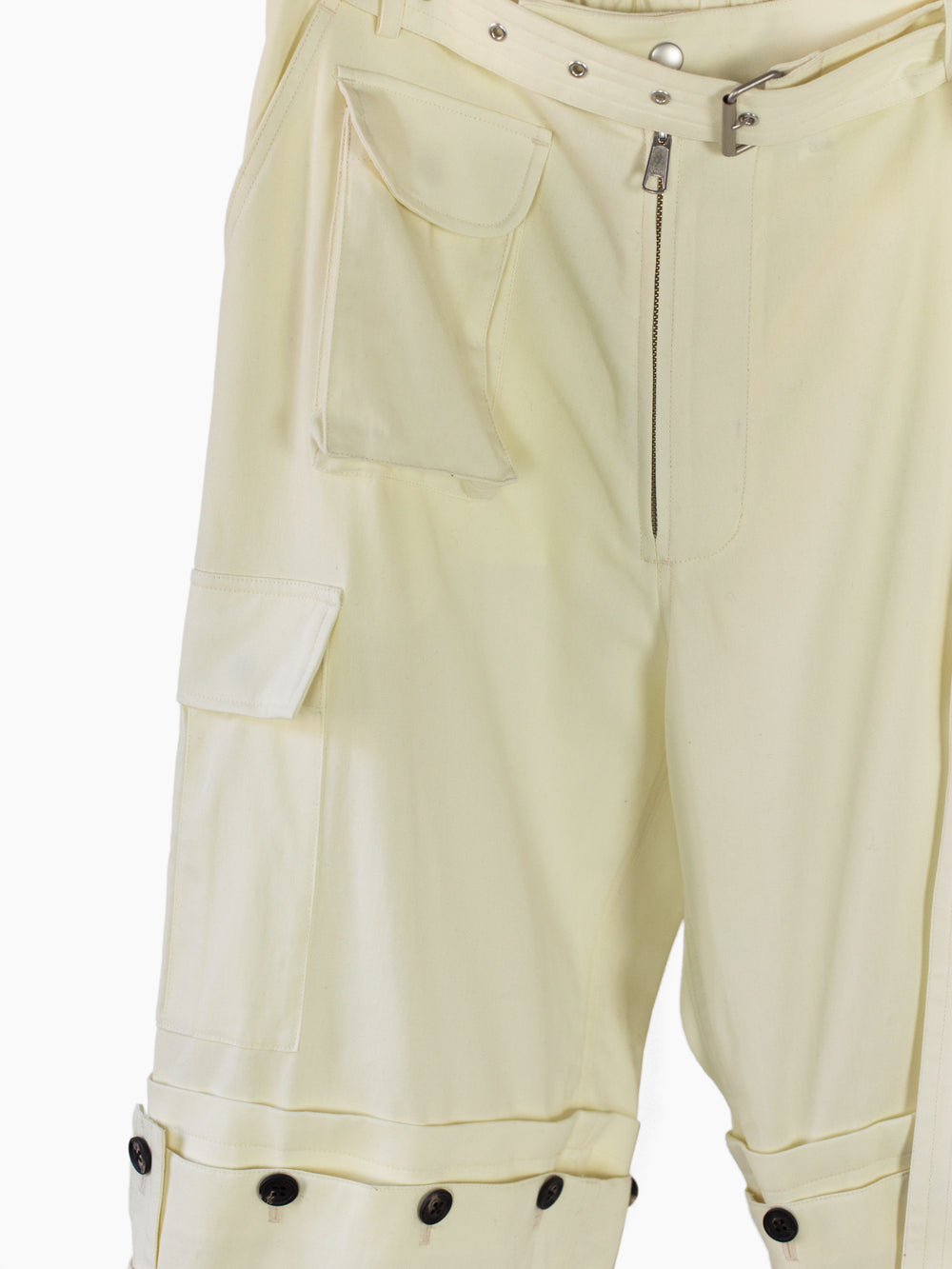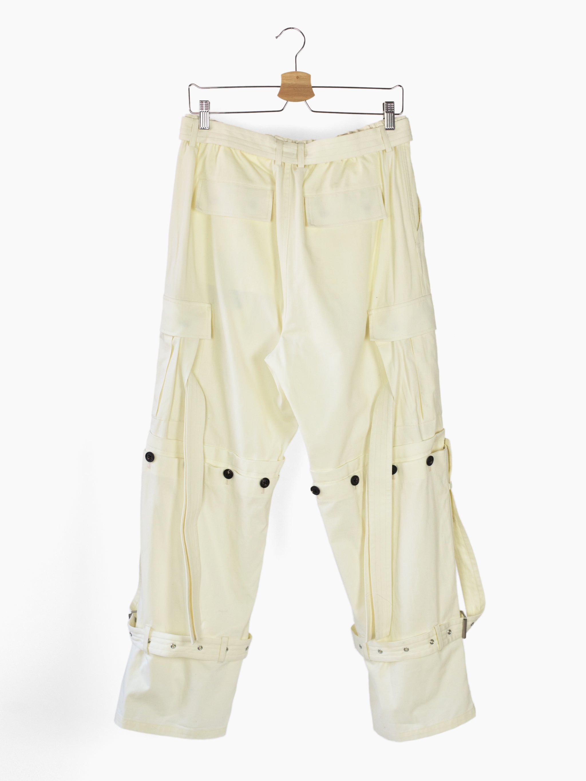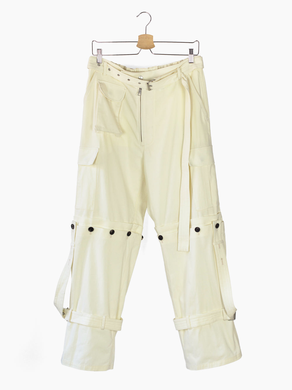 Bondage cargo pants in off-white cotton twill, featuring fully button-detachable lower leg and removable self-fabric belts at waist and calf. Pleated cargo pockets at sides of leg are cut with paratrooper straps that can be tied around the thigh to secure load. Finished with exposed zipper fly, snap-closed back flap pockets, and partially elasticated waist.