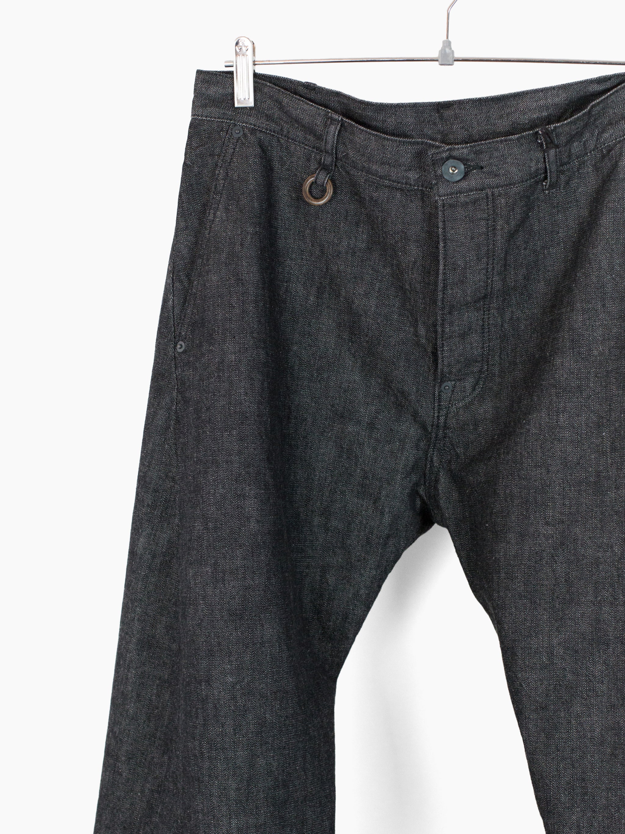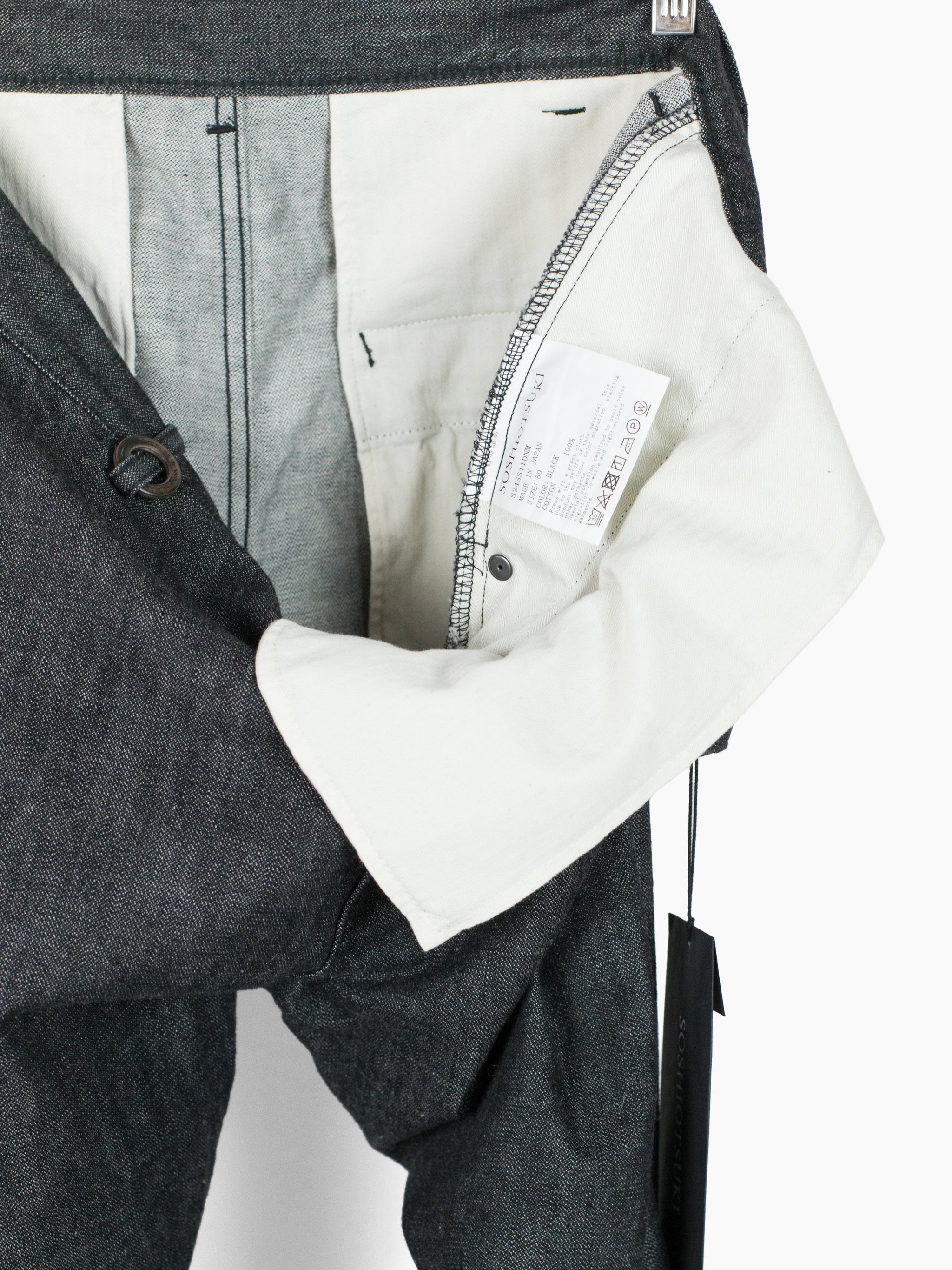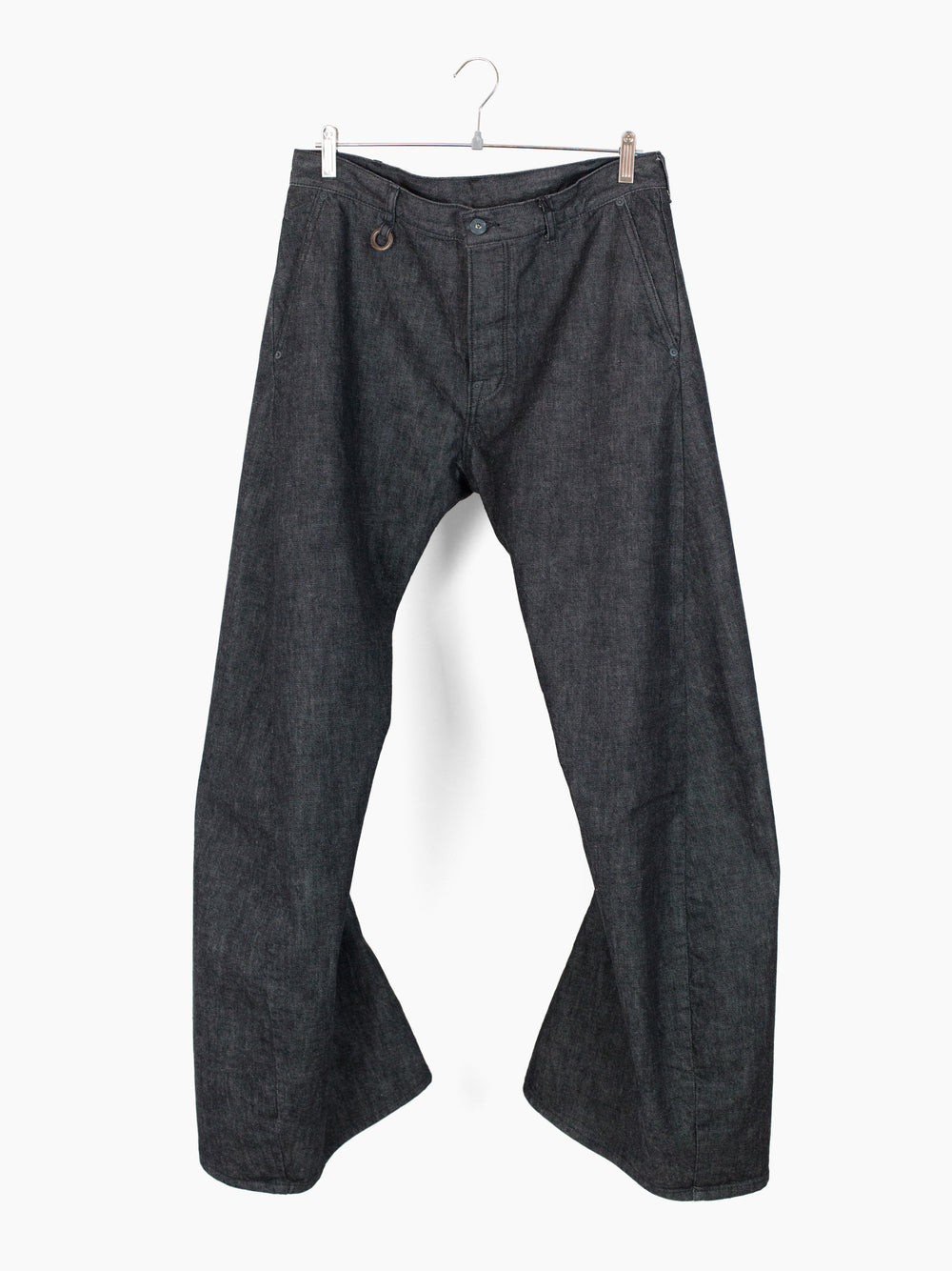 3D cut twisted leg jeans in midweight soft broken twill denim. They fit roomy down the leg with an off-body sculptural shape and pre-bent knees for a dynamic silhouette in motion. Slash side pockets and welt back pockets create a more formal air. Features Soshiotsuki signature antique-styled hardware including hammered shanks and wooden key ring. Leather back patch is shifted below wearer's left back pocket.