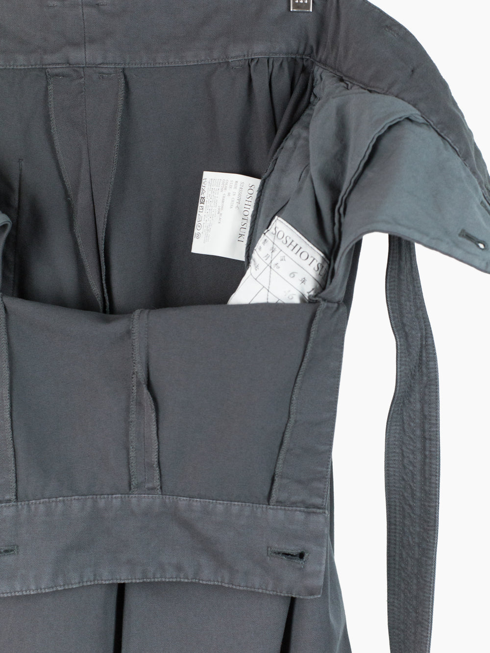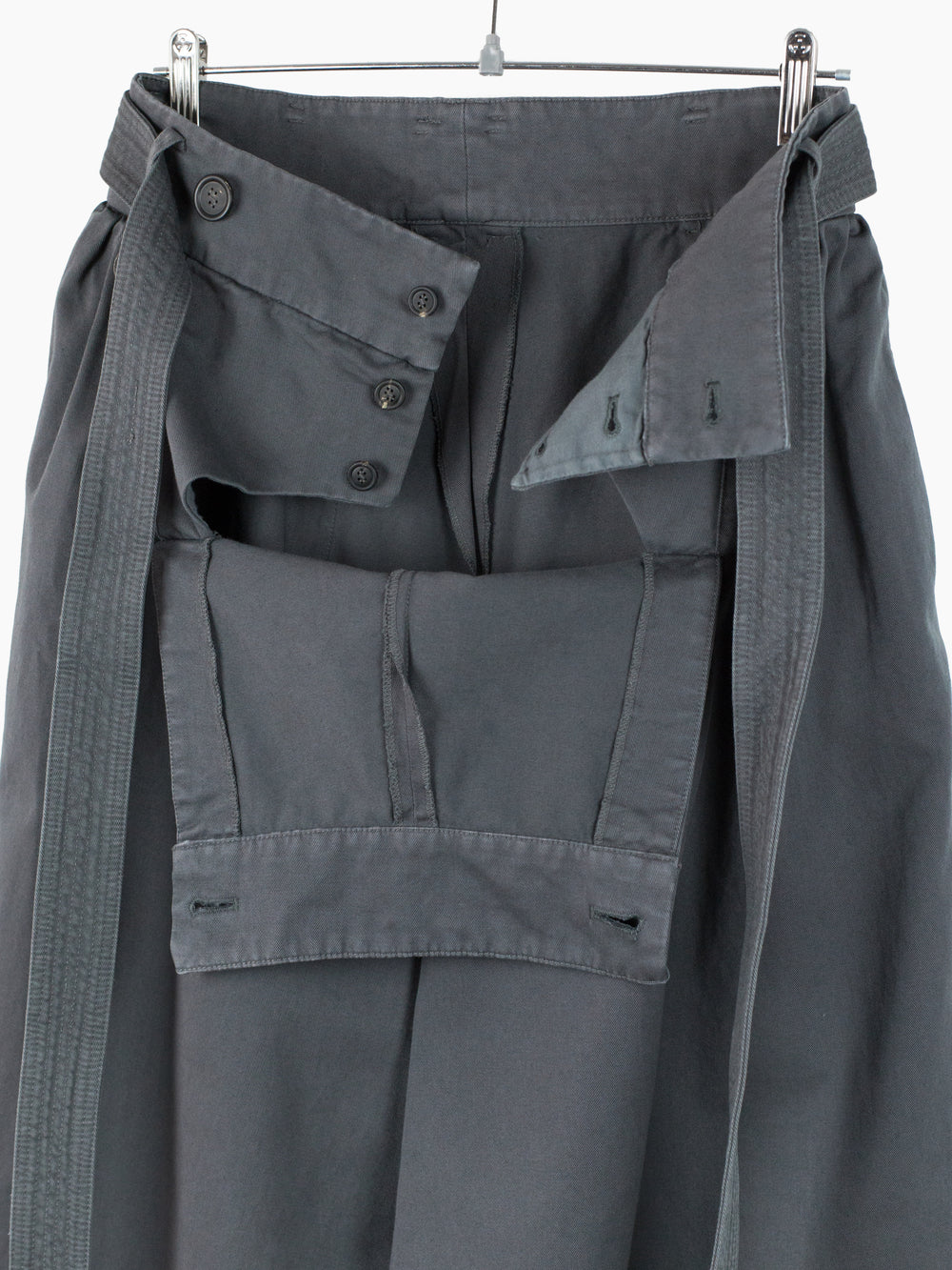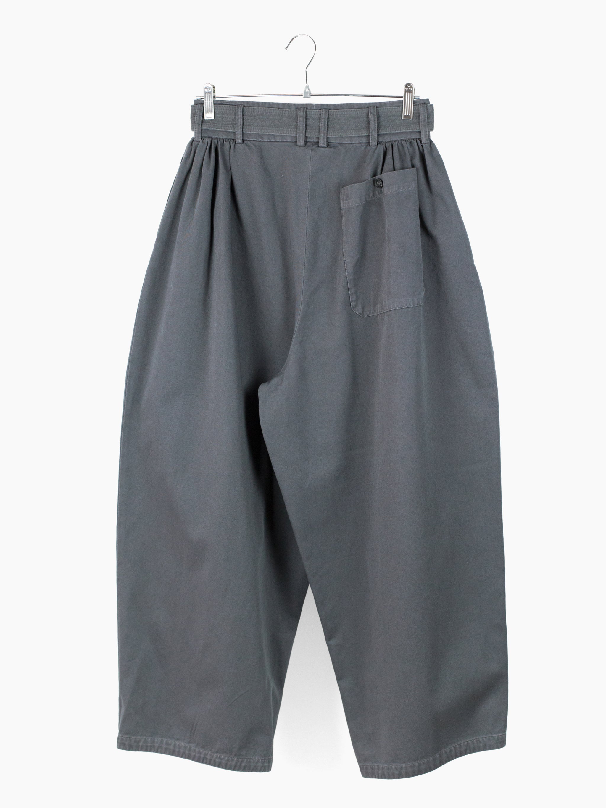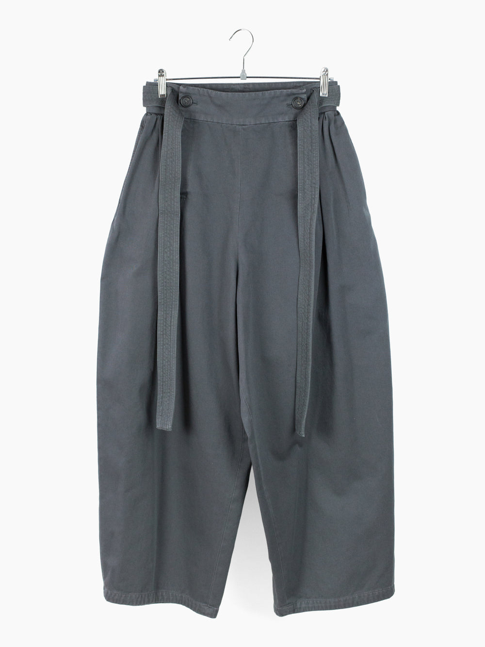 Baggy balloon work pant in garment washed gray cotton drill. Sailor style fold down layered front closure with extralong judo-style self fabric belt. Gathered pleats at the hips create a dramatic baggy shape throughout. Finished with side seam pockets and single back patch pocket at wearer's right.
