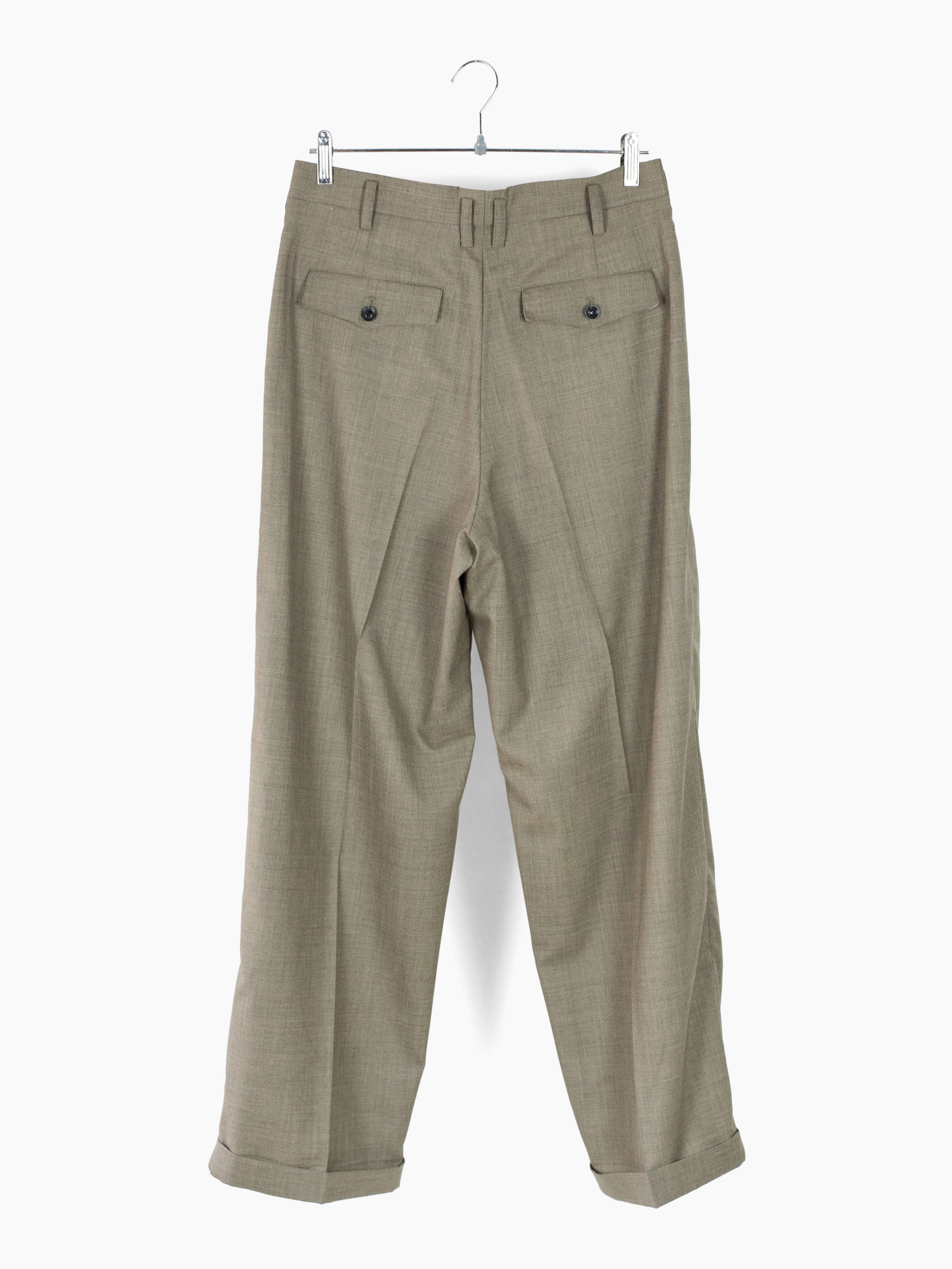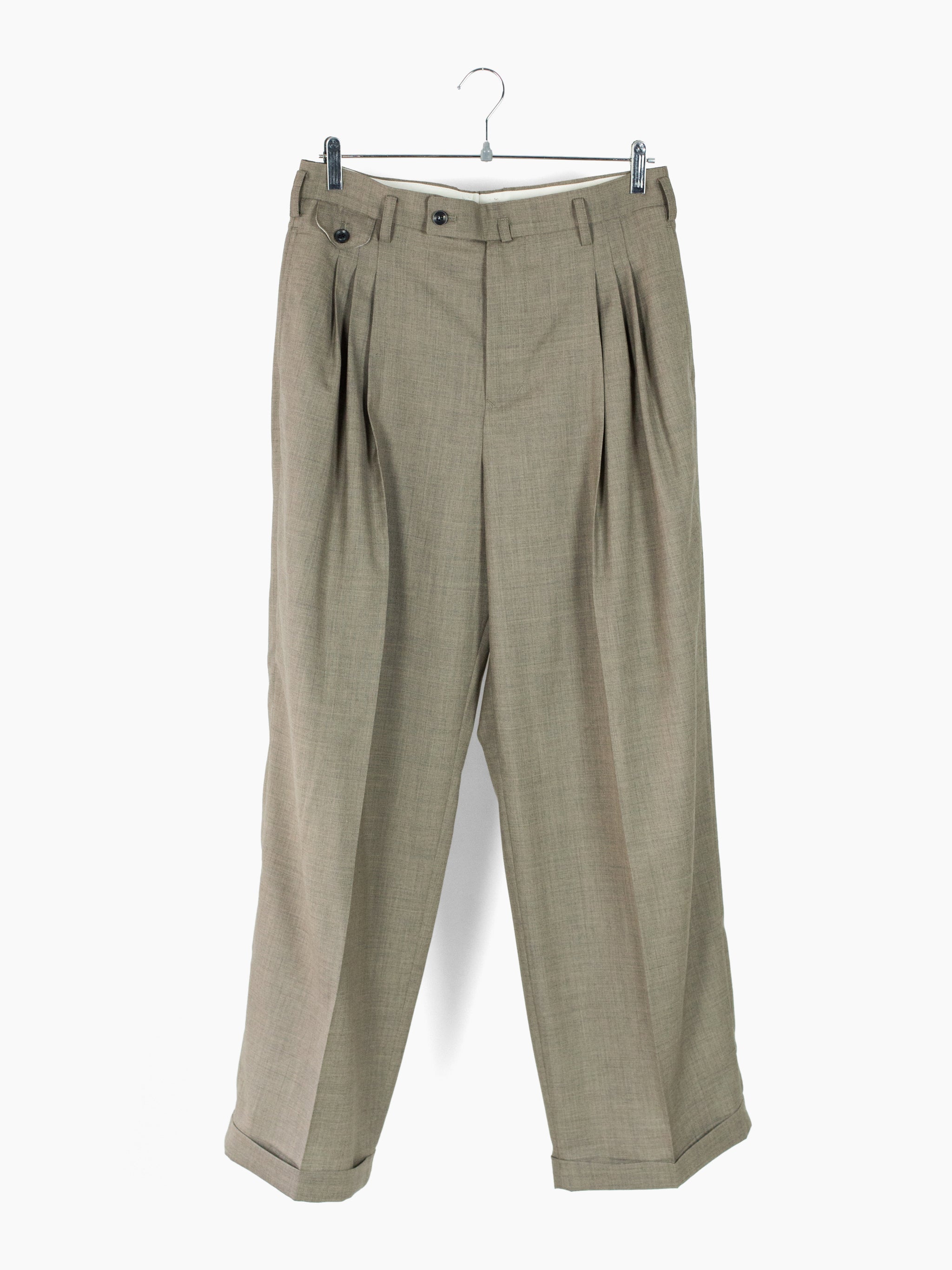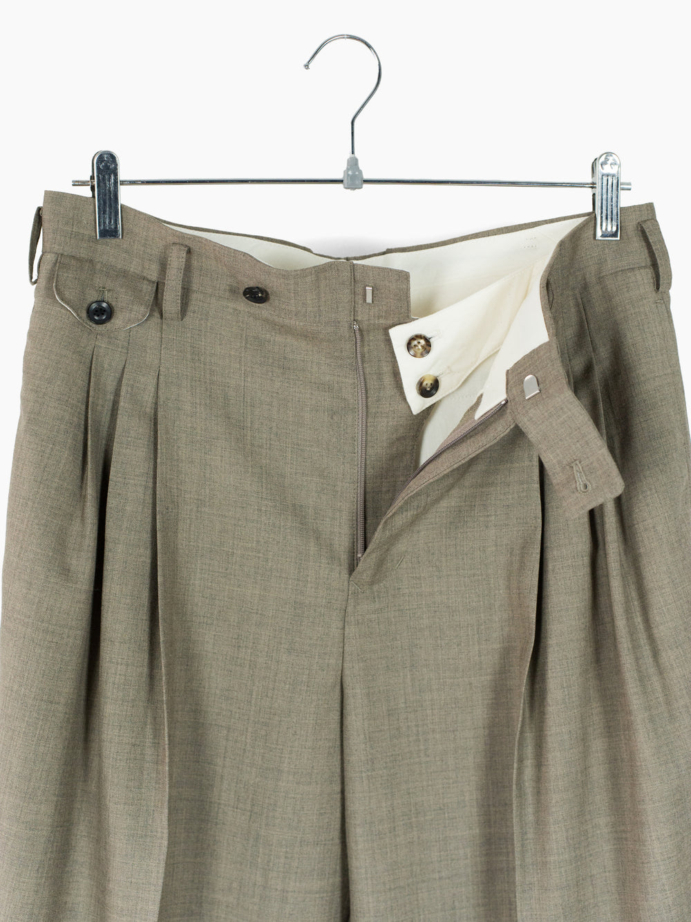 Triple pleated suit trousers in summer weight tropical wool, with flap-closed coin pocket at wearer's right hip and layered internal waist button flap inspired by early 1900s French militaria. This allows for the trouser to be worn semi-open, subverting the formality of a tailored garment. Slightly dropped belt loops, two slash side pockets and two flap-closed back welt pockets. Signature figure 'S'-sewn buttons. Dual button + hook and bar waist closure.