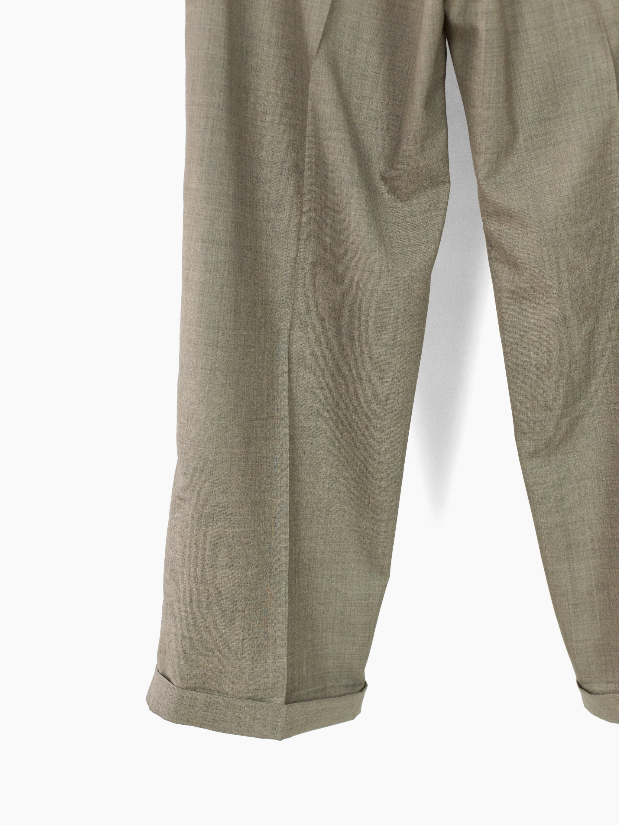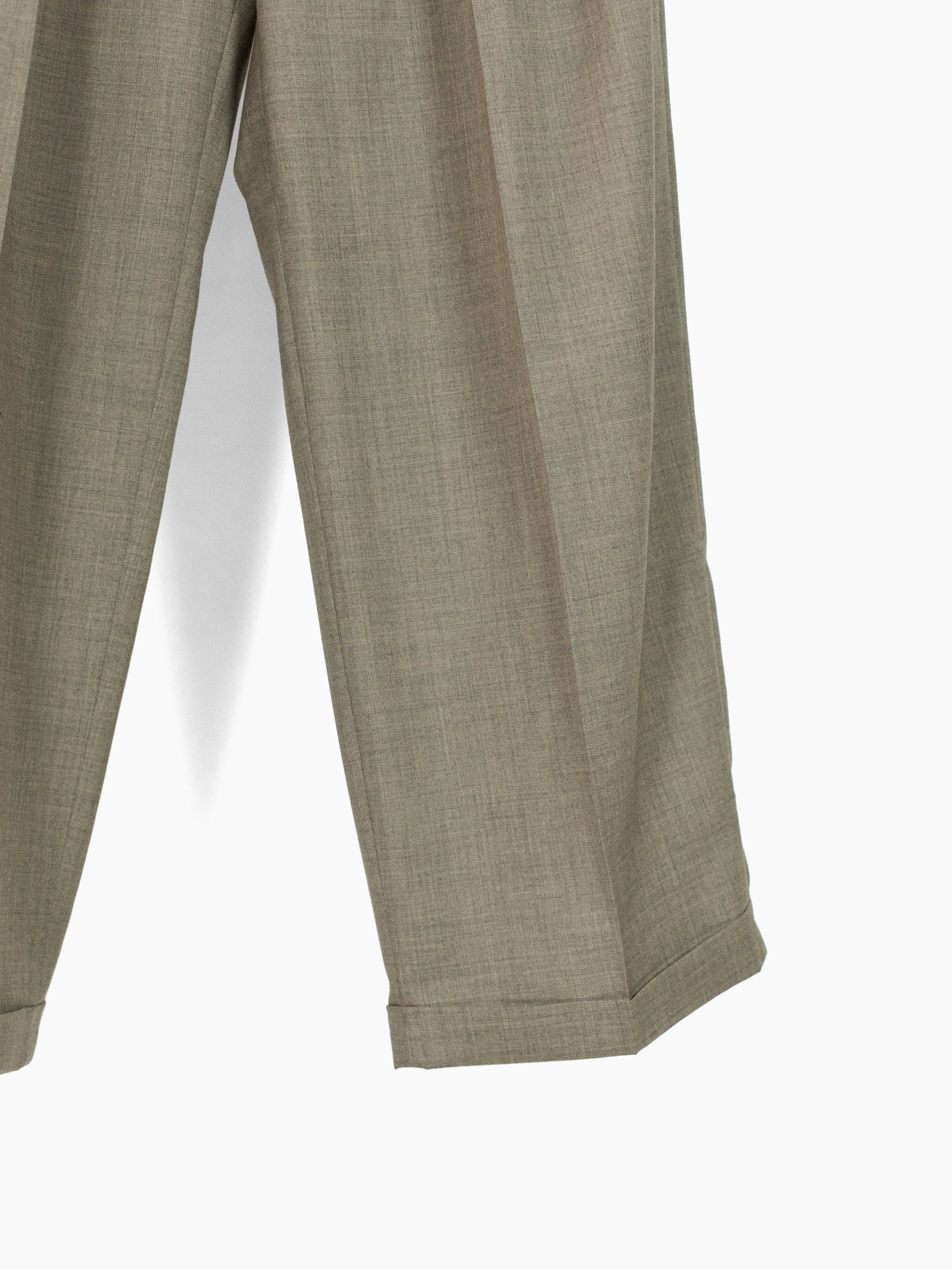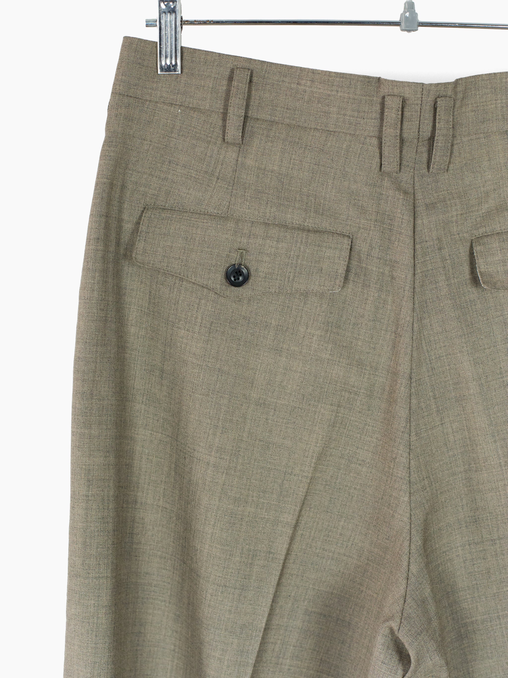 Triple pleated suit trousers in summer weight tropical wool, with flap-closed coin pocket at wearer's right hip and layered internal waist button flap inspired by early 1900s French militaria. This allows for the trouser to be worn semi-open, subverting the formality of a tailored garment. Slightly dropped belt loops, two slash side pockets and two flap-closed back welt pockets. Signature figure 'S'-sewn buttons. Dual button + hook and bar waist closure.