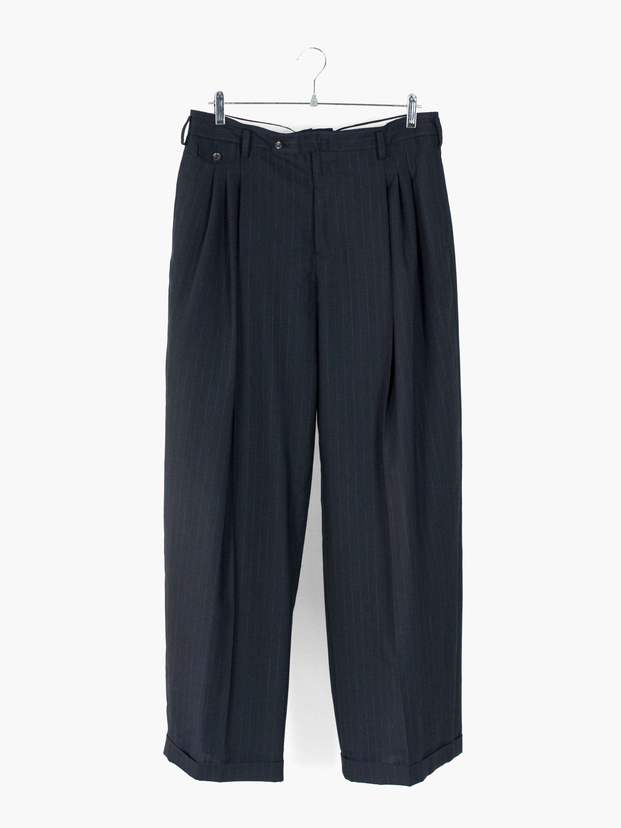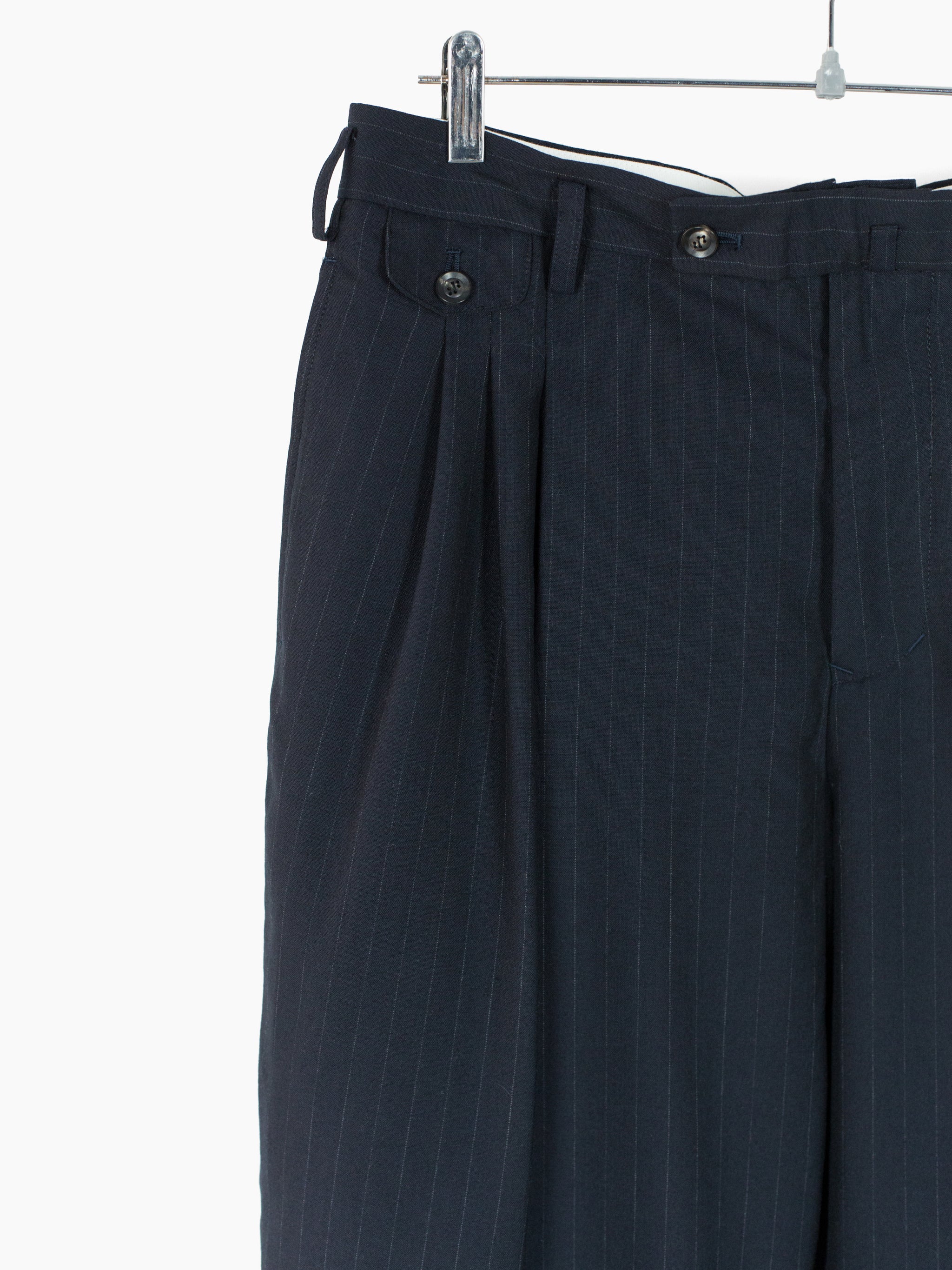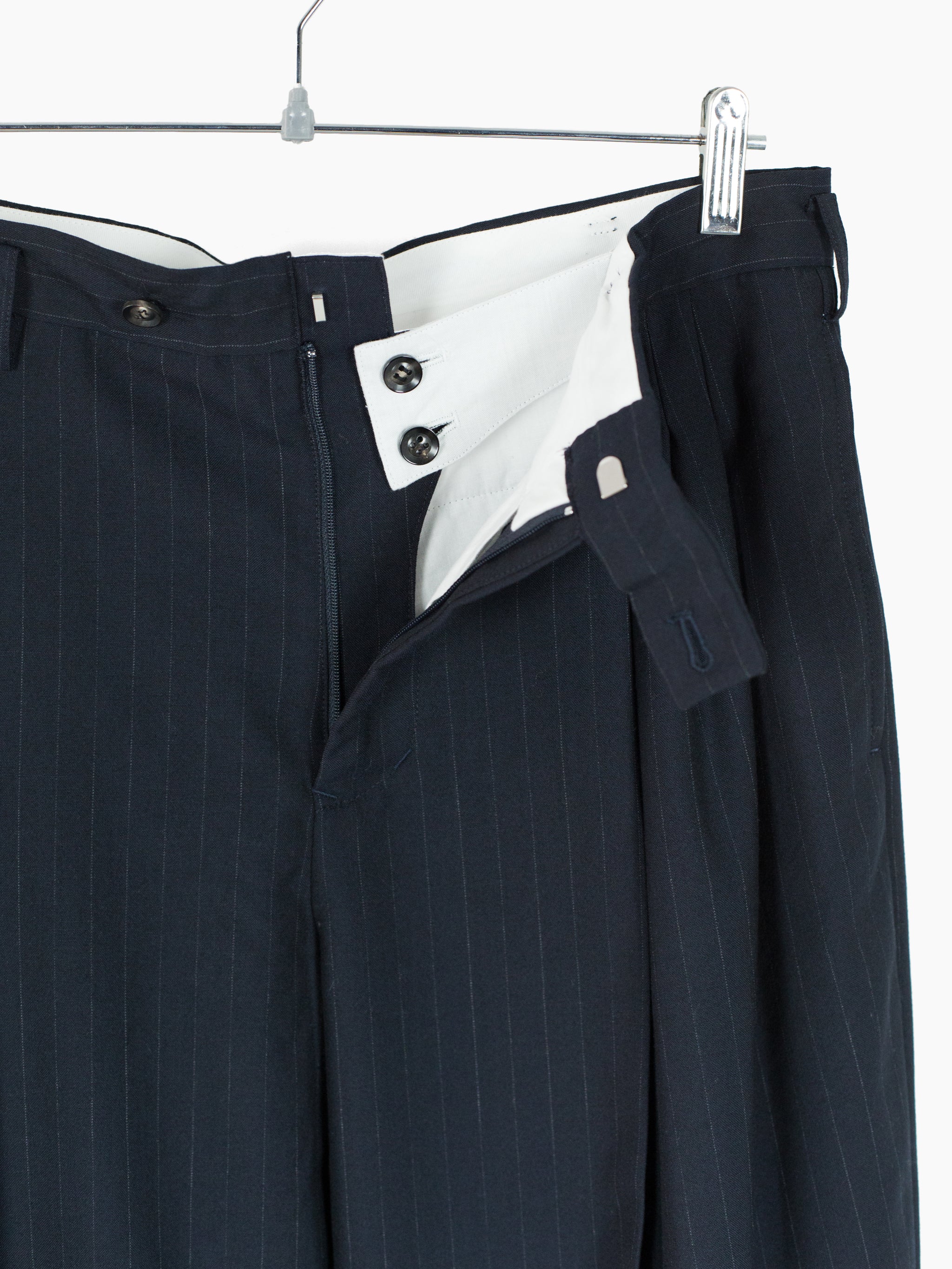 Triple pleated trousers in Navy pinstripe suiting wool, with flap-closed coin pocket at wearer's right hip and layered internal waist button flap inspired by early 1900s French militaria. This allows for the trouser to be worn semi-open, subverting the formality of a tailored garment. Slightly dropped belt loops, two slash side pockets and two flap-closed back welt pockets. Signature figure 'S'-sewn buttons. Dual button + hook and bar waist closure.