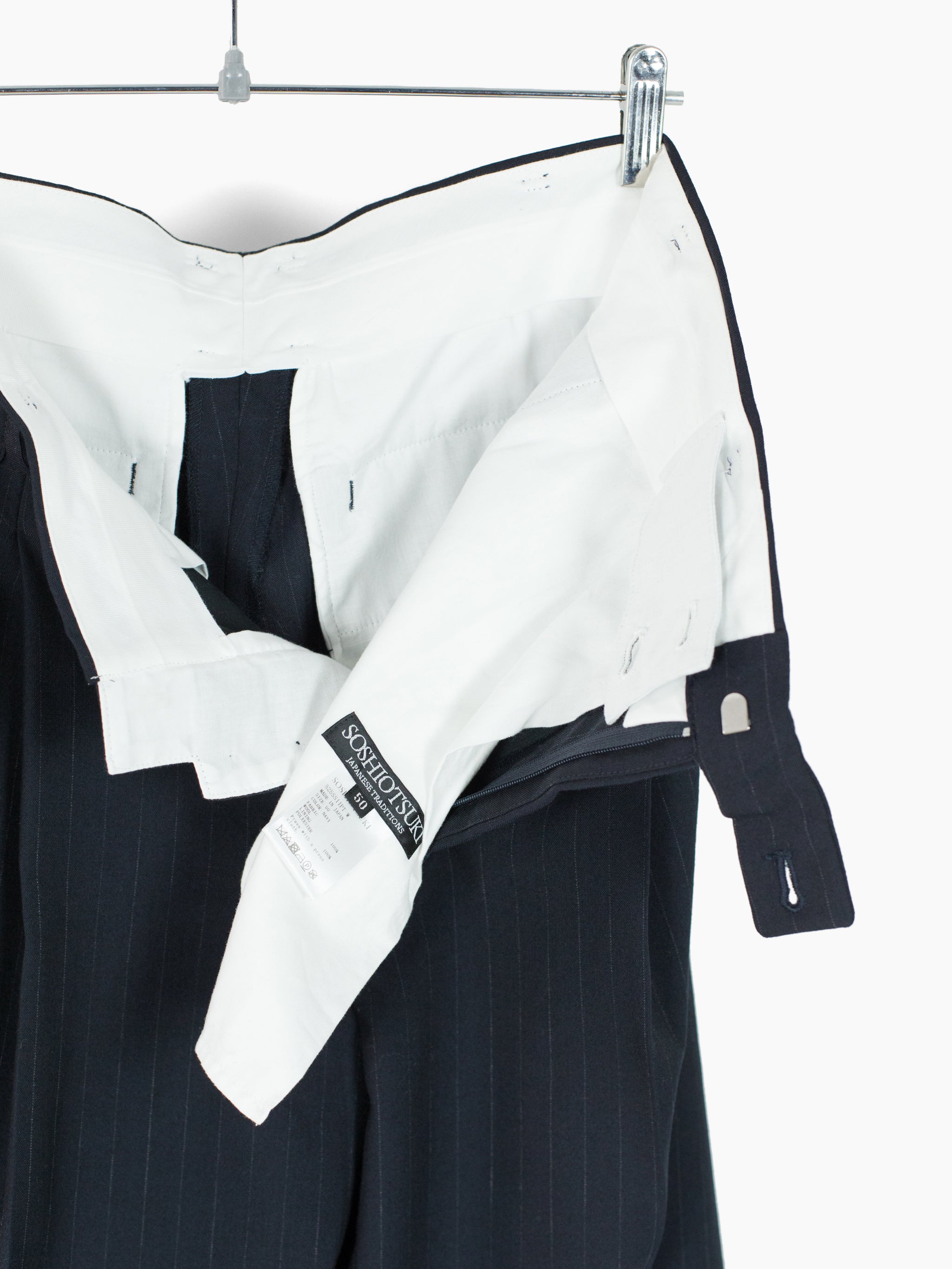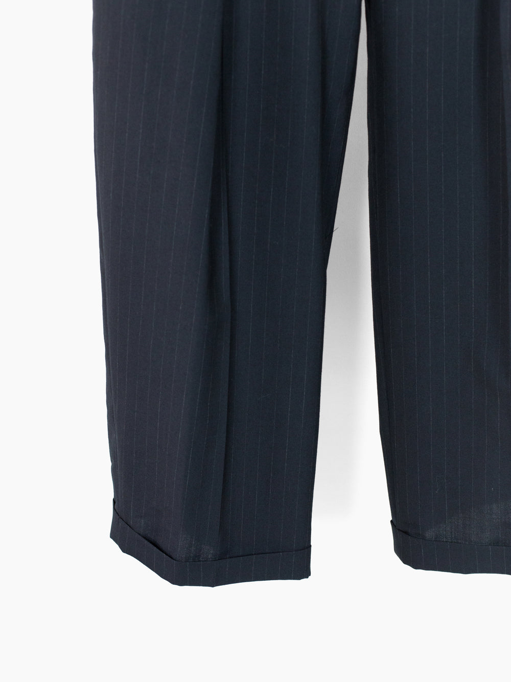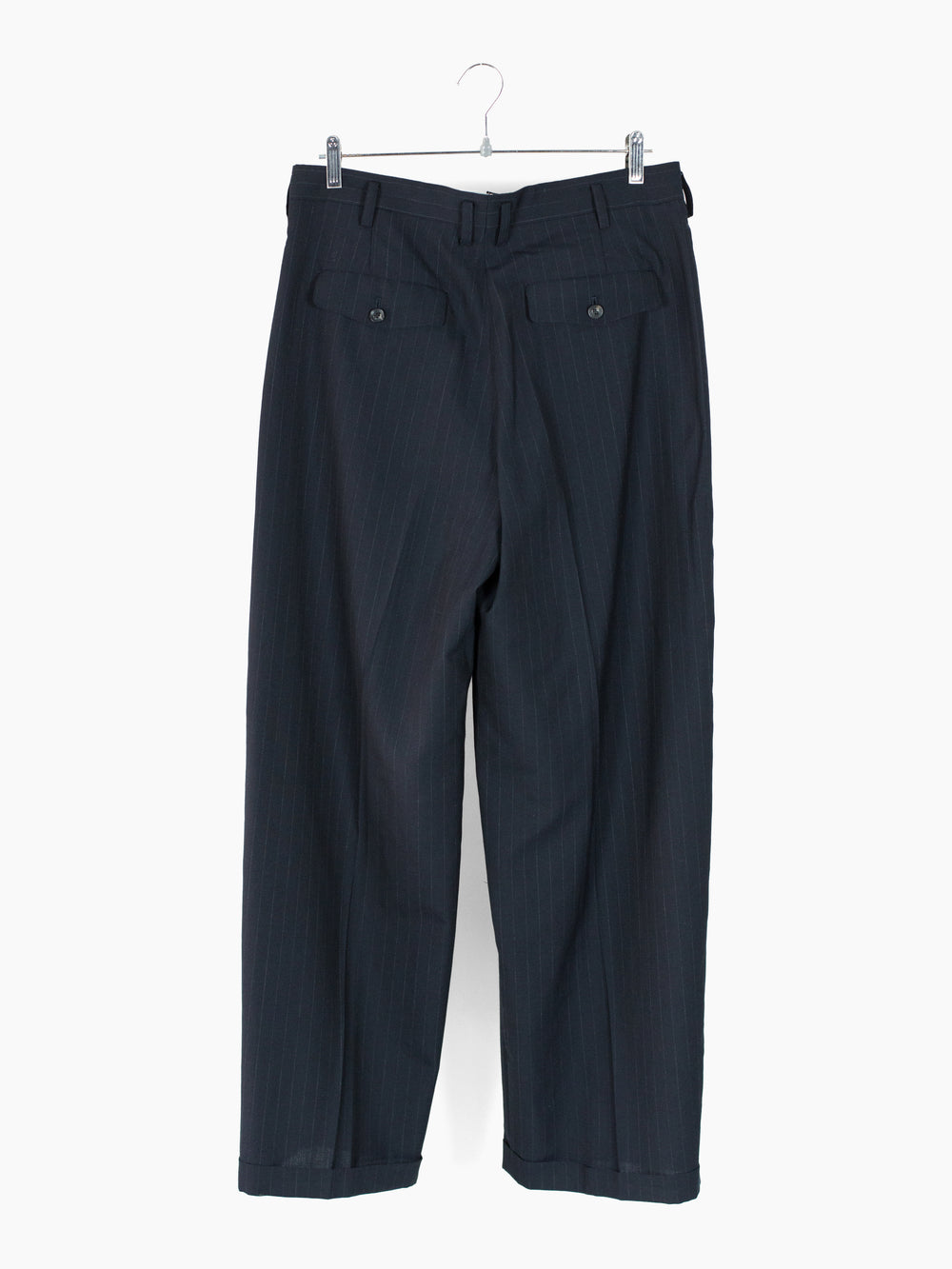 Triple pleated trousers in Navy pinstripe suiting wool, with flap-closed coin pocket at wearer's right hip and layered internal waist button flap inspired by early 1900s French militaria. This allows for the trouser to be worn semi-open, subverting the formality of a tailored garment. Slightly dropped belt loops, two slash side pockets and two flap-closed back welt pockets. Signature figure 'S'-sewn buttons. Dual button + hook and bar waist closure.