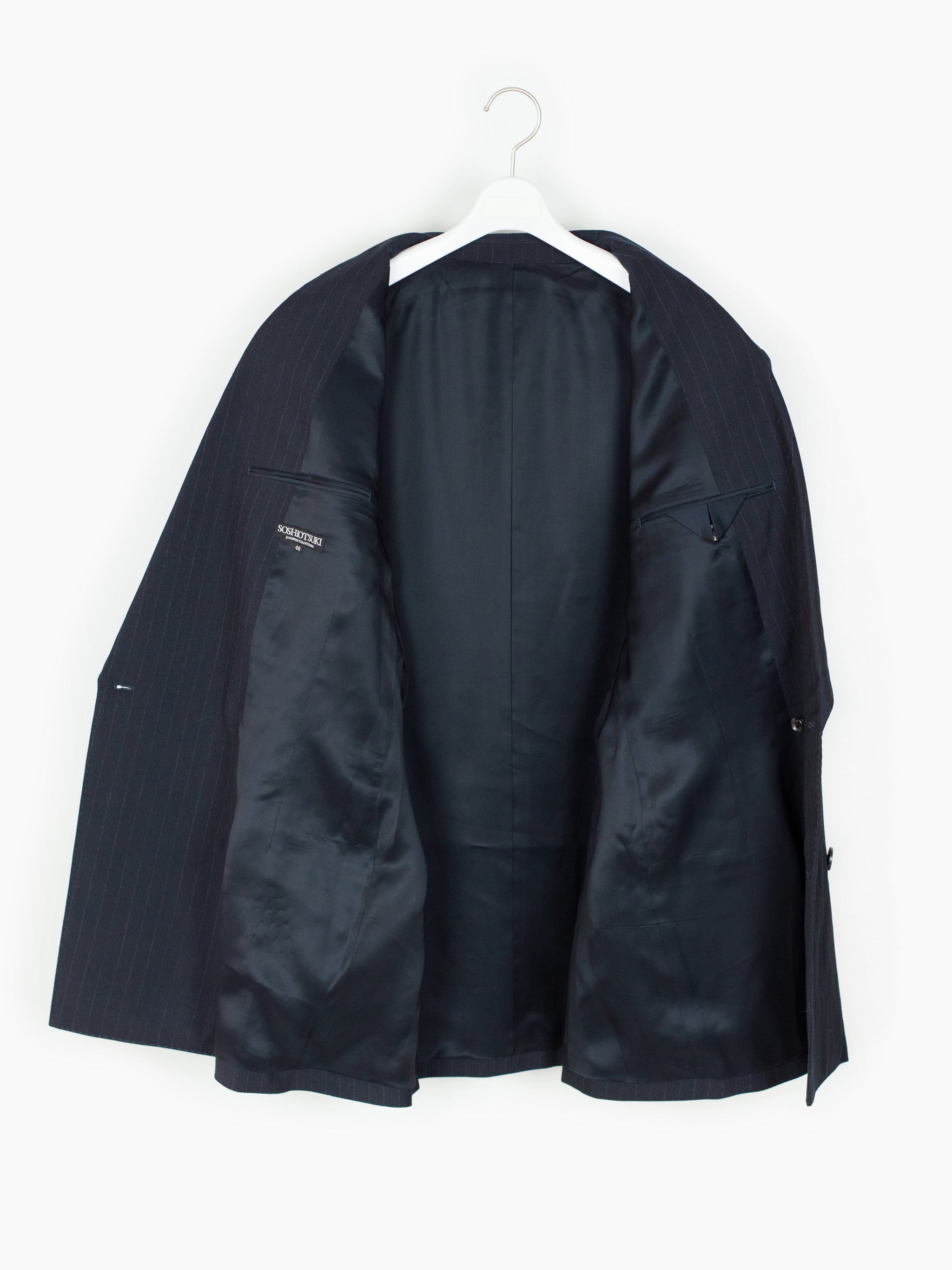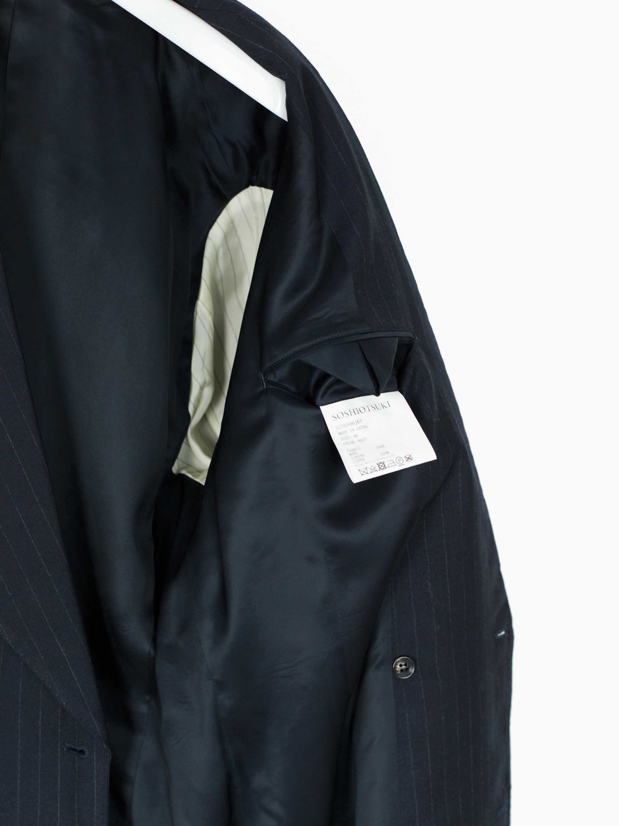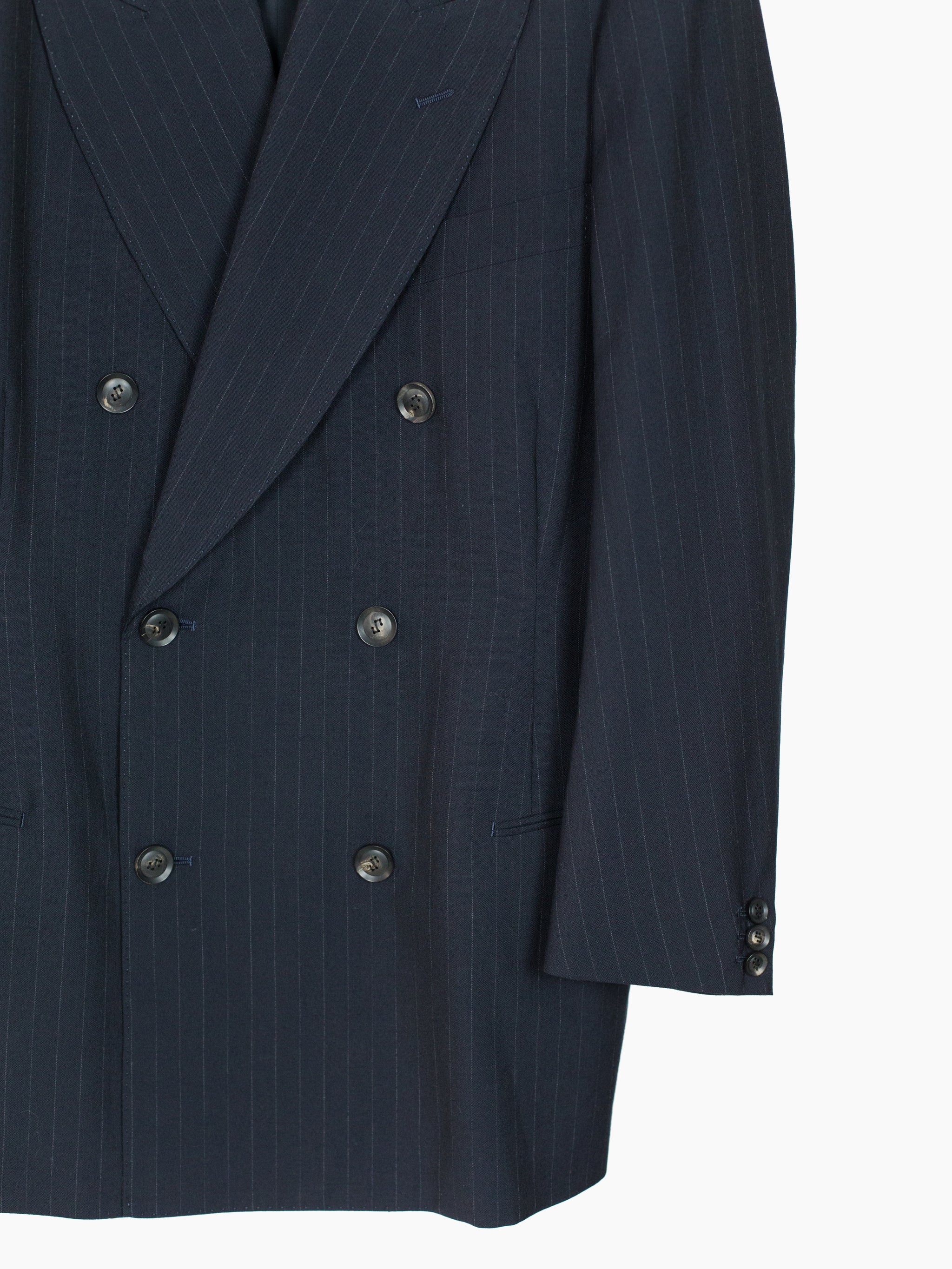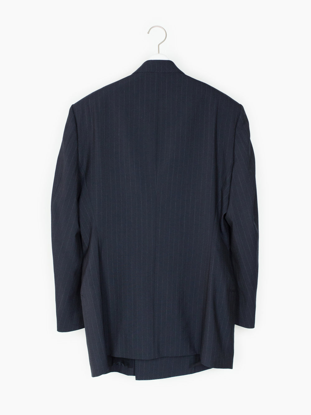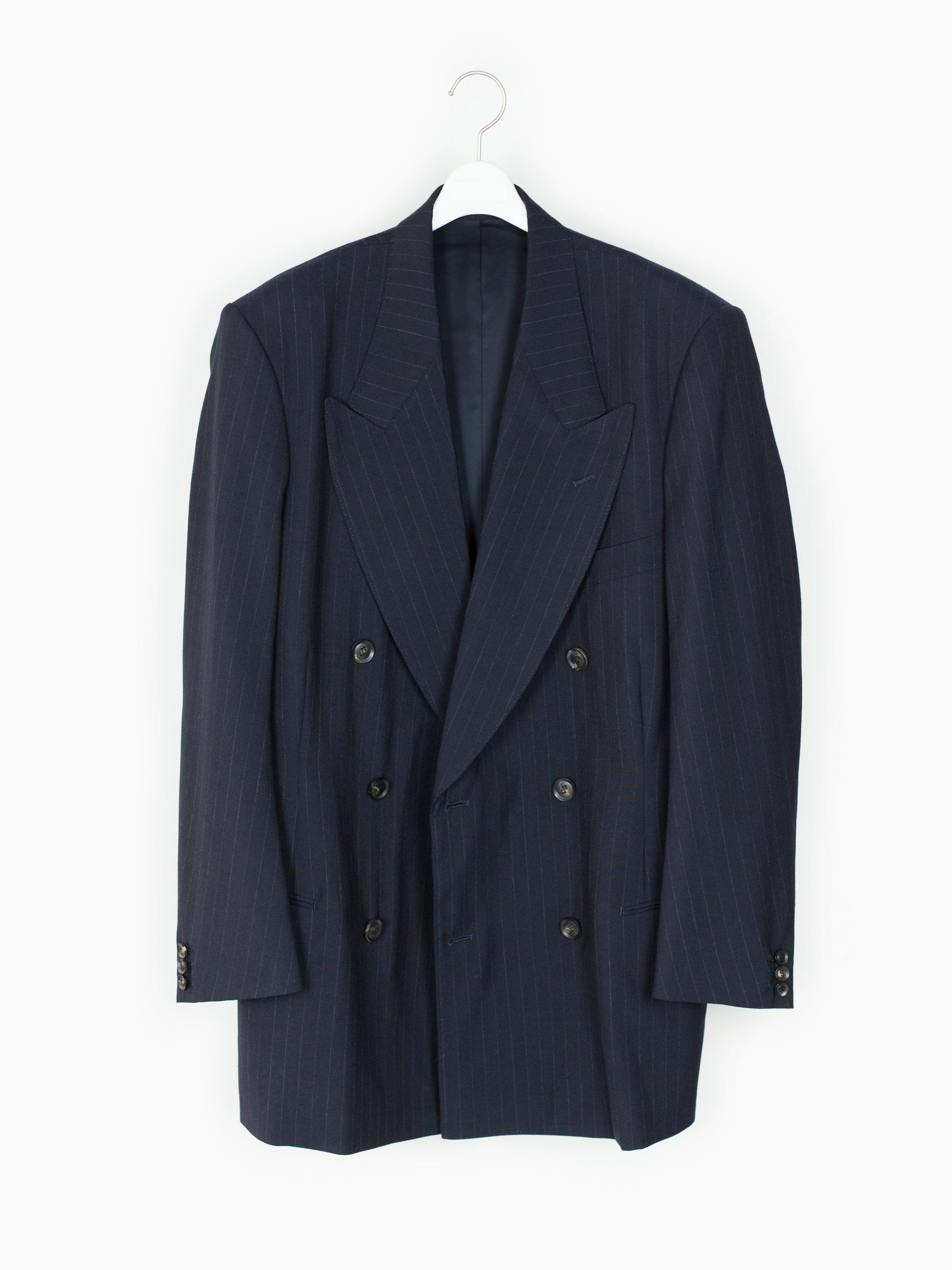 80s-style 6B Double breasted suit jacket in navy pinstripe suiting wool. Cut broad-shouldered and elongated to mimic 80s boom-era Japan where obsession with 'Made in Italy' led to a slight offness that came from mapping Italian tailoring onto a Japanese body type. Generous cut through chest with sculpted, suppressed waist that creates an elegant hourglass silhouette.